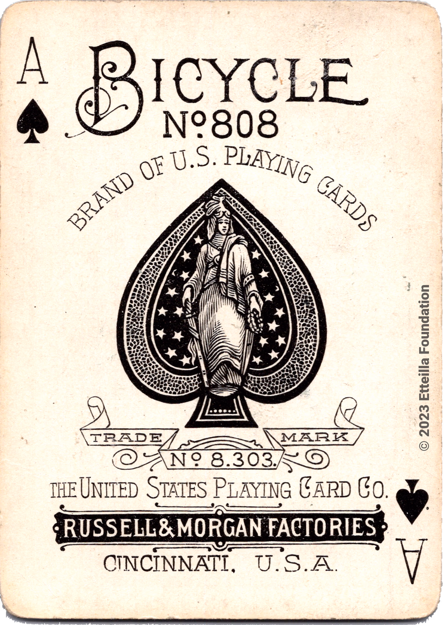 Insert Image: An Ace of Spades and a card back with political text. Caption: The Ace of Spades from the USPCC’s 1895 Bicycle 808 standard deck alongside the card back of the Votes for Women deck produced by De La Rue & Co. Ltd. (1910).