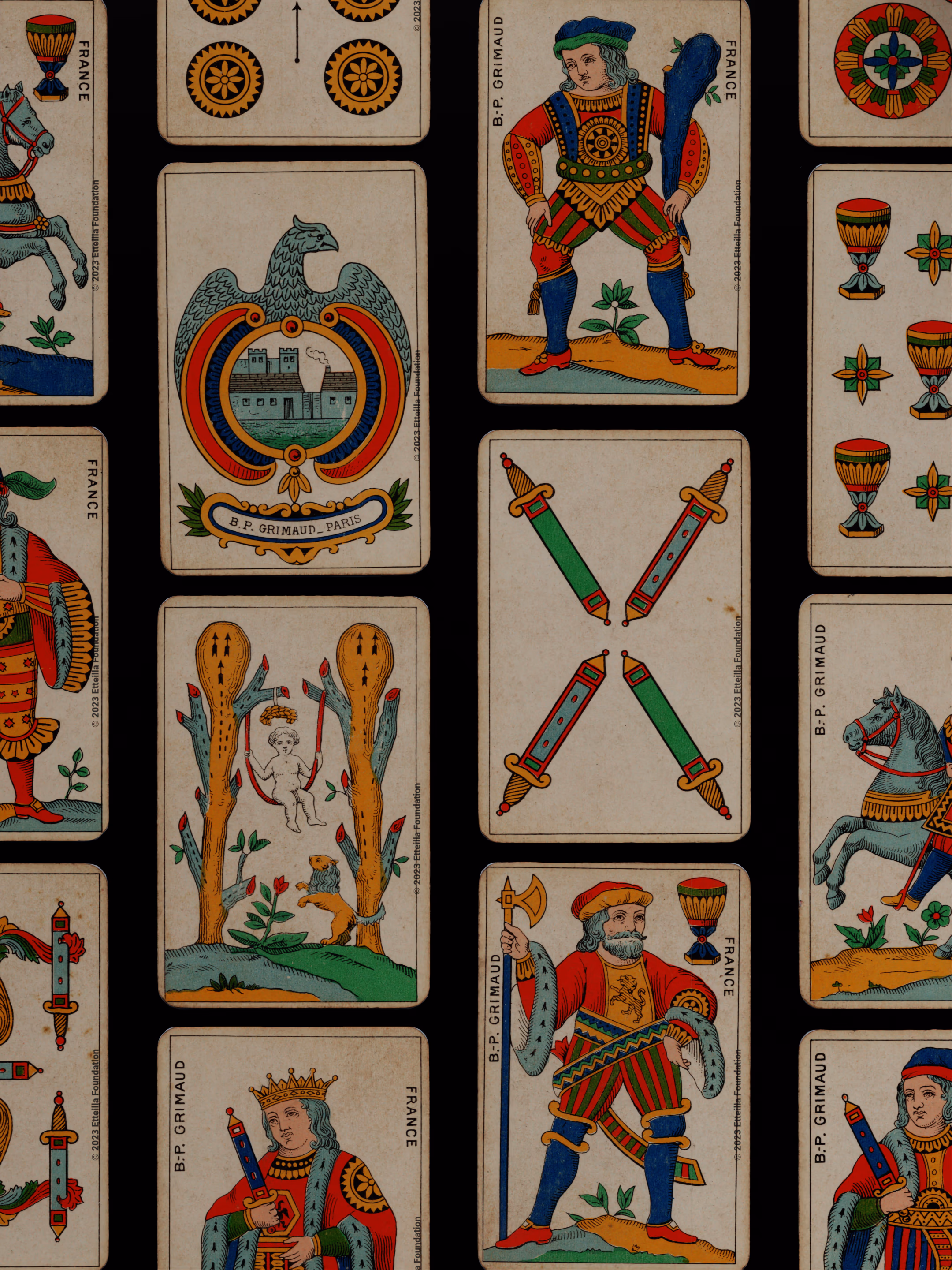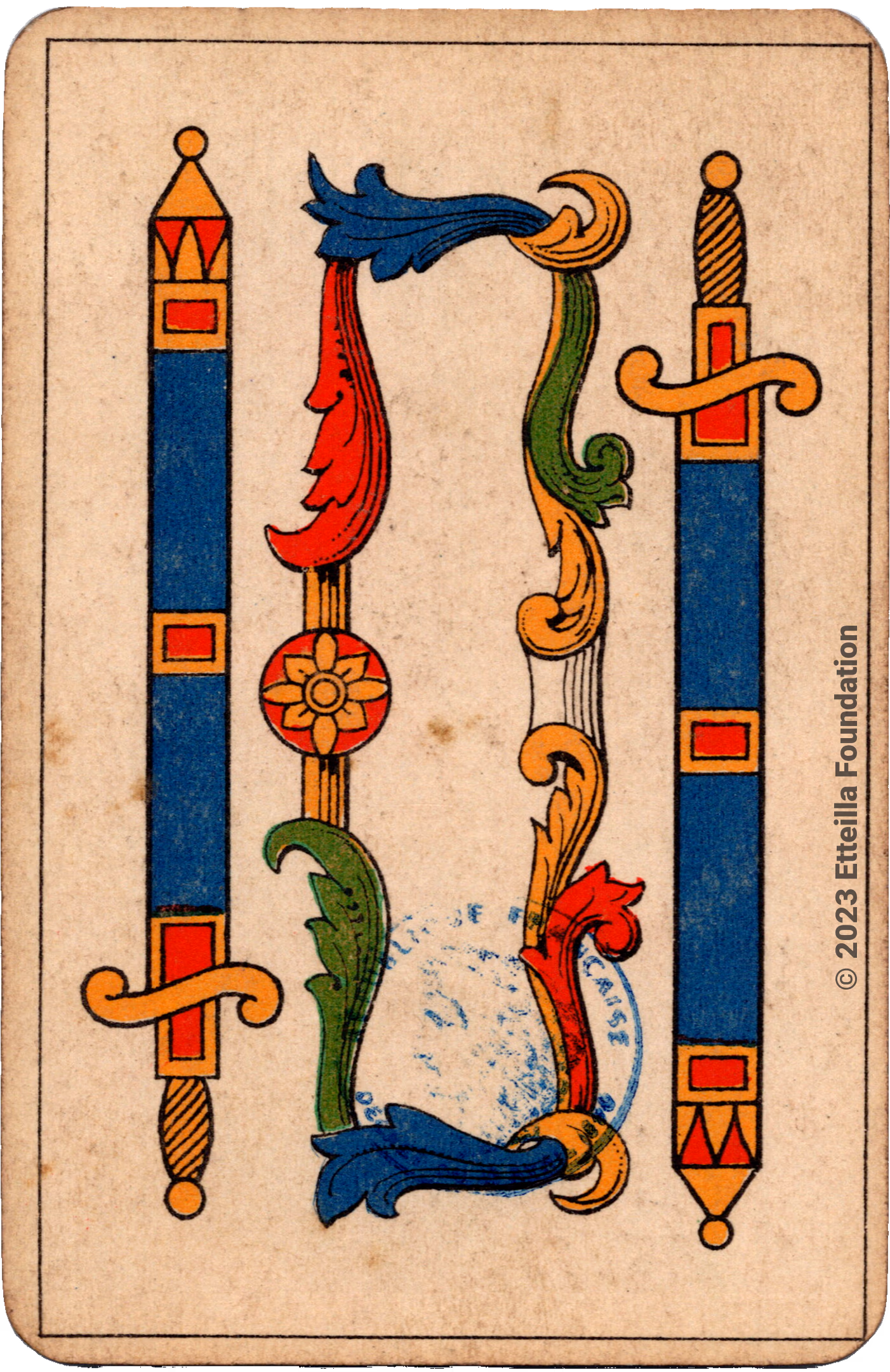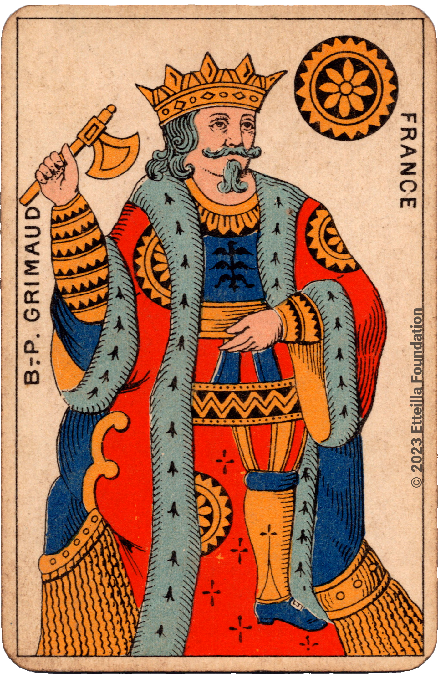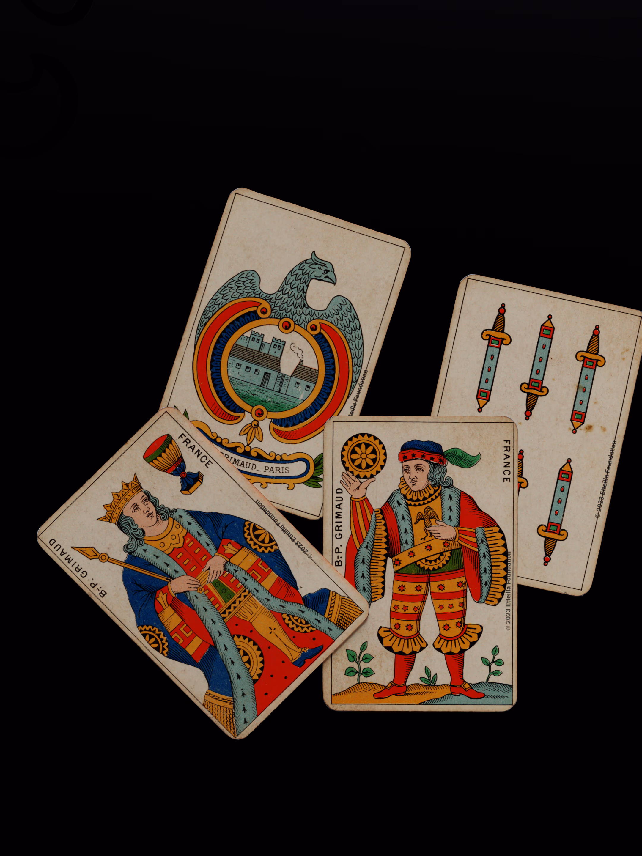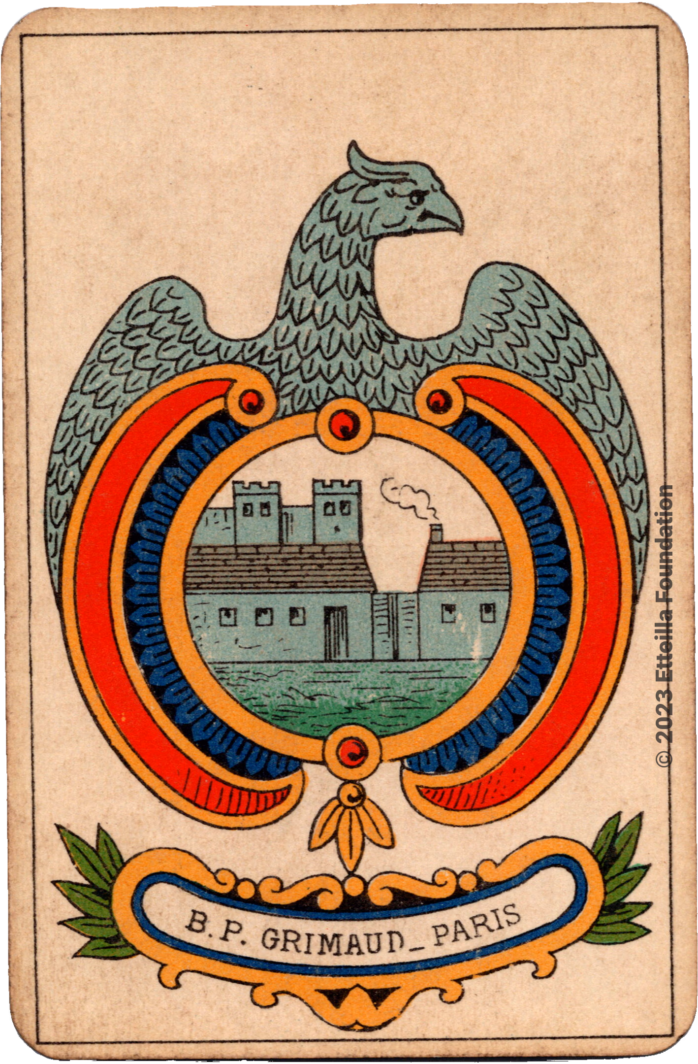 The Aluette Demi-Fine is a Standard Deck of playing cards, manufactured by Baptiste-Paul Grimaud in France in the year 1880. This french deck uncommonly uses the spanish pattern instead of the french pattern.
