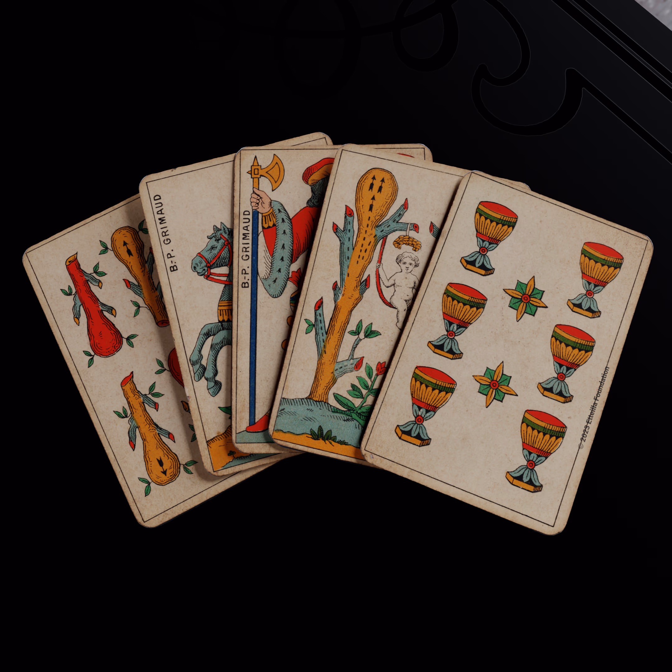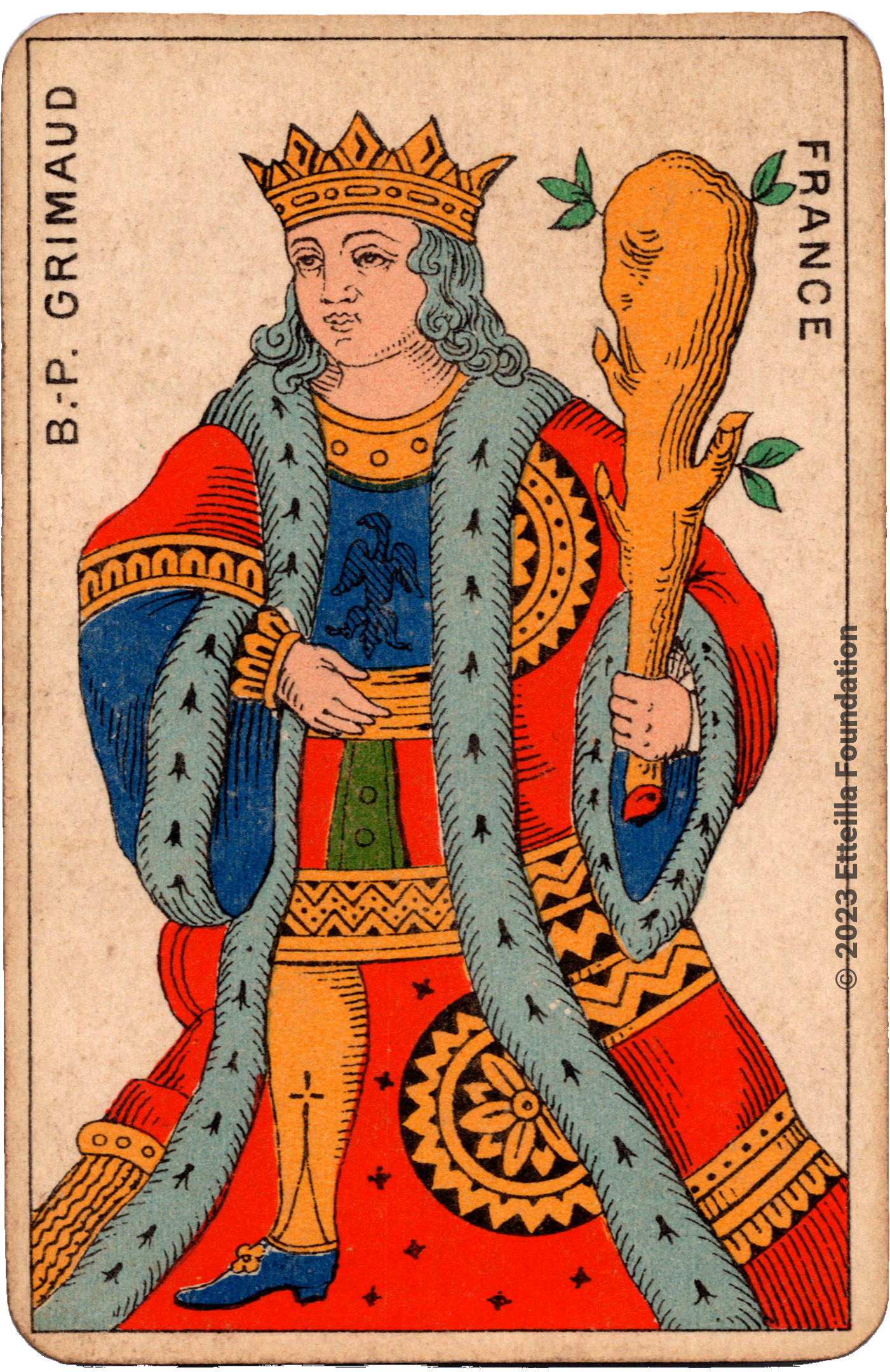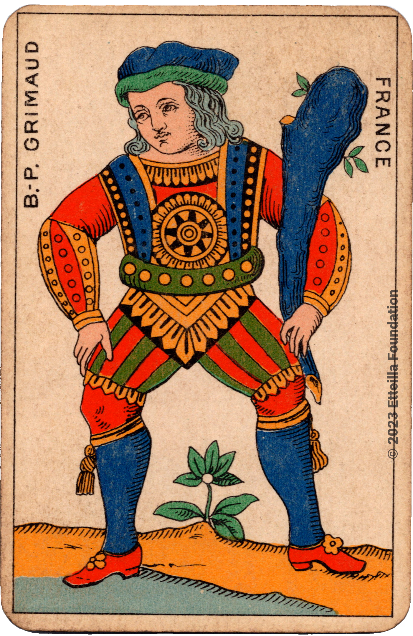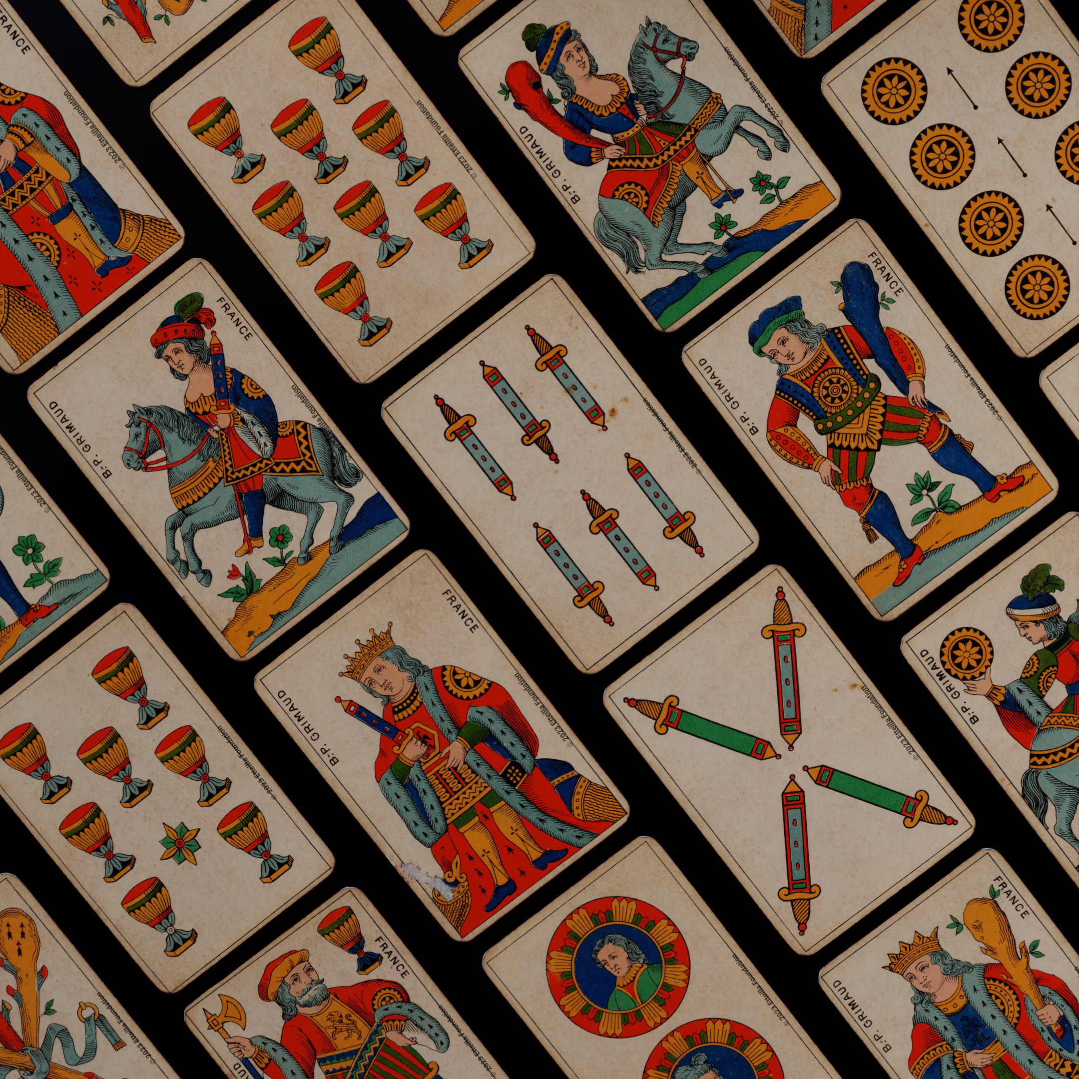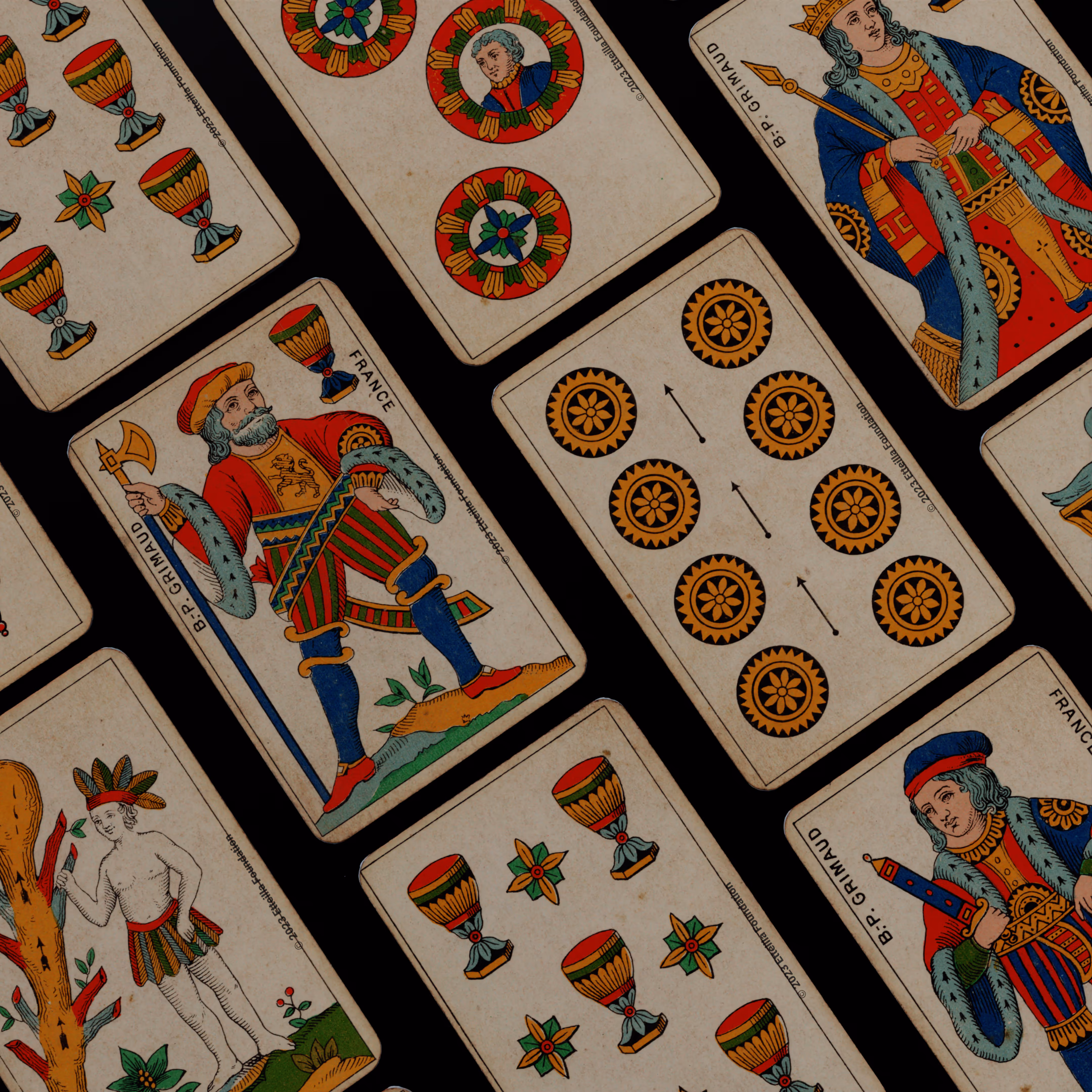 The Aluette Demi-Fine is a Standard Deck of playing cards, manufactured by Baptiste-Paul Grimaud in France in the year 1880. This french deck uncommonly uses the spanish pattern instead of the french pattern.