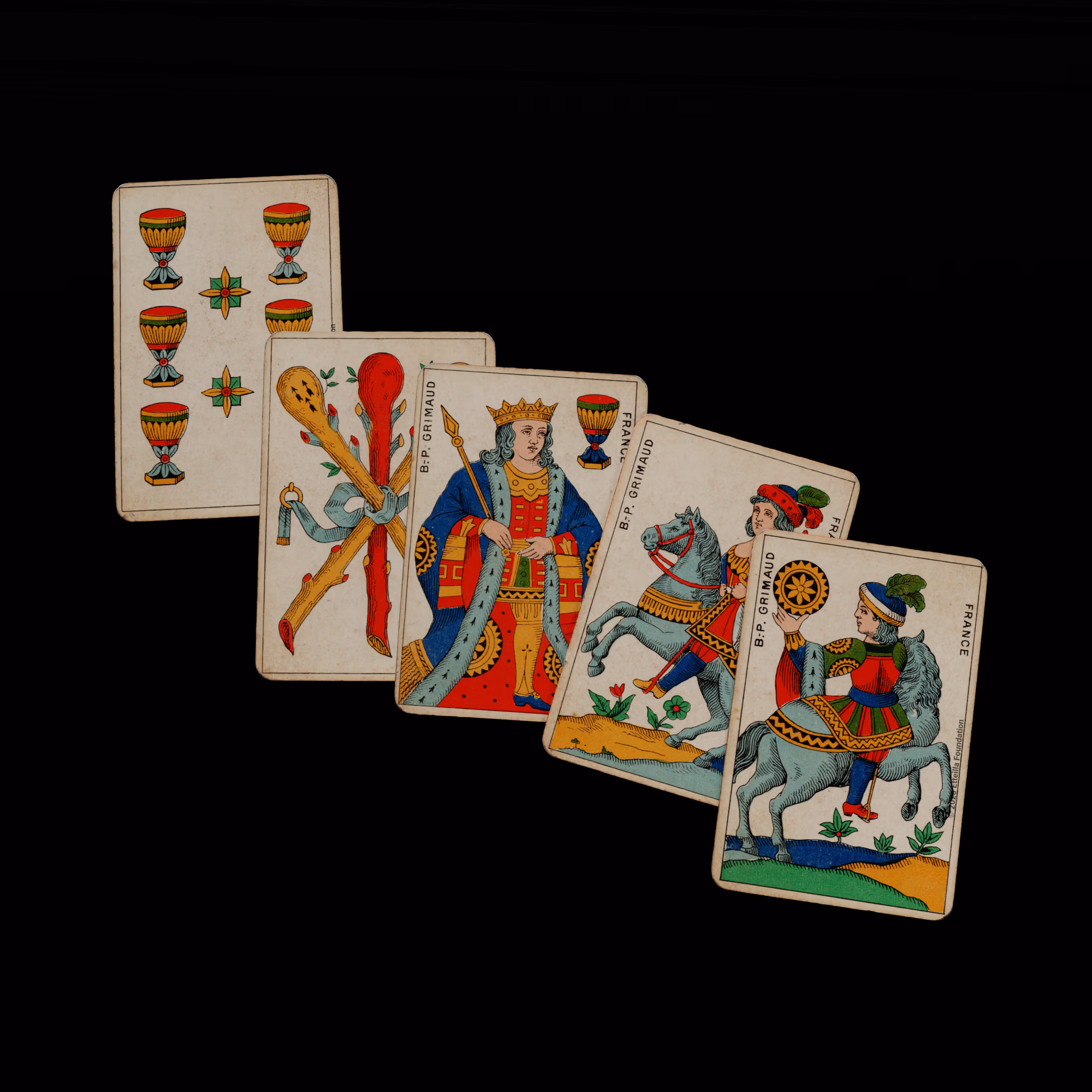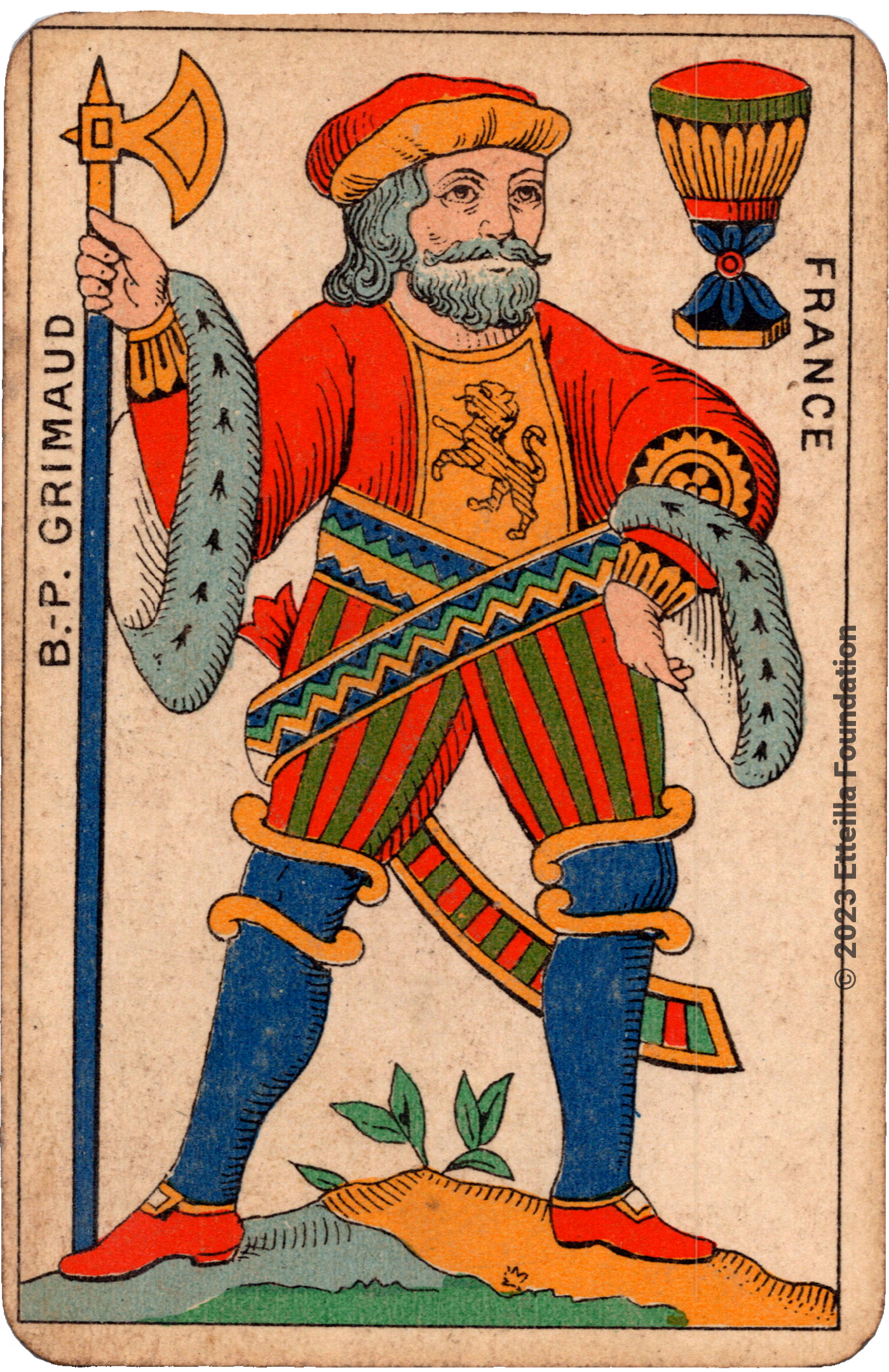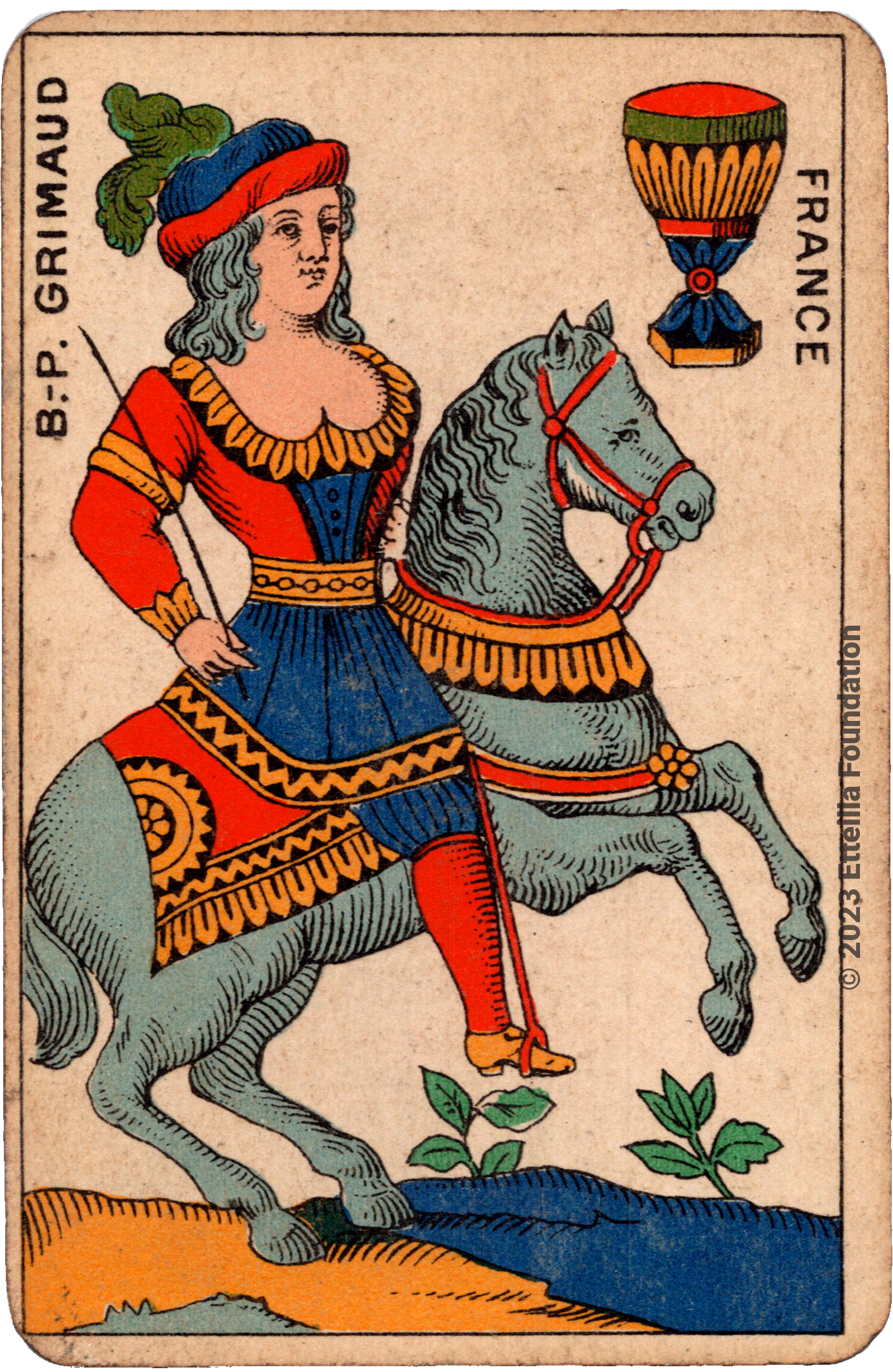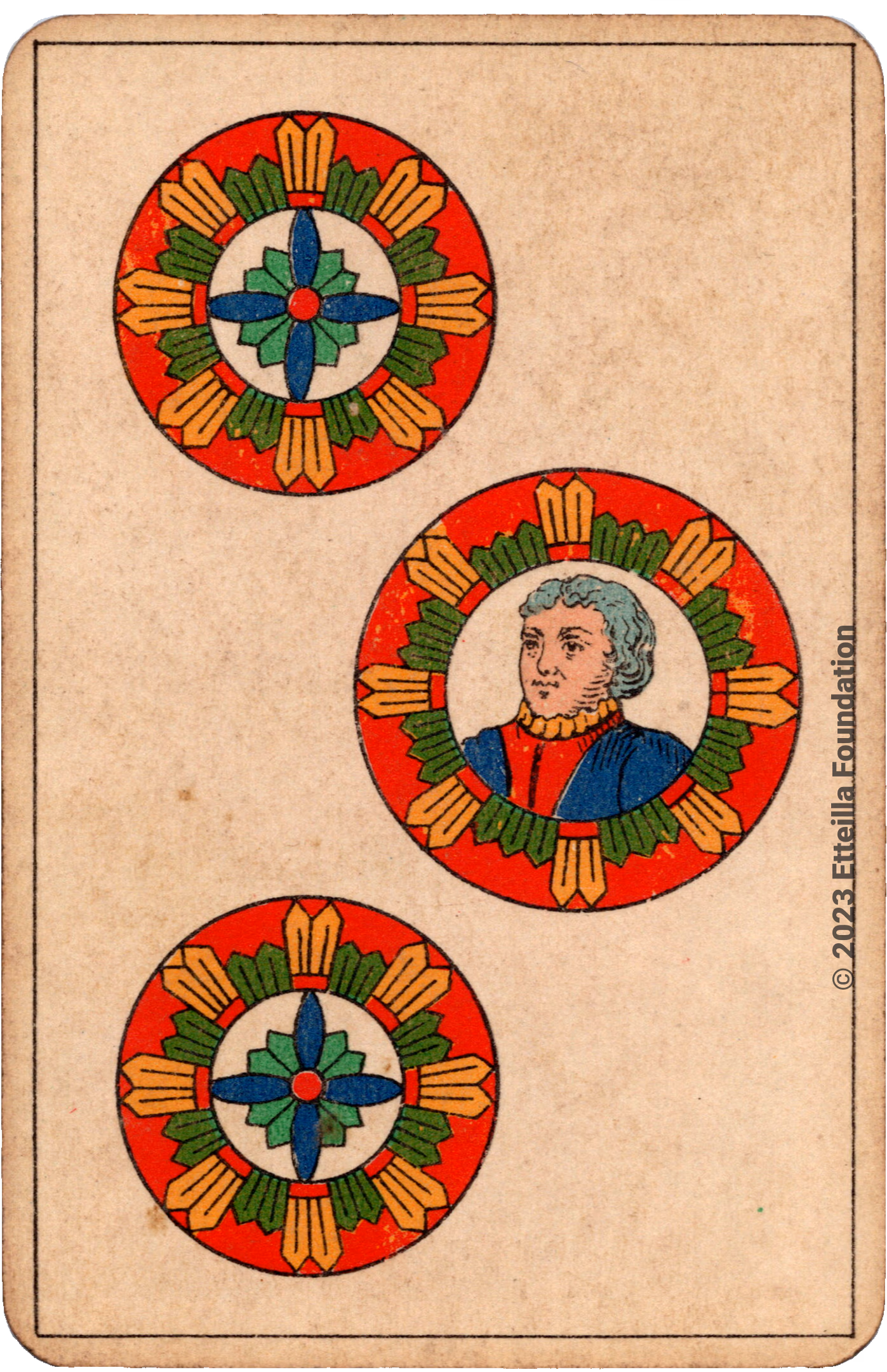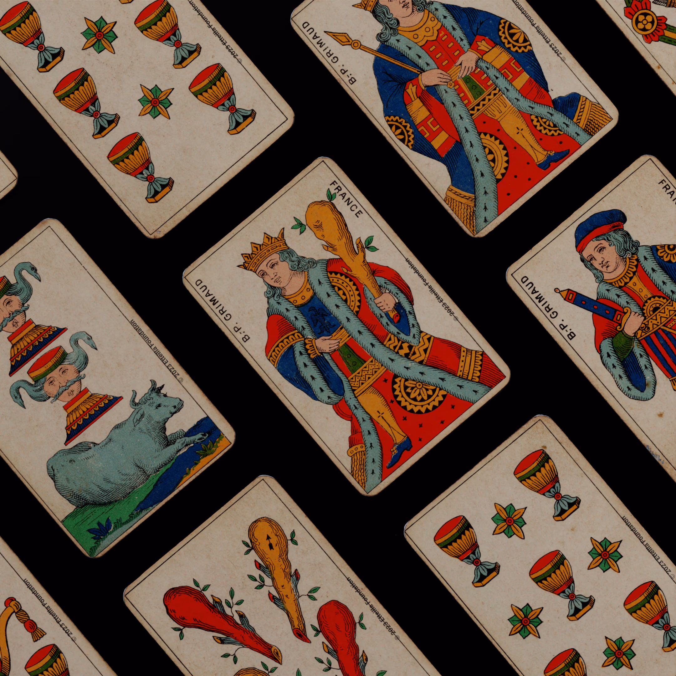 The Aluette Demi-Fine is a Standard Deck of playing cards, manufactured by Baptiste-Paul Grimaud in France in the year 1880. This french deck uncommonly uses the spanish pattern instead of the french pattern.