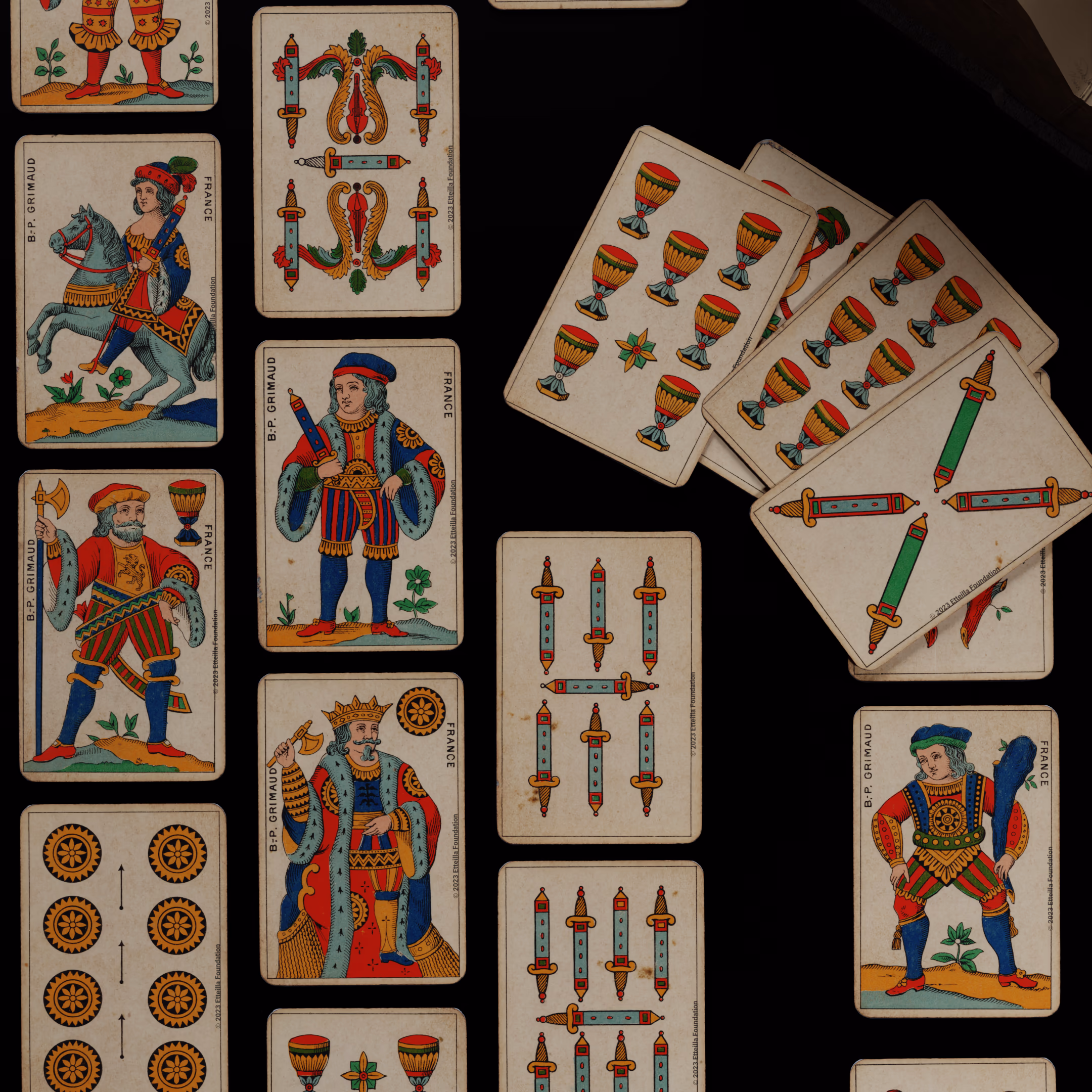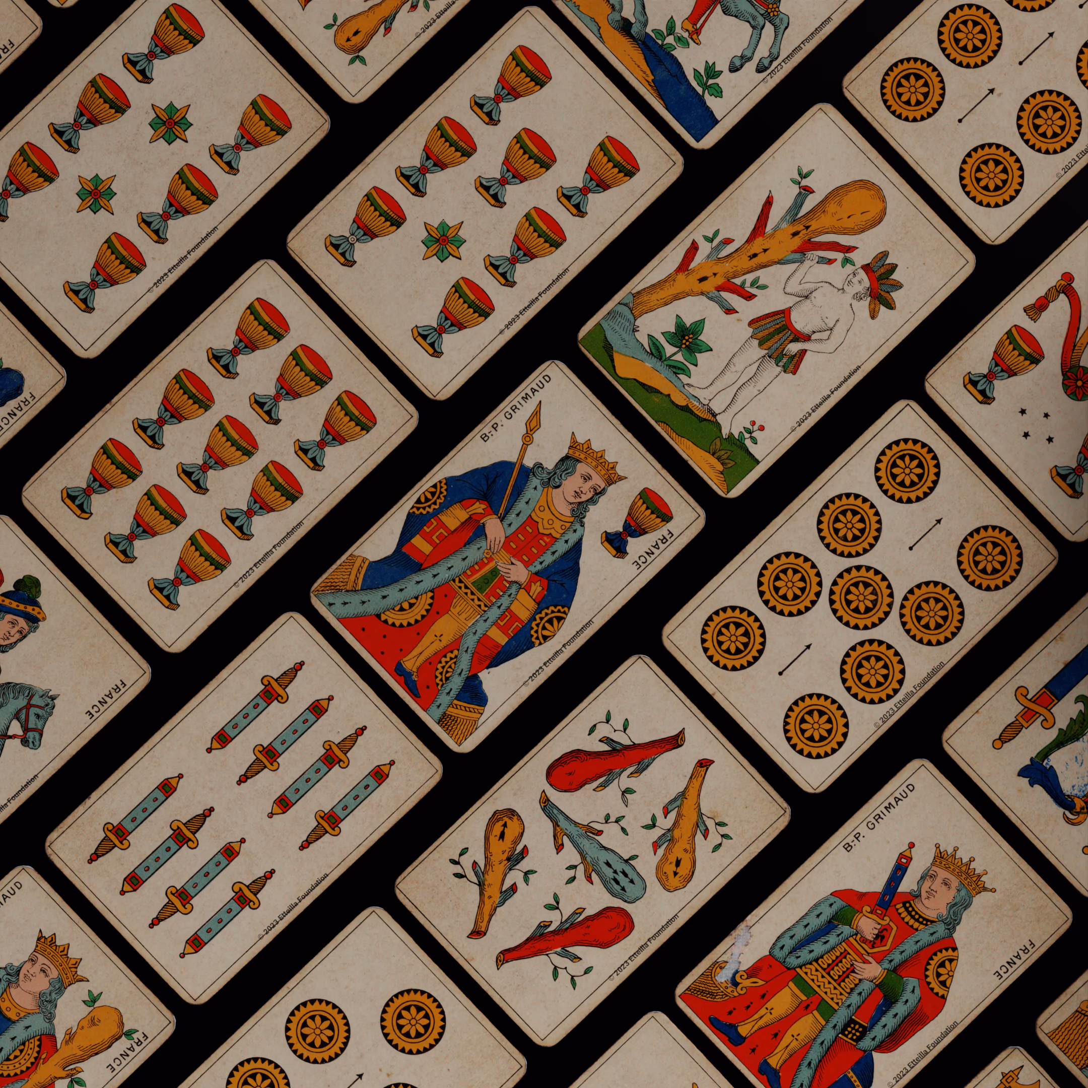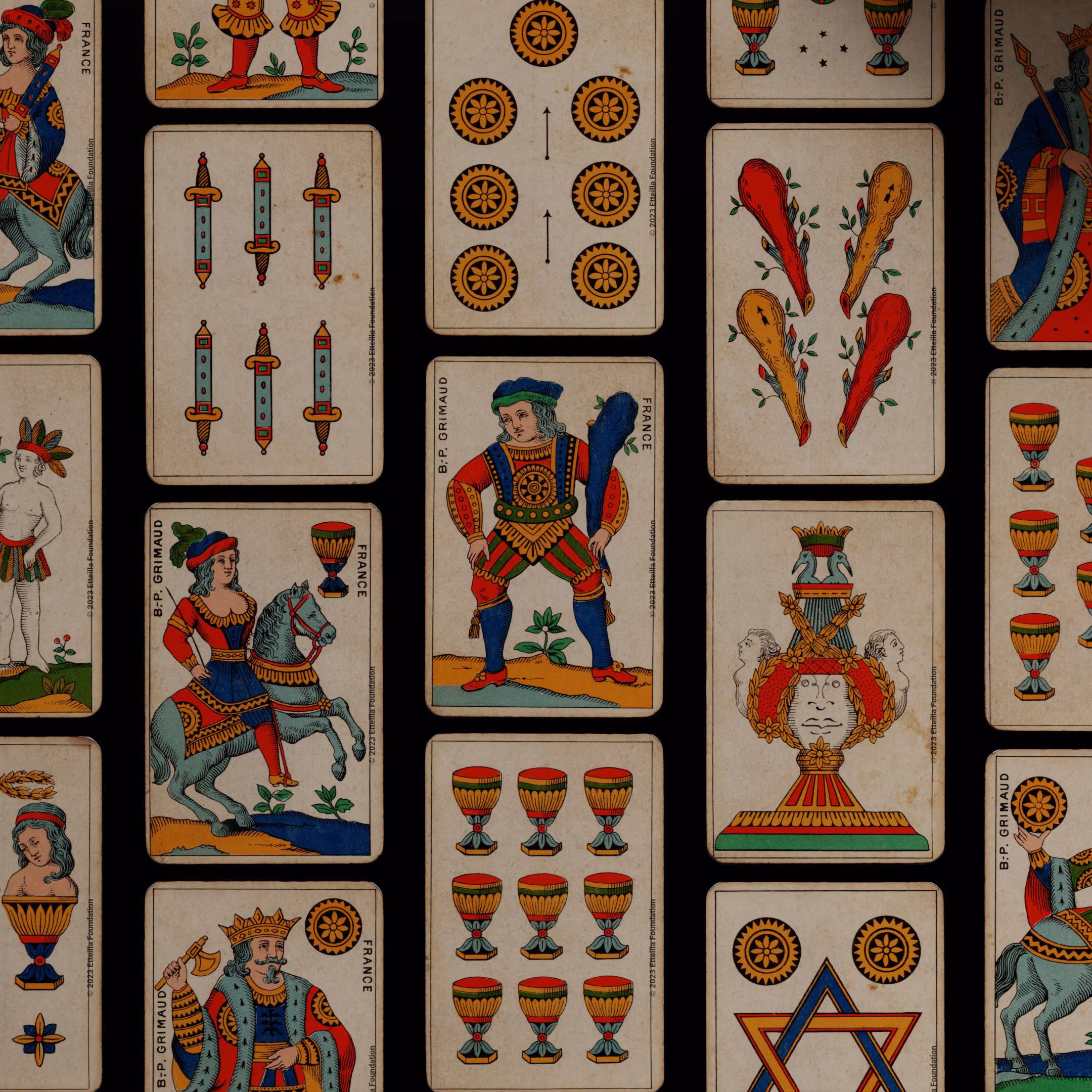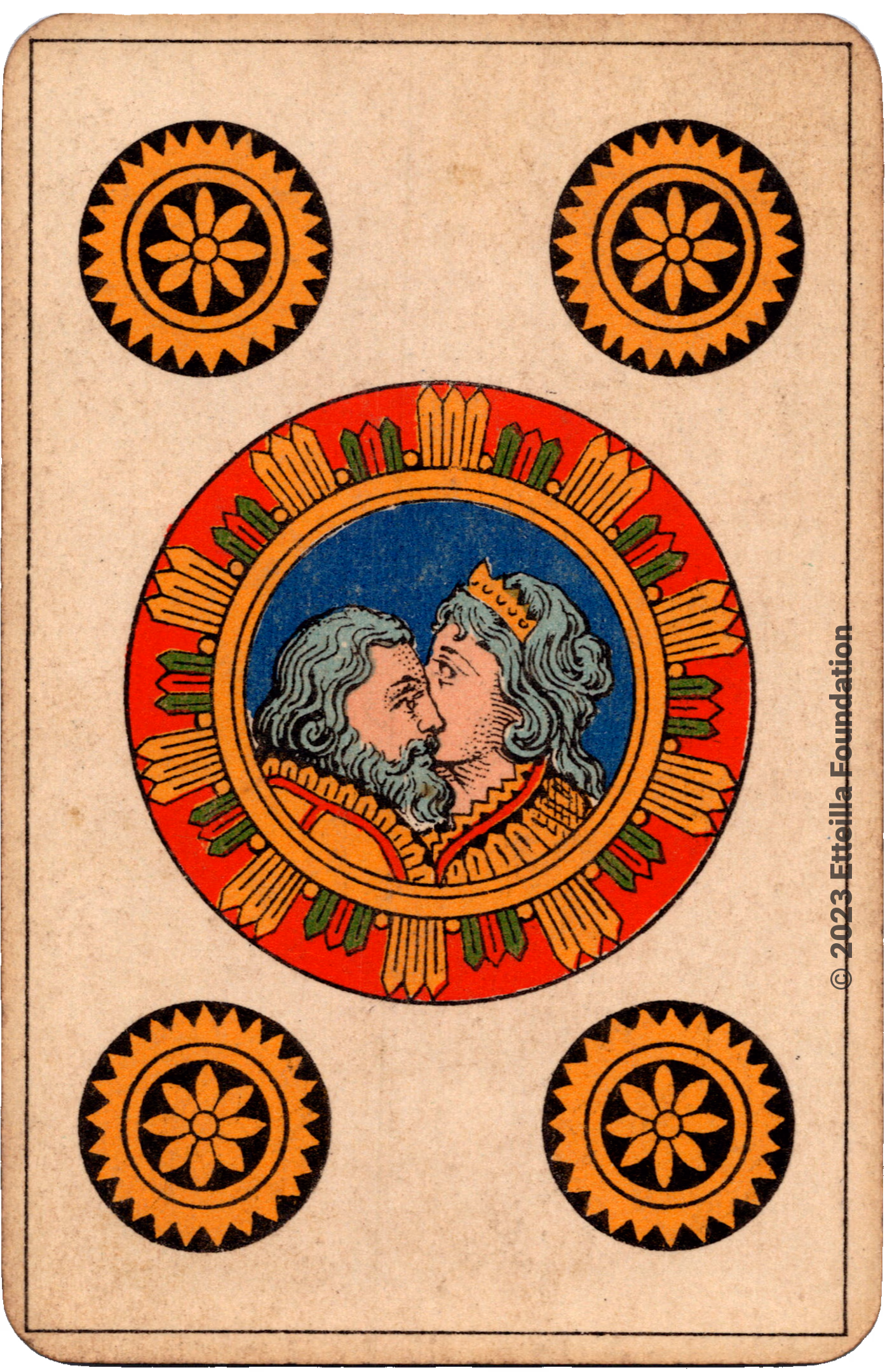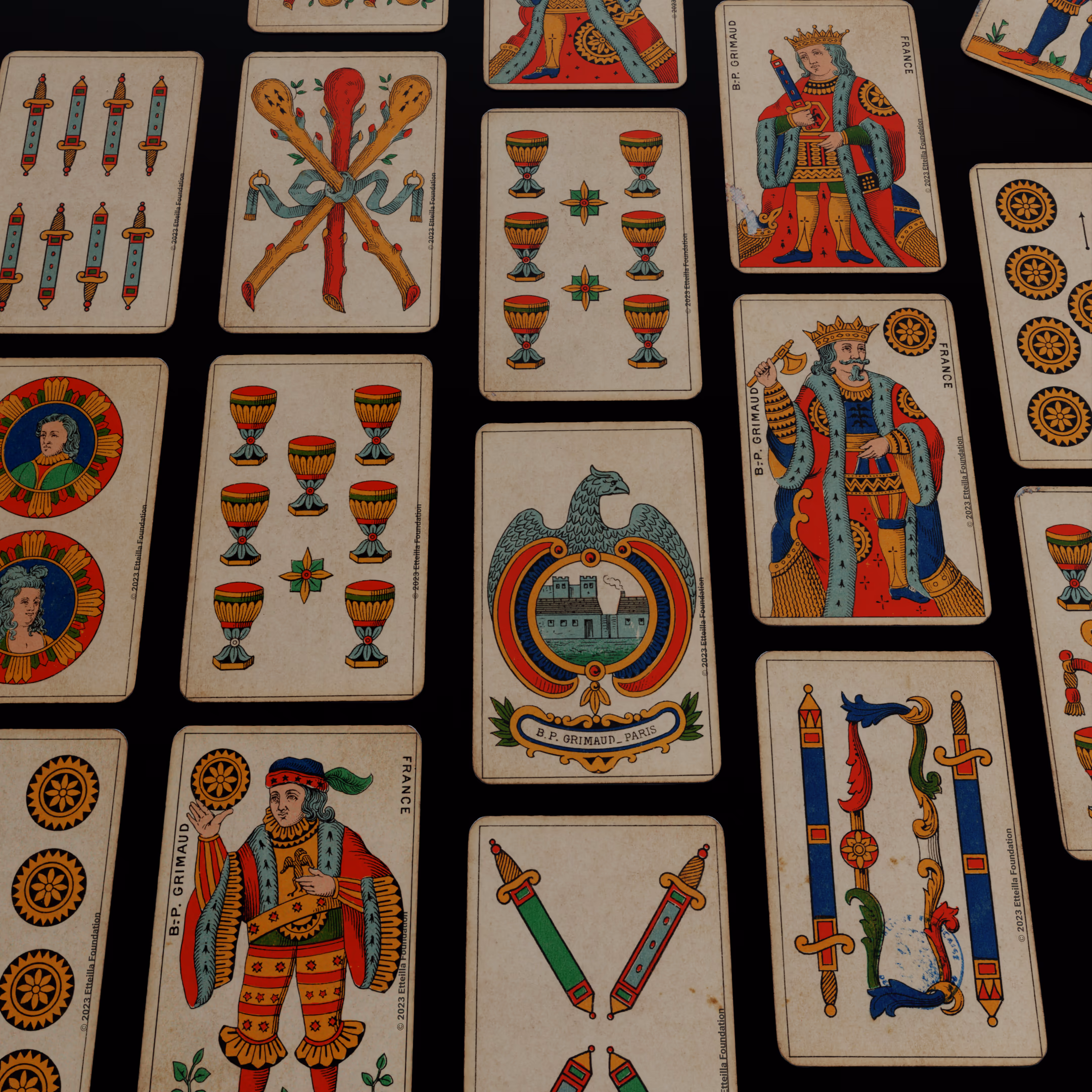 The Aluette Demi-Fine is a Standard Deck of playing cards, manufactured by Baptiste-Paul Grimaud in France in the year 1880. This french deck uncommonly uses the spanish pattern instead of the french pattern.