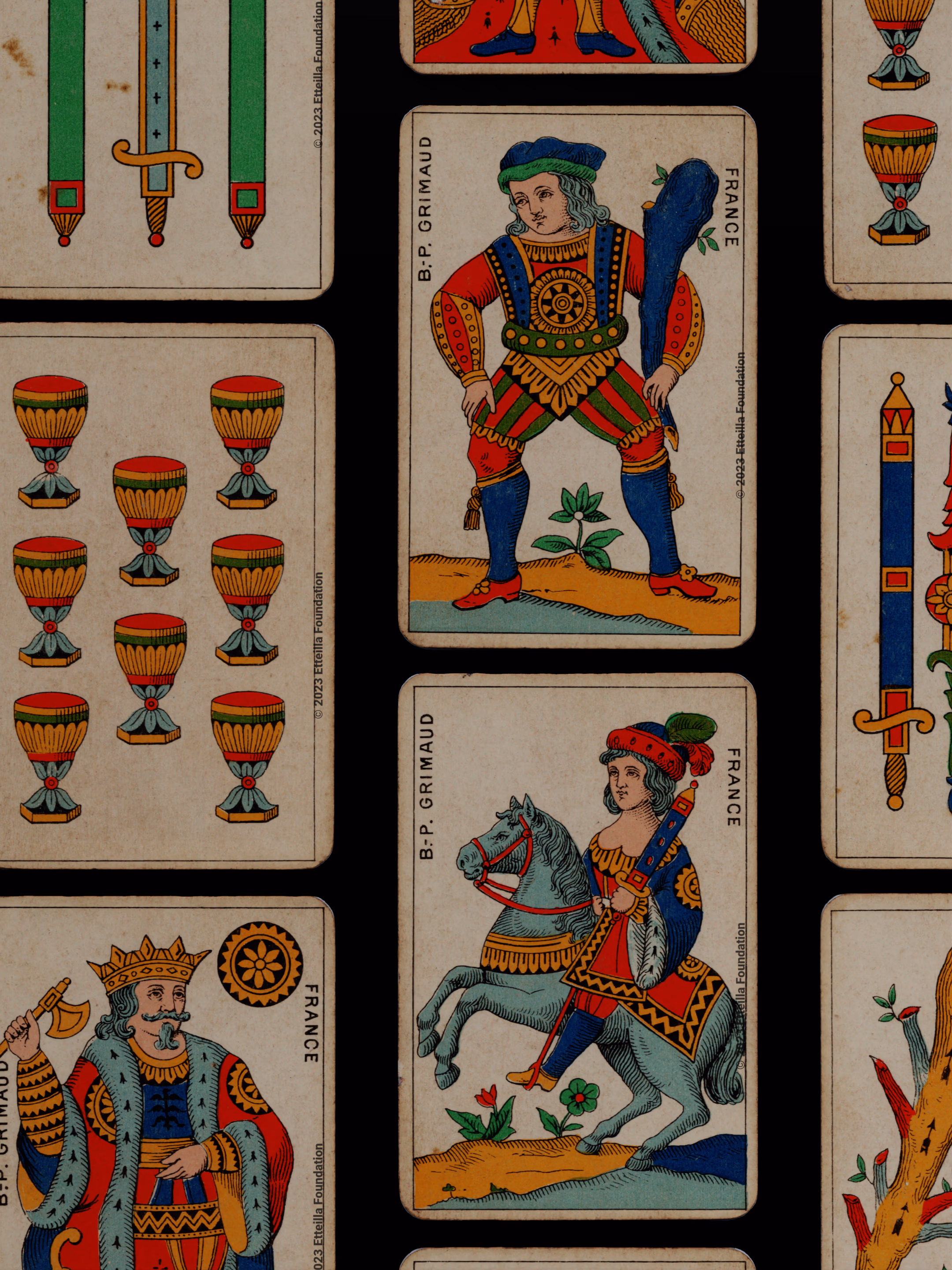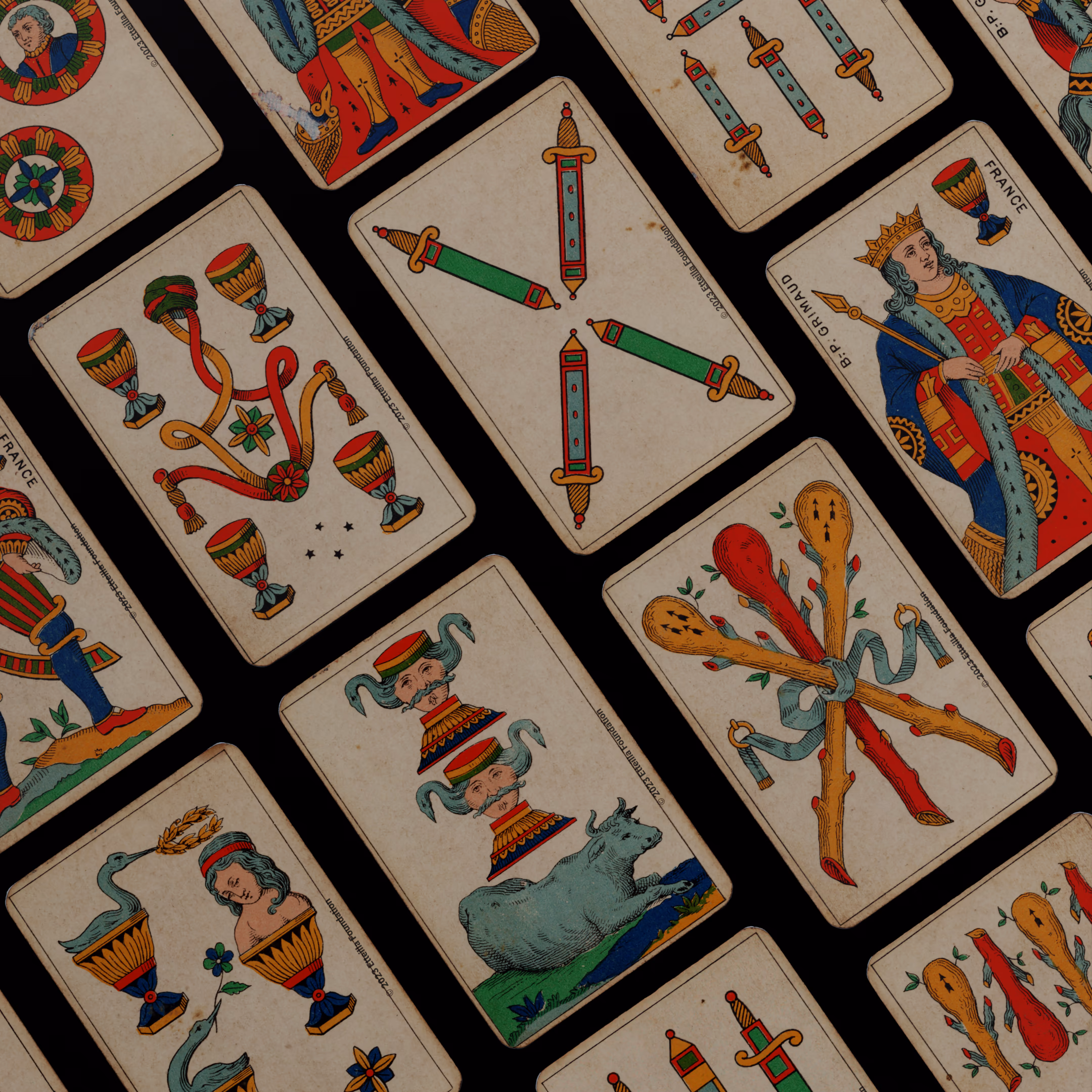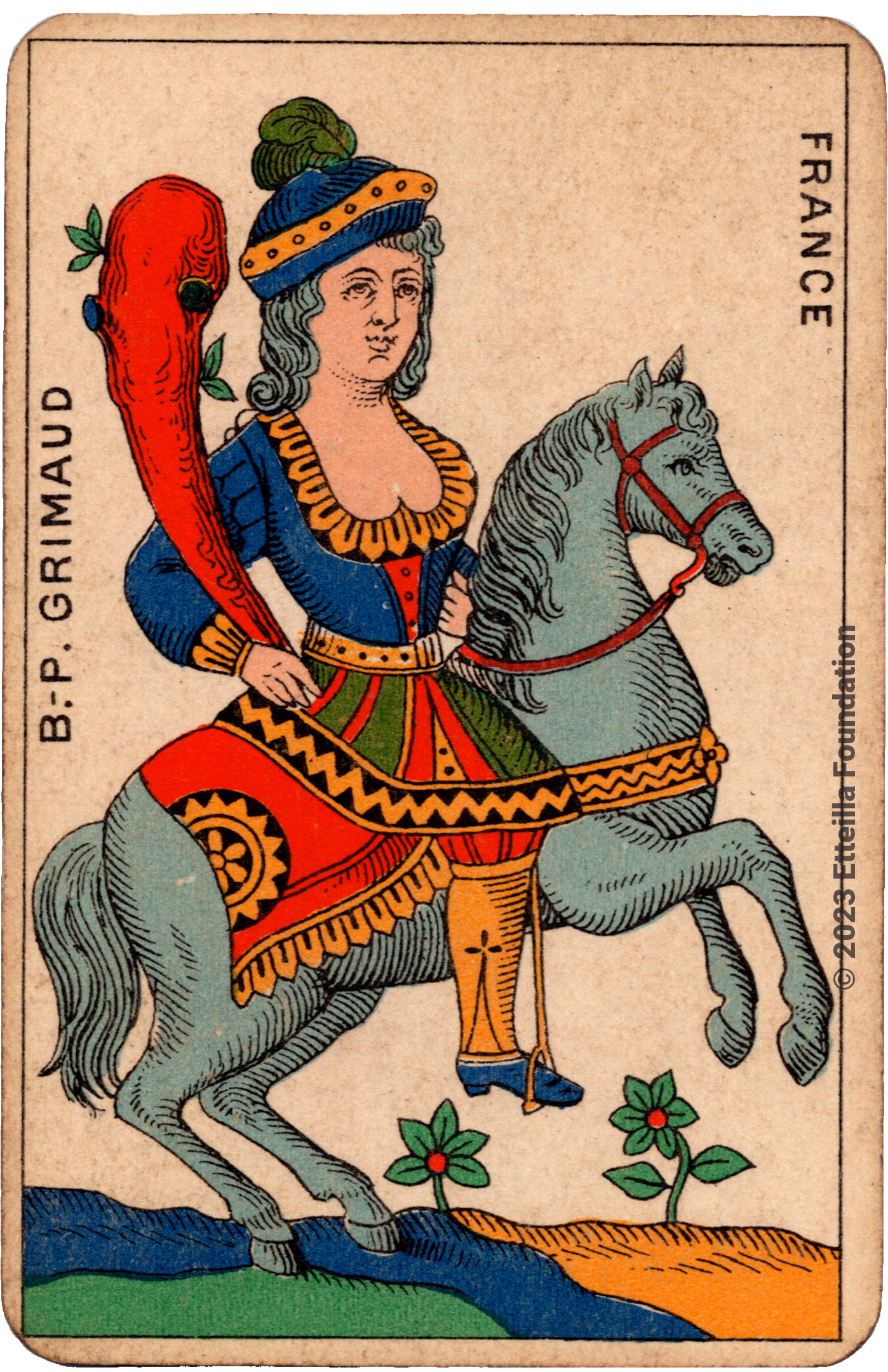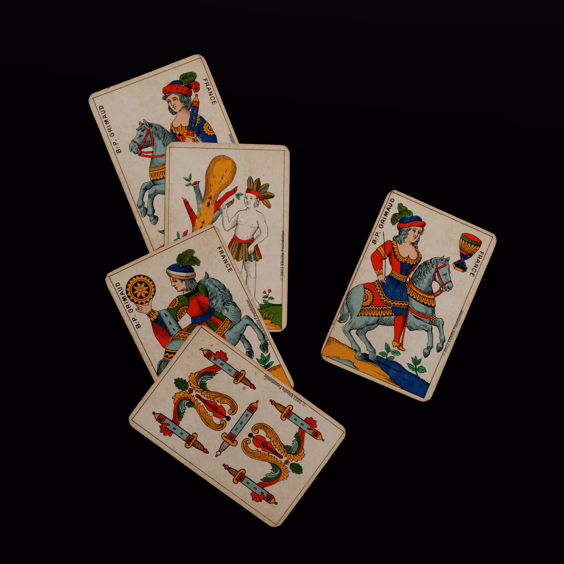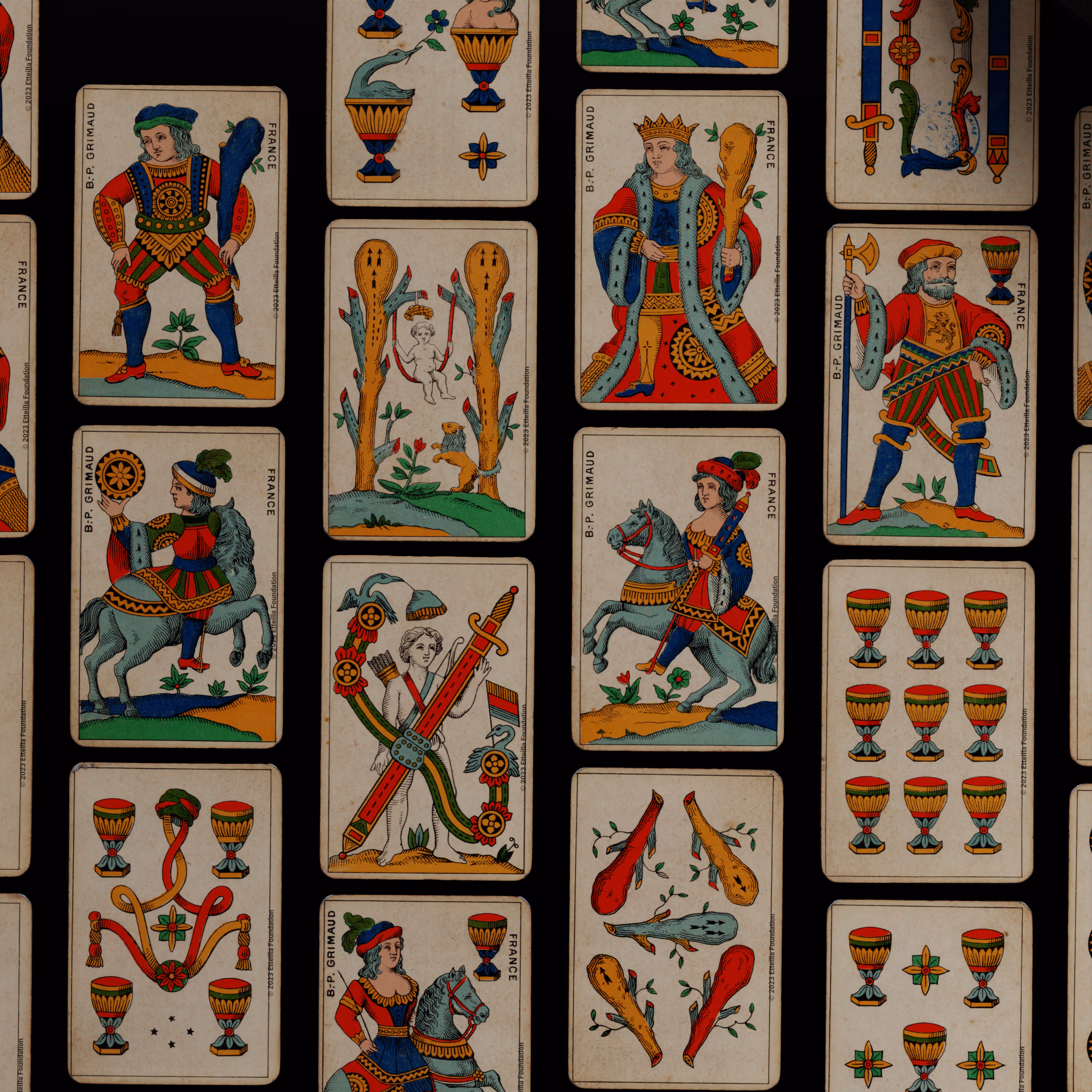 The Aluette Demi-Fine is a Standard Deck of playing cards, manufactured by Baptiste-Paul Grimaud in France in the year 1880. This french deck uncommonly uses the spanish pattern instead of the french pattern.