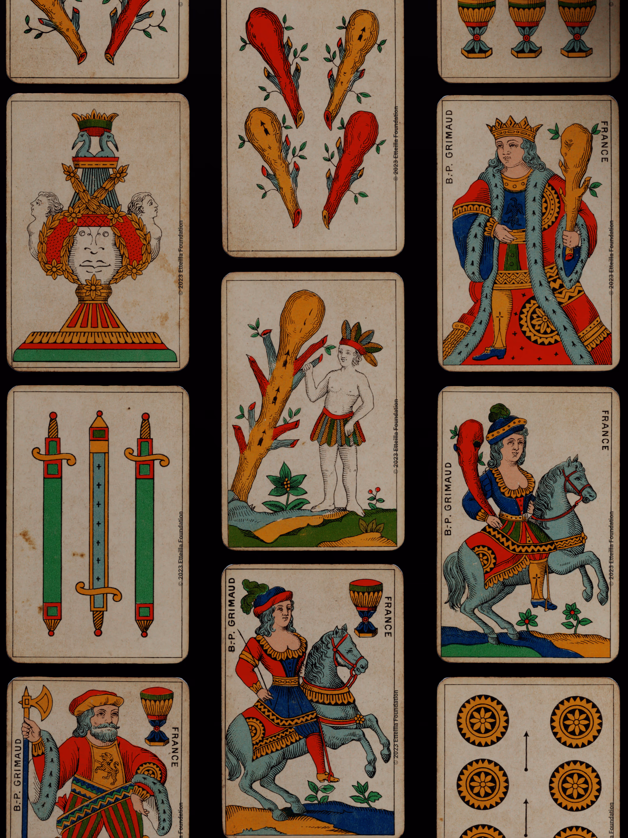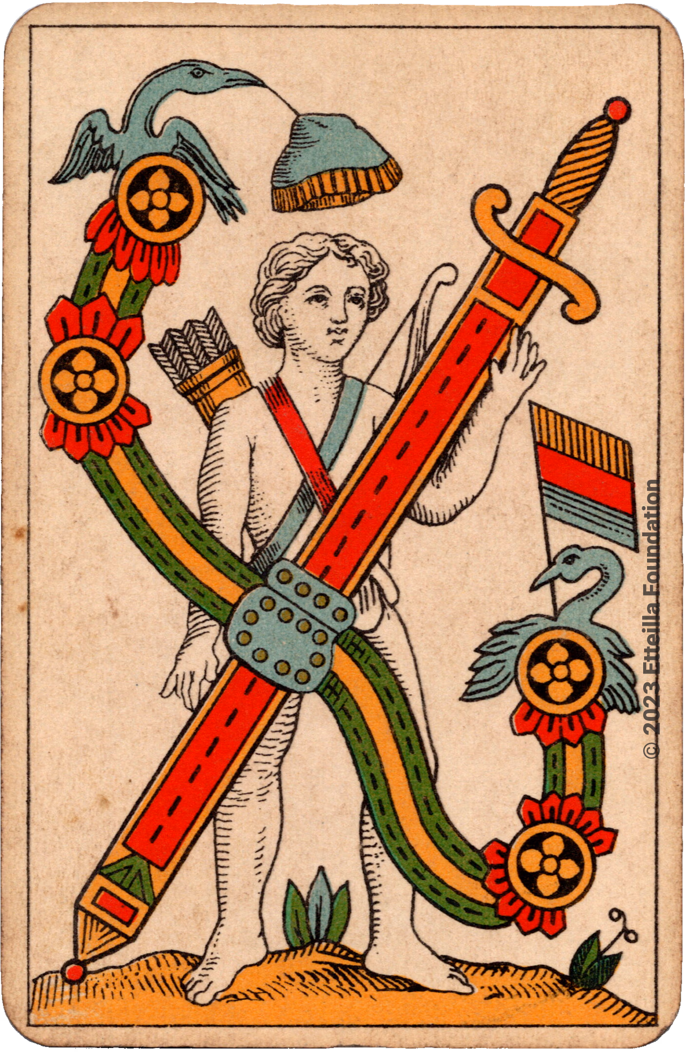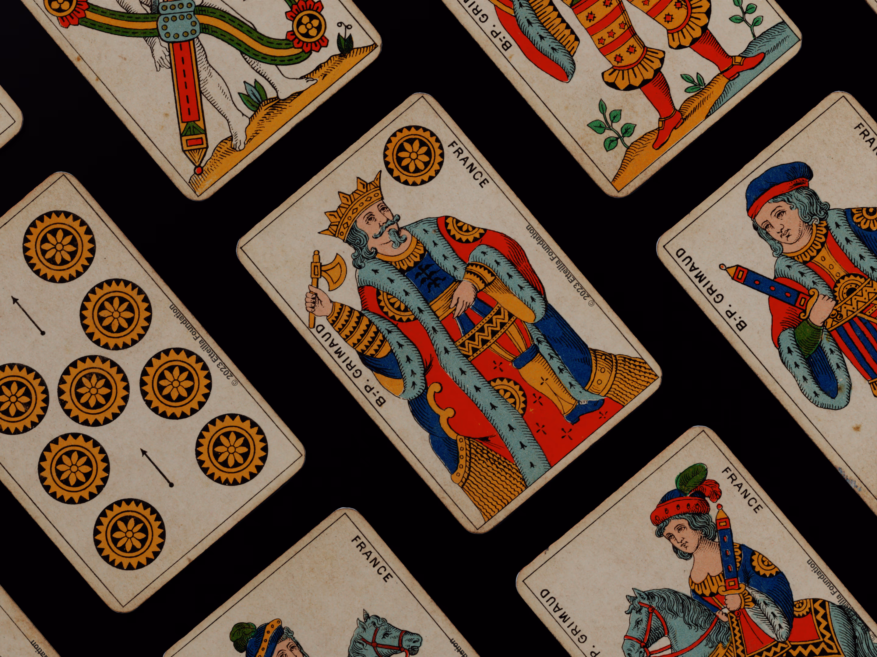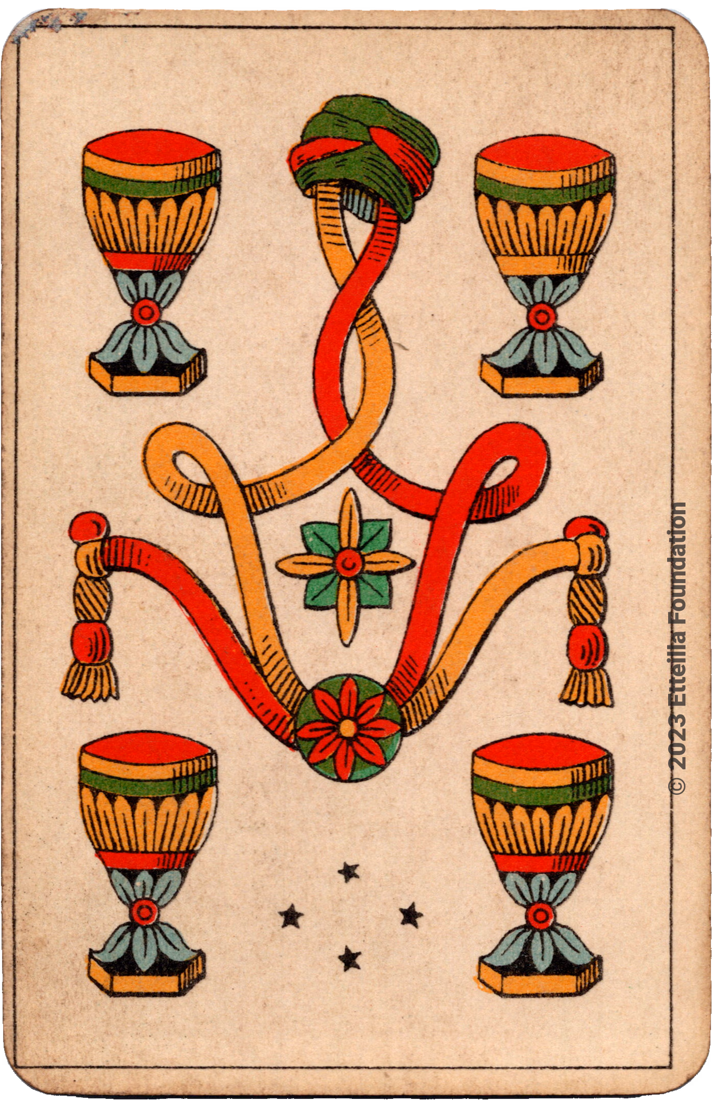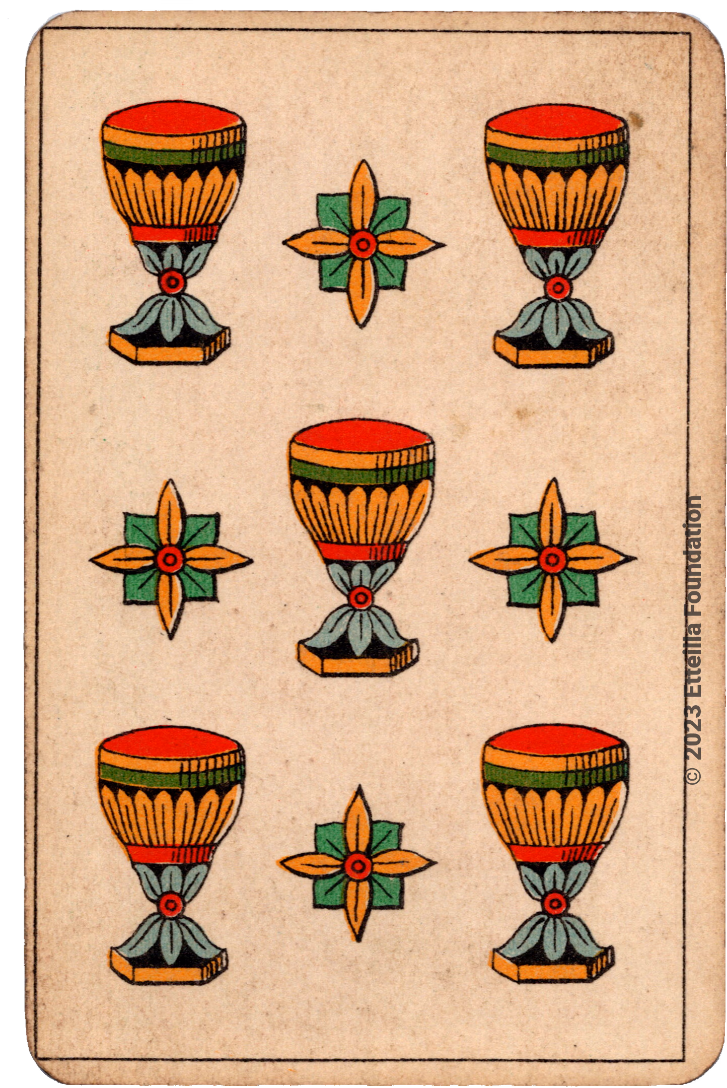 The Aluette Demi-Fine is a Standard Deck of playing cards, manufactured by Baptiste-Paul Grimaud in France in the year 1880. This french deck uncommonly uses the spanish pattern instead of the french pattern.