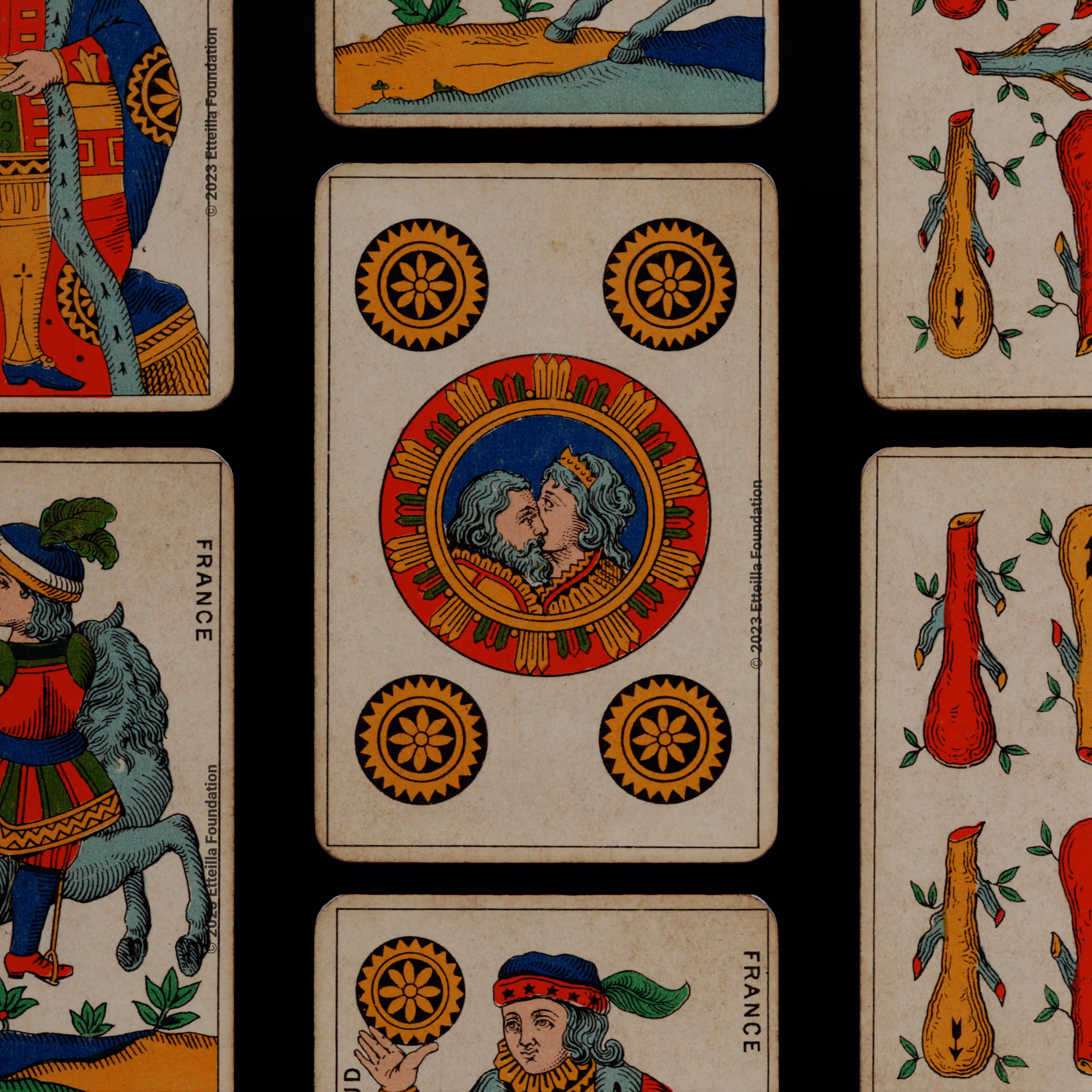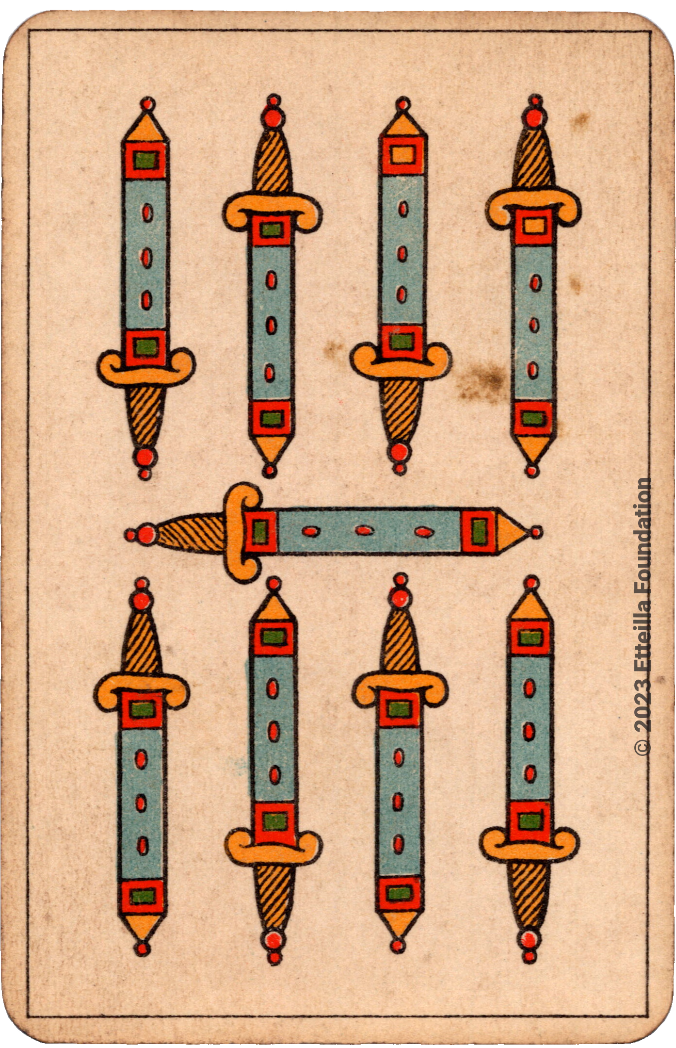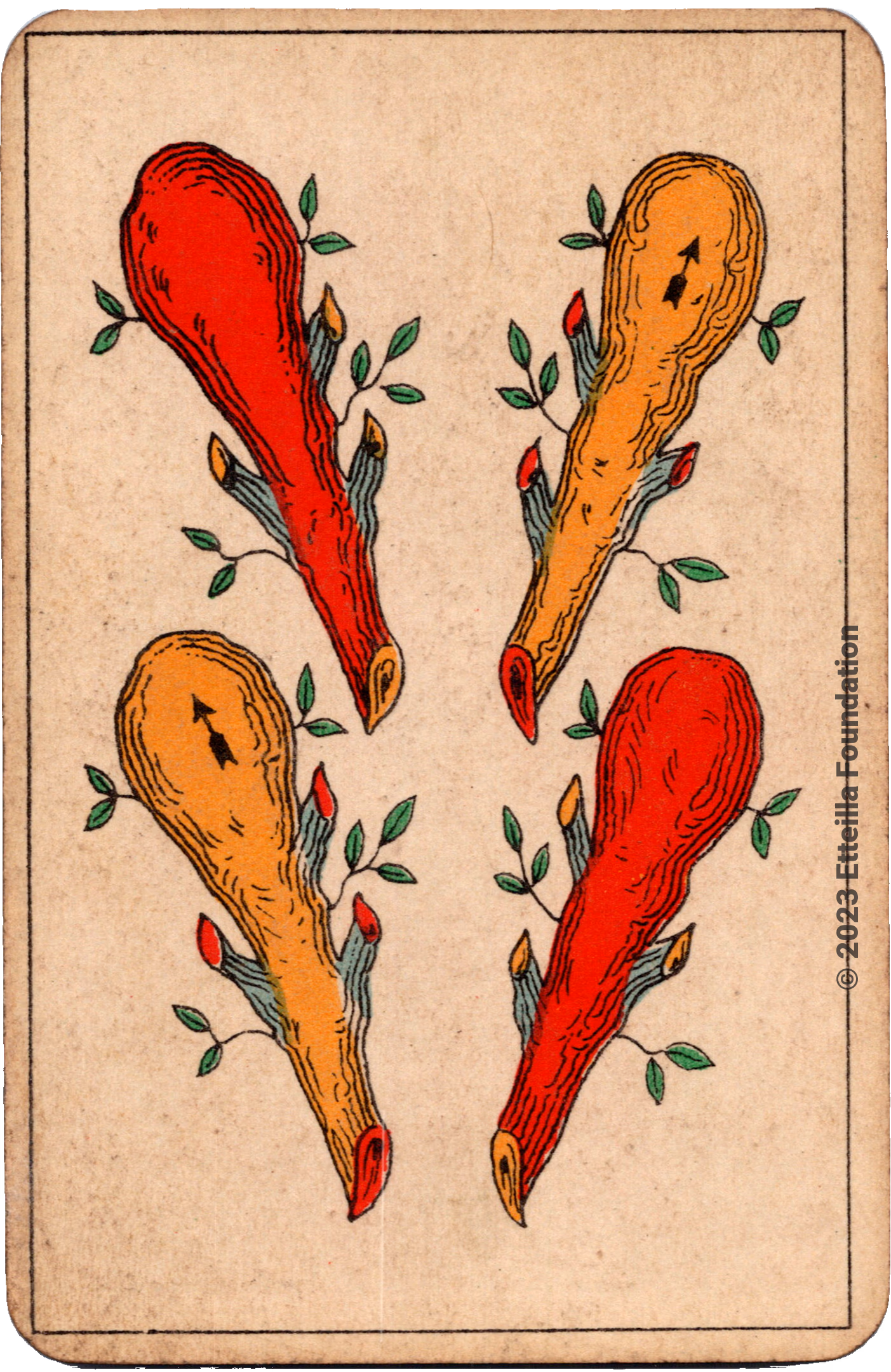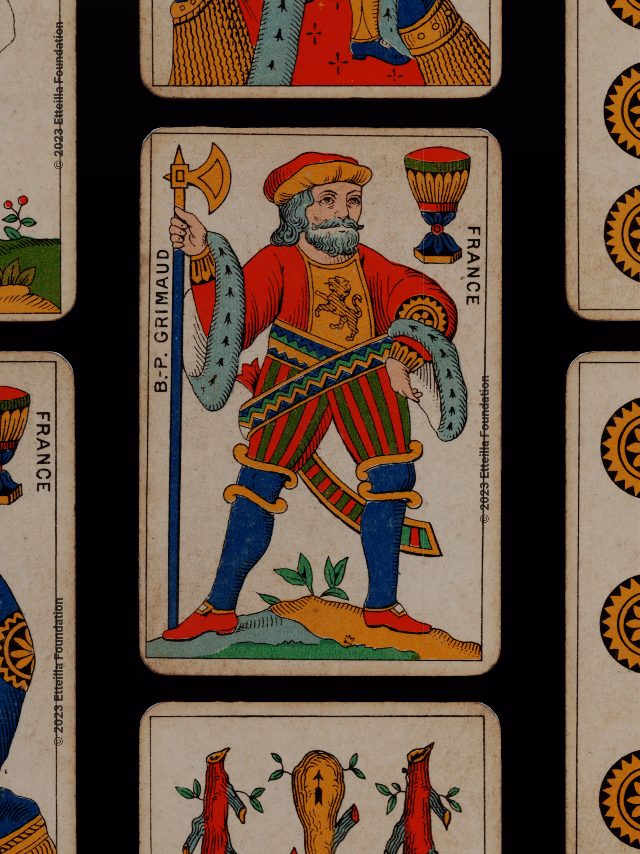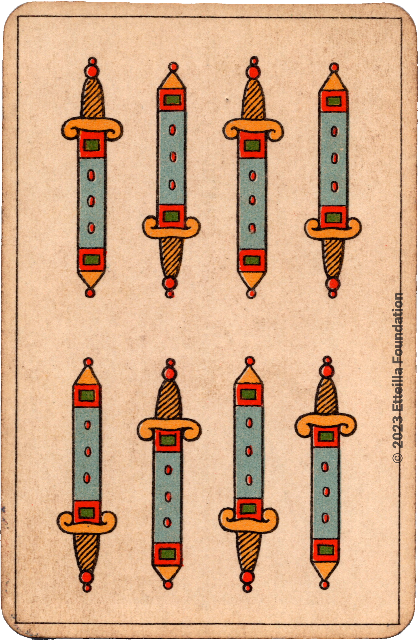 The Aluette Demi-Fine is a Standard Deck of playing cards, manufactured by Baptiste-Paul Grimaud in France in the year 1880. This french deck uncommonly uses the spanish pattern instead of the french pattern.