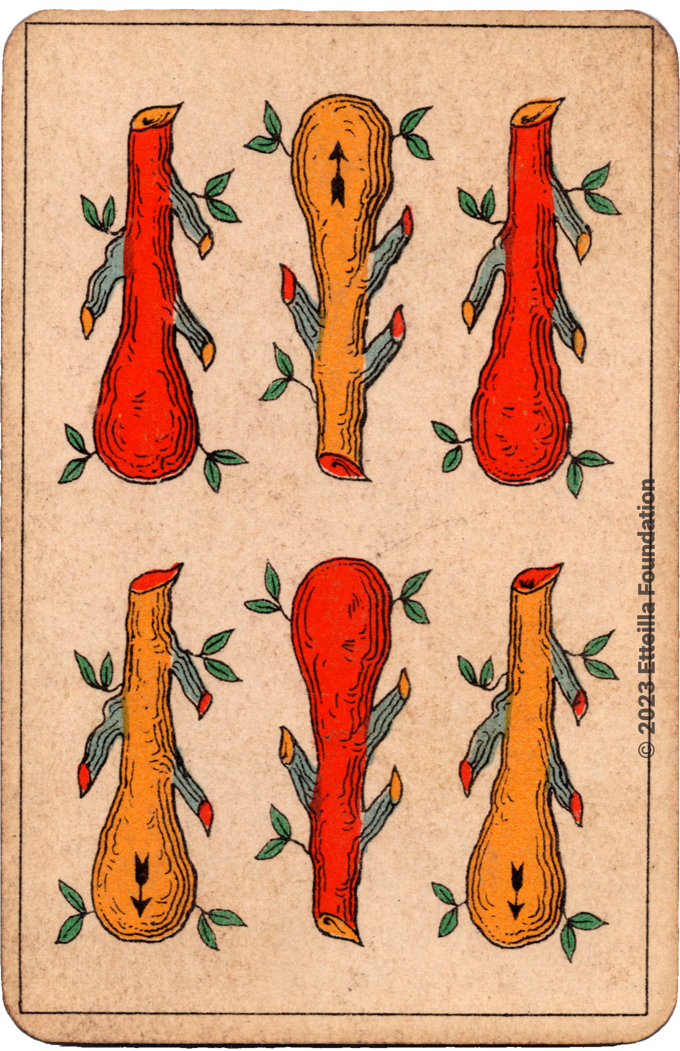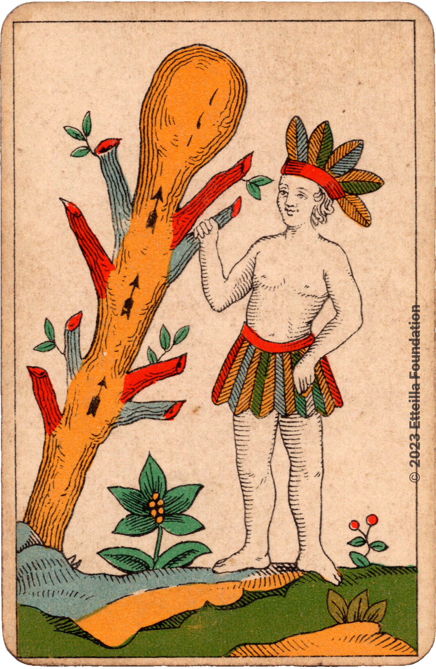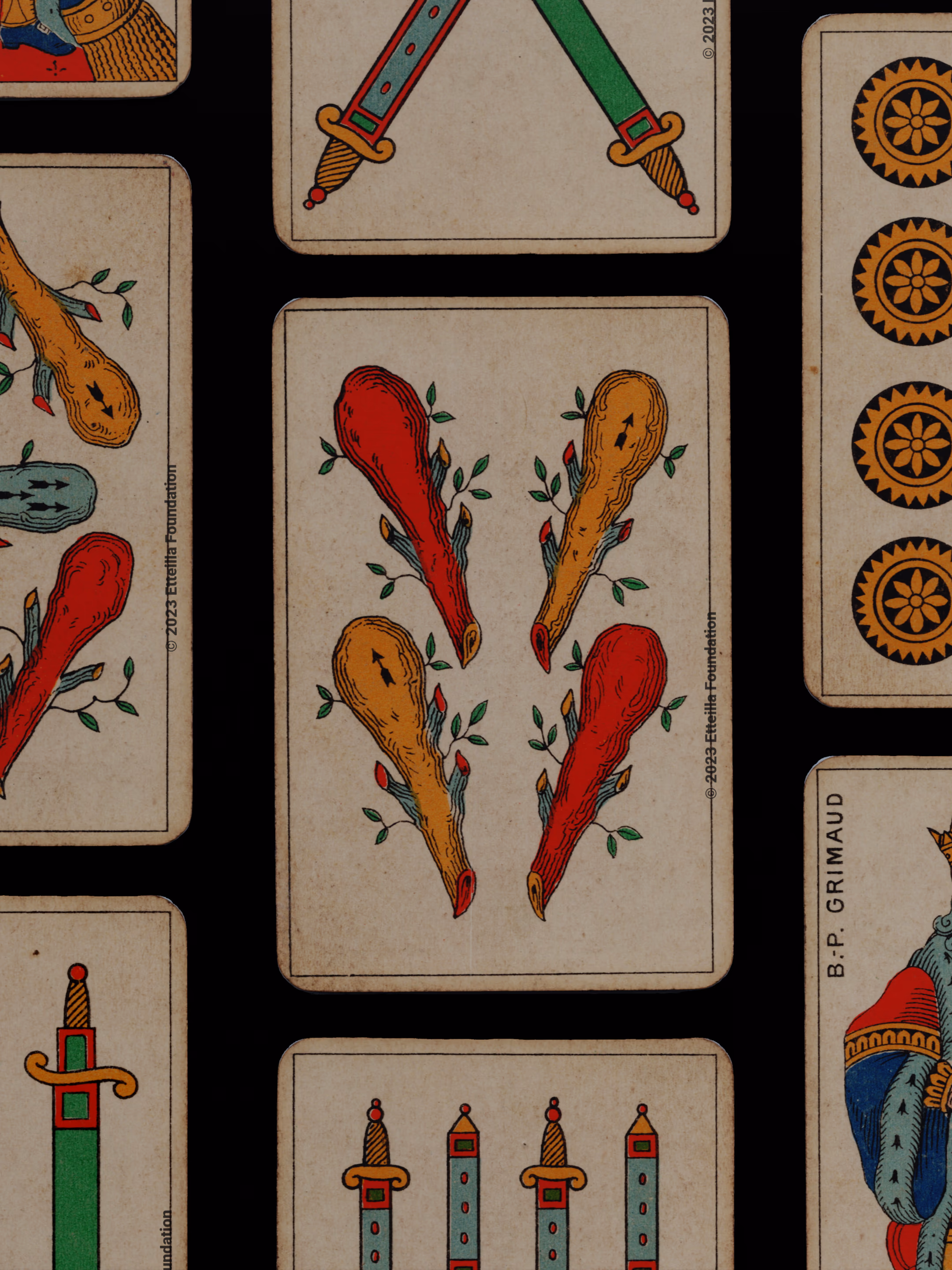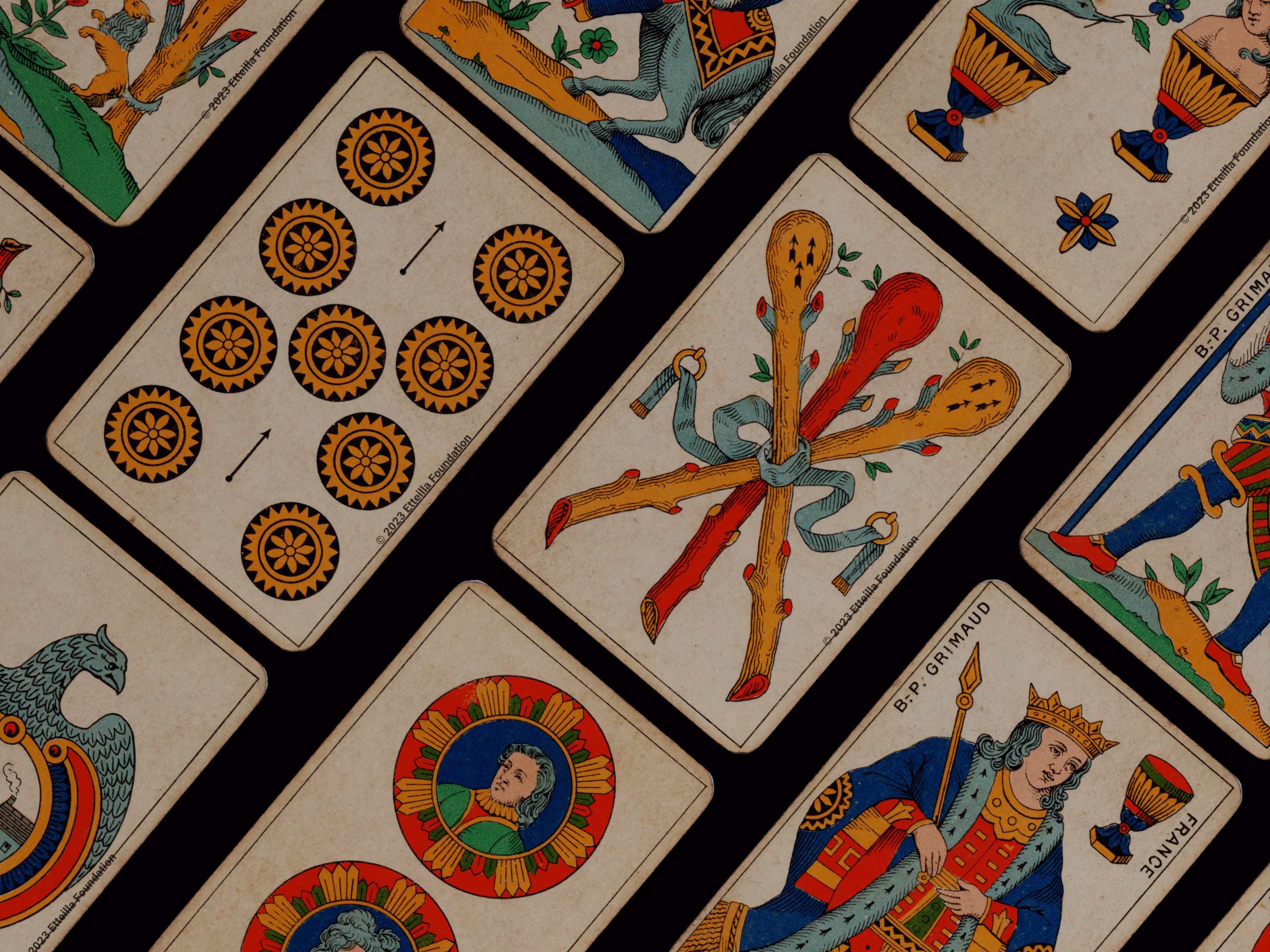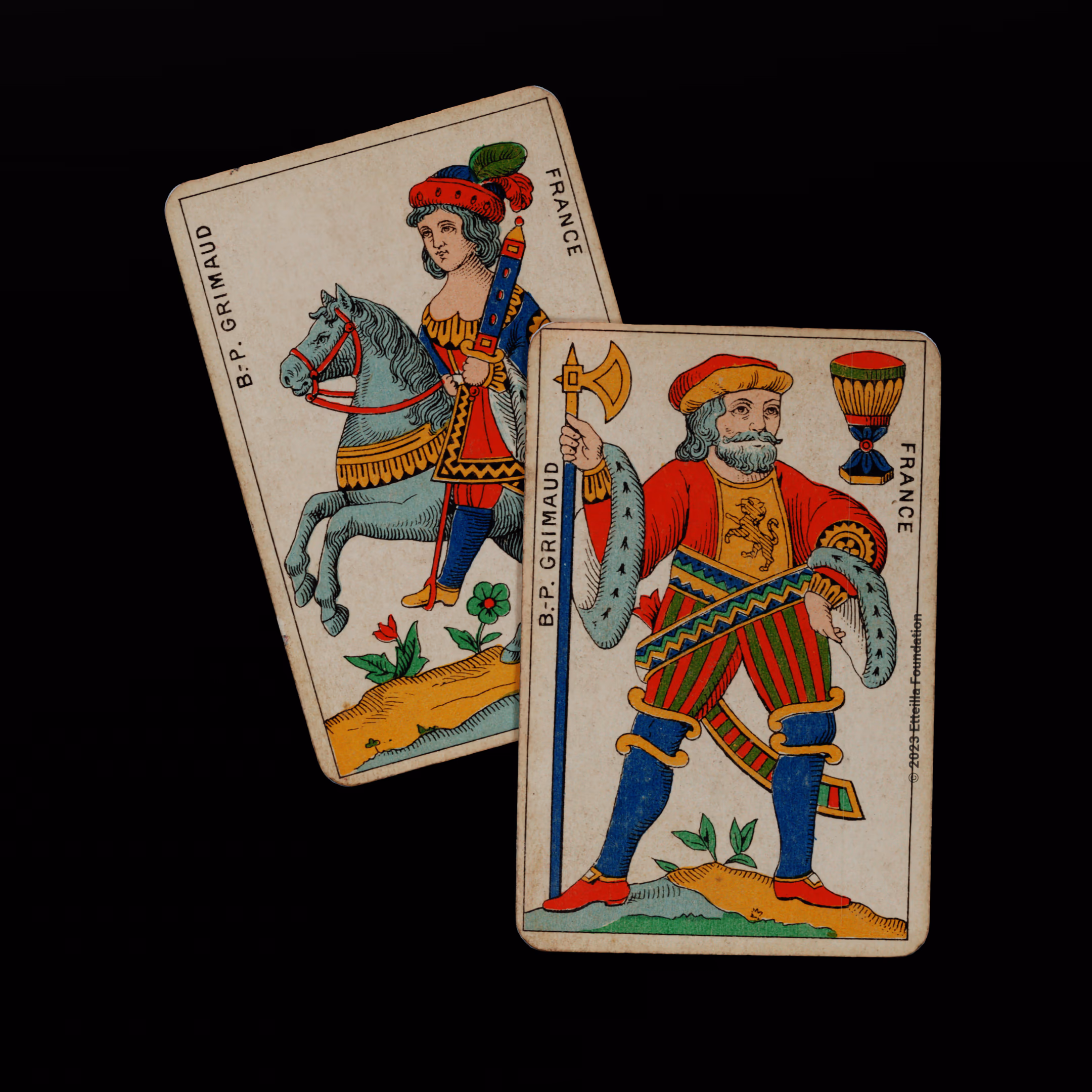 The Aluette Demi-Fine is a Standard Deck of playing cards, manufactured by Baptiste-Paul Grimaud in France in the year 1880. This french deck uncommonly uses the spanish pattern instead of the french pattern.