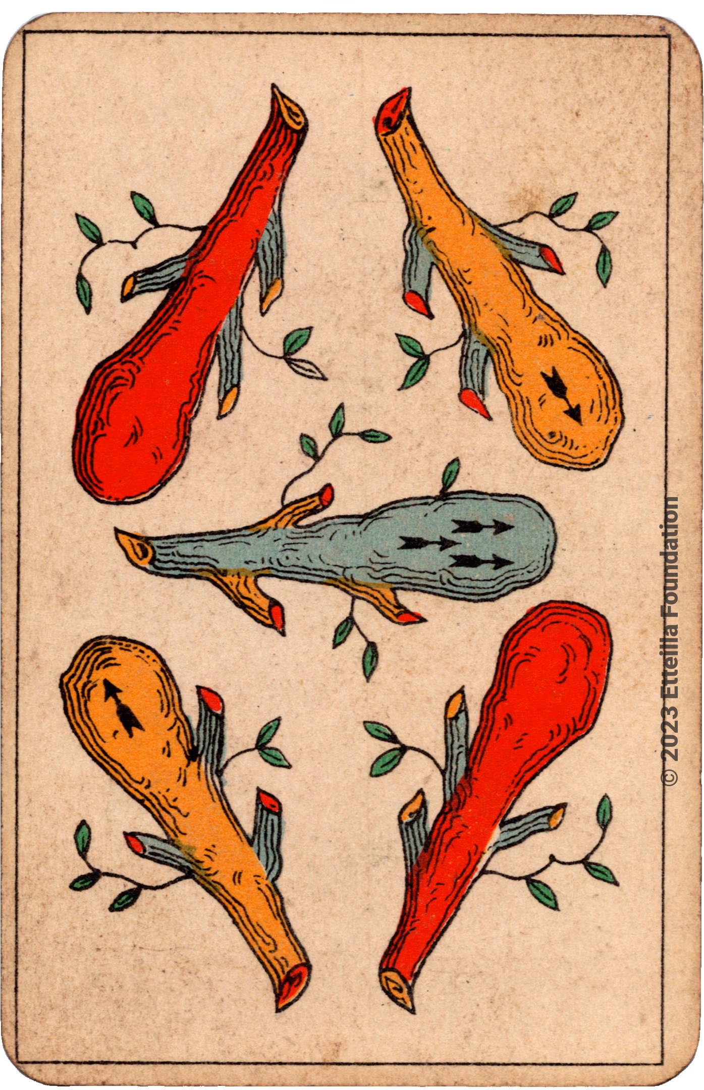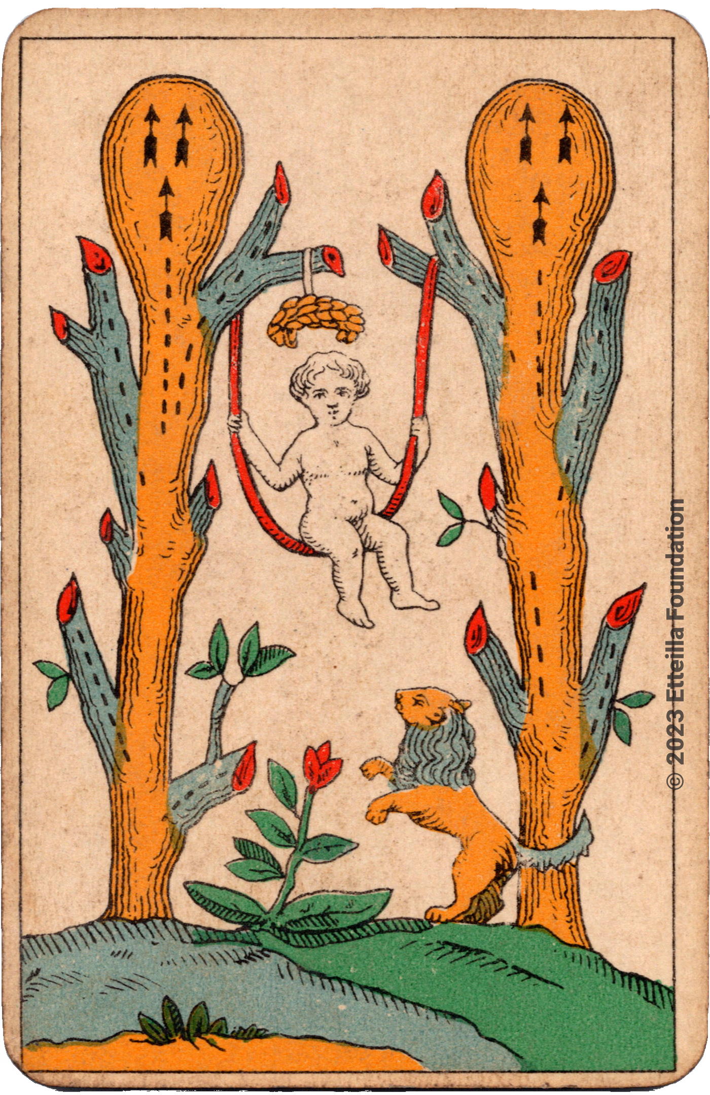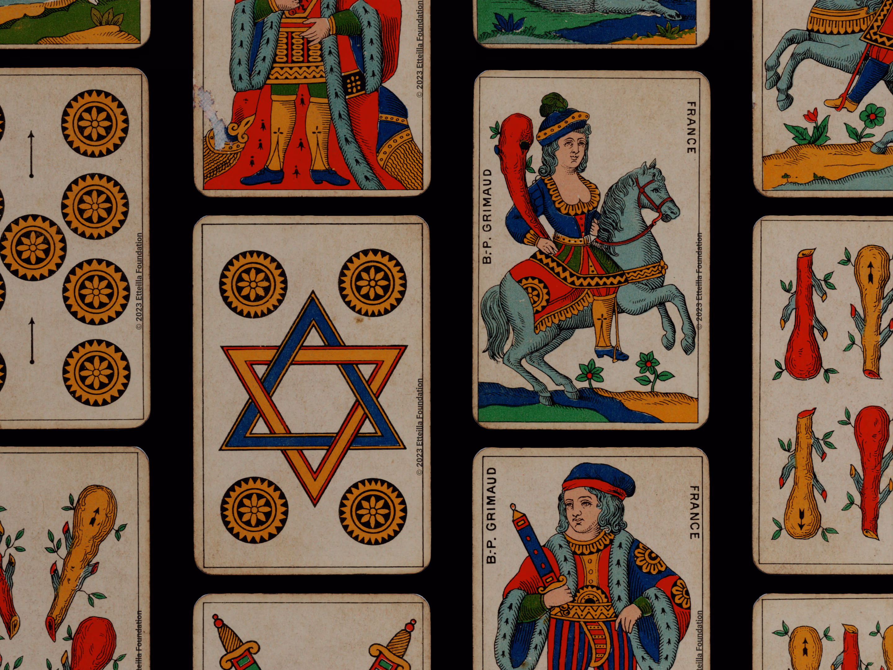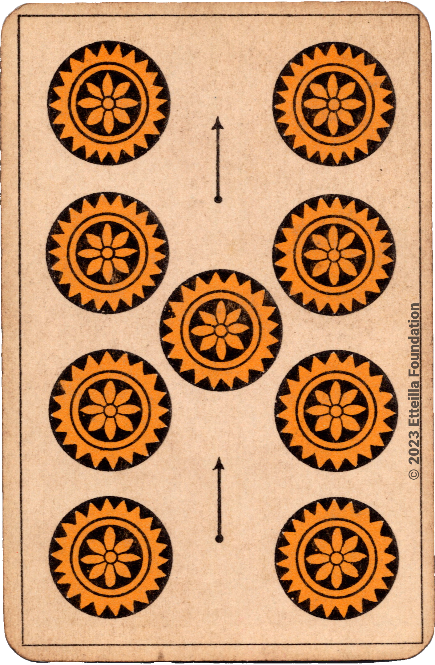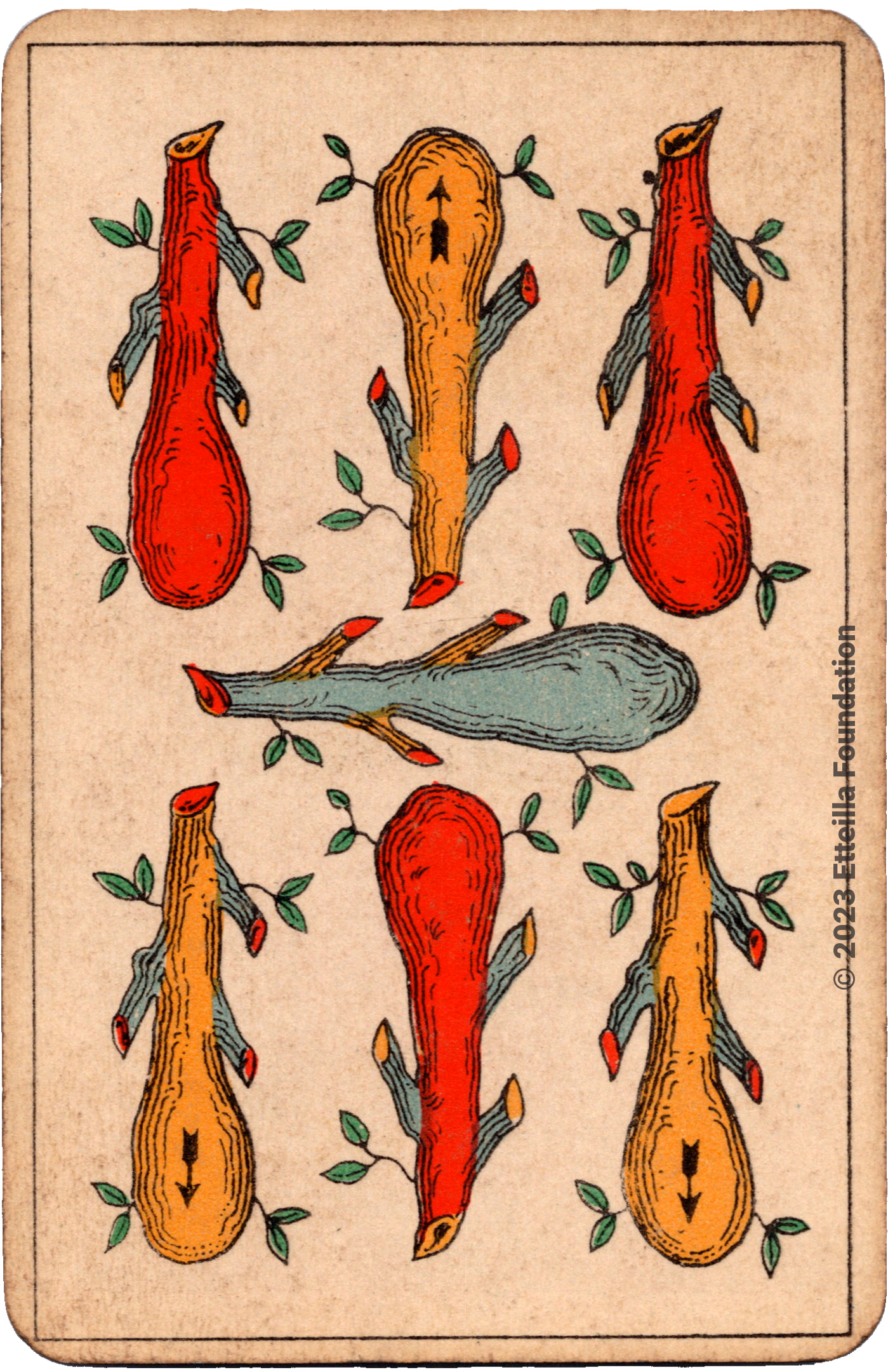 The Aluette Demi-Fine is a Standard Deck of playing cards, manufactured by Baptiste-Paul Grimaud in France in the year 1880. This french deck uncommonly uses the spanish pattern instead of the french pattern.