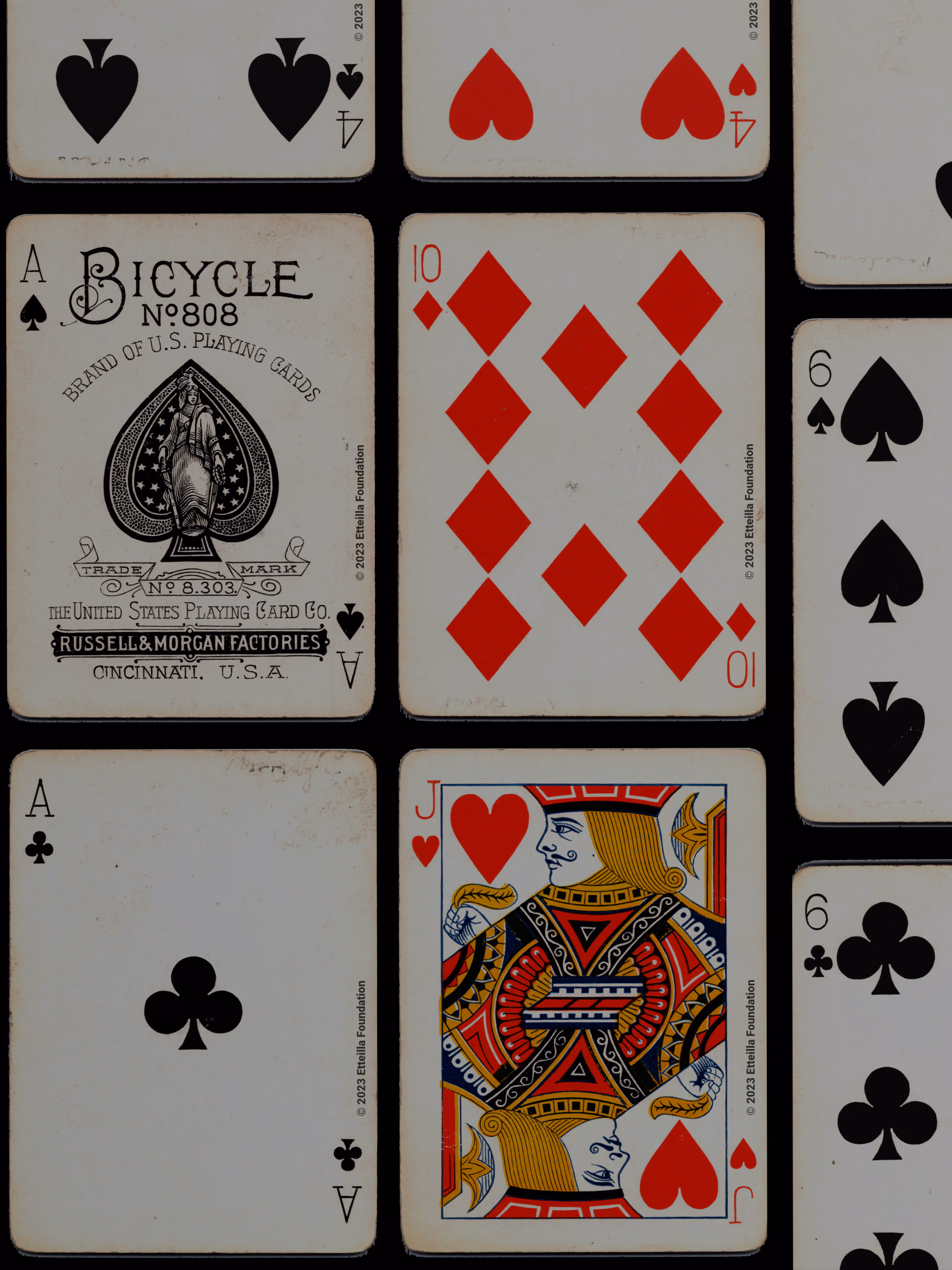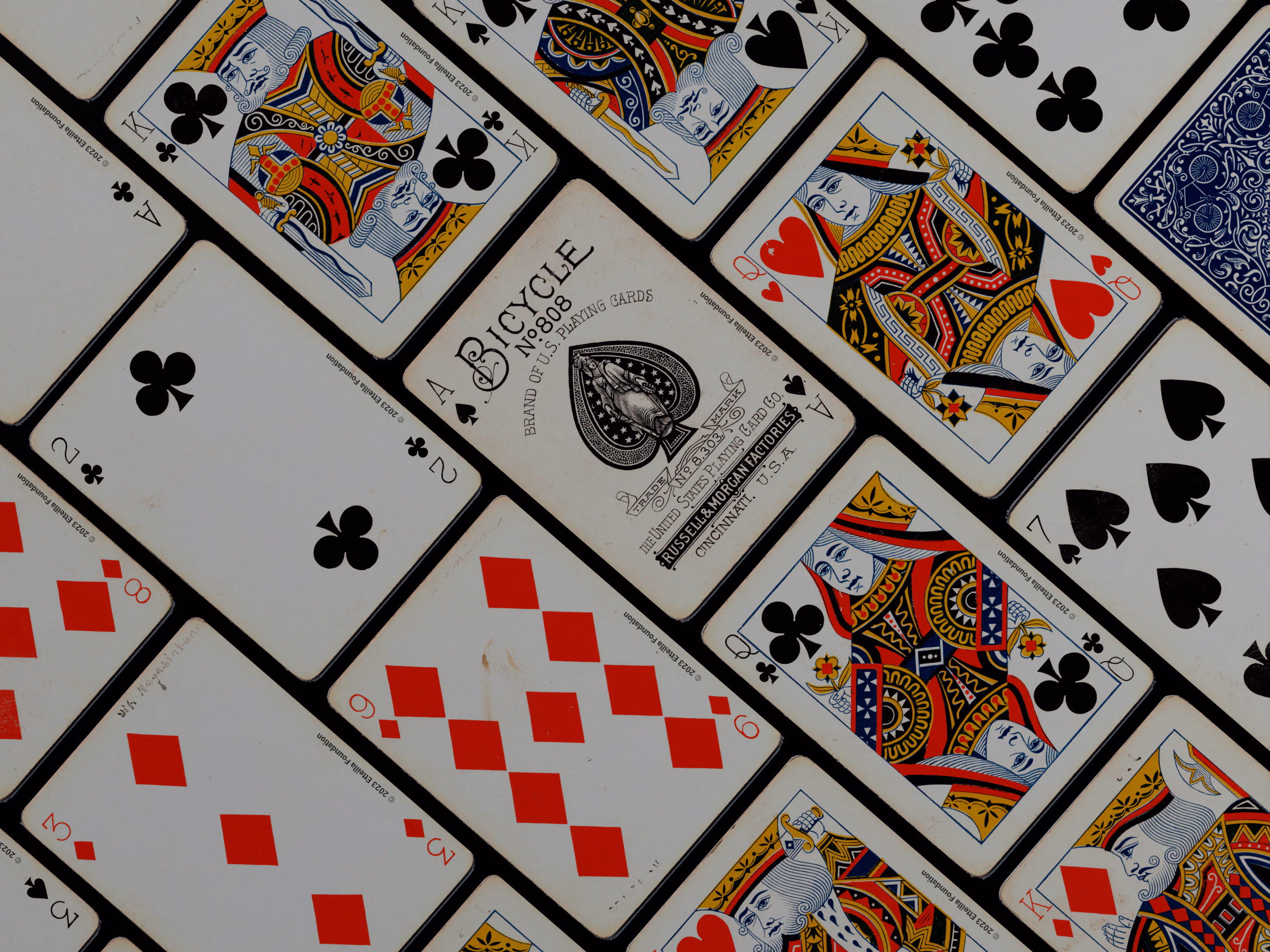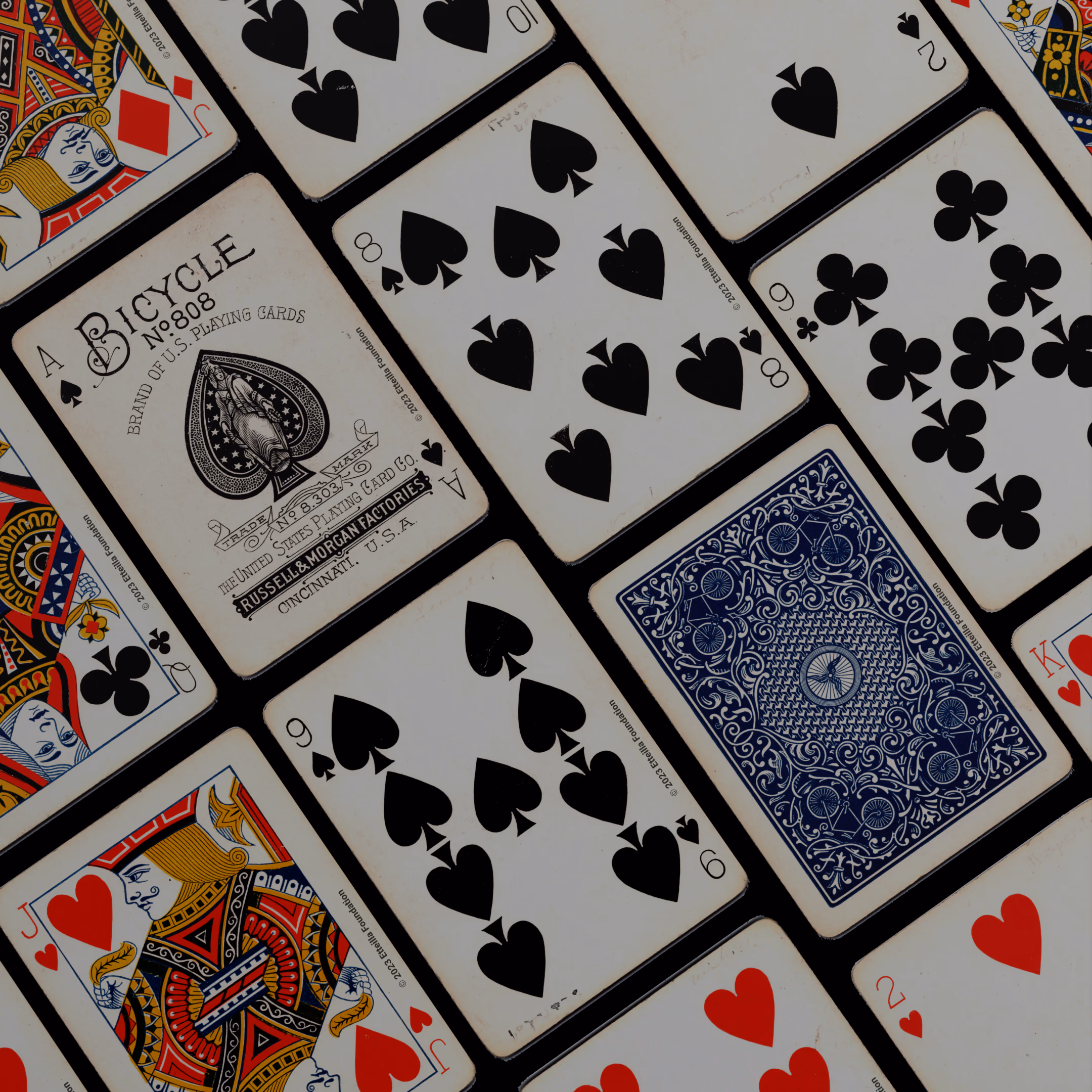 The 1895 Bicycle 808 is a Standard Deck type of playing cards, manufactured by The United States Playing Card Company. This deck was created in the USA in 1895. It is recognized for its unique style of figures, a back with a centered wheel, and a distinct wild card design. The deck was printed at the Russell & Morgan factories, a part of the Bicycle brand.