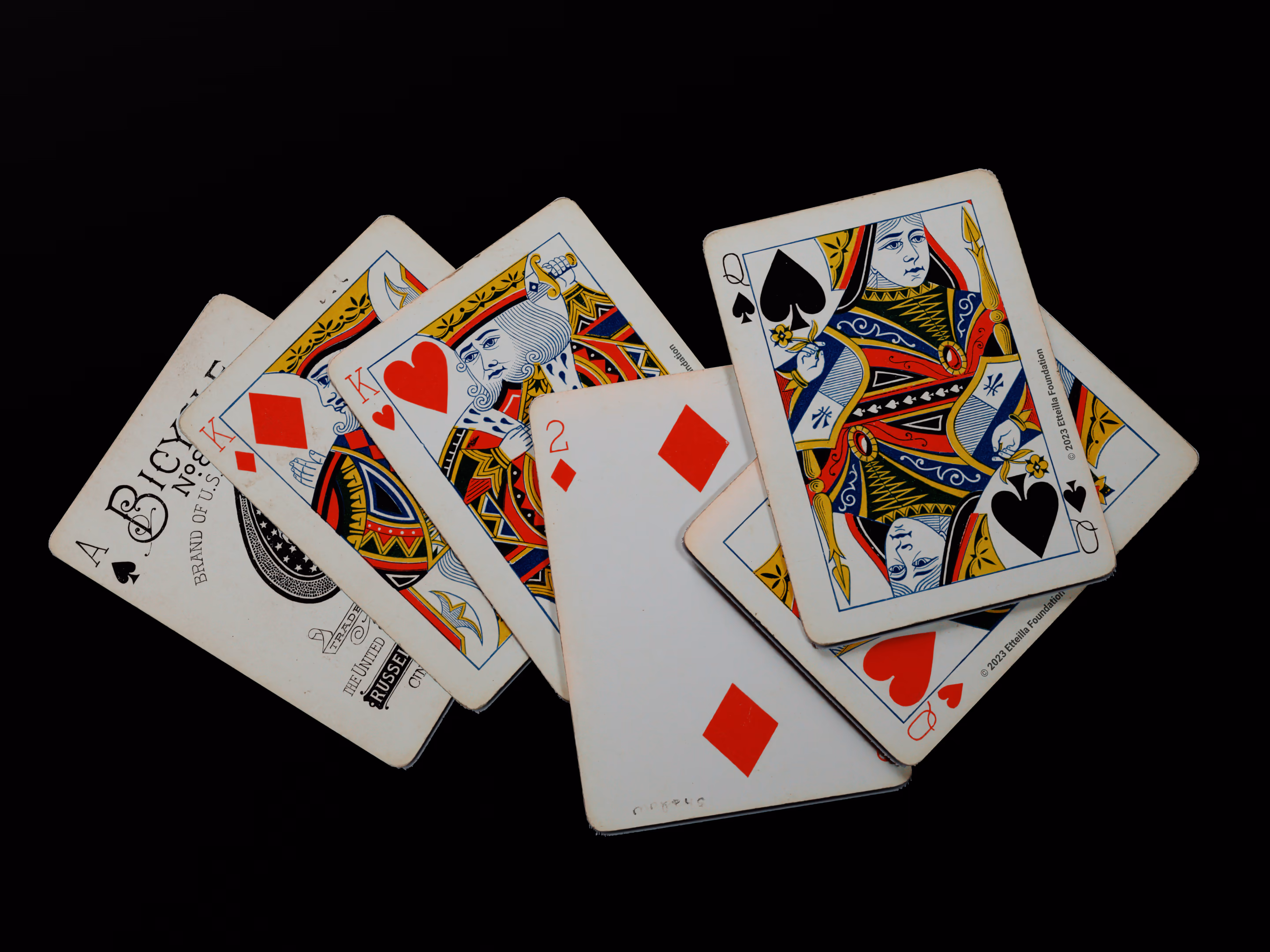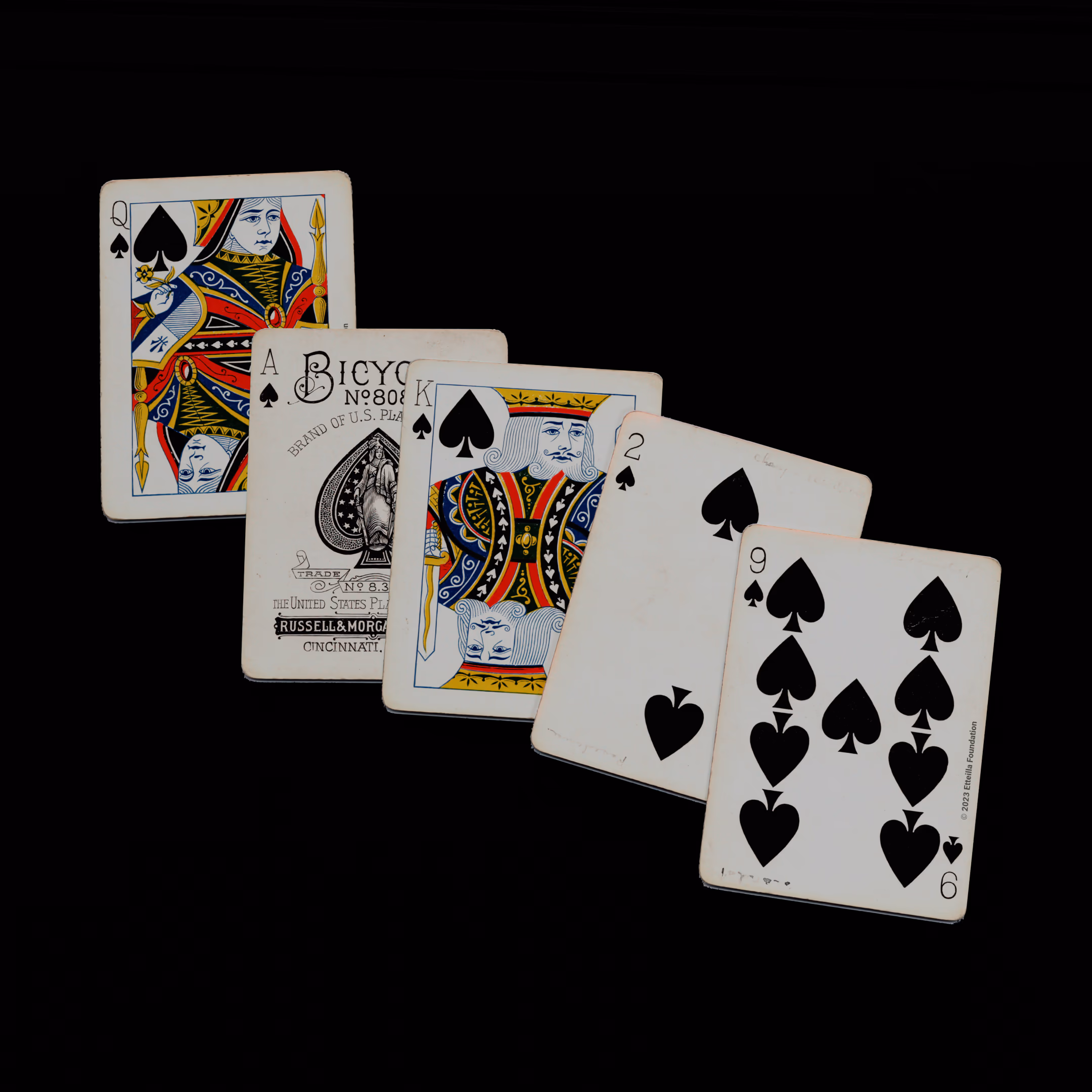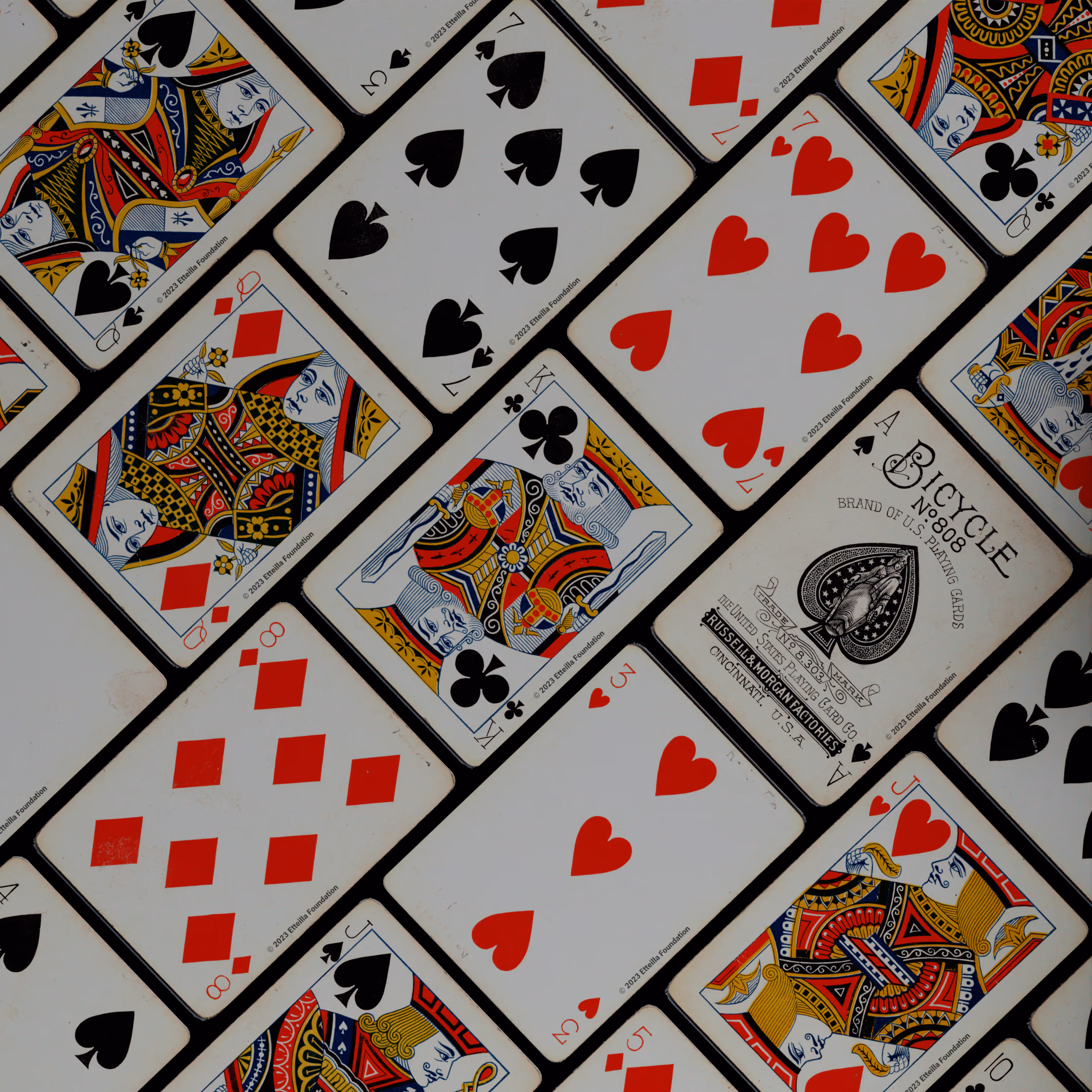 The 1895 Bicycle 808 is a Standard Deck type of playing cards, manufactured by The United States Playing Card Company. This deck was created in the USA in 1895. It is recognized for its unique style of figures, a back with a centered wheel, and a distinct wild card design. The deck was printed at the Russell & Morgan factories, a part of the Bicycle brand.
