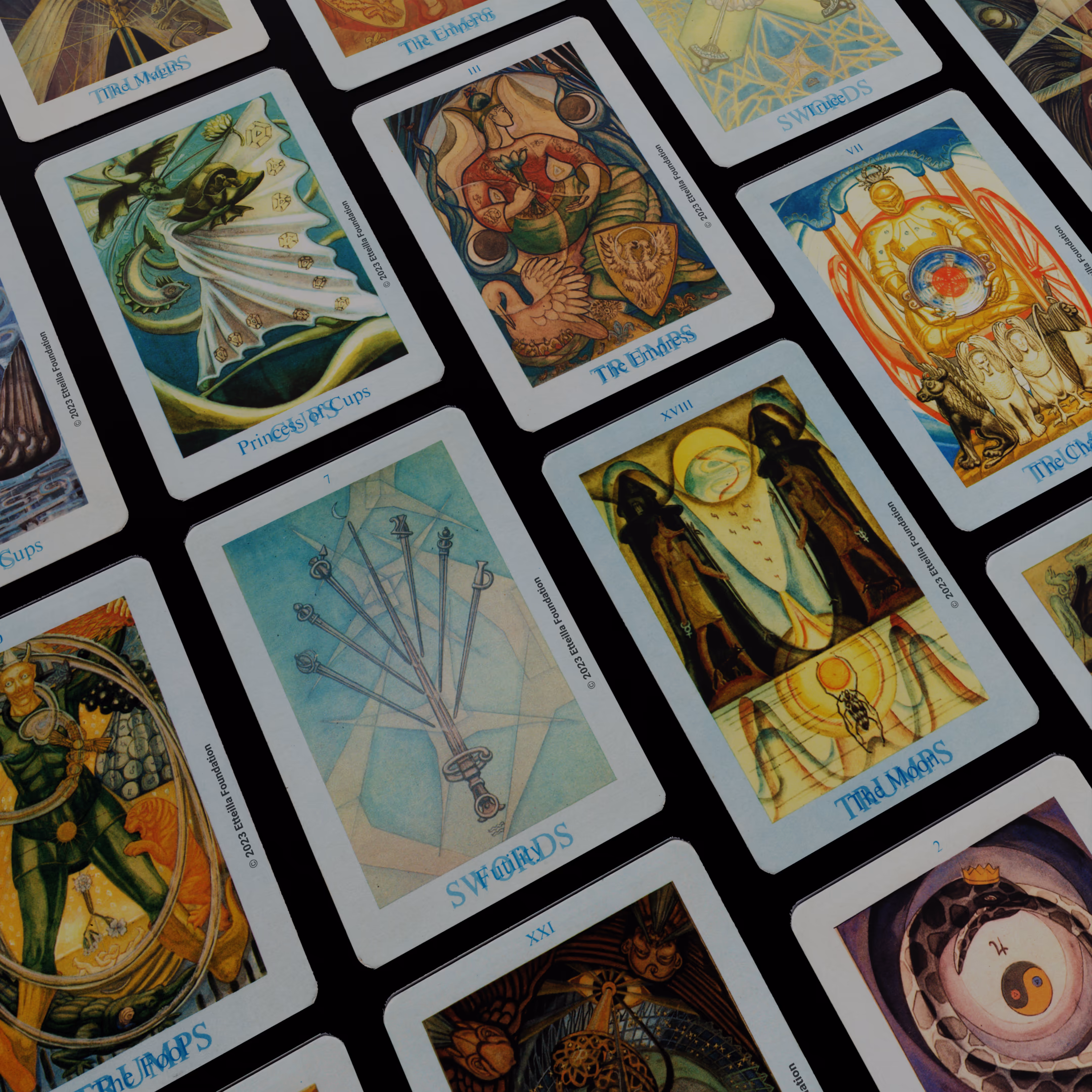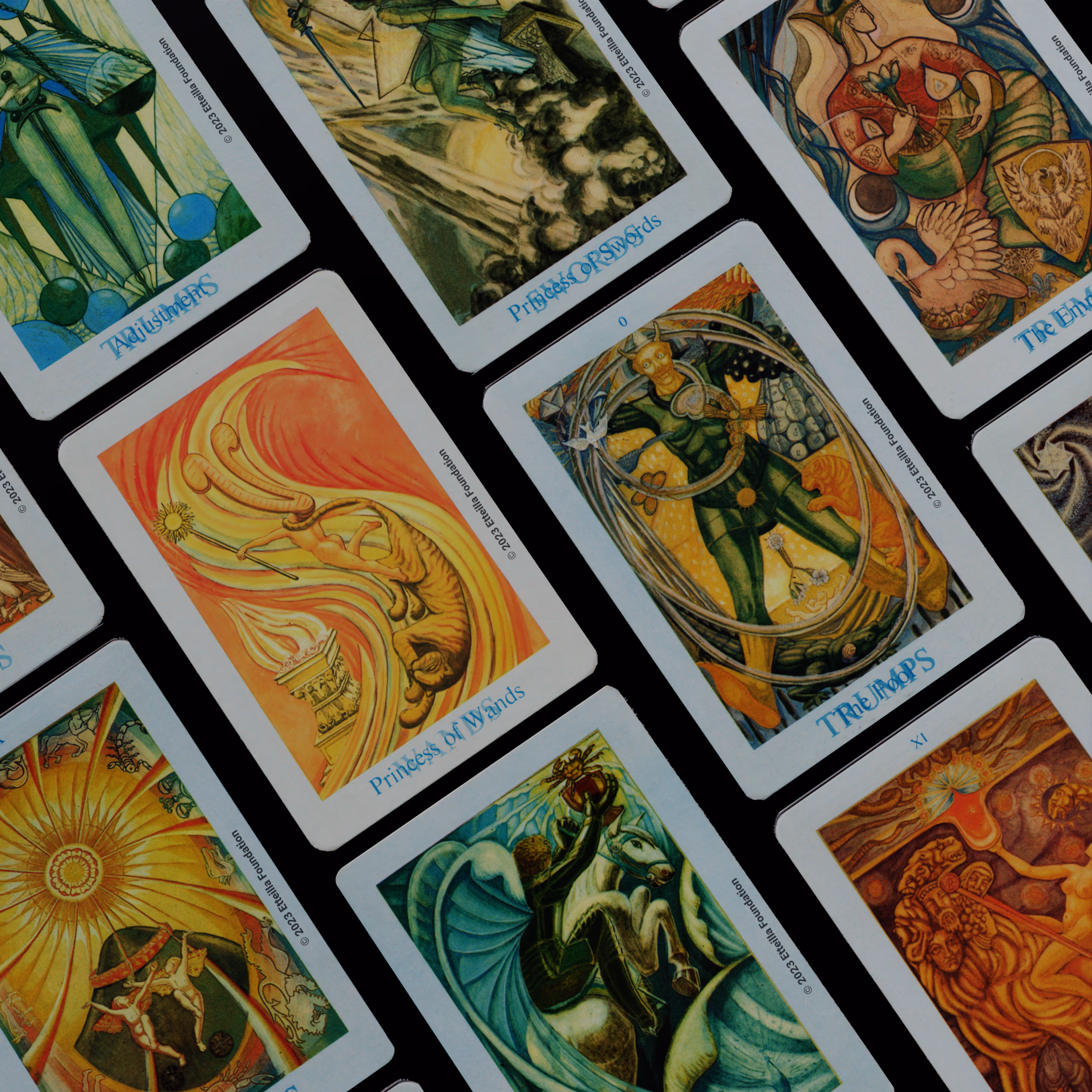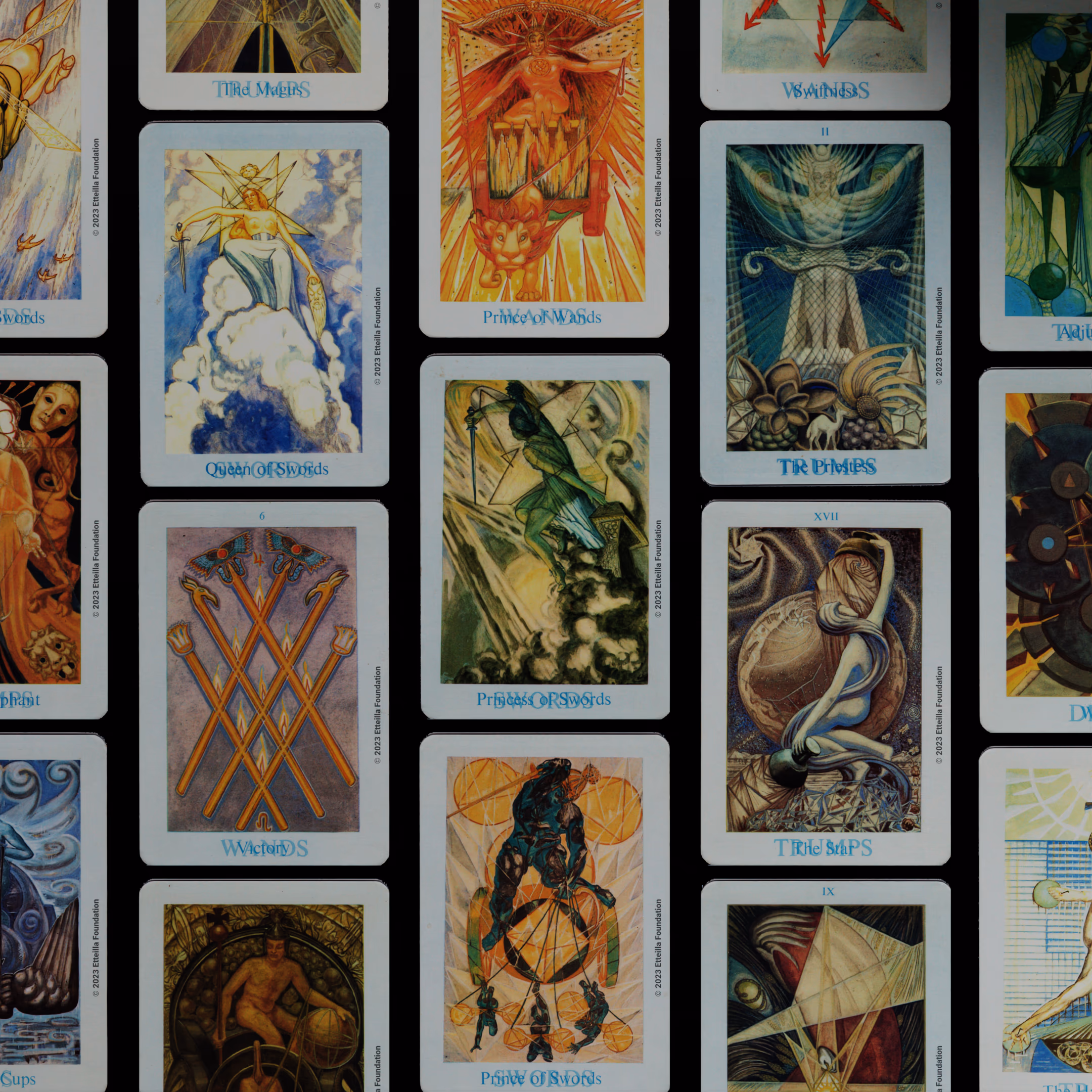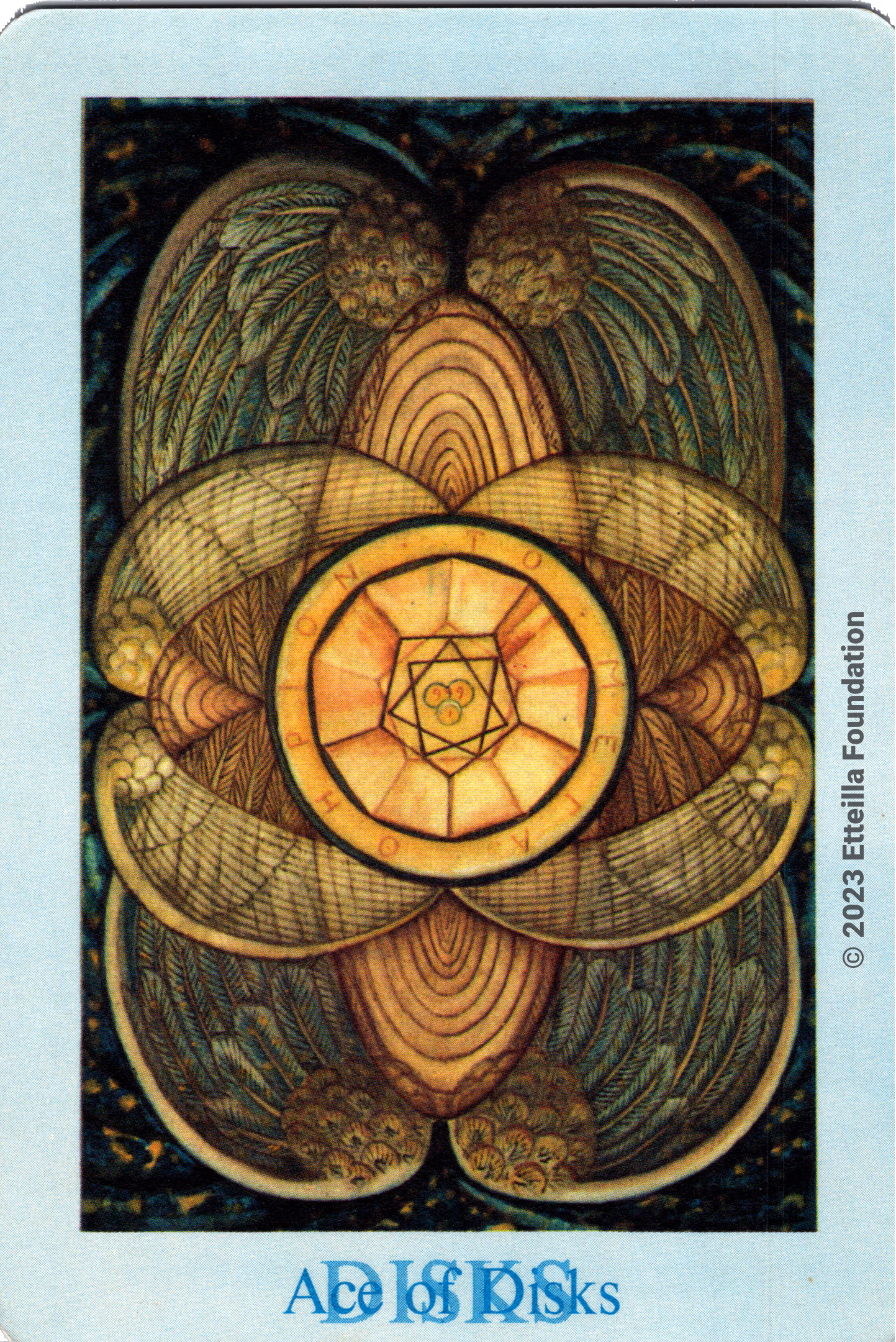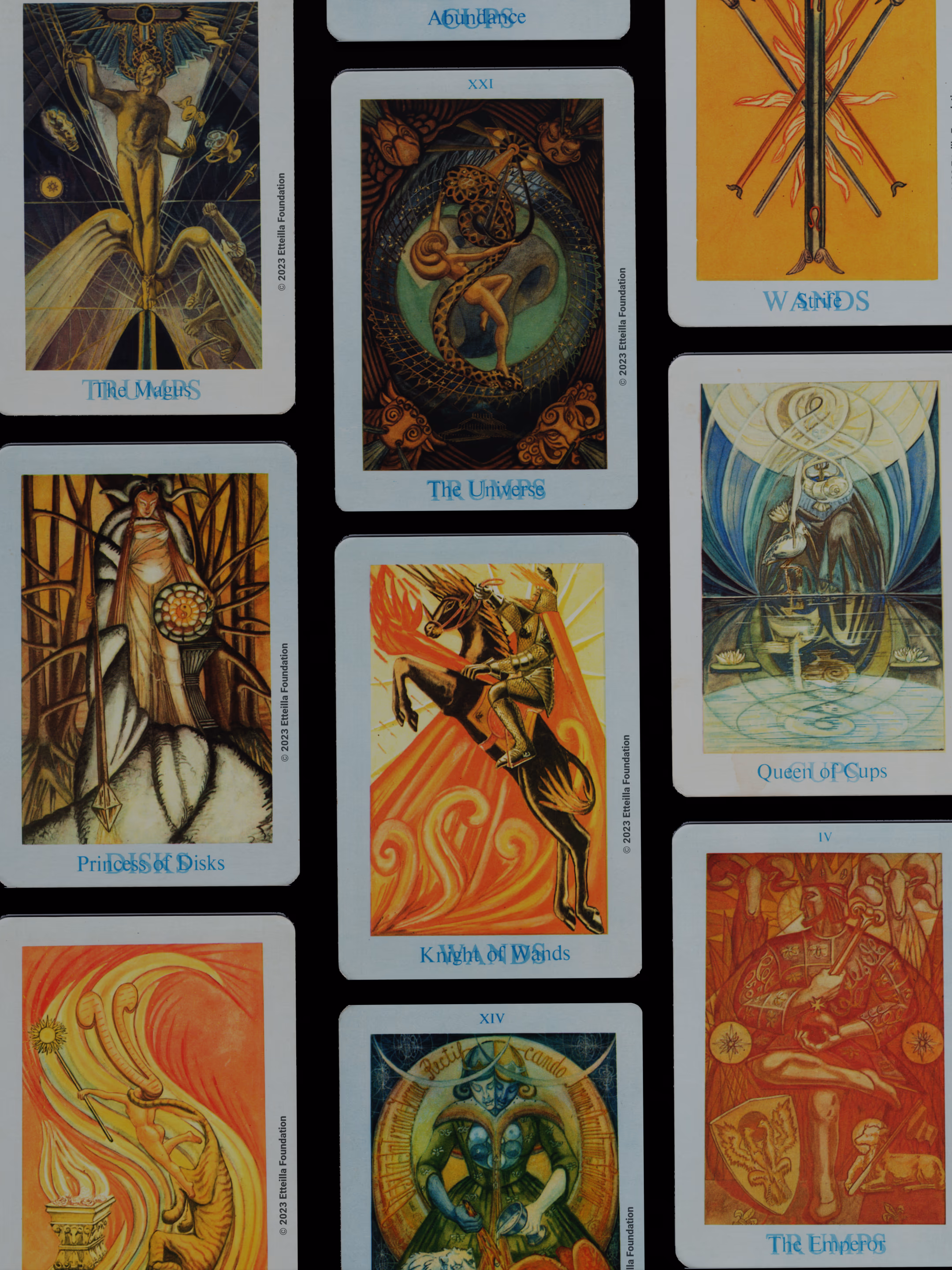 The Thoth Tarot which features very unique card designs and artistic direction is a collaboration between the famous occultist Aleister Crowley who designed the deck, and Lady Frieda Harris who painted the illustrations. This very popular divination tarot created between 1938 and 1943 is notable for having major arcana re-ordered and renamed to allow what Crowley calls the “double zodiac loop” for tarot reading. We note that the suit of disks replace the suit of pentacles found in the Waite-Smith decks and many cards have different names. In particular the Knights replace the Kings, The Knights become the Princes and the Pages are replaced by the Princesses.This version, commonly referred as A1, which was the first colored version printed by Llewellyn in Hong Hong circa 1967 is highly recognizable due to two printing mistakes: The 8 of Cups doesn’t have a number at the top and the Ace of Disk illustration is printed upside-down. All colored versions of the Toth decks are believed to be derived from the prints included in the original limited edition of the Toth book printed by Crowley circa 1944 not Frieda original paintings. Our deck is complete, in mint condition and come with its box.