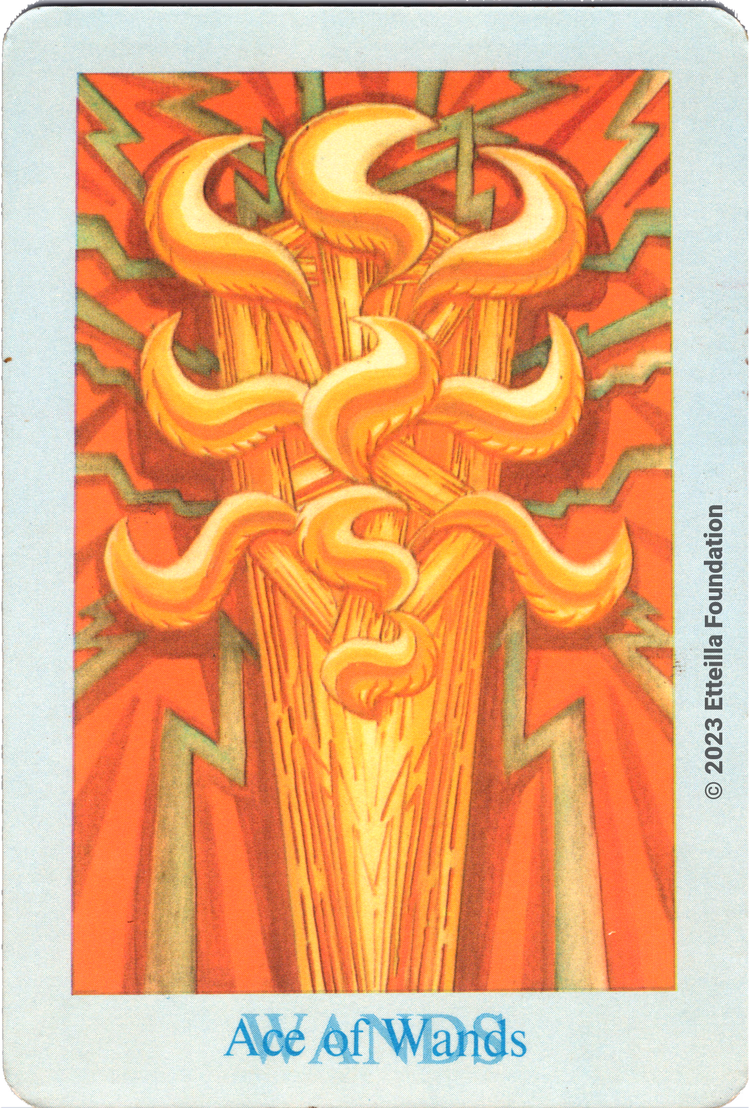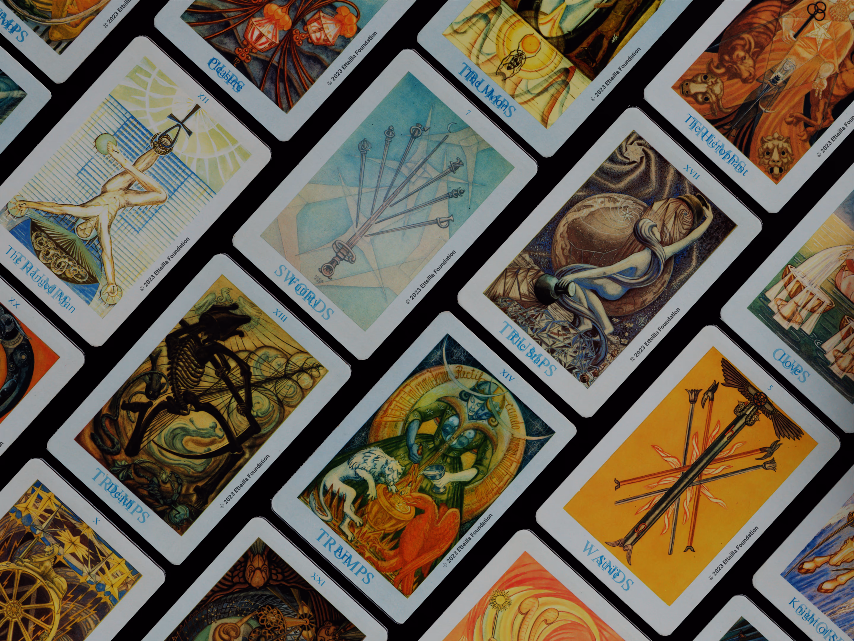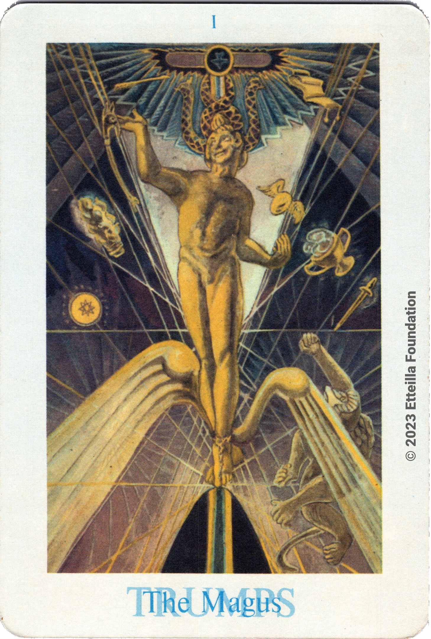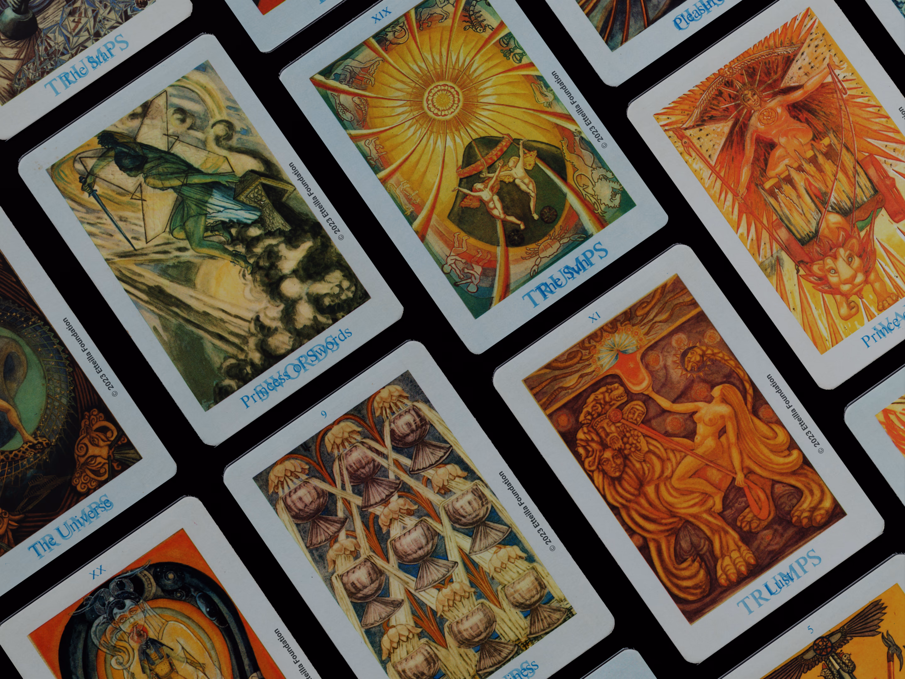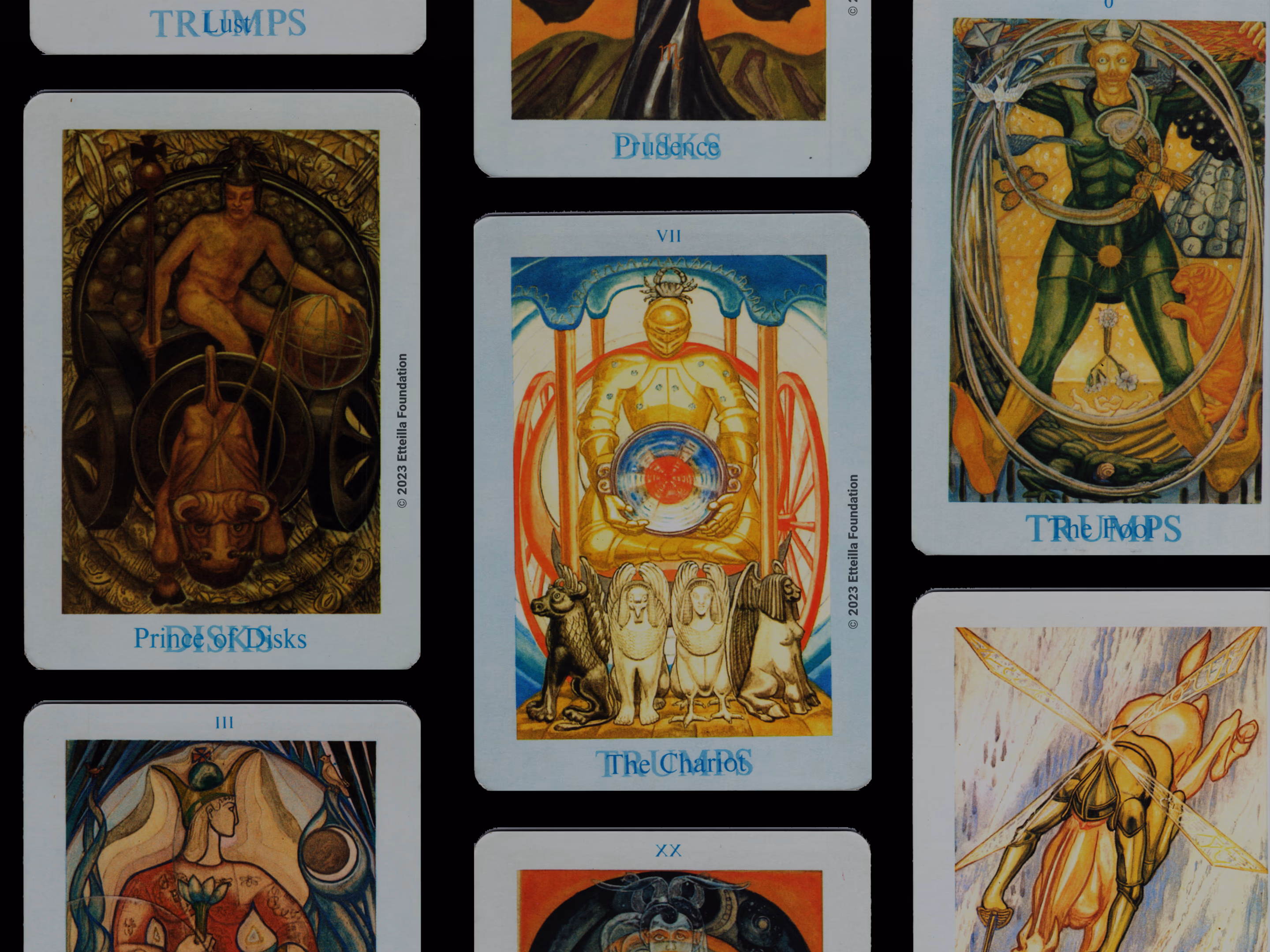 The Thoth Tarot which features very unique card designs and artistic direction is a collaboration between the famous occultist Aleister Crowley who designed the deck, and Lady Frieda Harris who painted the illustrations. This very popular divination tarot created between 1938 and 1943 is notable for having major arcana re-ordered and renamed to allow what Crowley calls the “double zodiac loop” for tarot reading. We note that the suit of disks replace the suit of pentacles found in the Waite-Smith decks and many cards have different names. In particular the Knights replace the Kings, The Knights become the Princes and the Pages are replaced by the Princesses.This version, commonly referred as A1, which was the first colored version printed by Llewellyn in Hong Hong circa 1967 is highly recognizable due to two printing mistakes: The 8 of Cups doesn’t have a number at the top and the Ace of Disk illustration is printed upside-down. All colored versions of the Toth decks are believed to be derived from the prints included in the original limited edition of the Toth book printed by Crowley circa 1944 not Frieda original paintings. Our deck is complete, in mint condition and come with its box.