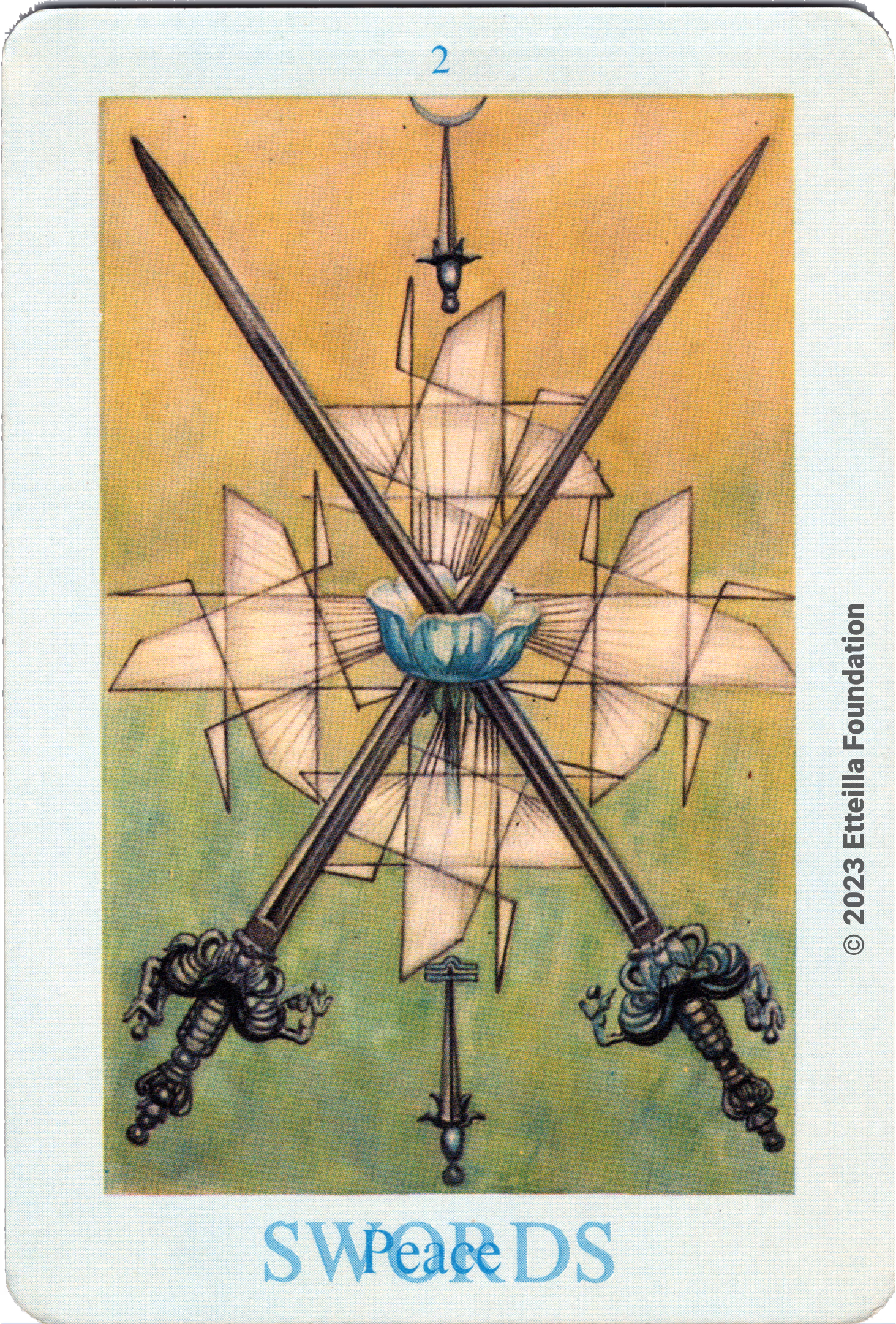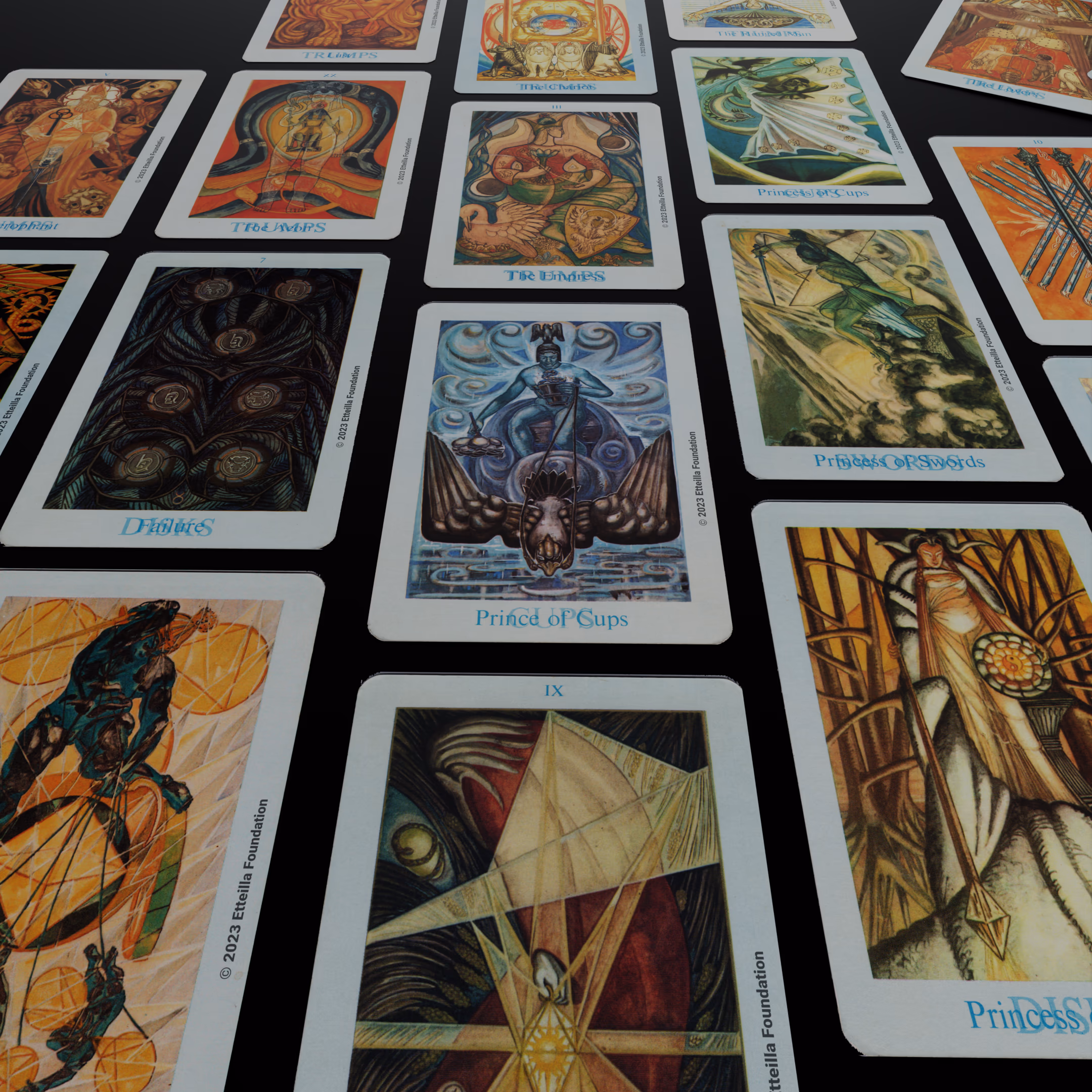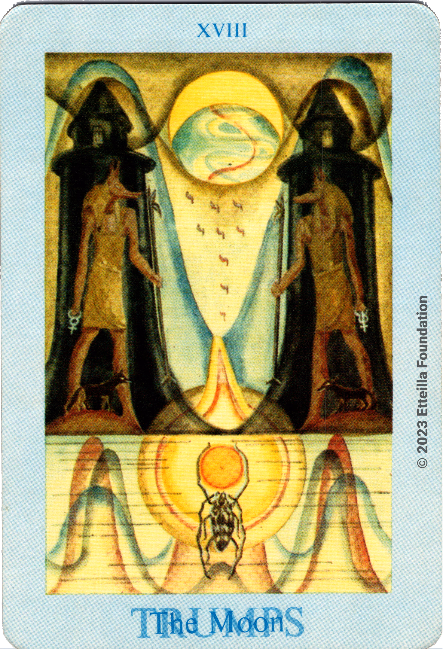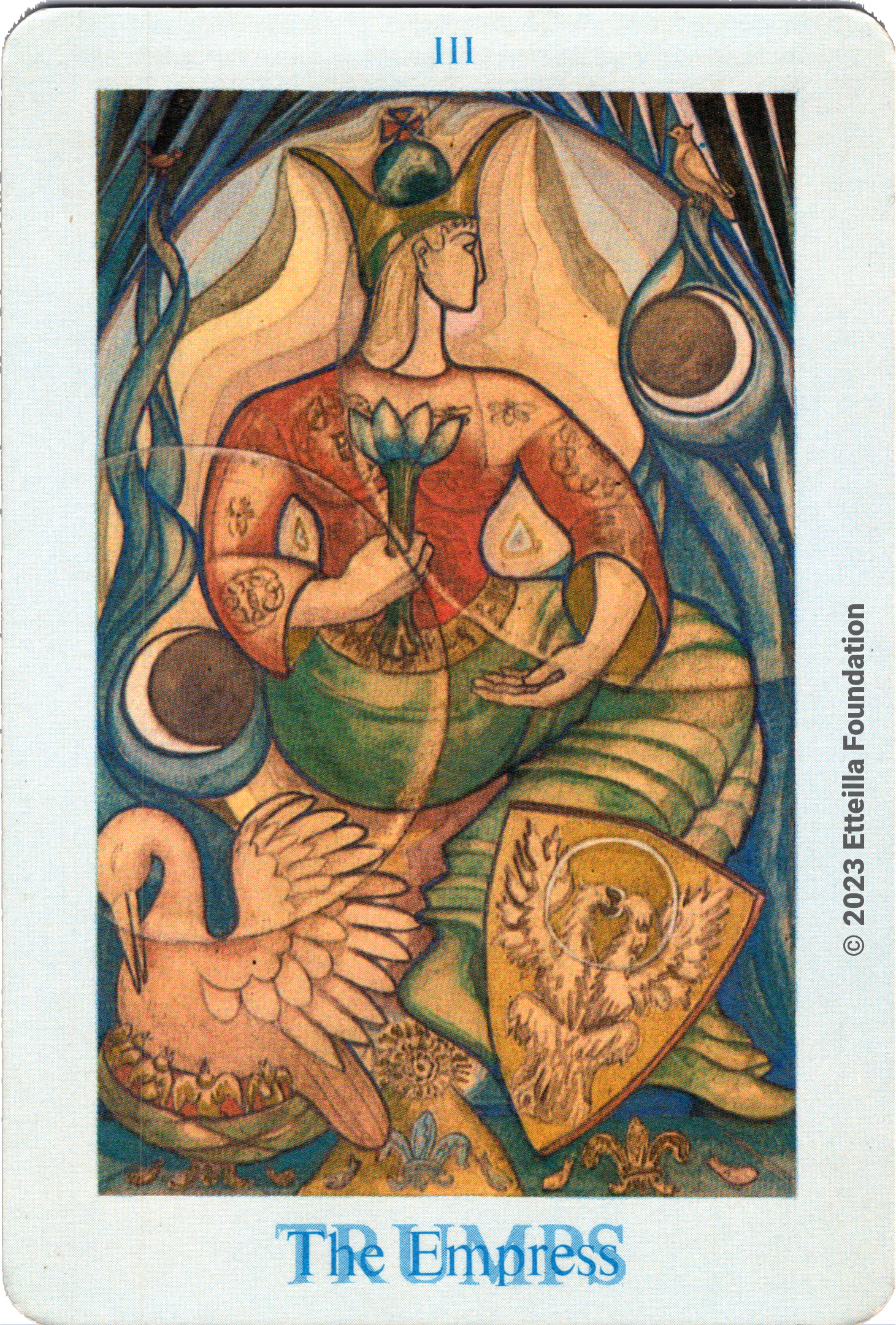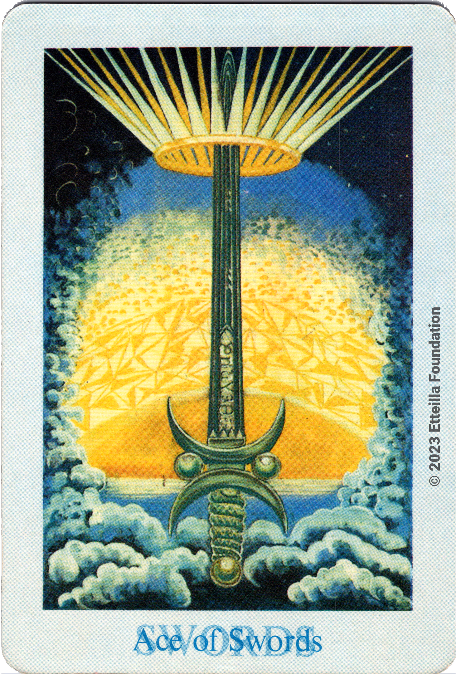 The Thoth Tarot which features very unique card designs and artistic direction is a collaboration between the famous occultist Aleister Crowley who designed the deck, and Lady Frieda Harris who painted the illustrations. This very popular divination tarot created between 1938 and 1943 is notable for having major arcana re-ordered and renamed to allow what Crowley calls the “double zodiac loop” for tarot reading. We note that the suit of disks replace the suit of pentacles found in the Waite-Smith decks and many cards have different names. In particular the Knights replace the Kings, The Knights become the Princes and the Pages are replaced by the Princesses.This version, commonly referred as A1, which was the first colored version printed by Llewellyn in Hong Hong circa 1967 is highly recognizable due to two printing mistakes: The 8 of Cups doesn’t have a number at the top and the Ace of Disk illustration is printed upside-down. All colored versions of the Toth decks are believed to be derived from the prints included in the original limited edition of the Toth book printed by Crowley circa 1944 not Frieda original paintings. Our deck is complete, in mint condition and come with its box.