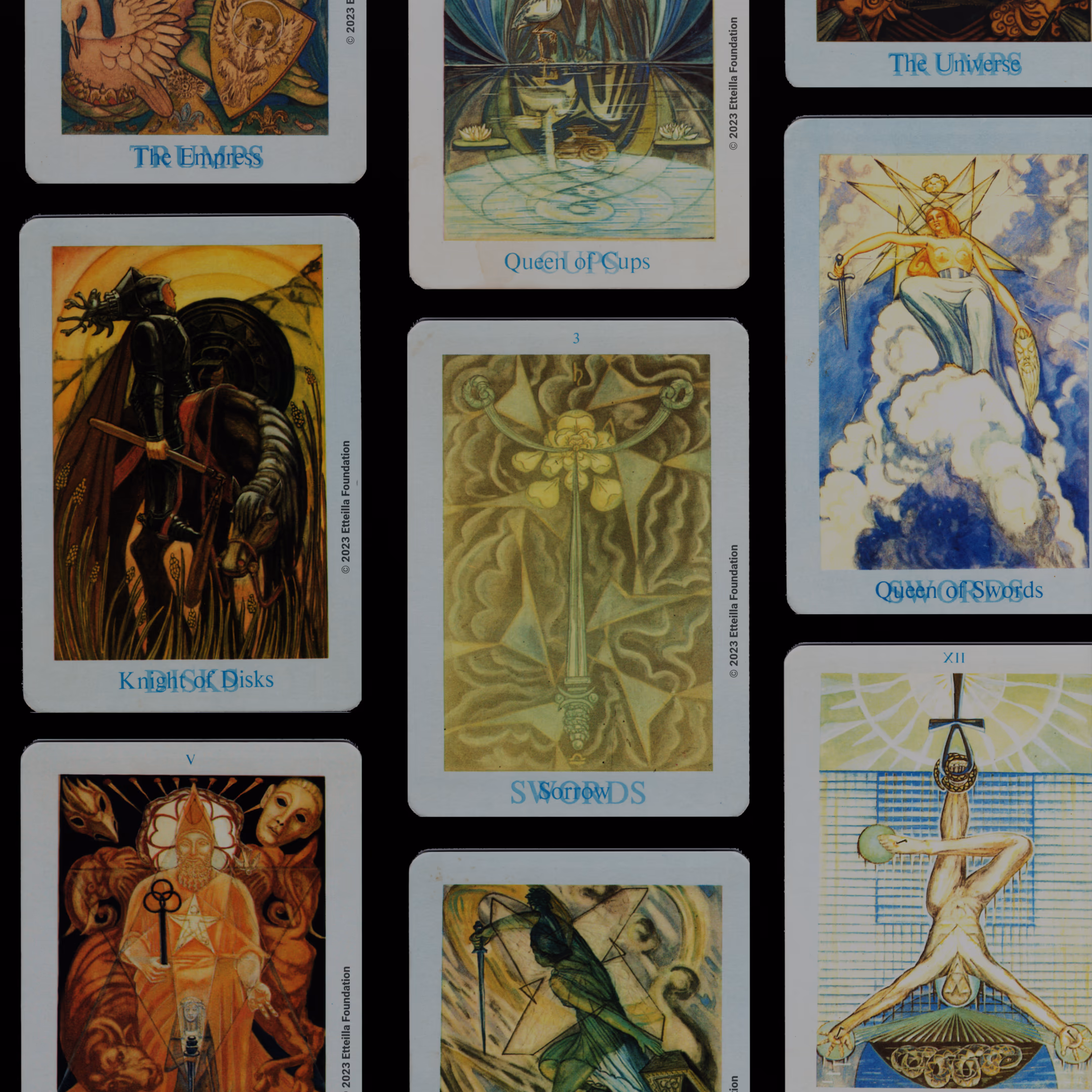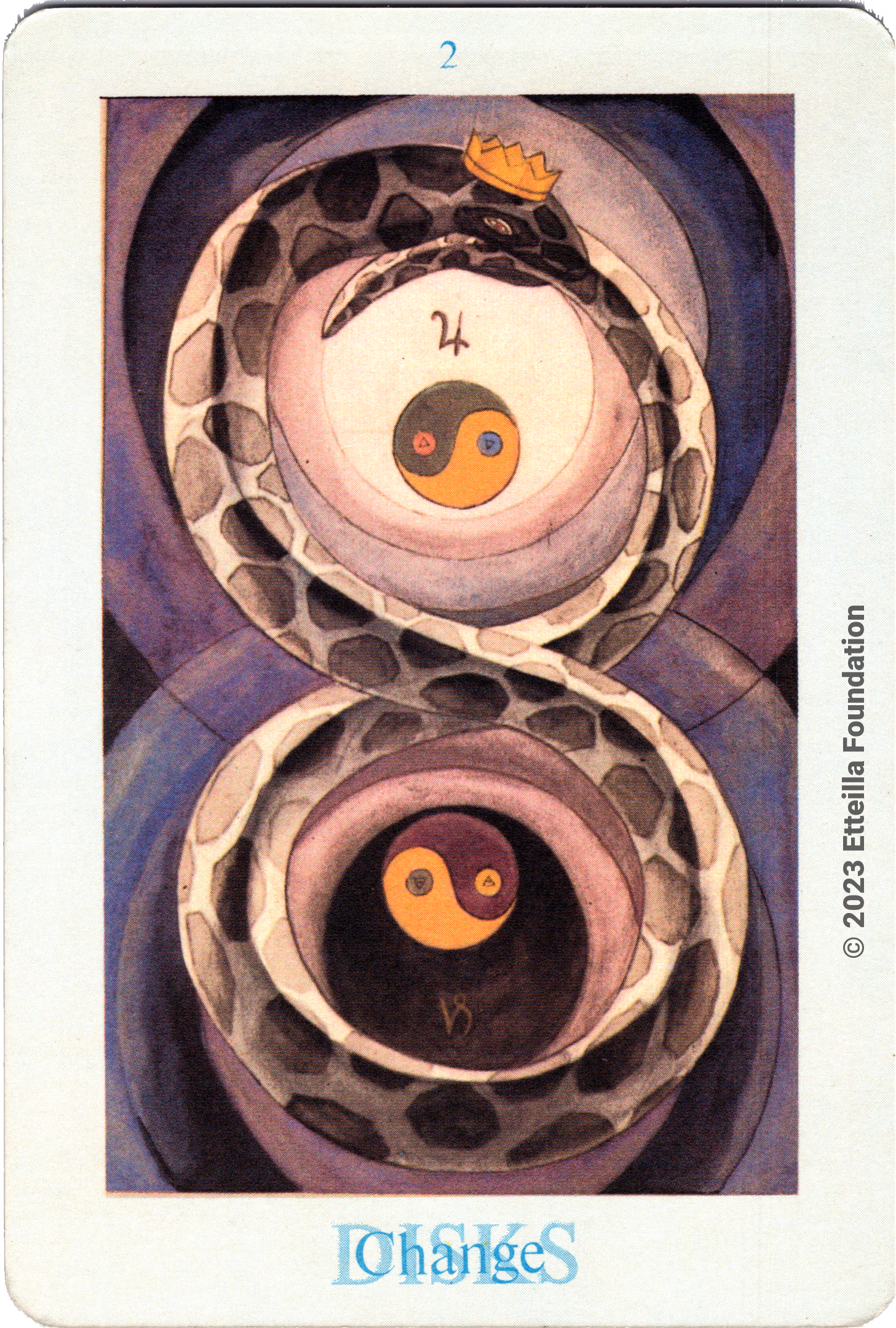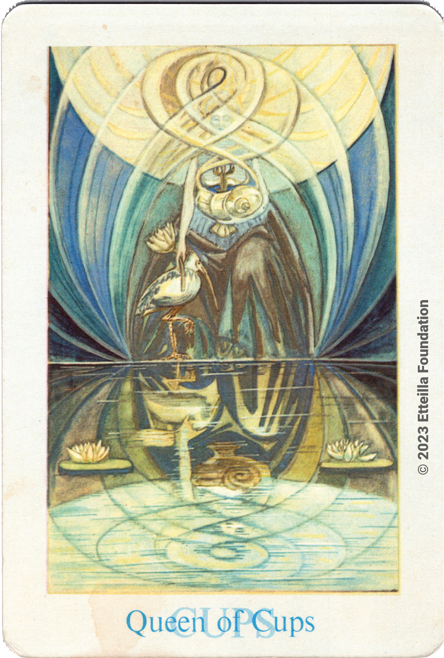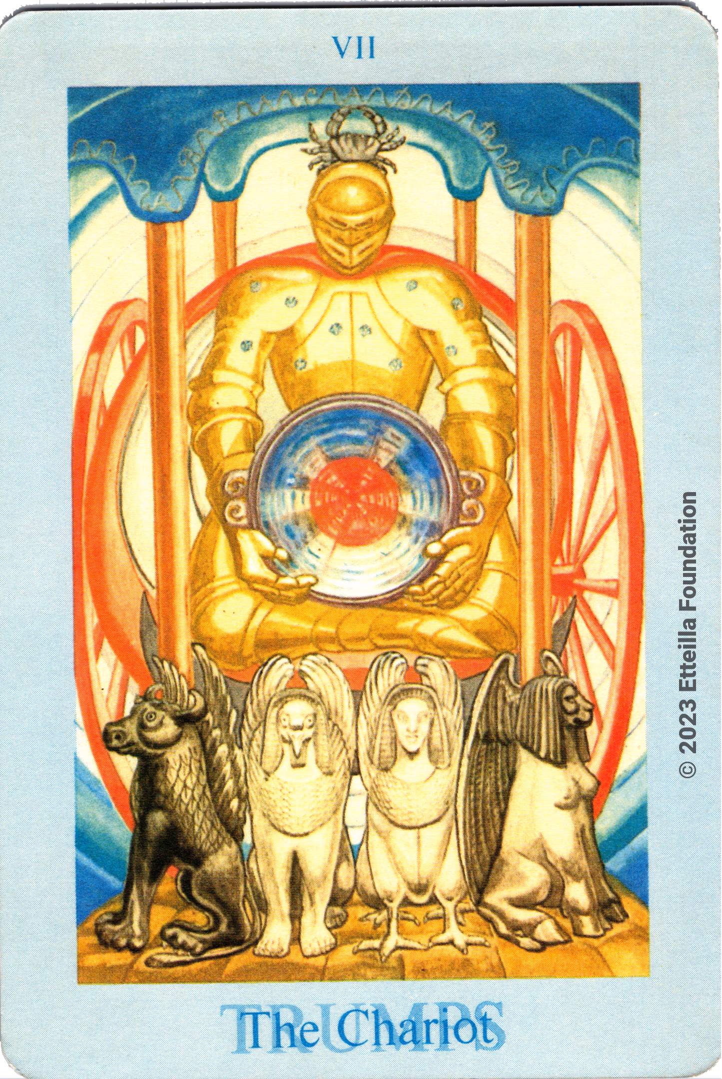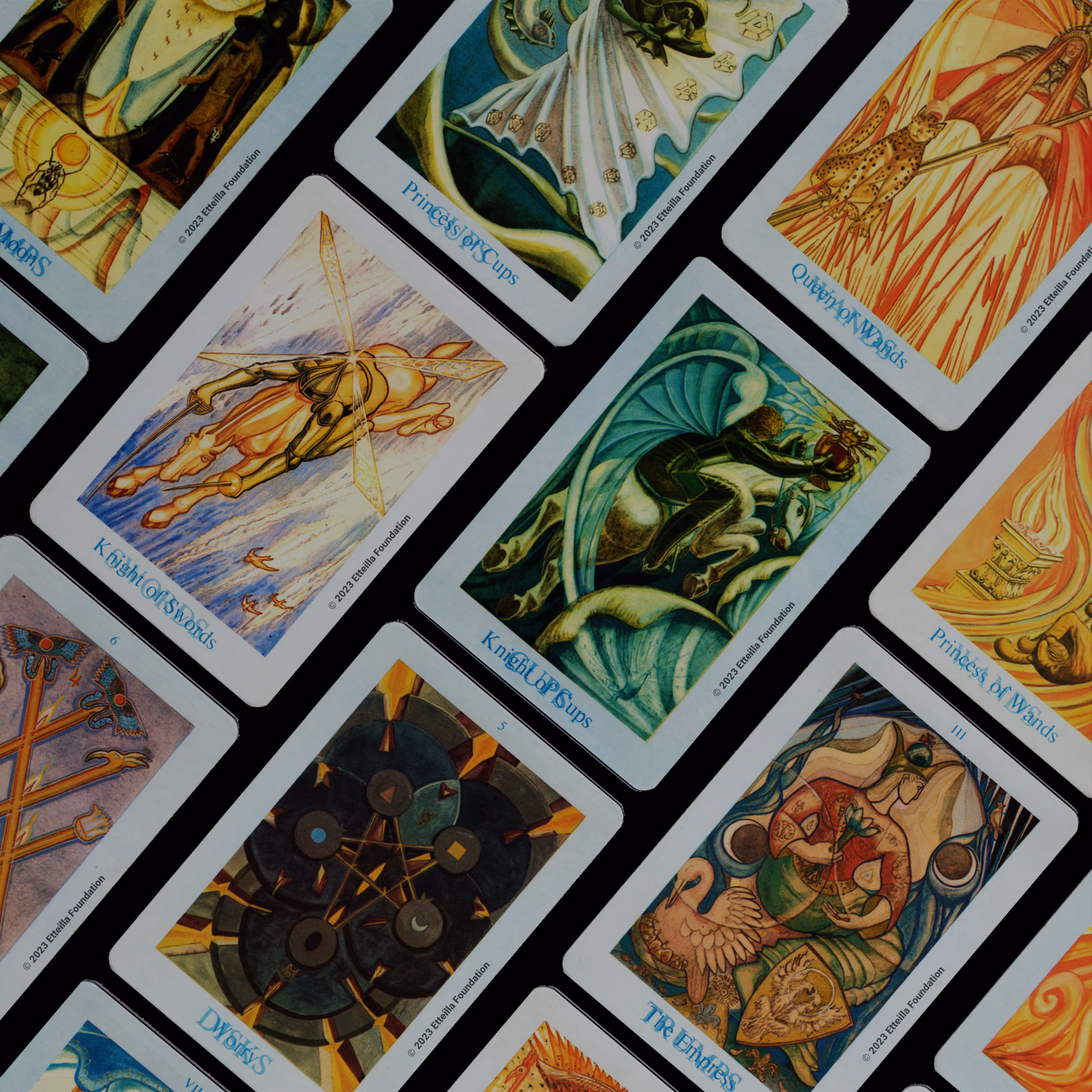 The Thoth Tarot which features very unique card designs and artistic direction is a collaboration between the famous occultist Aleister Crowley who designed the deck, and Lady Frieda Harris who painted the illustrations. This very popular divination tarot created between 1938 and 1943 is notable for having major arcana re-ordered and renamed to allow what Crowley calls the “double zodiac loop” for tarot reading. We note that the suit of disks replace the suit of pentacles found in the Waite-Smith decks and many cards have different names. In particular the Knights replace the Kings, The Knights become the Princes and the Pages are replaced by the Princesses.This version, commonly referred as A1, which was the first colored version printed by Llewellyn in Hong Hong circa 1967 is highly recognizable due to two printing mistakes: The 8 of Cups doesn’t have a number at the top and the Ace of Disk illustration is printed upside-down. All colored versions of the Toth decks are believed to be derived from the prints included in the original limited edition of the Toth book printed by Crowley circa 1944 not Frieda original paintings. Our deck is complete, in mint condition and come with its box.
