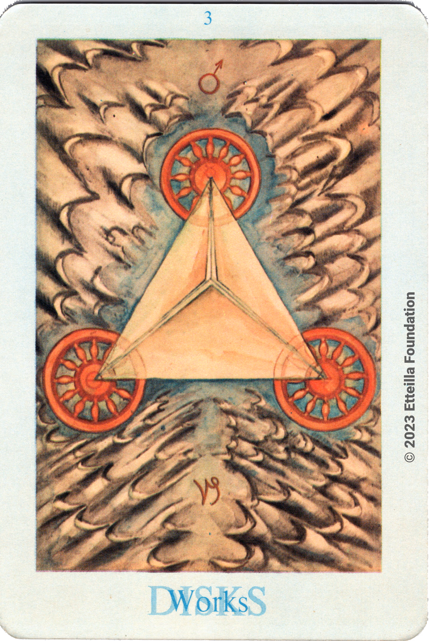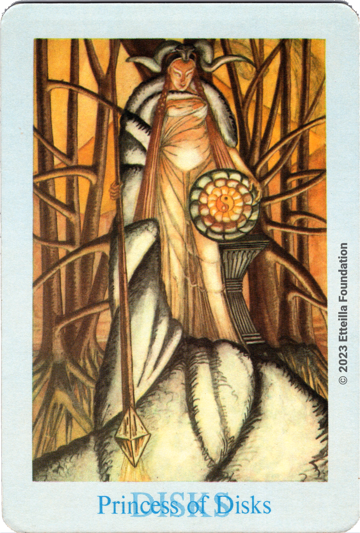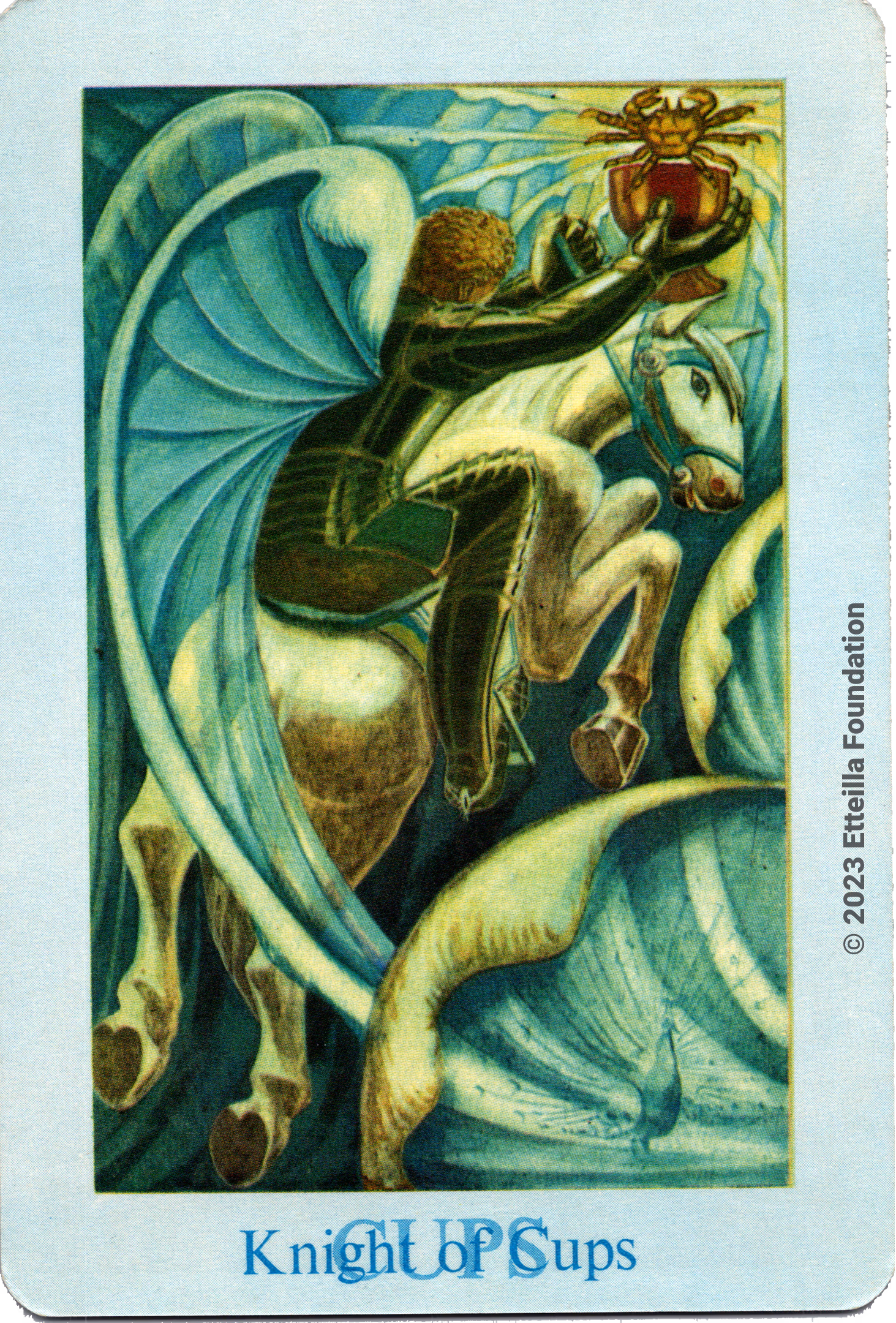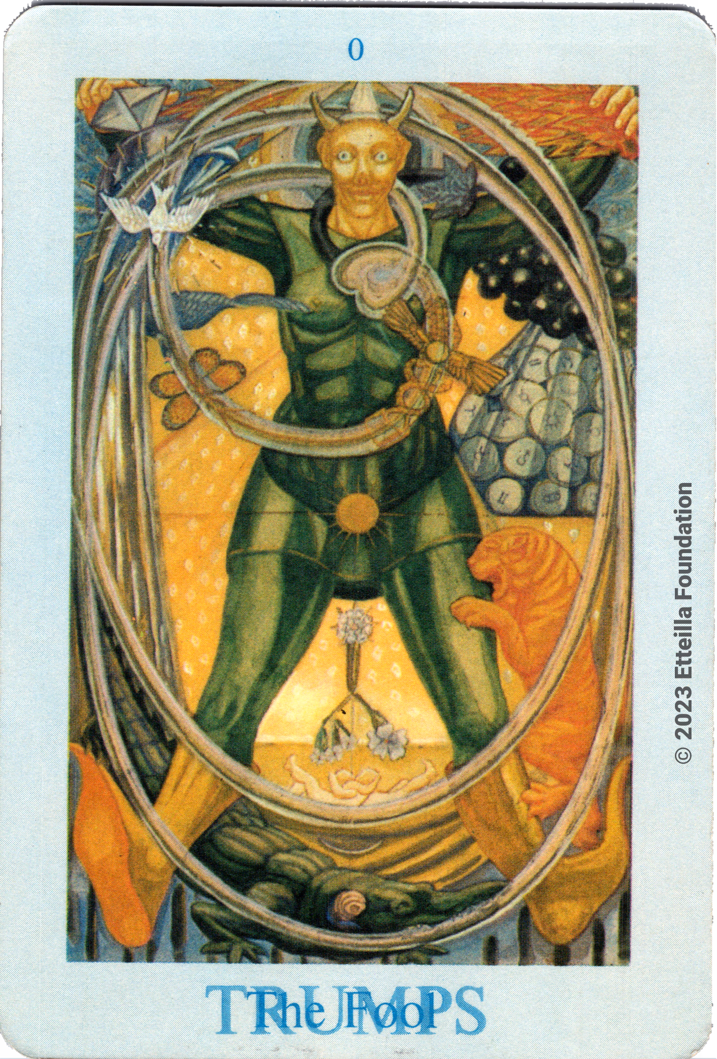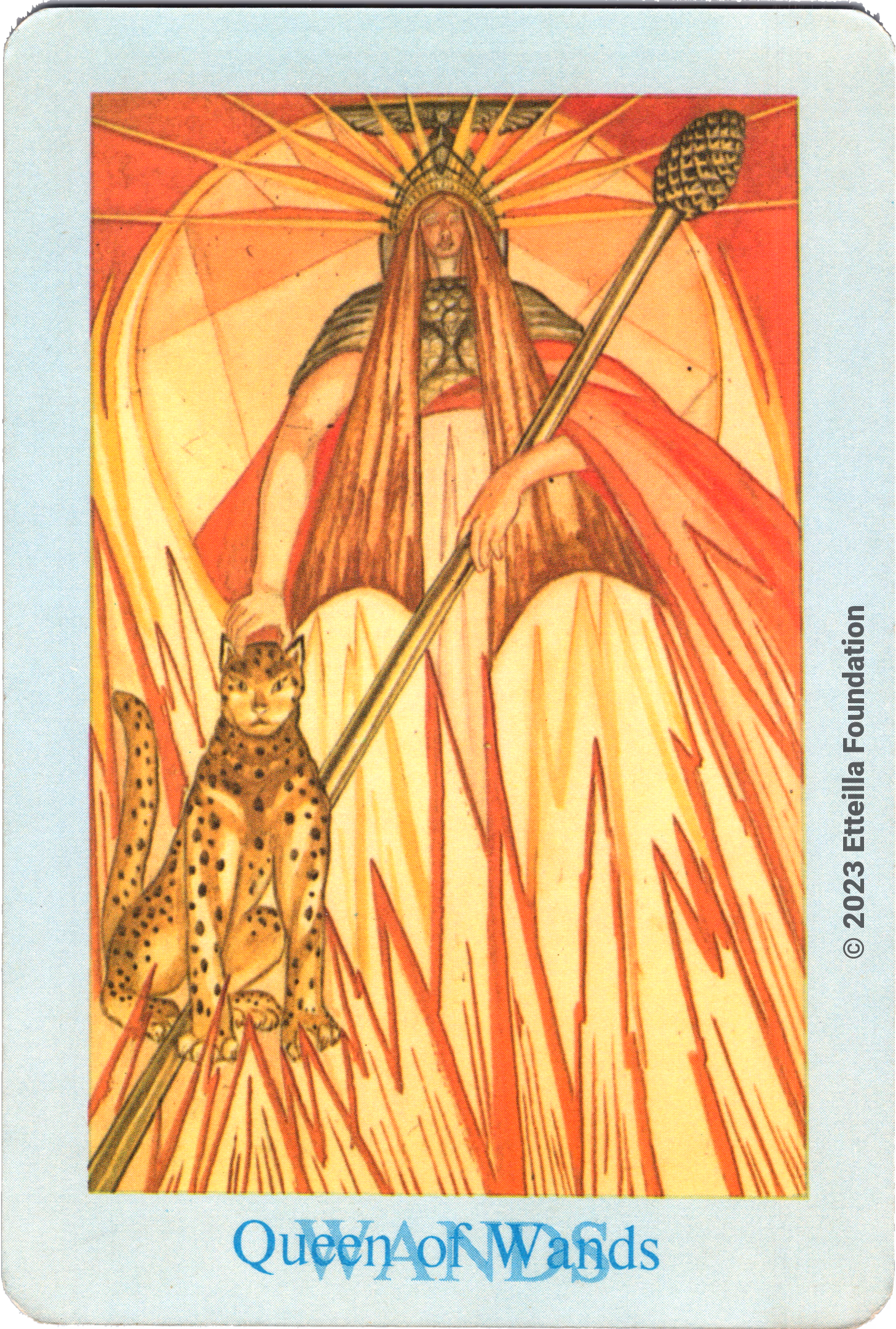 The Thoth Tarot which features very unique card designs and artistic direction is a collaboration between the famous occultist Aleister Crowley who designed the deck, and Lady Frieda Harris who painted the illustrations. This very popular divination tarot created between 1938 and 1943 is notable for having major arcana re-ordered and renamed to allow what Crowley calls the “double zodiac loop” for tarot reading. We note that the suit of disks replace the suit of pentacles found in the Waite-Smith decks and many cards have different names. In particular the Knights replace the Kings, The Knights become the Princes and the Pages are replaced by the Princesses.This version, commonly referred as A1, which was the first colored version printed by Llewellyn in Hong Hong circa 1967 is highly recognizable due to two printing mistakes: The 8 of Cups doesn’t have a number at the top and the Ace of Disk illustration is printed upside-down. All colored versions of the Toth decks are believed to be derived from the prints included in the original limited edition of the Toth book printed by Crowley circa 1944 not Frieda original paintings. Our deck is complete, in mint condition and come with its box.