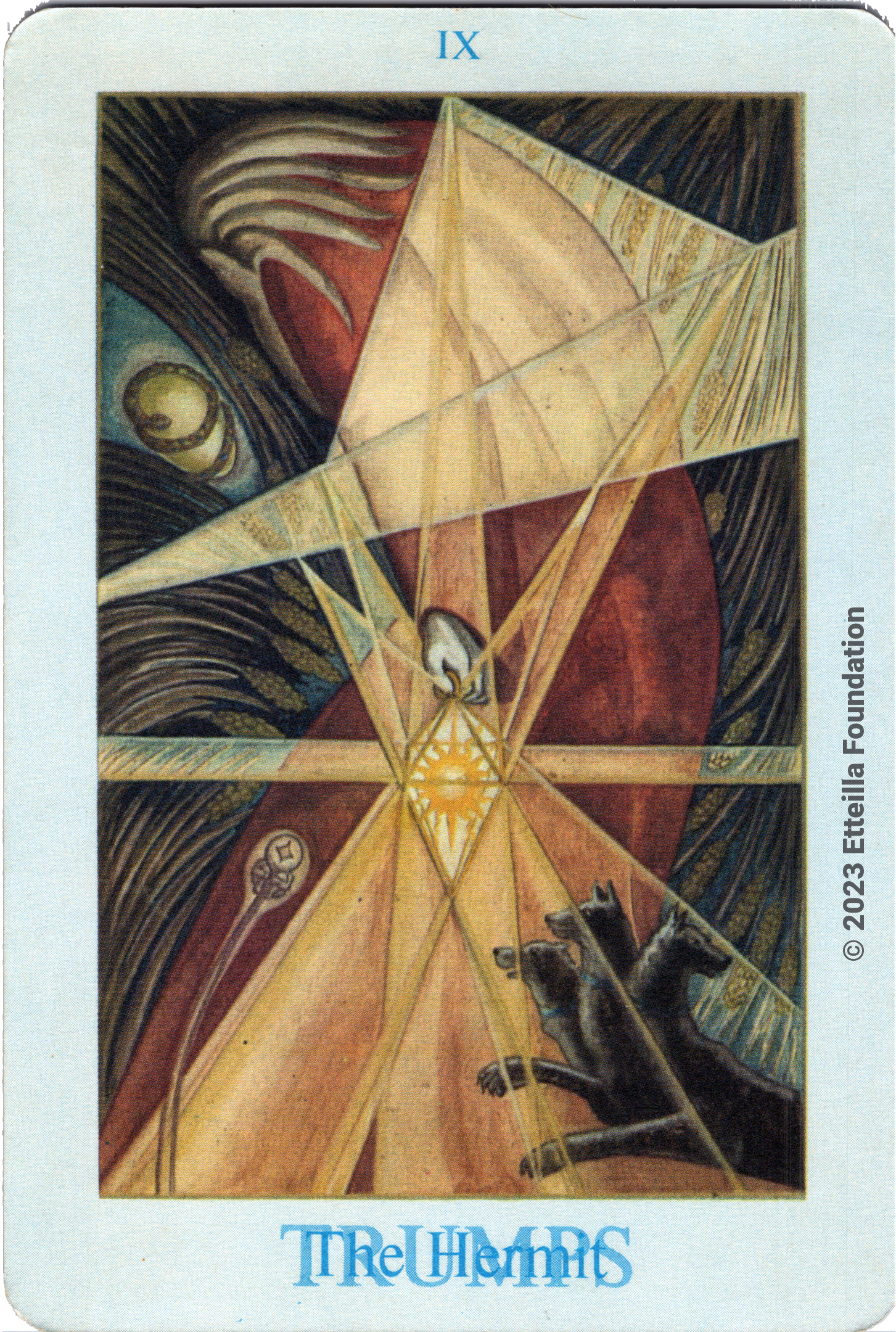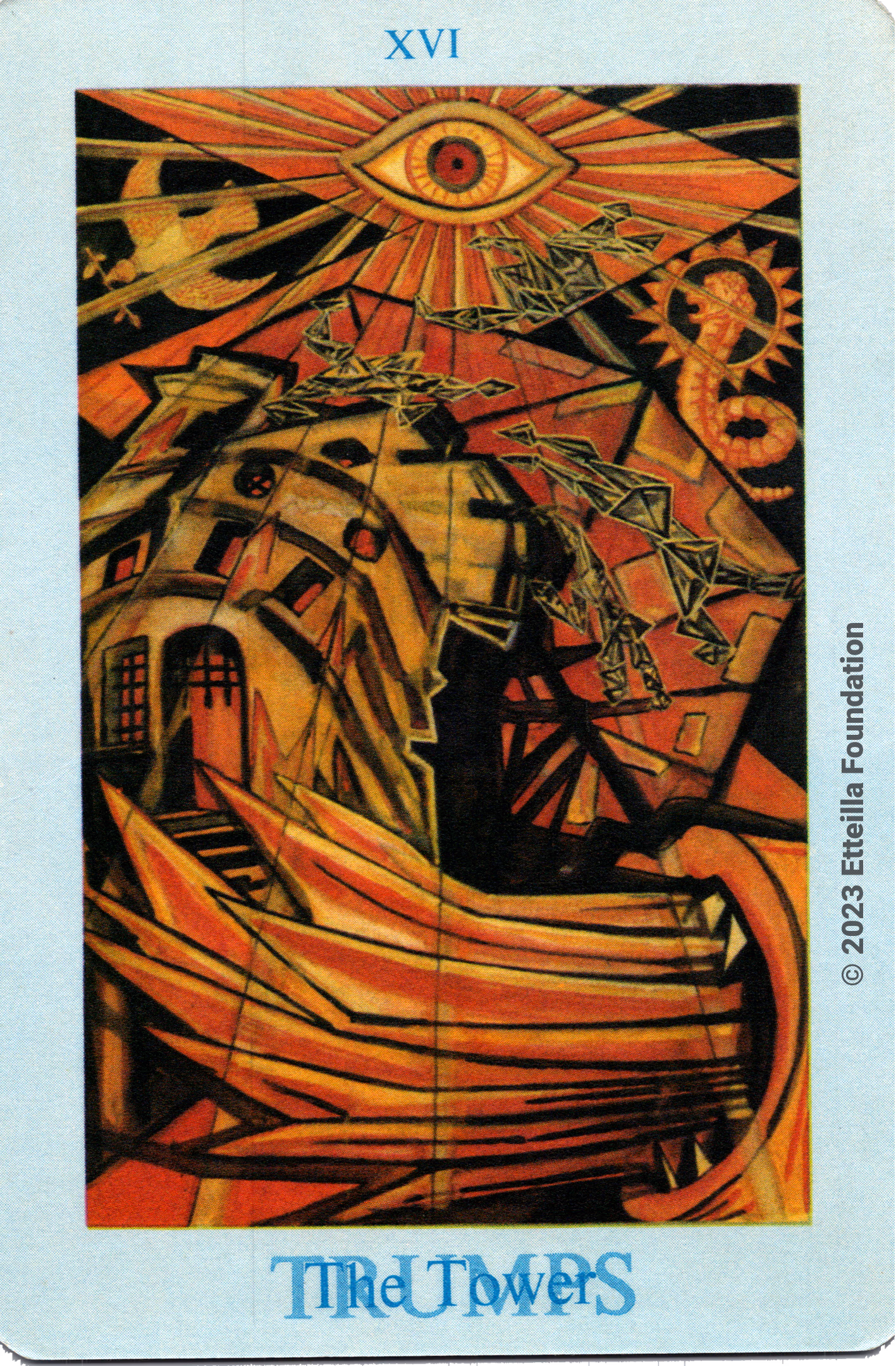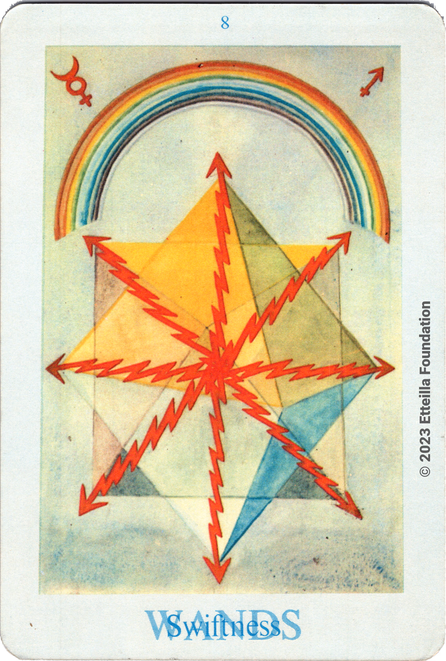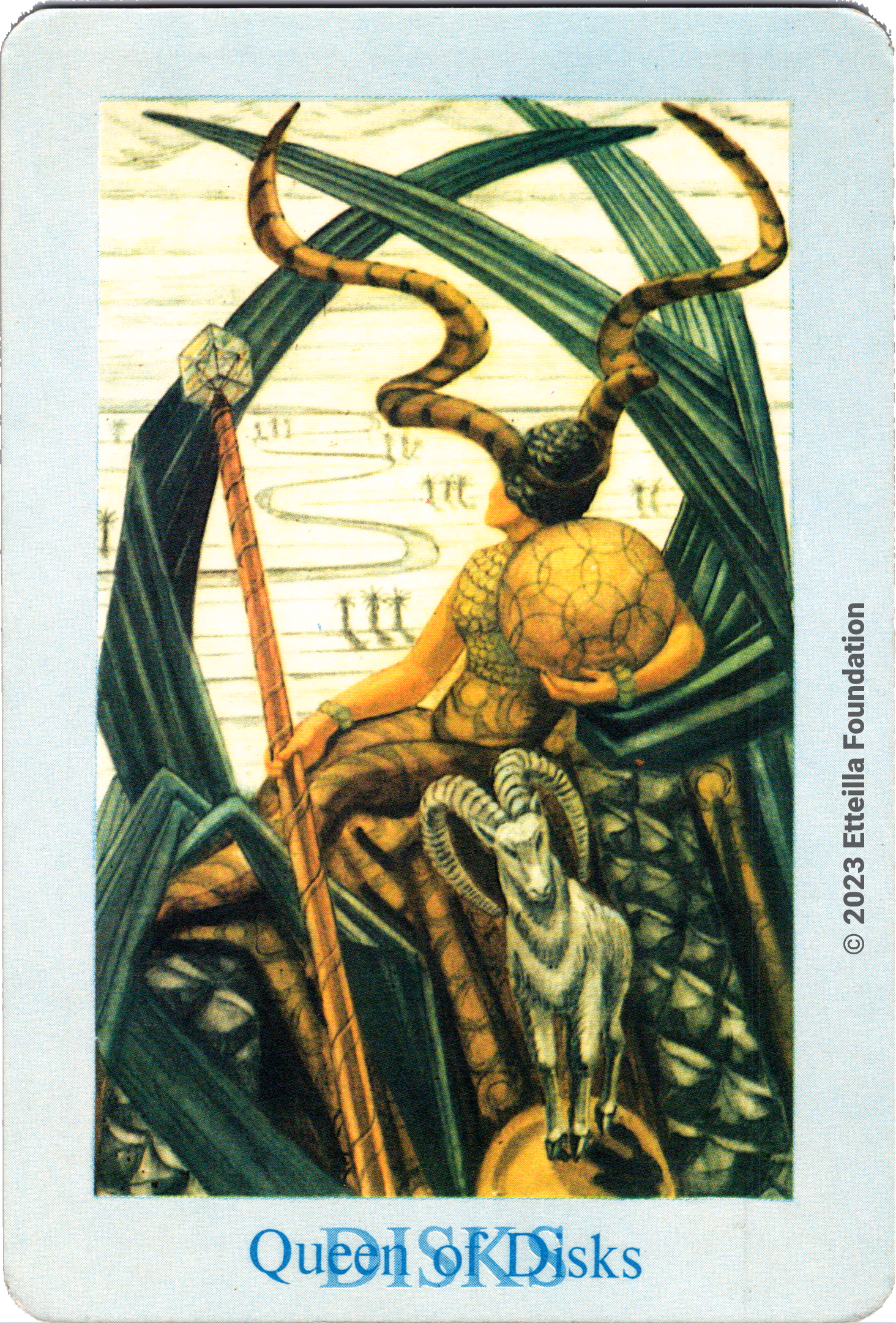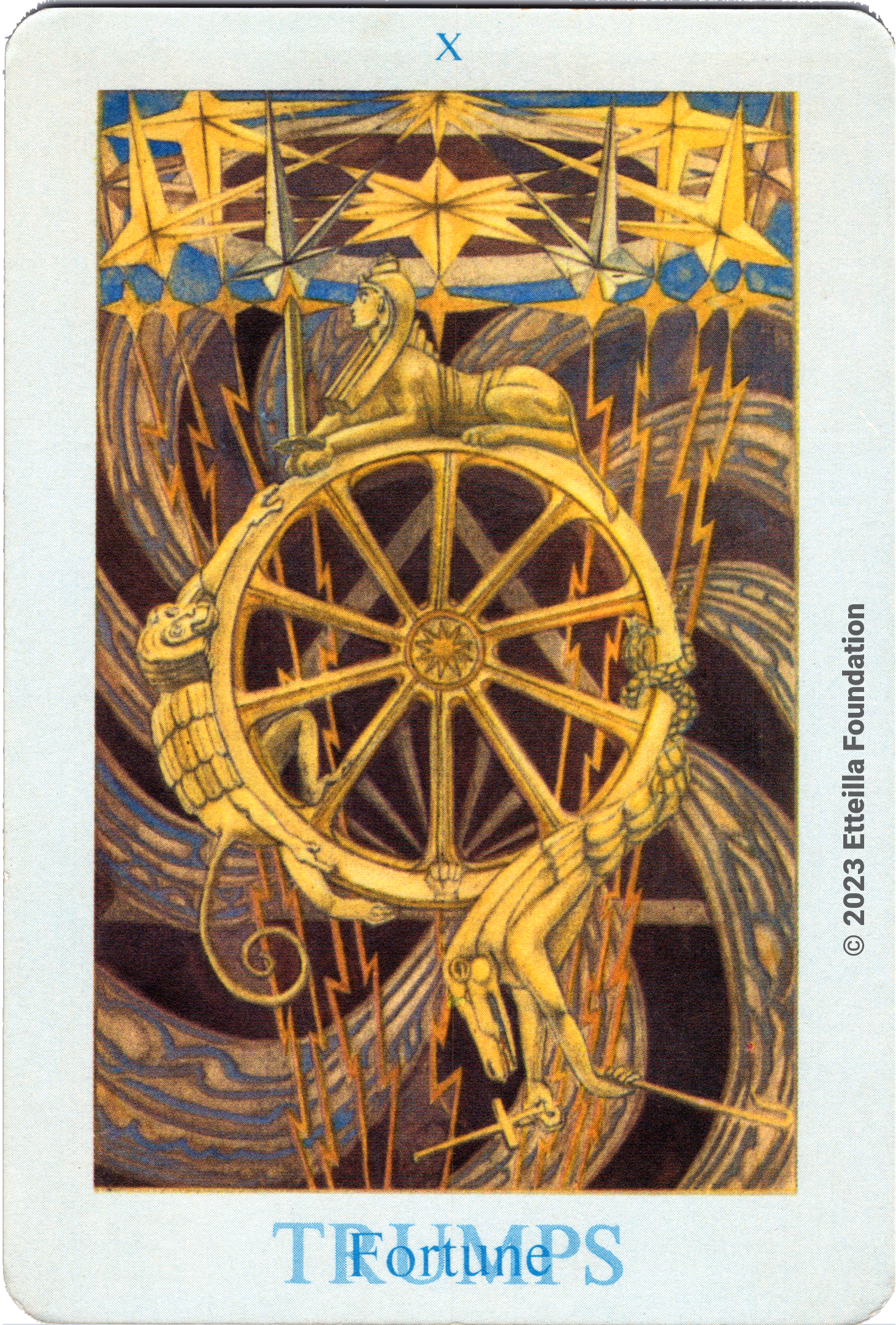 The Thoth Tarot which features very unique card designs and artistic direction is a collaboration between the famous occultist Aleister Crowley who designed the deck, and Lady Frieda Harris who painted the illustrations. This very popular divination tarot created between 1938 and 1943 is notable for having major arcana re-ordered and renamed to allow what Crowley calls the “double zodiac loop” for tarot reading. We note that the suit of disks replace the suit of pentacles found in the Waite-Smith decks and many cards have different names. In particular the Knights replace the Kings, The Knights become the Princes and the Pages are replaced by the Princesses.This version, commonly referred as A1, which was the first colored version printed by Llewellyn in Hong Hong circa 1967 is highly recognizable due to two printing mistakes: The 8 of Cups doesn’t have a number at the top and the Ace of Disk illustration is printed upside-down. All colored versions of the Toth decks are believed to be derived from the prints included in the original limited edition of the Toth book printed by Crowley circa 1944 not Frieda original paintings. Our deck is complete, in mint condition and come with its box.
