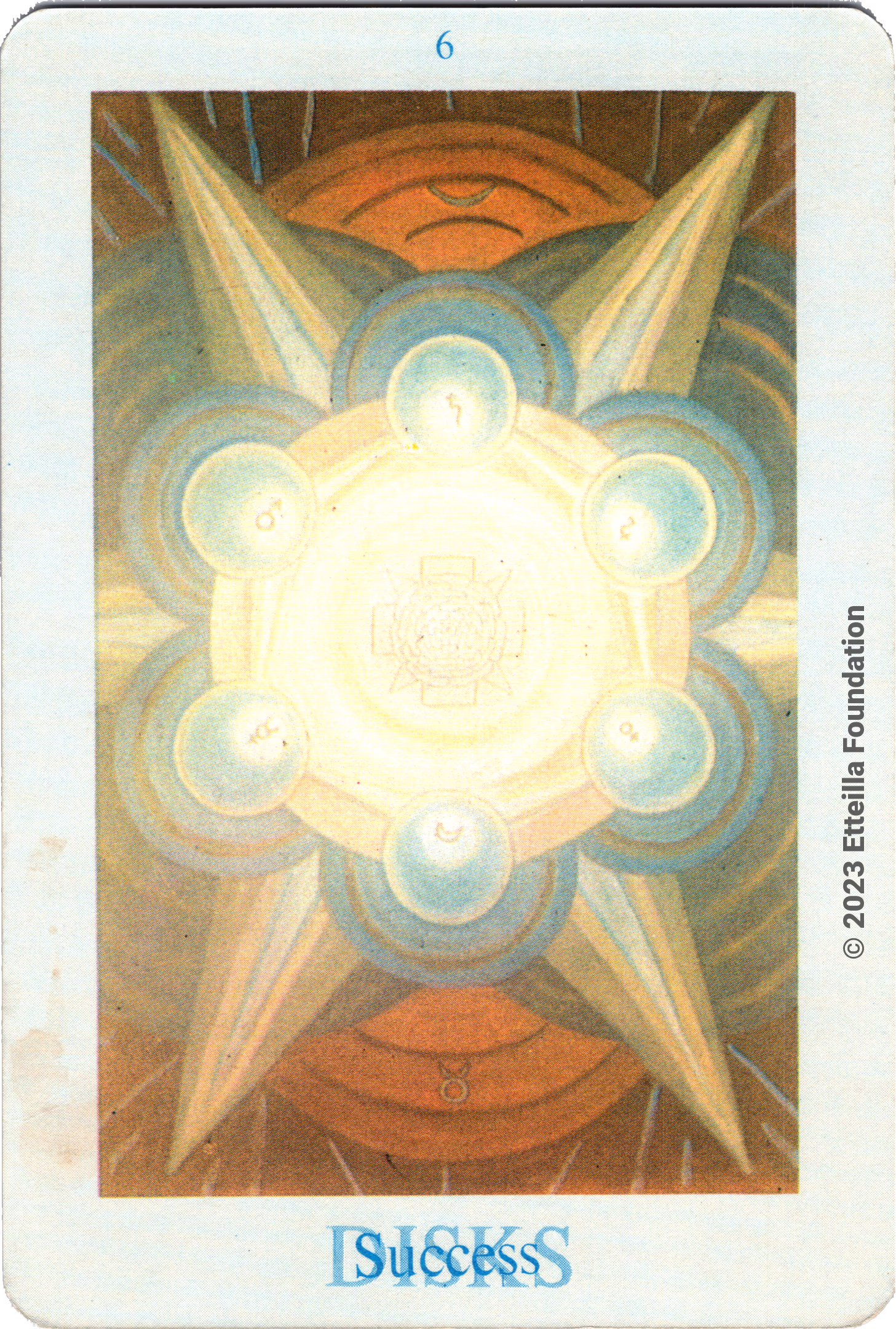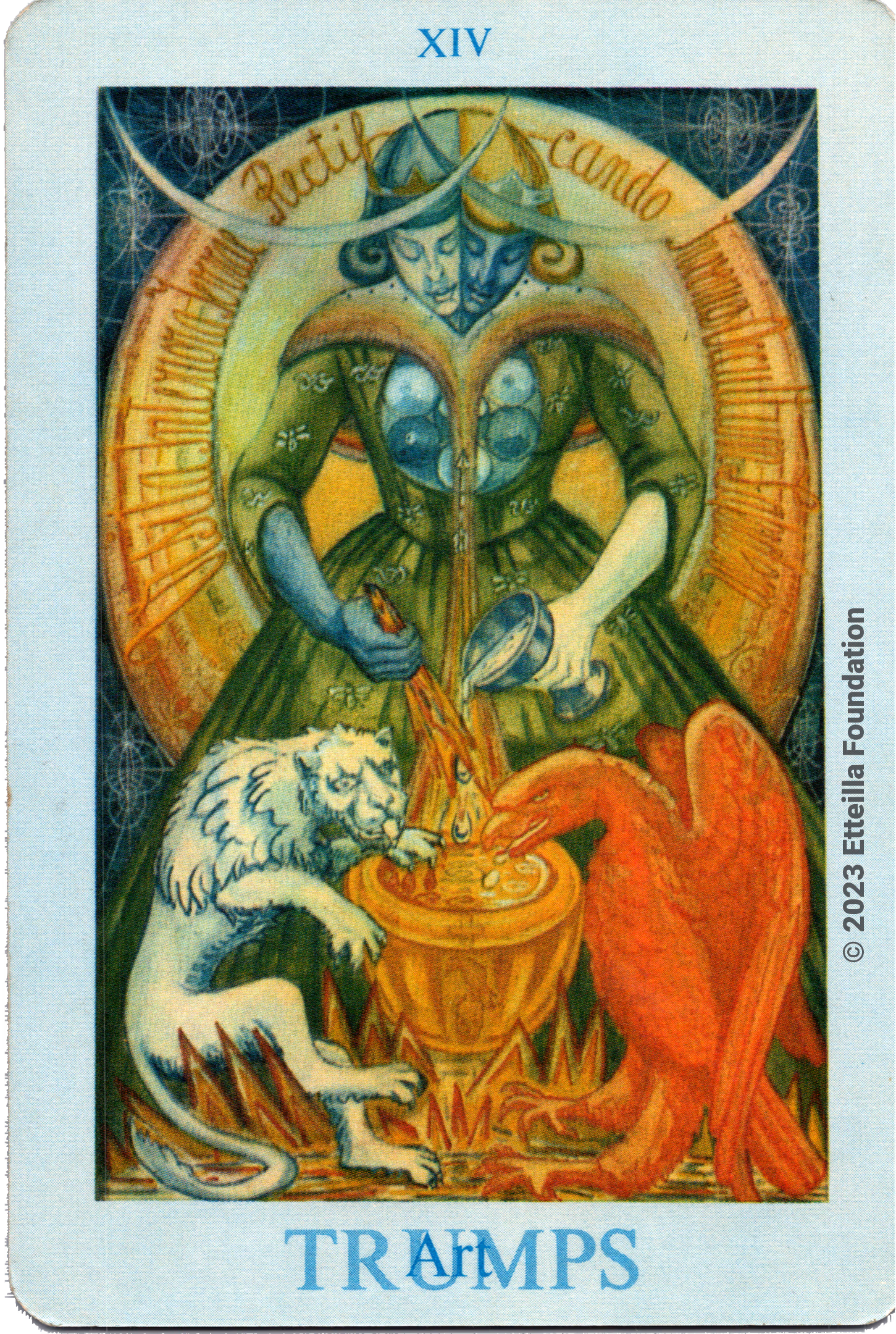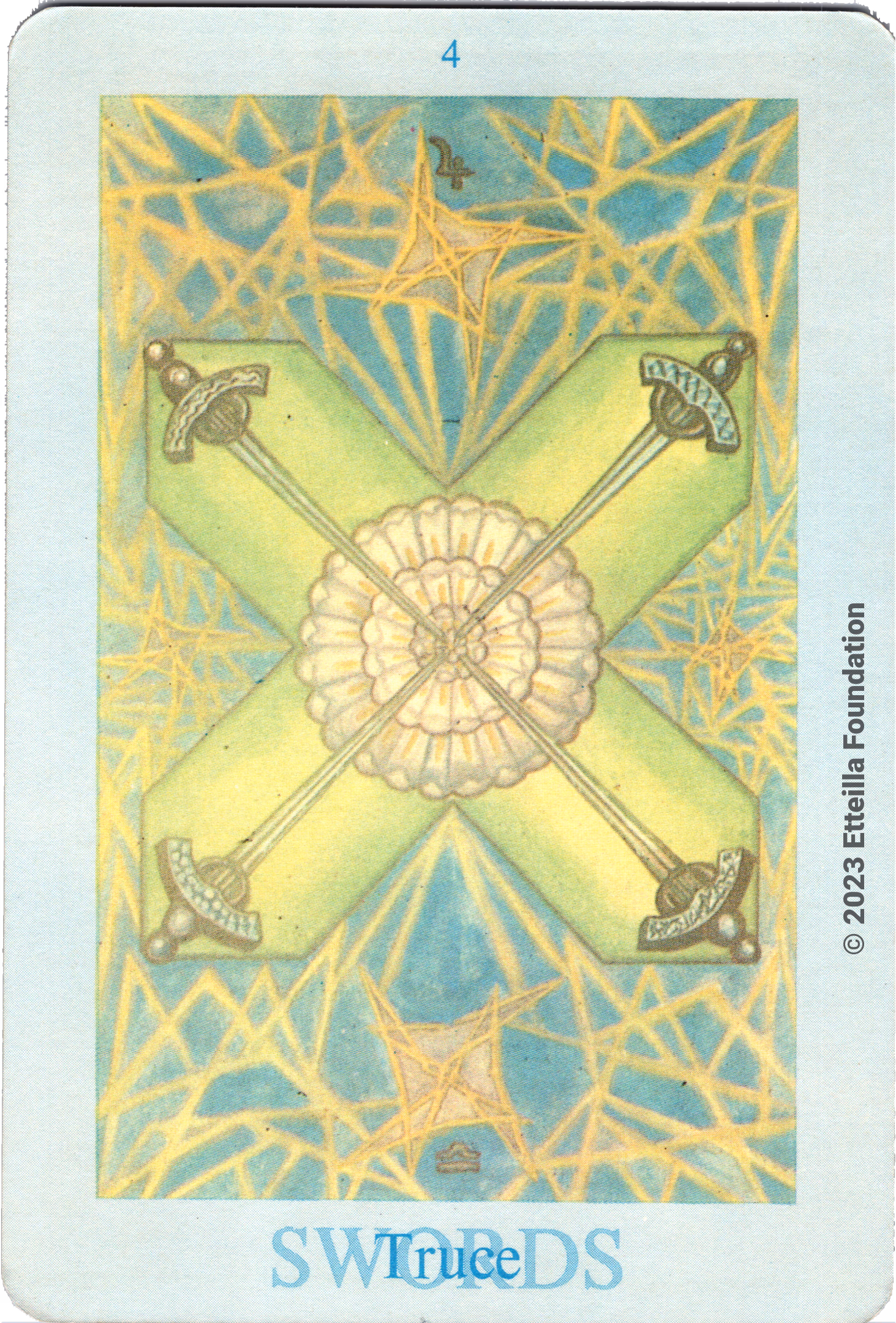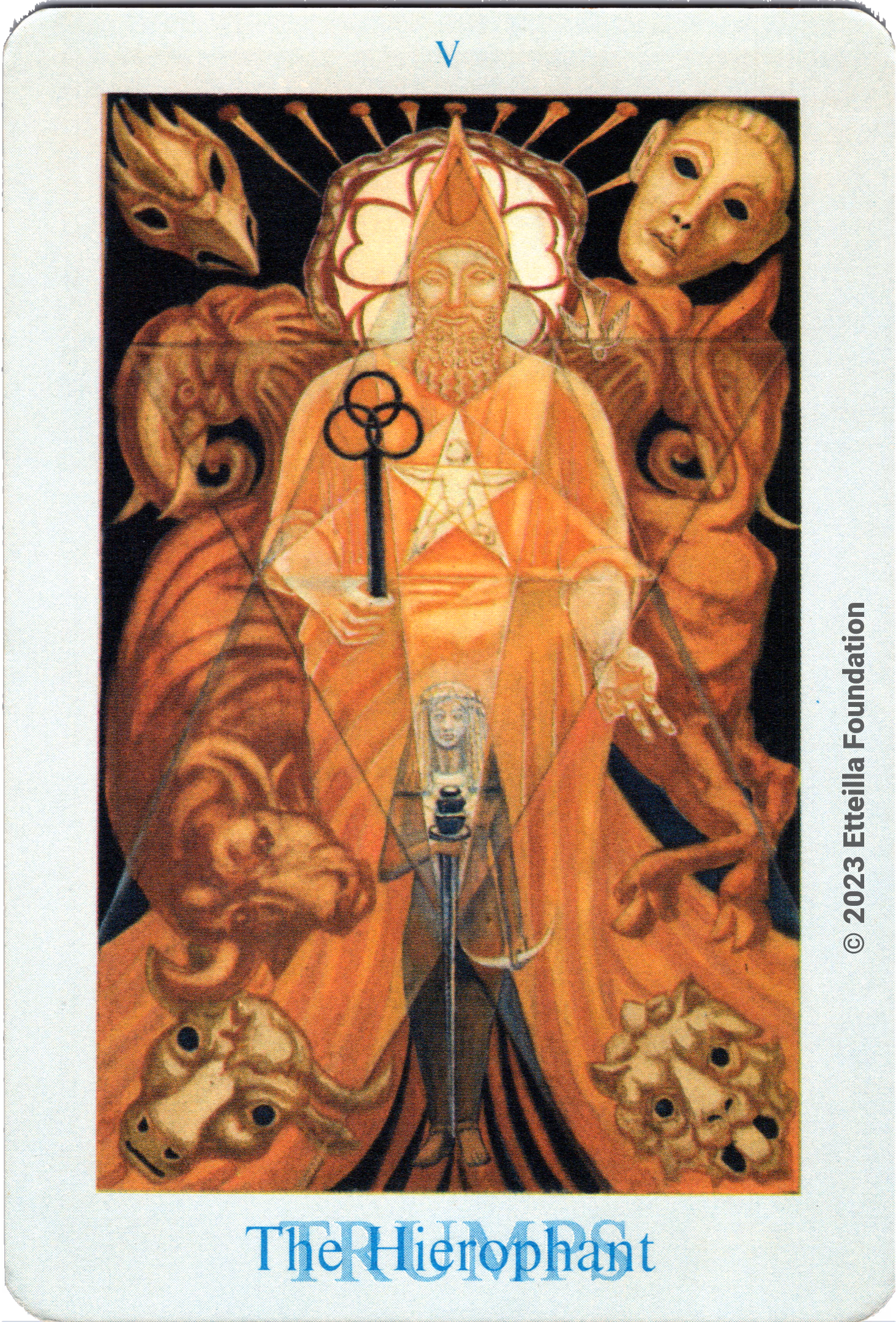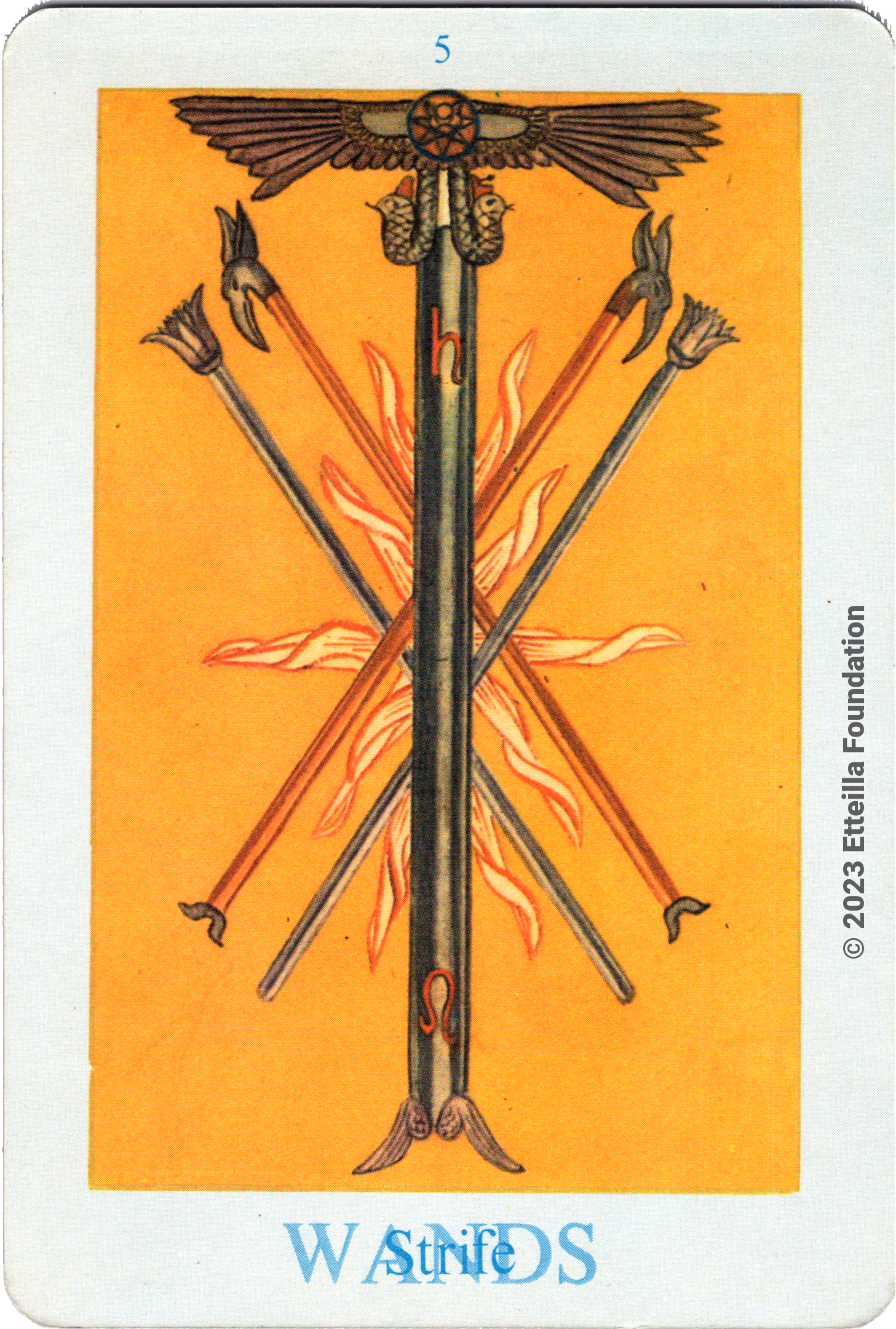 The Thoth Tarot which features very unique card designs and artistic direction is a collaboration between the famous occultist Aleister Crowley who designed the deck, and Lady Frieda Harris who painted the illustrations. This very popular divination tarot created between 1938 and 1943 is notable for having major arcana re-ordered and renamed to allow what Crowley calls the “double zodiac loop” for tarot reading. We note that the suit of disks replace the suit of pentacles found in the Waite-Smith decks and many cards have different names. In particular the Knights replace the Kings, The Knights become the Princes and the Pages are replaced by the Princesses.This version, commonly referred as A1, which was the first colored version printed by Llewellyn in Hong Hong circa 1967 is highly recognizable due to two printing mistakes: The 8 of Cups doesn’t have a number at the top and the Ace of Disk illustration is printed upside-down. All colored versions of the Toth decks are believed to be derived from the prints included in the original limited edition of the Toth book printed by Crowley circa 1944 not Frieda original paintings. Our deck is complete, in mint condition and come with its box.