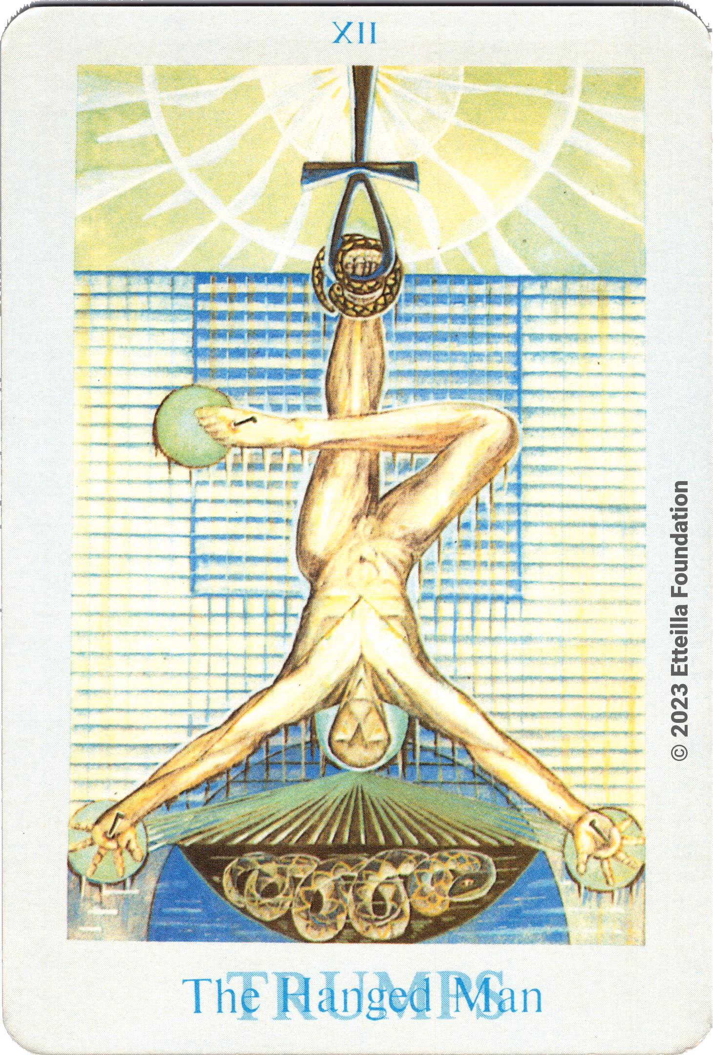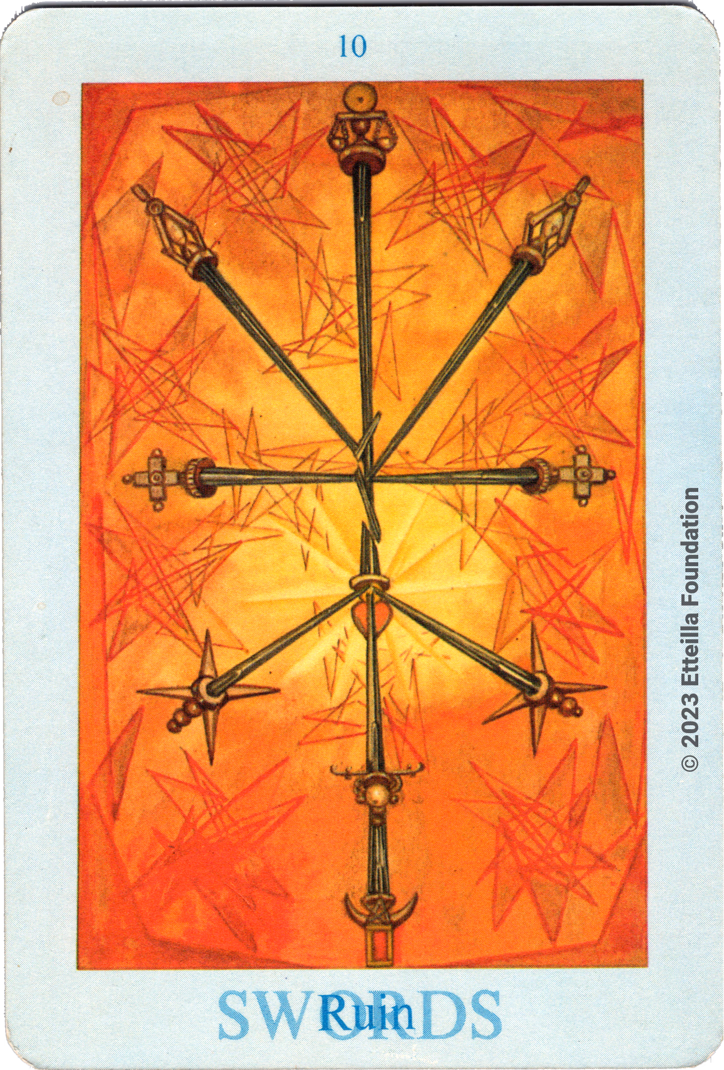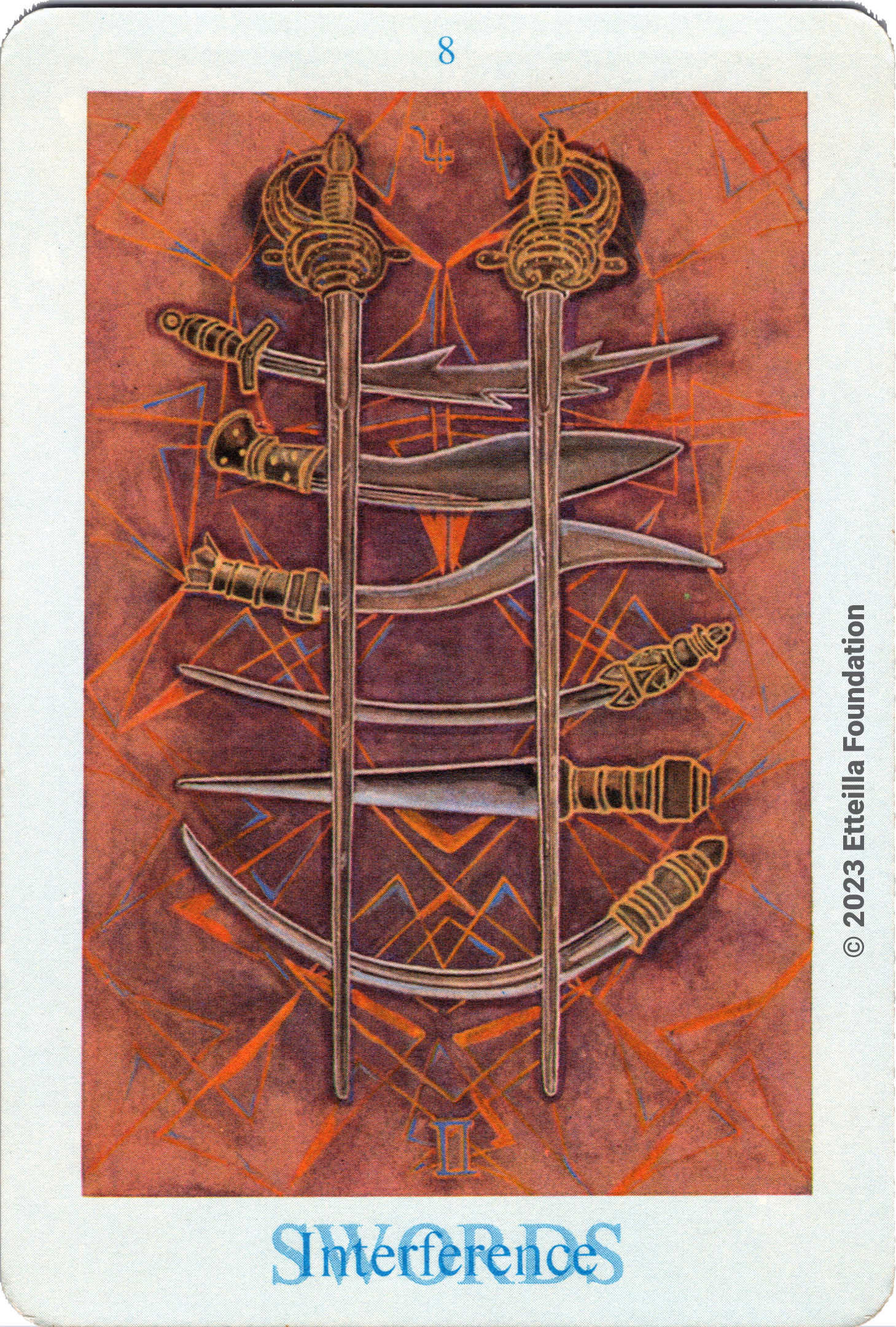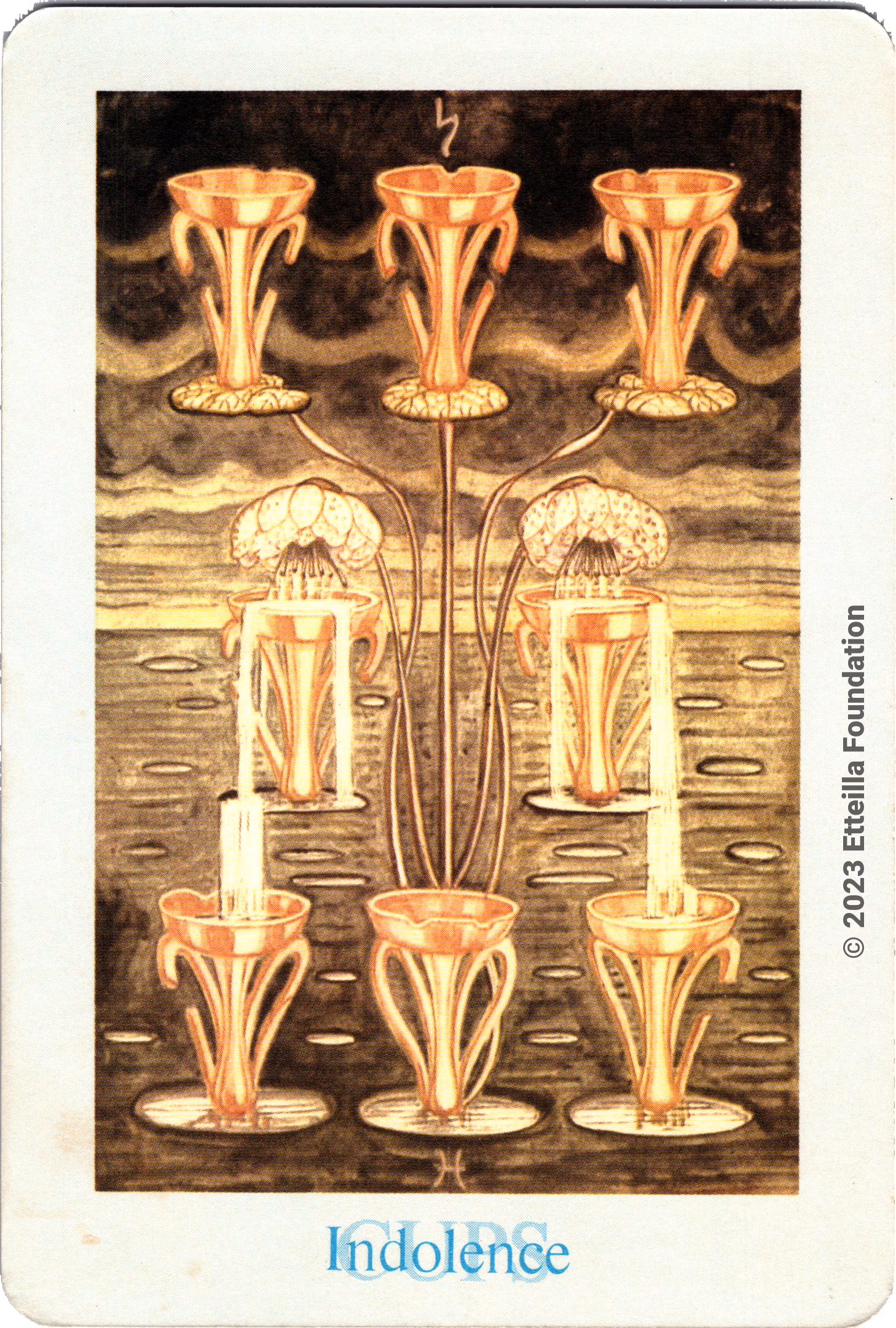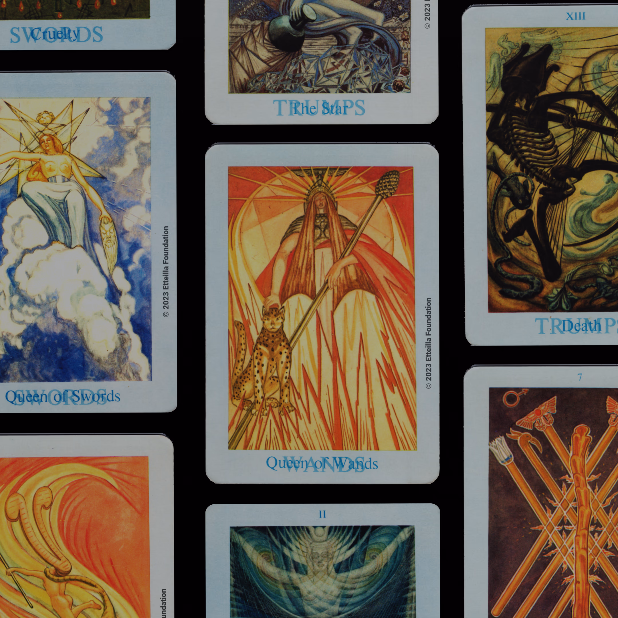 The Thoth Tarot which features very unique card designs and artistic direction is a collaboration between the famous occultist Aleister Crowley who designed the deck, and Lady Frieda Harris who painted the illustrations. This very popular divination tarot created between 1938 and 1943 is notable for having major arcana re-ordered and renamed to allow what Crowley calls the “double zodiac loop” for tarot reading. We note that the suit of disks replace the suit of pentacles found in the Waite-Smith decks and many cards have different names. In particular the Knights replace the Kings, The Knights become the Princes and the Pages are replaced by the Princesses.This version, commonly referred as A1, which was the first colored version printed by Llewellyn in Hong Hong circa 1967 is highly recognizable due to two printing mistakes: The 8 of Cups doesn’t have a number at the top and the Ace of Disk illustration is printed upside-down. All colored versions of the Toth decks are believed to be derived from the prints included in the original limited edition of the Toth book printed by Crowley circa 1944 not Frieda original paintings. Our deck is complete, in mint condition and come with its box.