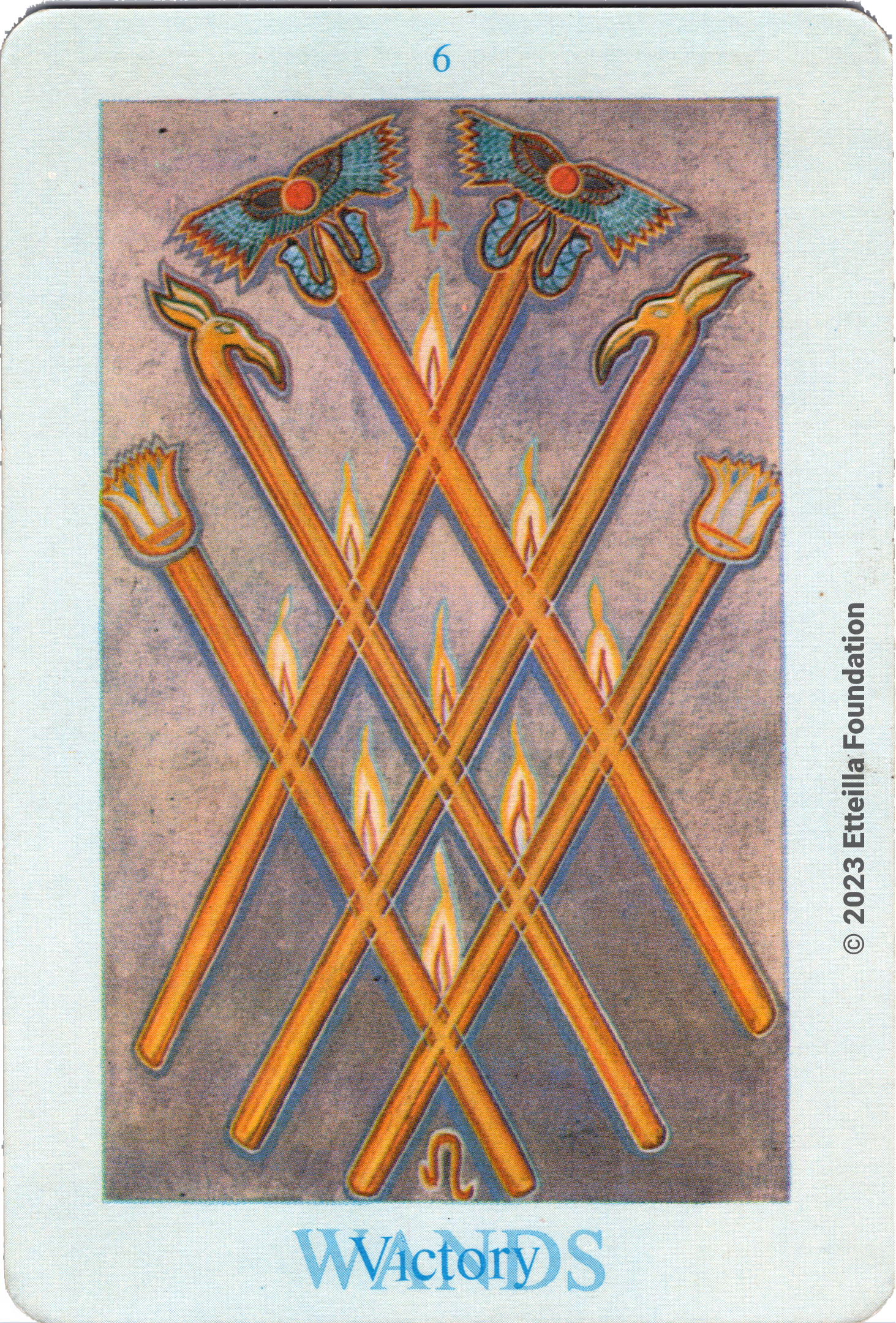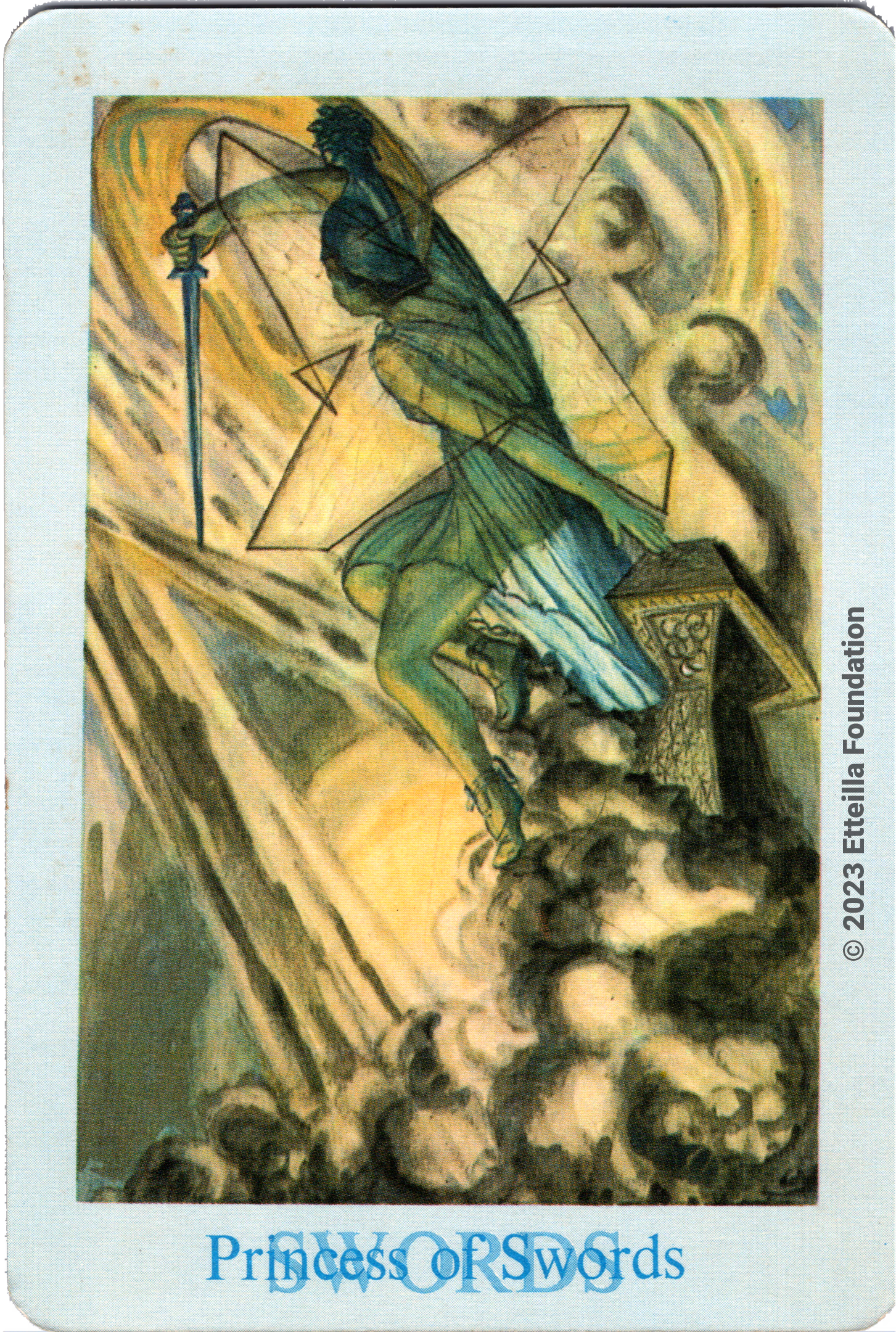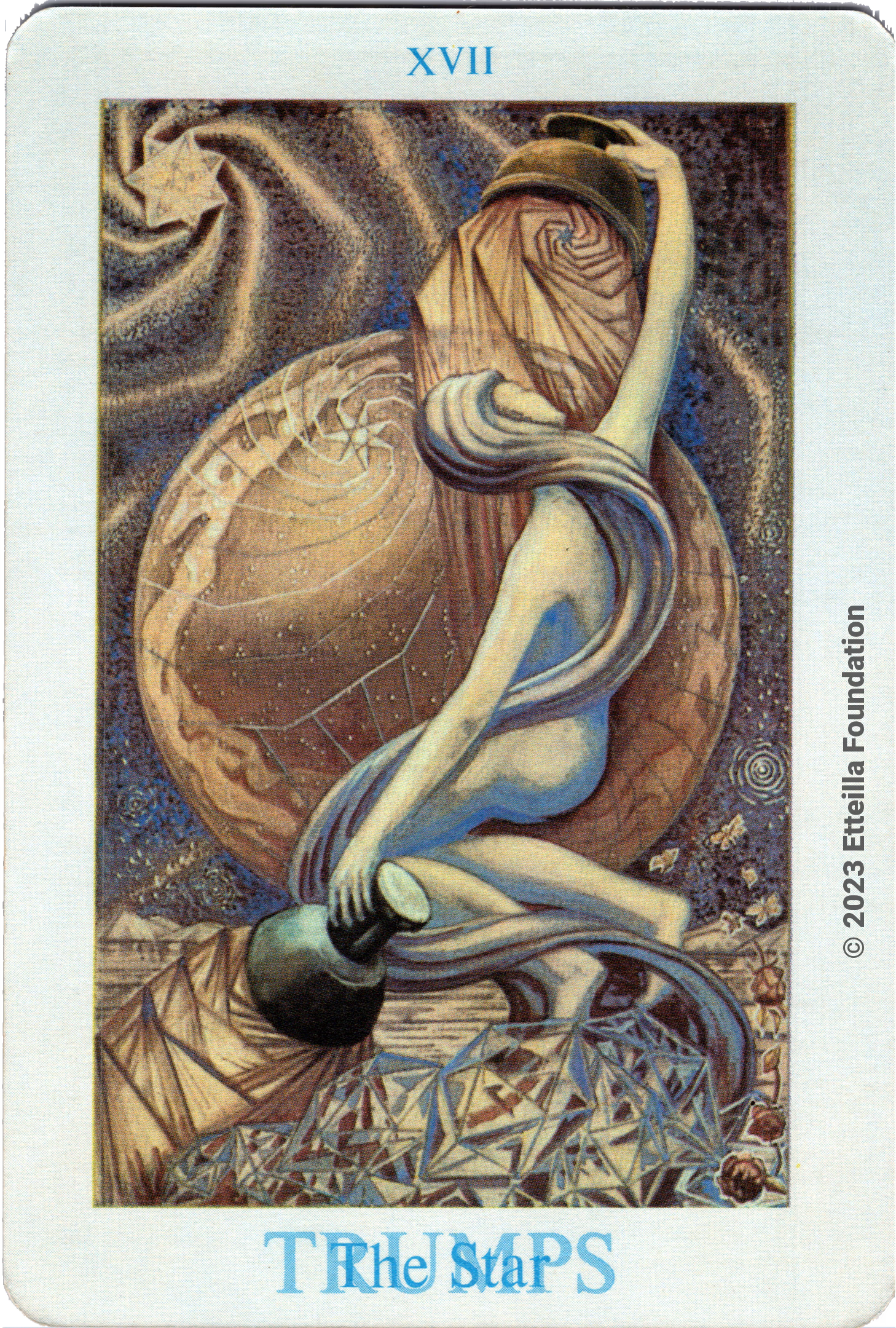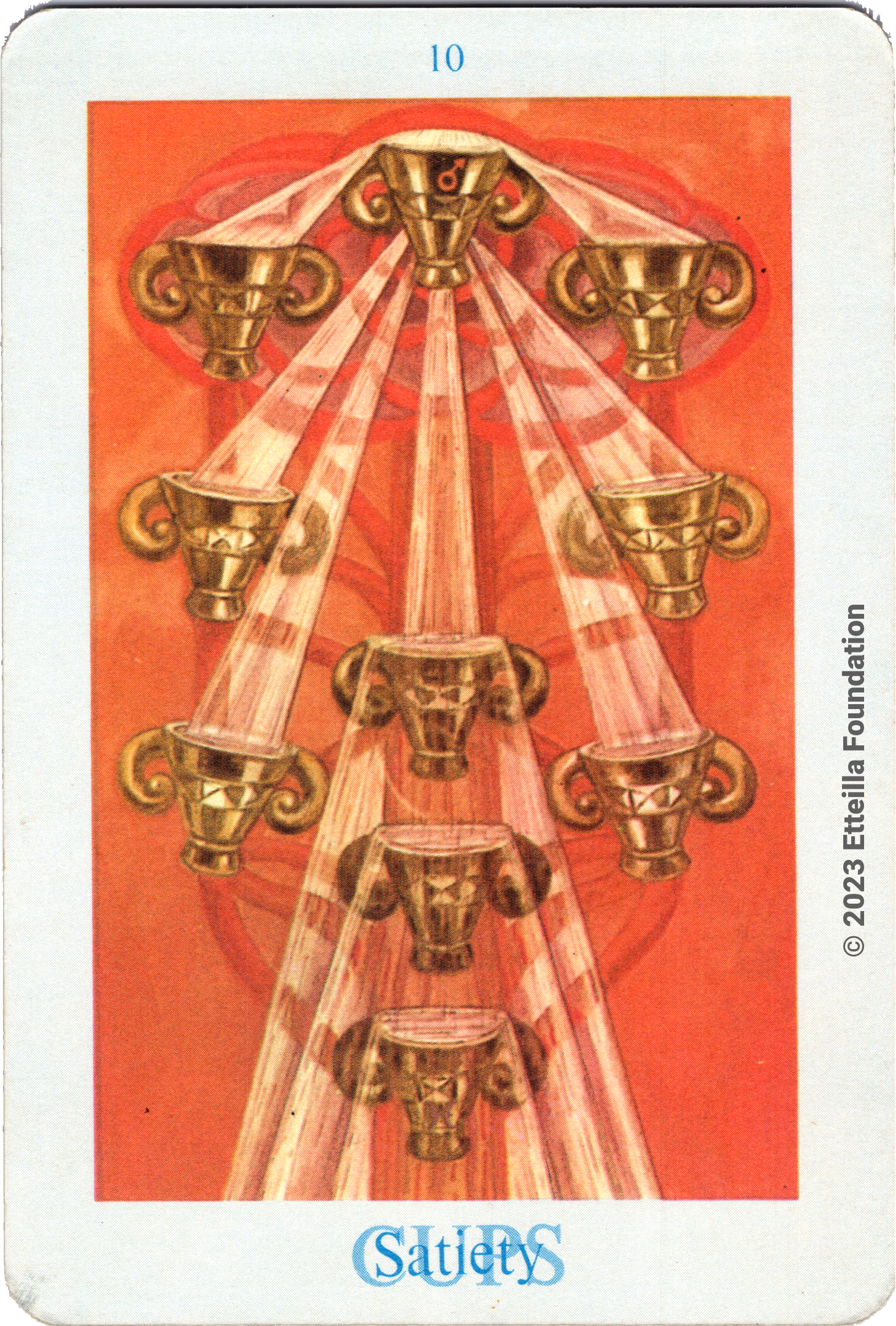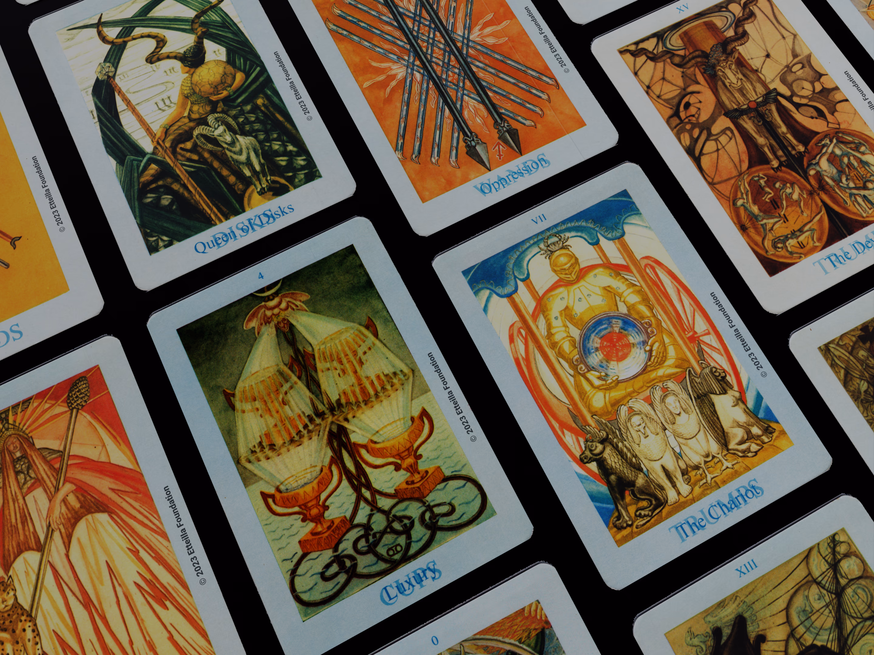 The Thoth Tarot which features very unique card designs and artistic direction is a collaboration between the famous occultist Aleister Crowley who designed the deck, and Lady Frieda Harris who painted the illustrations. This very popular divination tarot created between 1938 and 1943 is notable for having major arcana re-ordered and renamed to allow what Crowley calls the “double zodiac loop” for tarot reading. We note that the suit of disks replace the suit of pentacles found in the Waite-Smith decks and many cards have different names. In particular the Knights replace the Kings, The Knights become the Princes and the Pages are replaced by the Princesses.This version, commonly referred as A1, which was the first colored version printed by Llewellyn in Hong Hong circa 1967 is highly recognizable due to two printing mistakes: The 8 of Cups doesn’t have a number at the top and the Ace of Disk illustration is printed upside-down. All colored versions of the Toth decks are believed to be derived from the prints included in the original limited edition of the Toth book printed by Crowley circa 1944 not Frieda original paintings. Our deck is complete, in mint condition and come with its box.