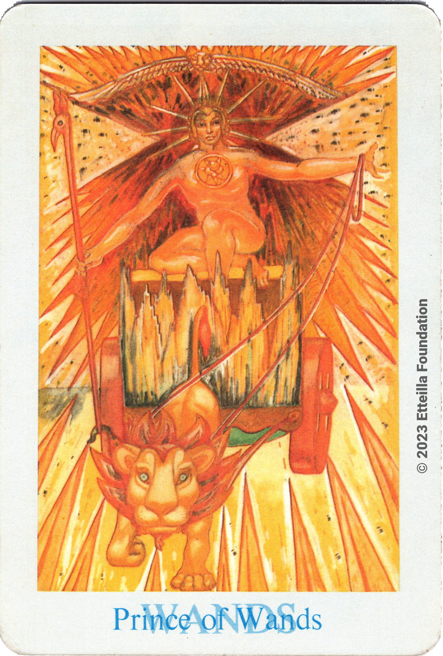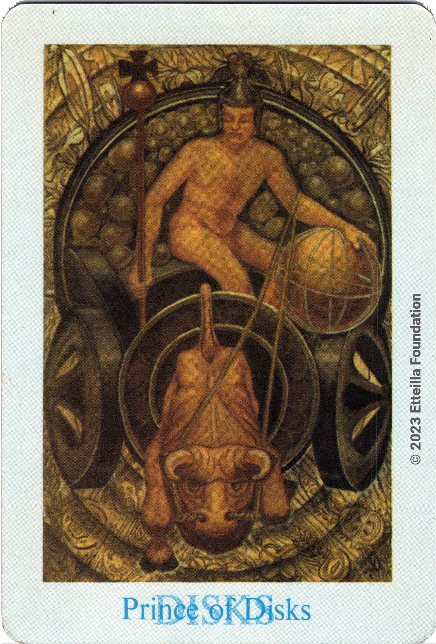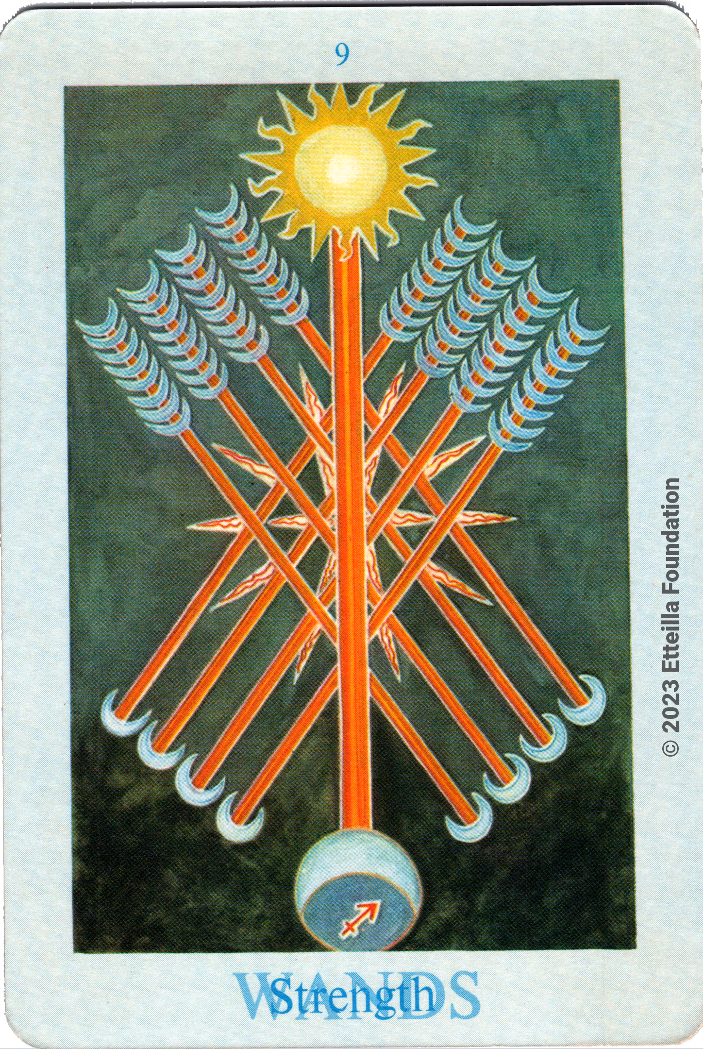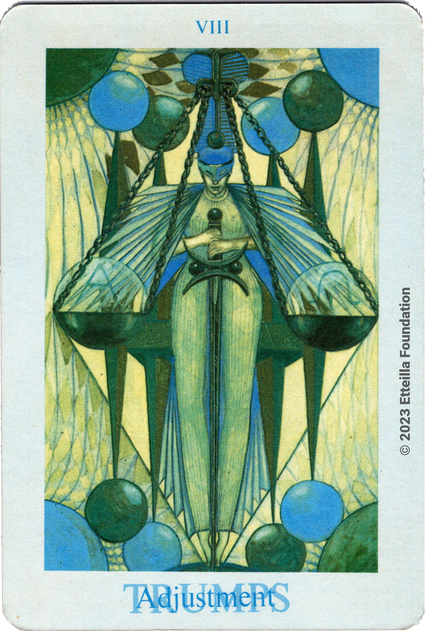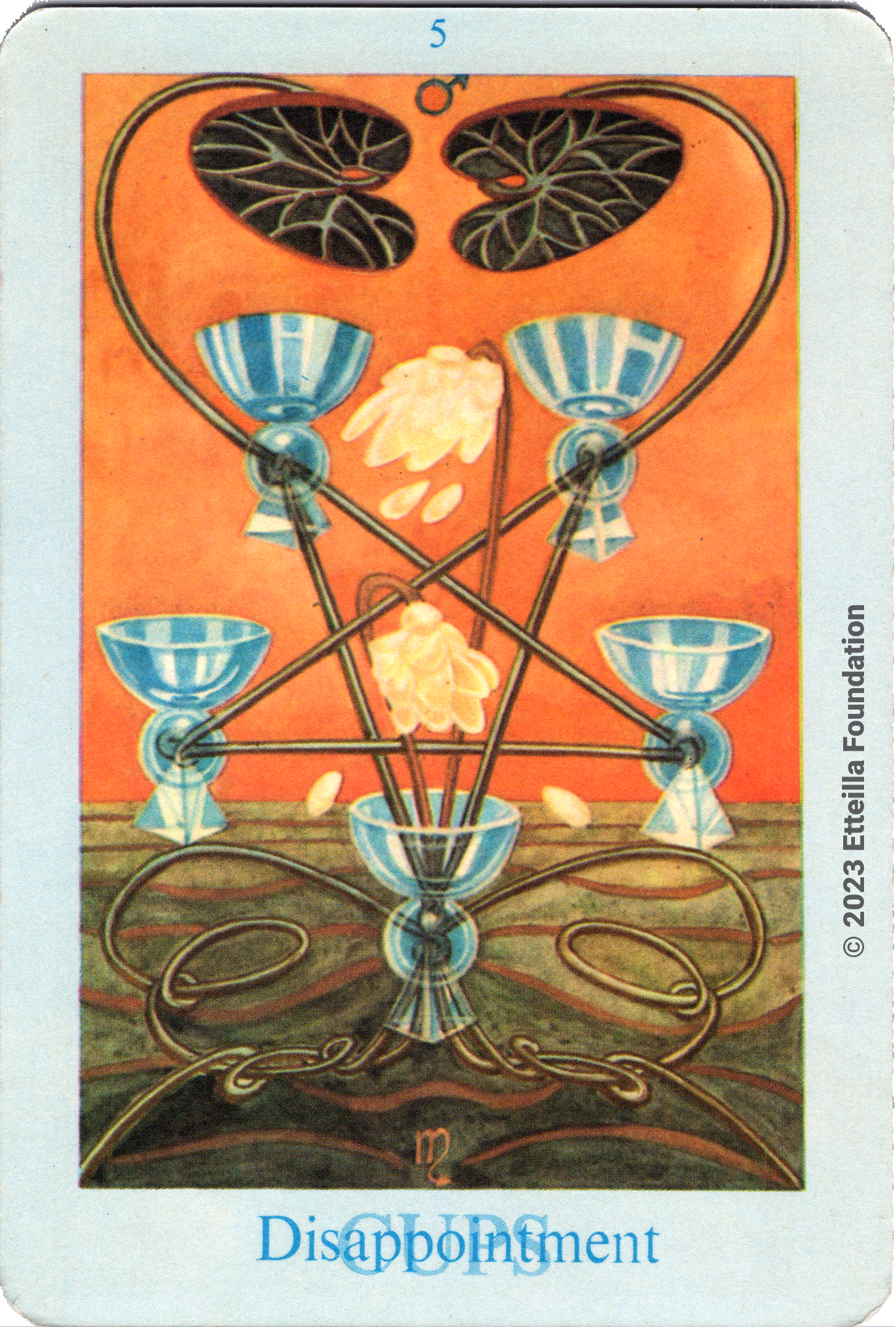 The Thoth Tarot which features very unique card designs and artistic direction is a collaboration between the famous occultist Aleister Crowley who designed the deck, and Lady Frieda Harris who painted the illustrations. This very popular divination tarot created between 1938 and 1943 is notable for having major arcana re-ordered and renamed to allow what Crowley calls the “double zodiac loop” for tarot reading. We note that the suit of disks replace the suit of pentacles found in the Waite-Smith decks and many cards have different names. In particular the Knights replace the Kings, The Knights become the Princes and the Pages are replaced by the Princesses.This version, commonly referred as A1, which was the first colored version printed by Llewellyn in Hong Hong circa 1967 is highly recognizable due to two printing mistakes: The 8 of Cups doesn’t have a number at the top and the Ace of Disk illustration is printed upside-down. All colored versions of the Toth decks are believed to be derived from the prints included in the original limited edition of the Toth book printed by Crowley circa 1944 not Frieda original paintings. Our deck is complete, in mint condition and come with its box.