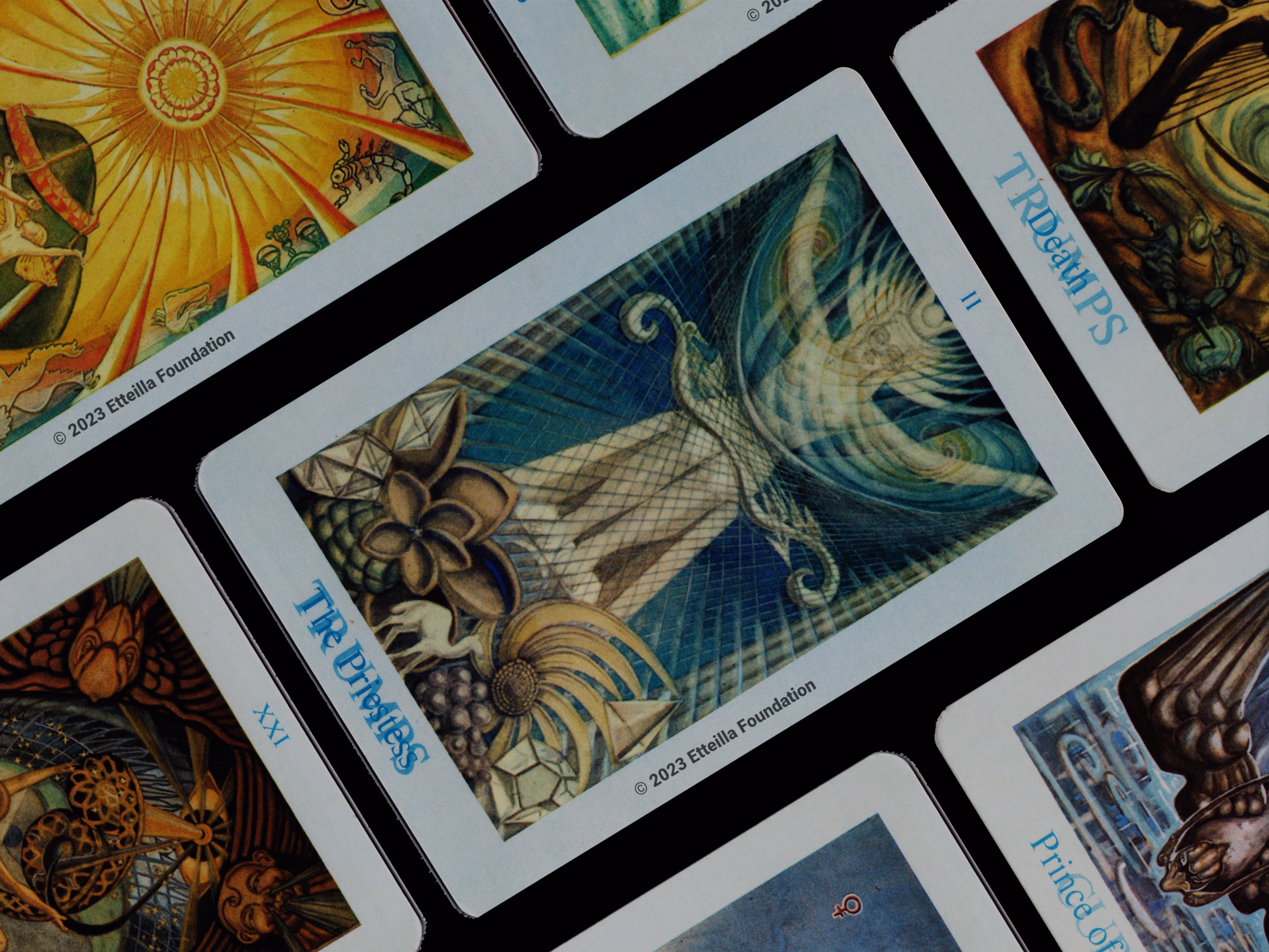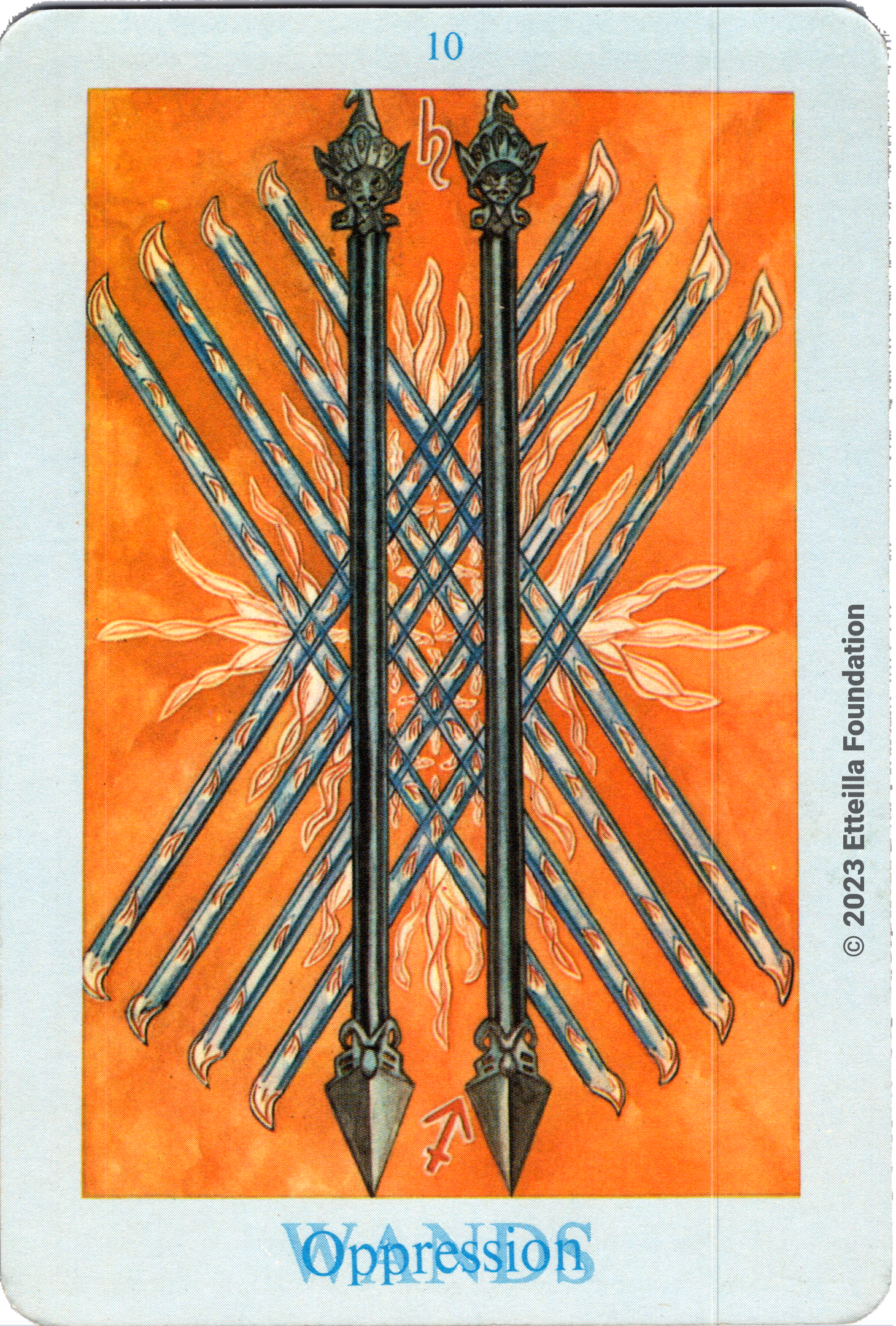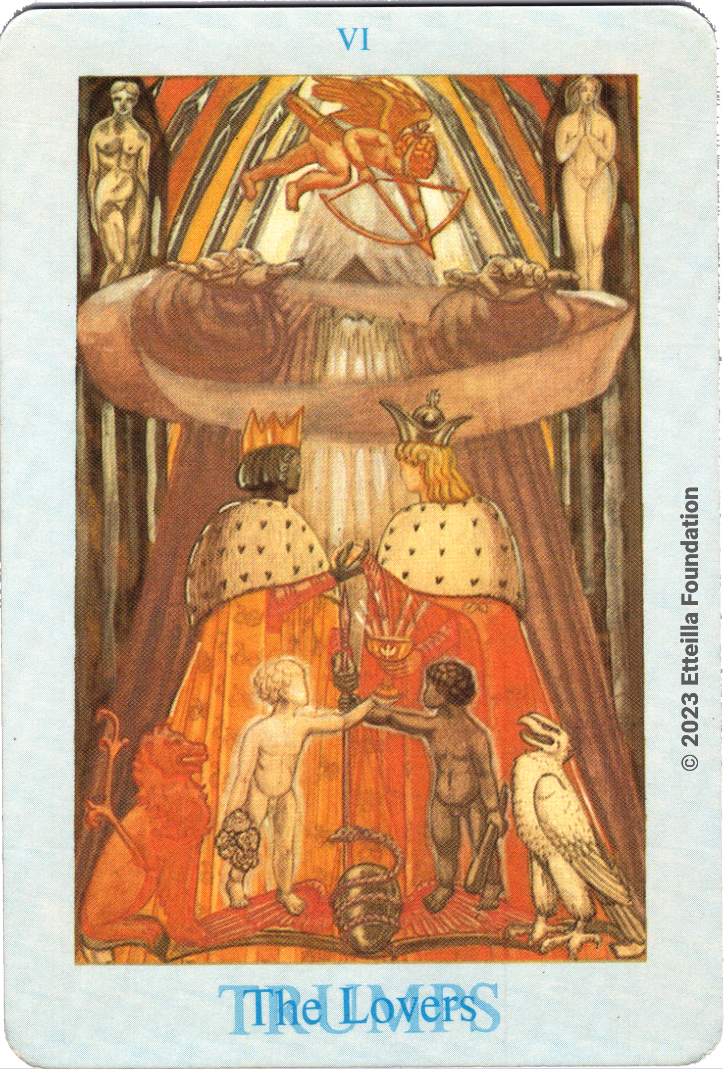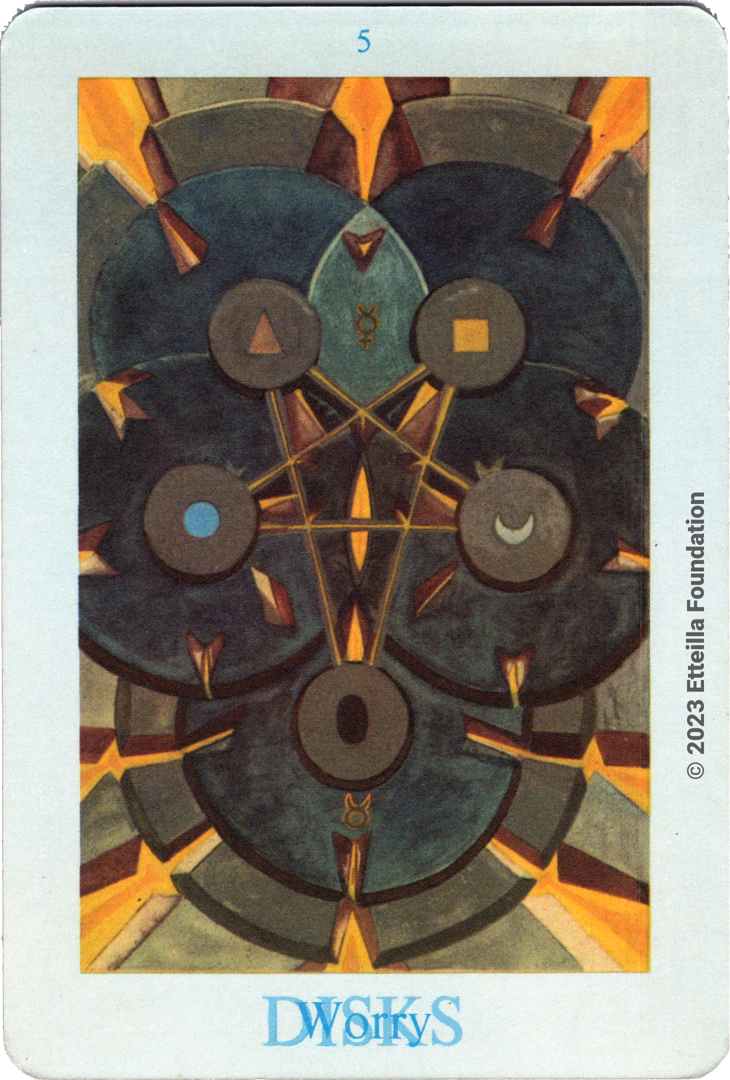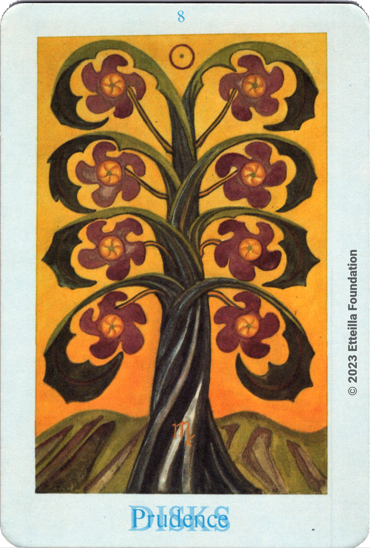 The Thoth Tarot which features very unique card designs and artistic direction is a collaboration between the famous occultist Aleister Crowley who designed the deck, and Lady Frieda Harris who painted the illustrations. This very popular divination tarot created between 1938 and 1943 is notable for having major arcana re-ordered and renamed to allow what Crowley calls the “double zodiac loop” for tarot reading. We note that the suit of disks replace the suit of pentacles found in the Waite-Smith decks and many cards have different names. In particular the Knights replace the Kings, The Knights become the Princes and the Pages are replaced by the Princesses.This version, commonly referred as A1, which was the first colored version printed by Llewellyn in Hong Hong circa 1967 is highly recognizable due to two printing mistakes: The 8 of Cups doesn’t have a number at the top and the Ace of Disk illustration is printed upside-down. All colored versions of the Toth decks are believed to be derived from the prints included in the original limited edition of the Toth book printed by Crowley circa 1944 not Frieda original paintings. Our deck is complete, in mint condition and come with its box.