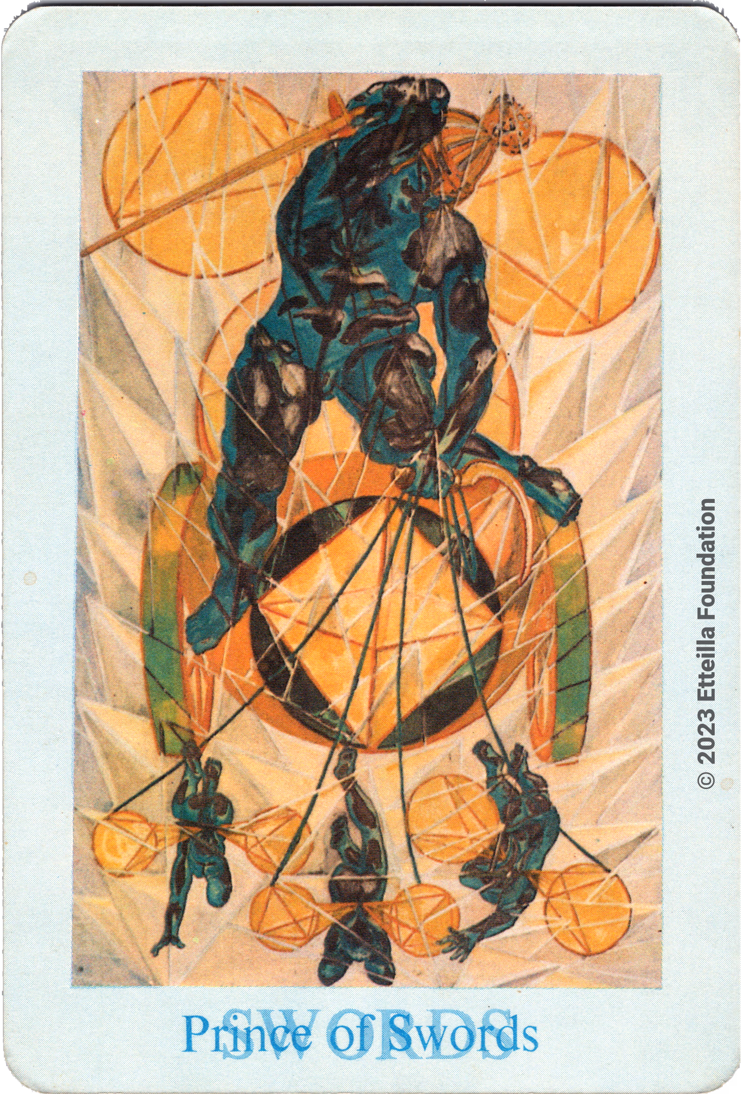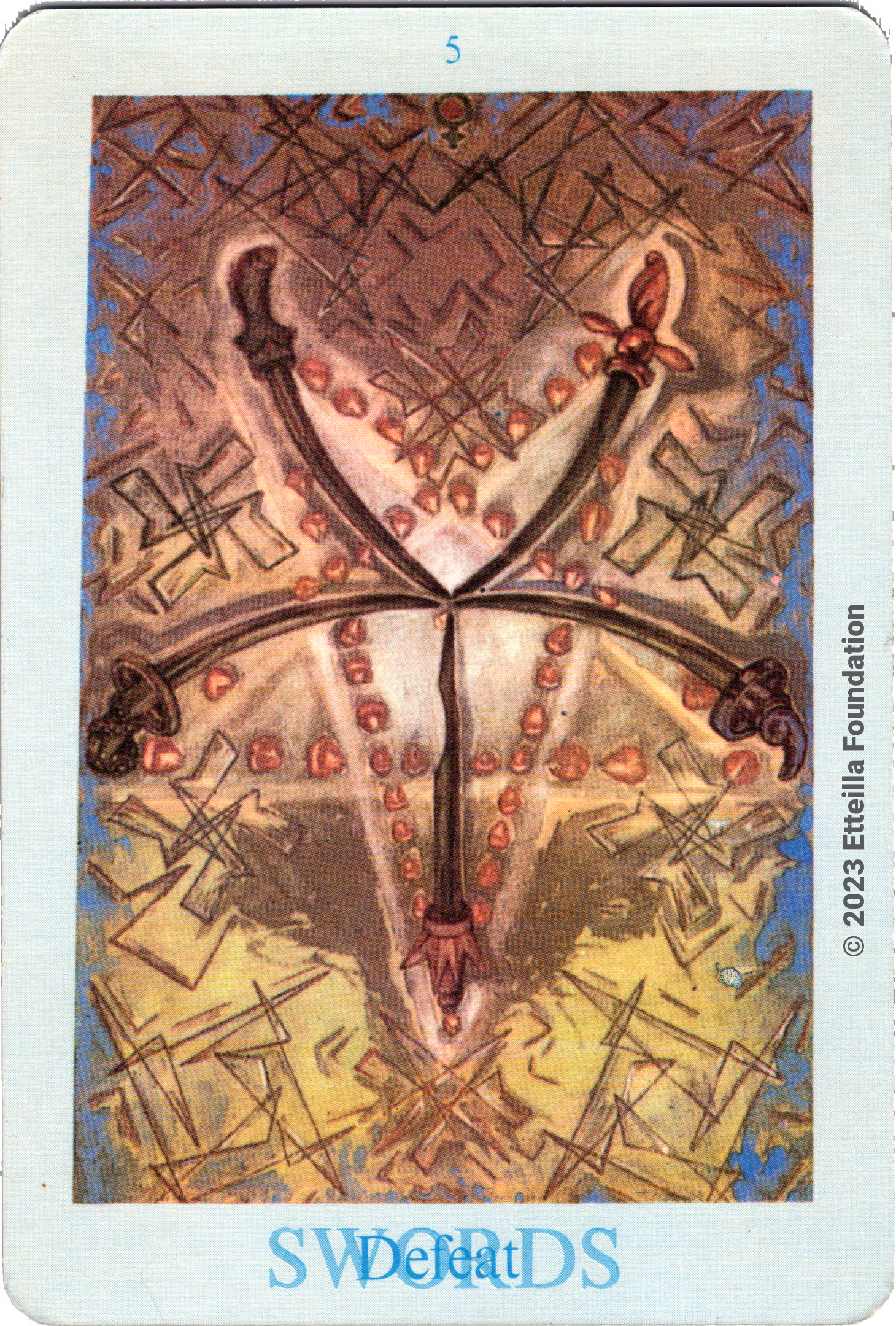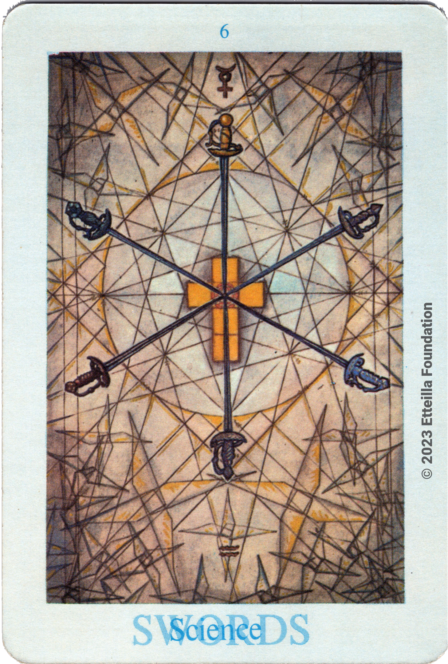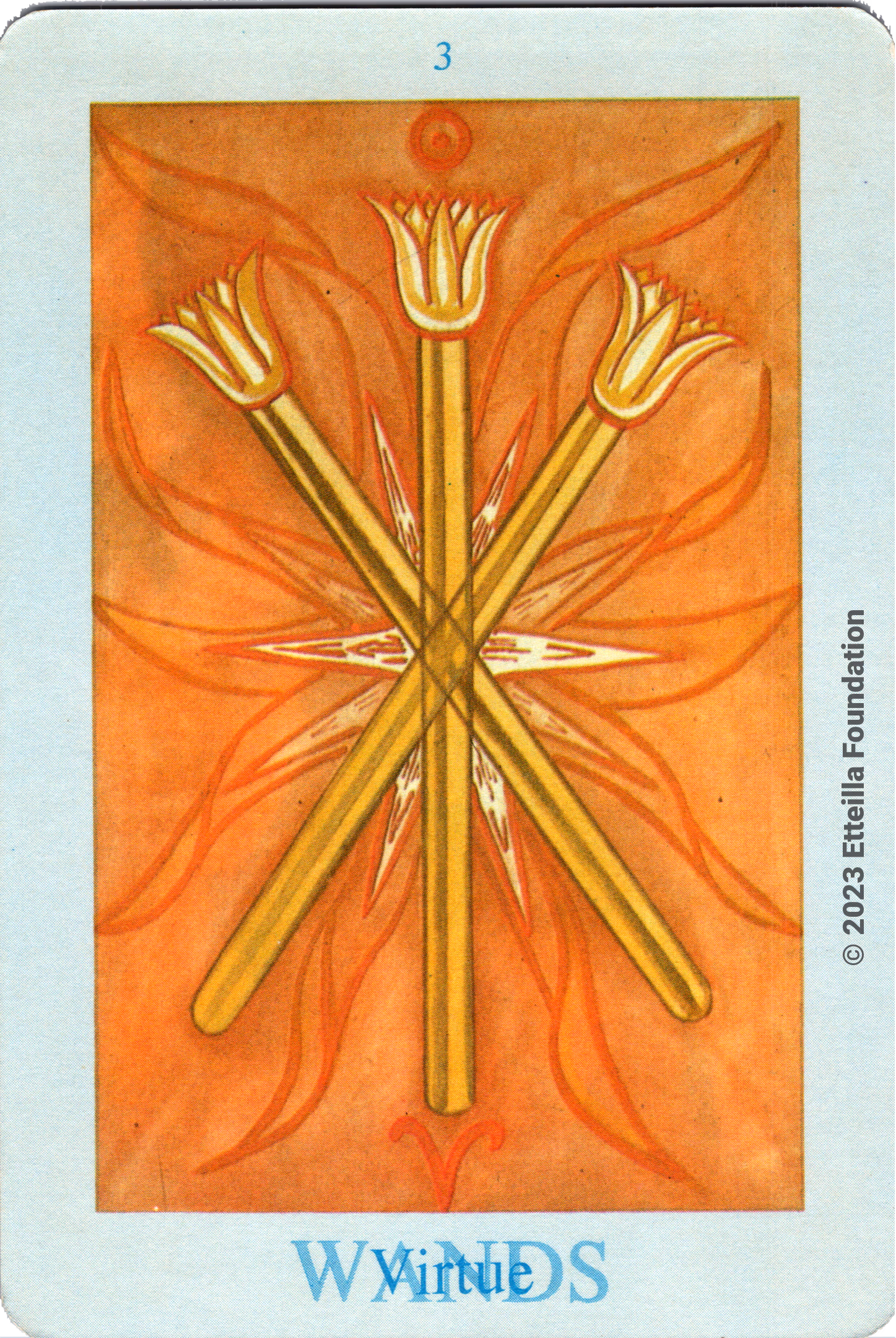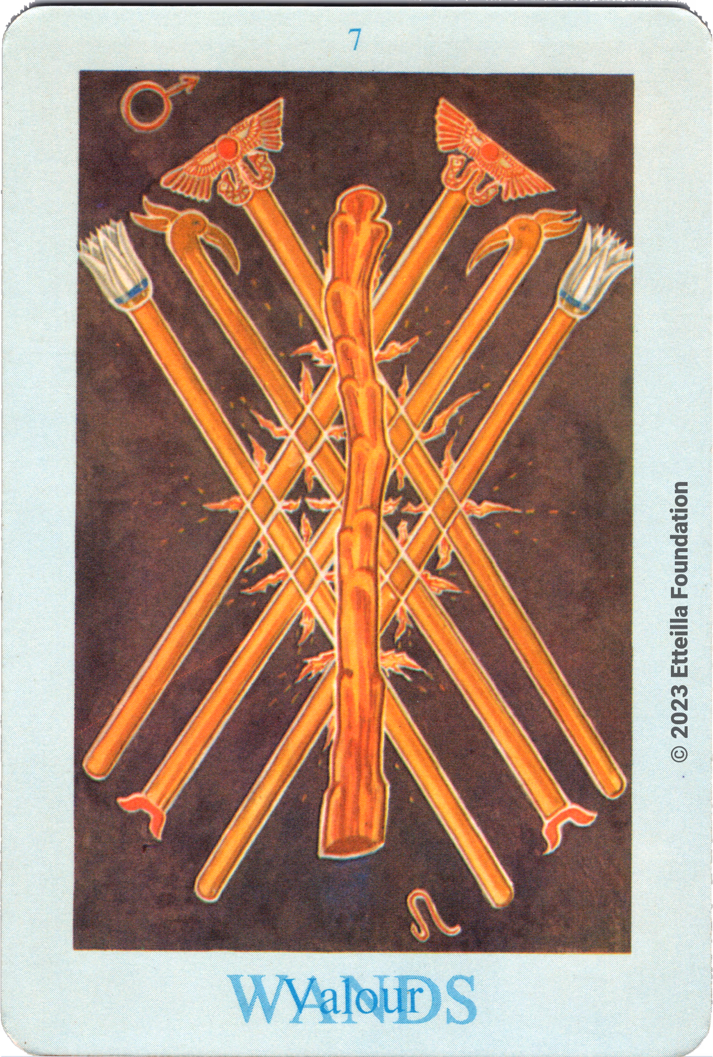 The Thoth Tarot which features very unique card designs and artistic direction is a collaboration between the famous occultist Aleister Crowley who designed the deck, and Lady Frieda Harris who painted the illustrations. This very popular divination tarot created between 1938 and 1943 is notable for having major arcana re-ordered and renamed to allow what Crowley calls the “double zodiac loop” for tarot reading. We note that the suit of disks replace the suit of pentacles found in the Waite-Smith decks and many cards have different names. In particular the Knights replace the Kings, The Knights become the Princes and the Pages are replaced by the Princesses.This version, commonly referred as A1, which was the first colored version printed by Llewellyn in Hong Hong circa 1967 is highly recognizable due to two printing mistakes: The 8 of Cups doesn’t have a number at the top and the Ace of Disk illustration is printed upside-down. All colored versions of the Toth decks are believed to be derived from the prints included in the original limited edition of the Toth book printed by Crowley circa 1944 not Frieda original paintings. Our deck is complete, in mint condition and come with its box.