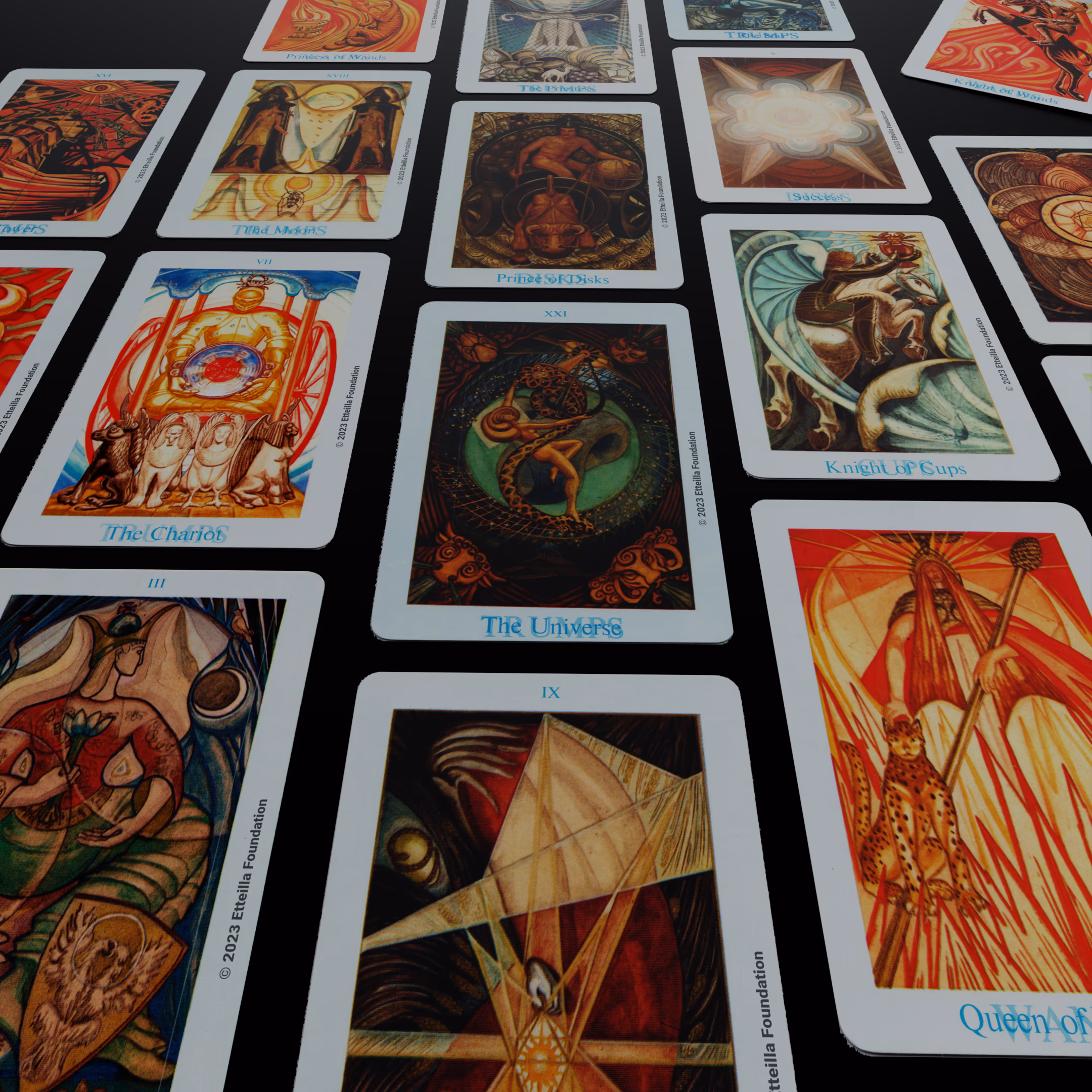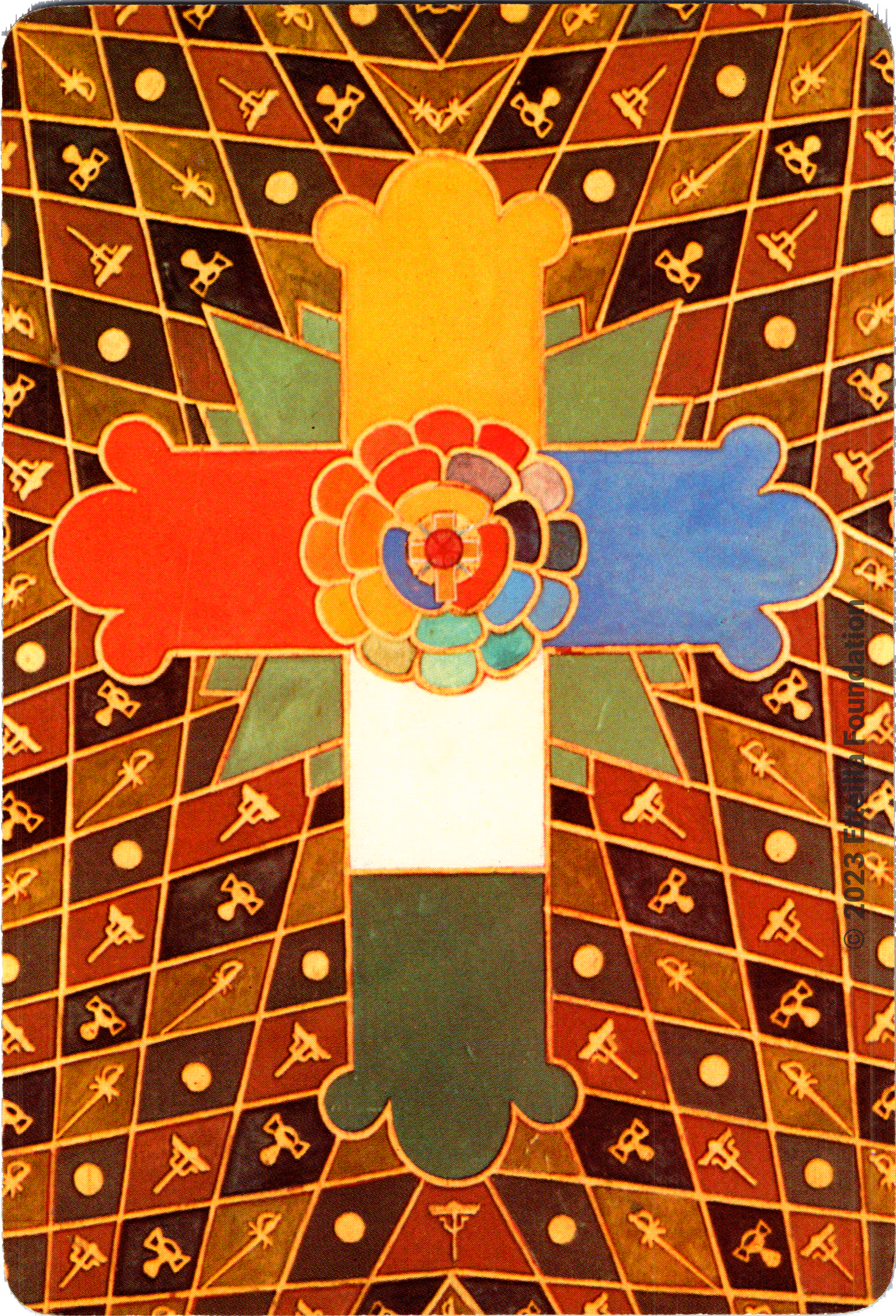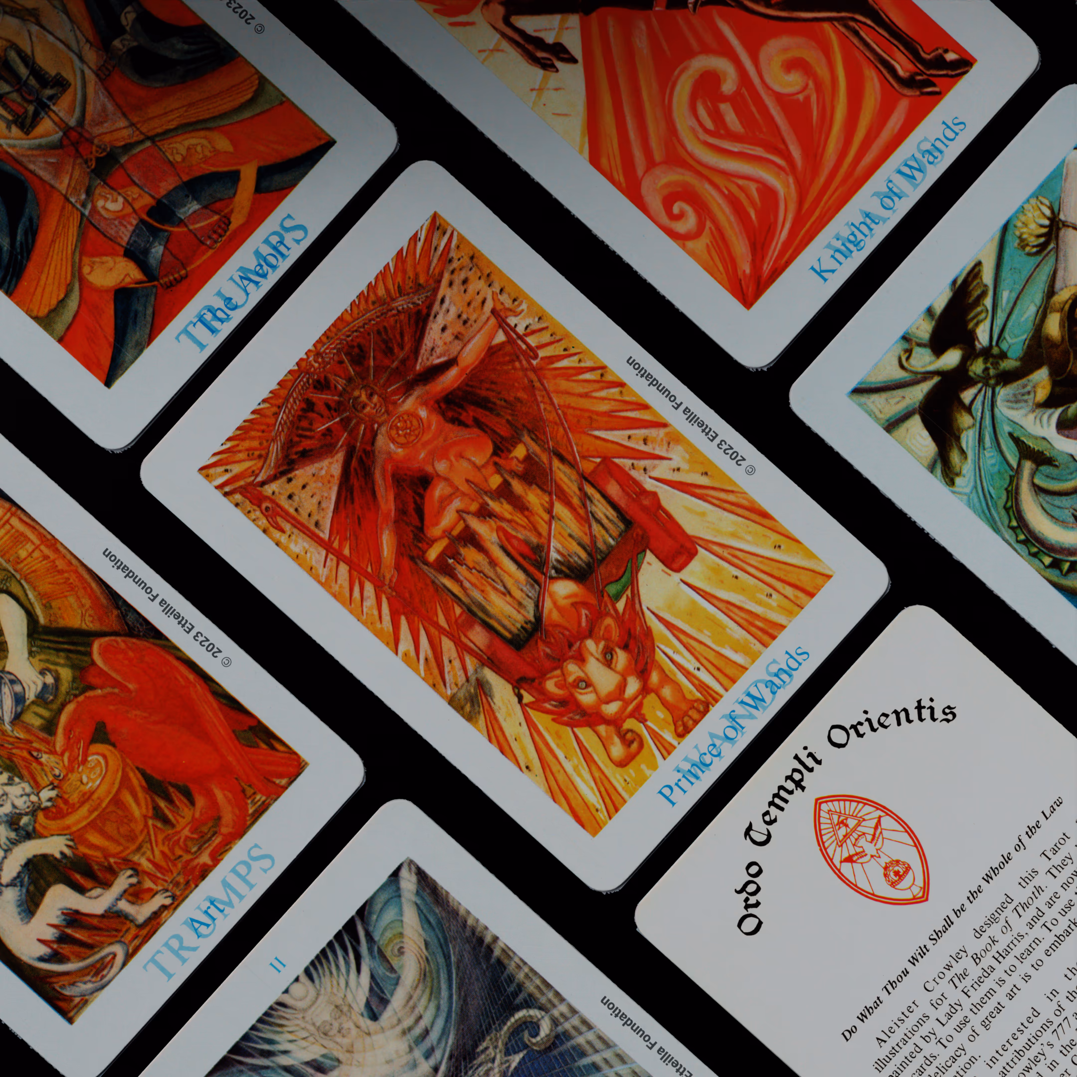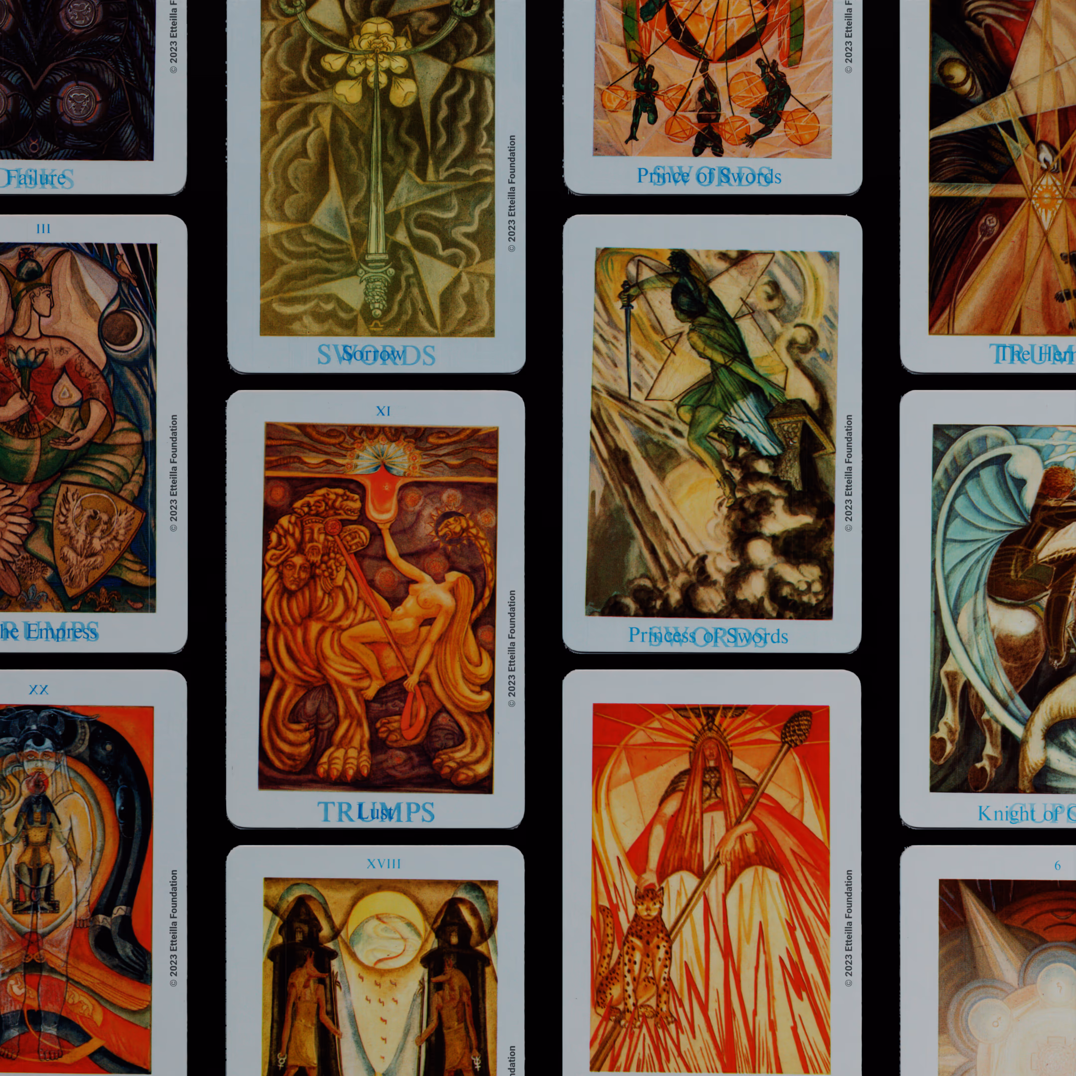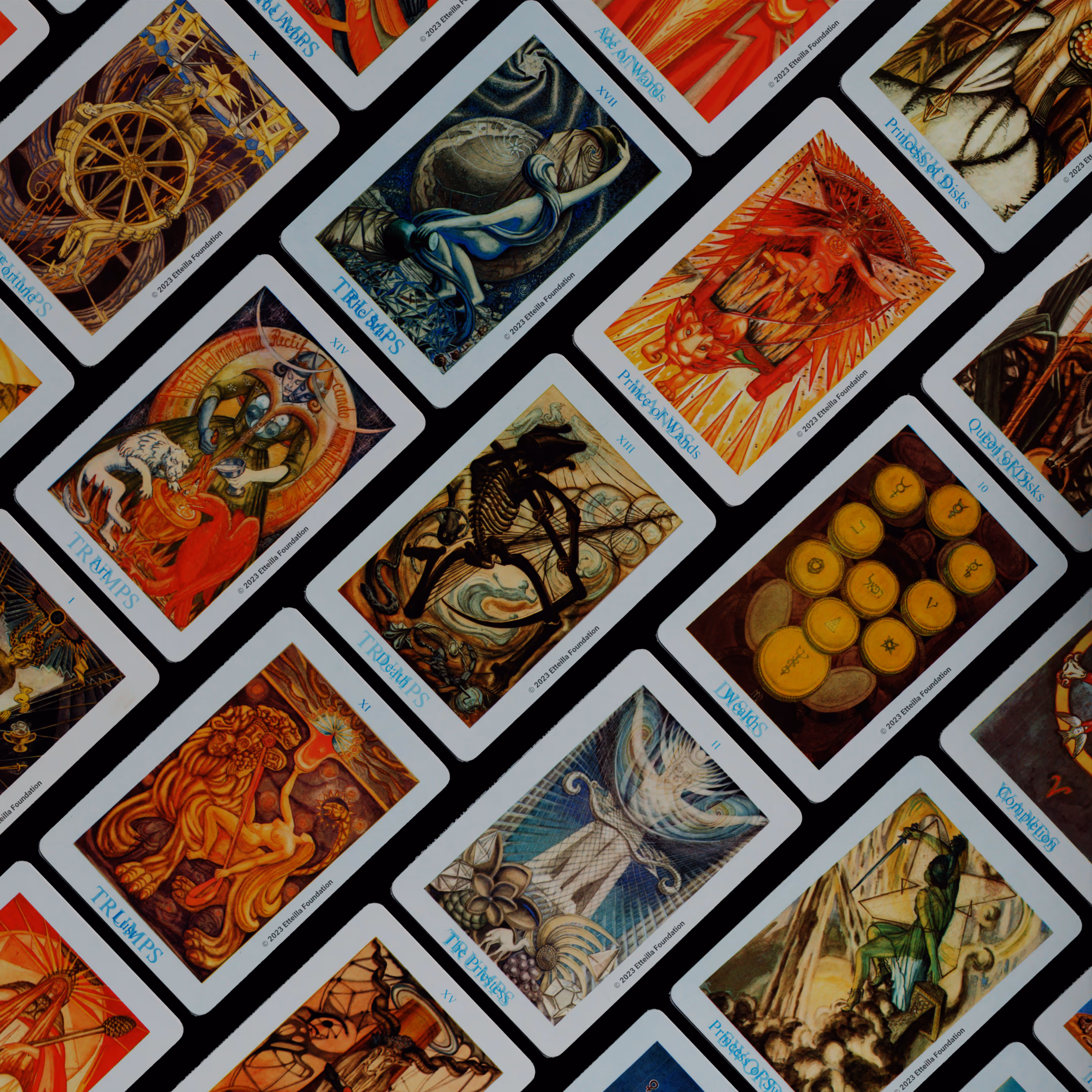 The Thoth Tarot which features very unique card designs and artistic direction is a collaboration between the famous occultist Aleister Crowley who designed the deck, and Lady Frieda Harris who painted the illustrations. This very popular divination tarot created between 1938 and 1943 is notable for having major arcana re-ordered and renamed to allow what Crowley calls the “double zodiac loop” for tarot reading. We note that the suit of disks replace the suit of pentacles found in the Waite-Smith decks and many cards have different names. In particular the Knights replace the Kings, The Knights become the Princes and the Pages are replaced by the Princesses. This version, commonly referred as version B, was published by Weisner instead of Llewellyn and is the first one to introduce the extra Ordo Templi Orientis white playing card.