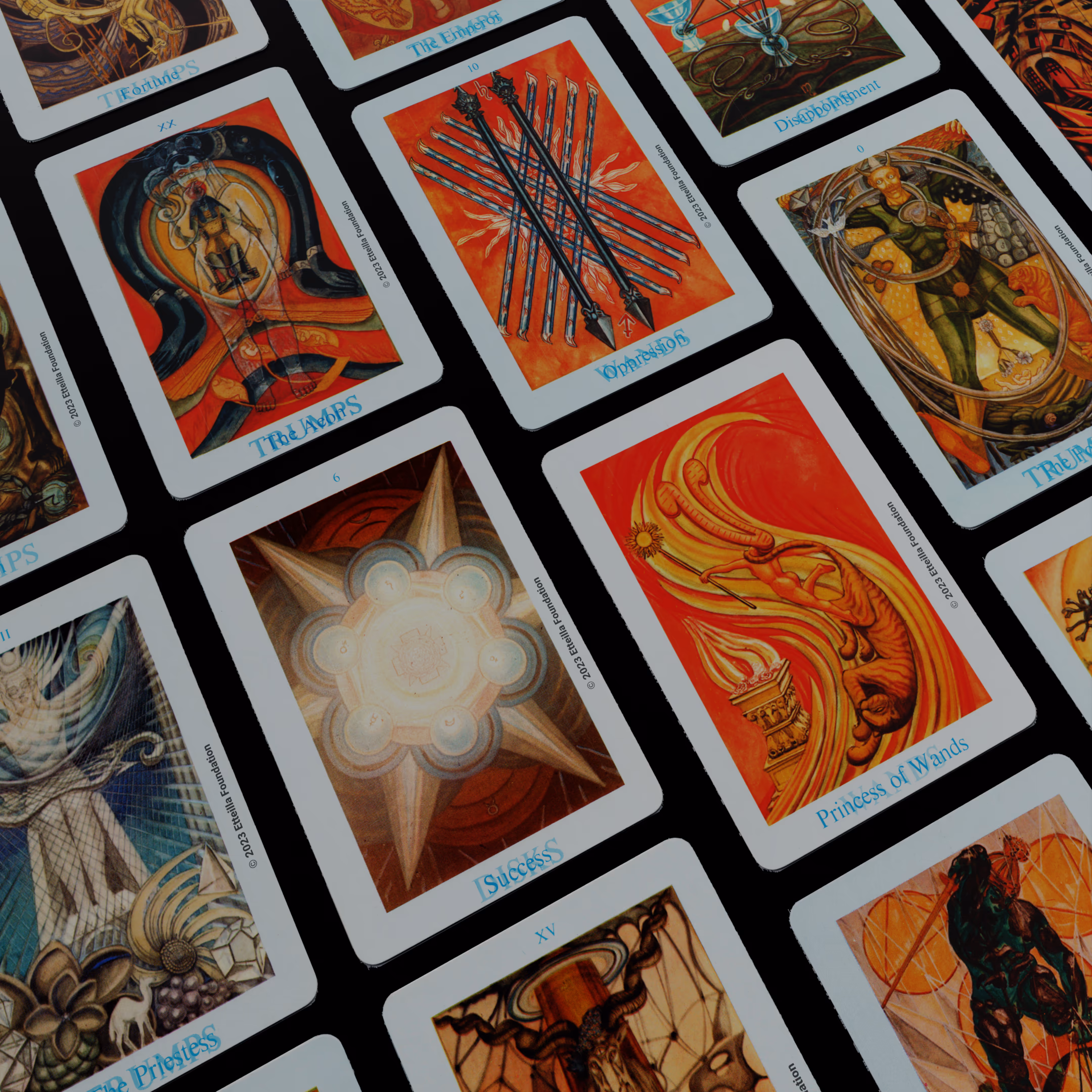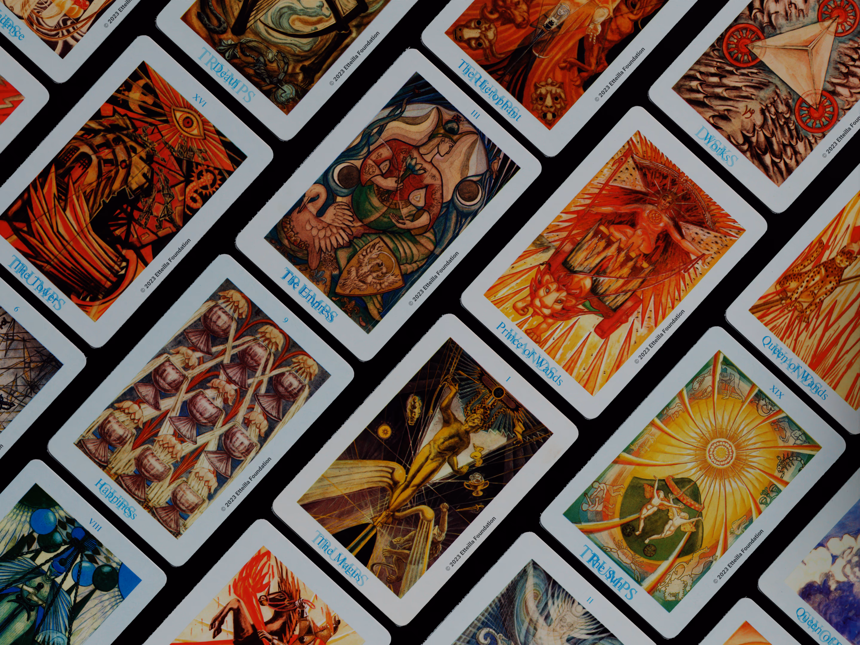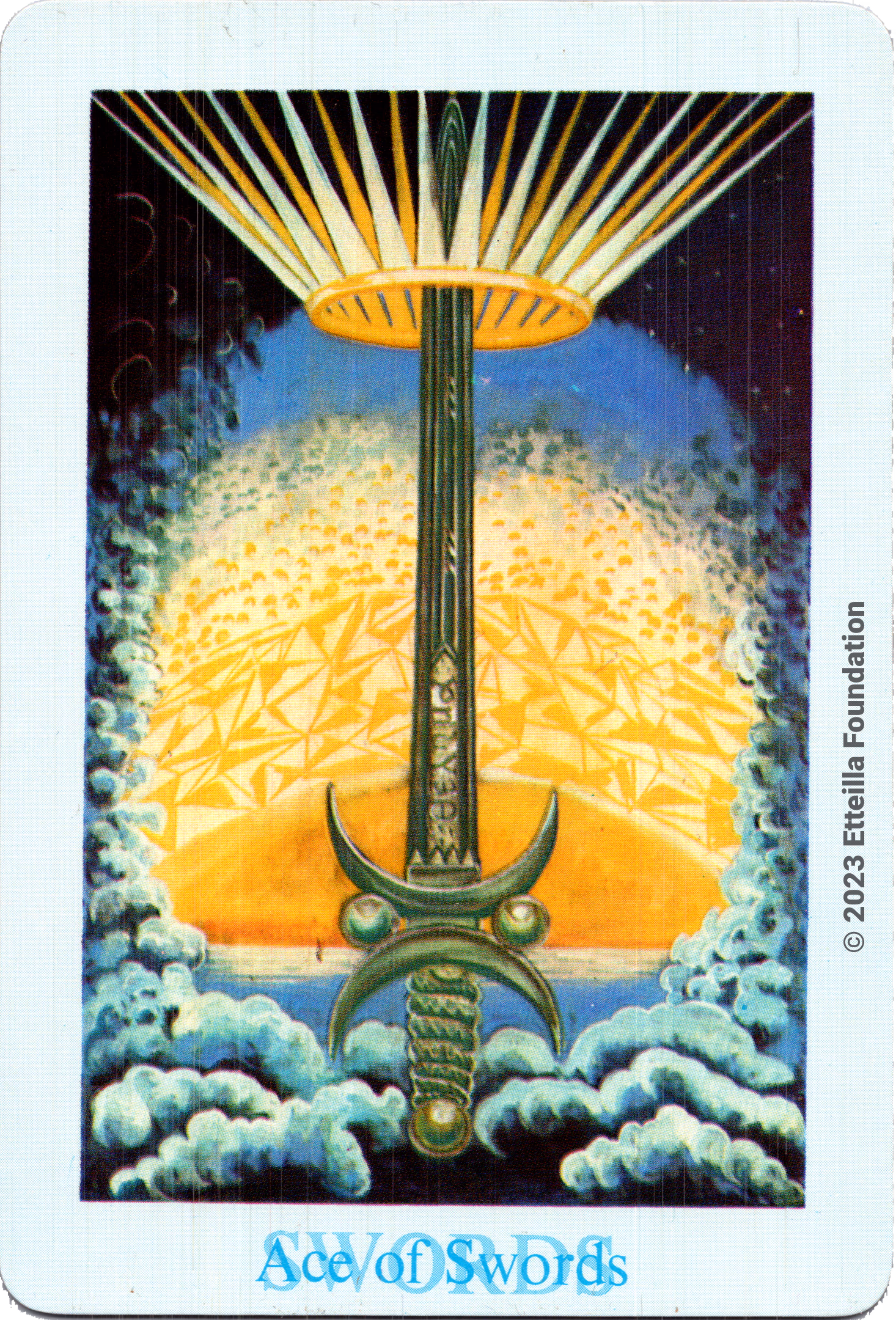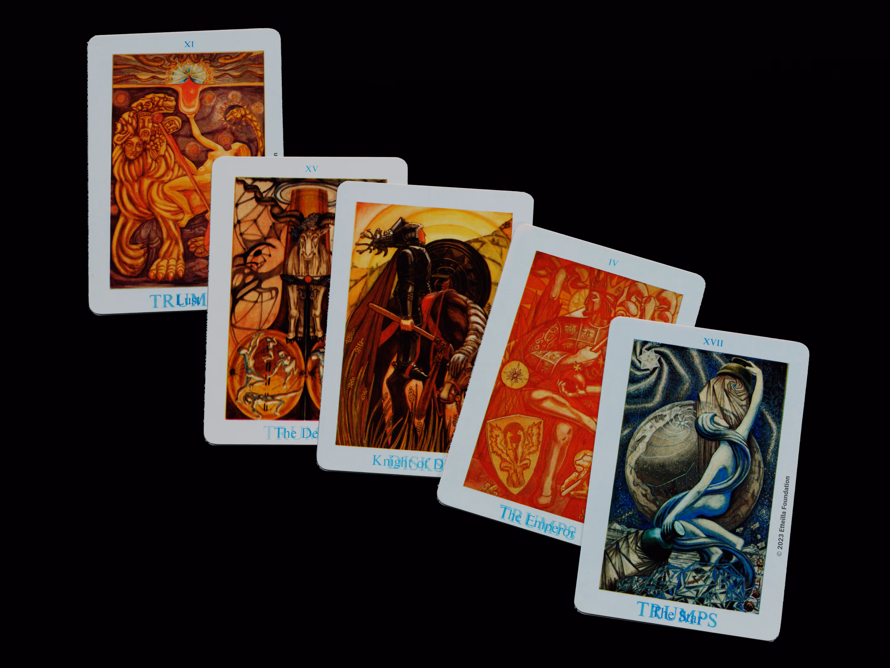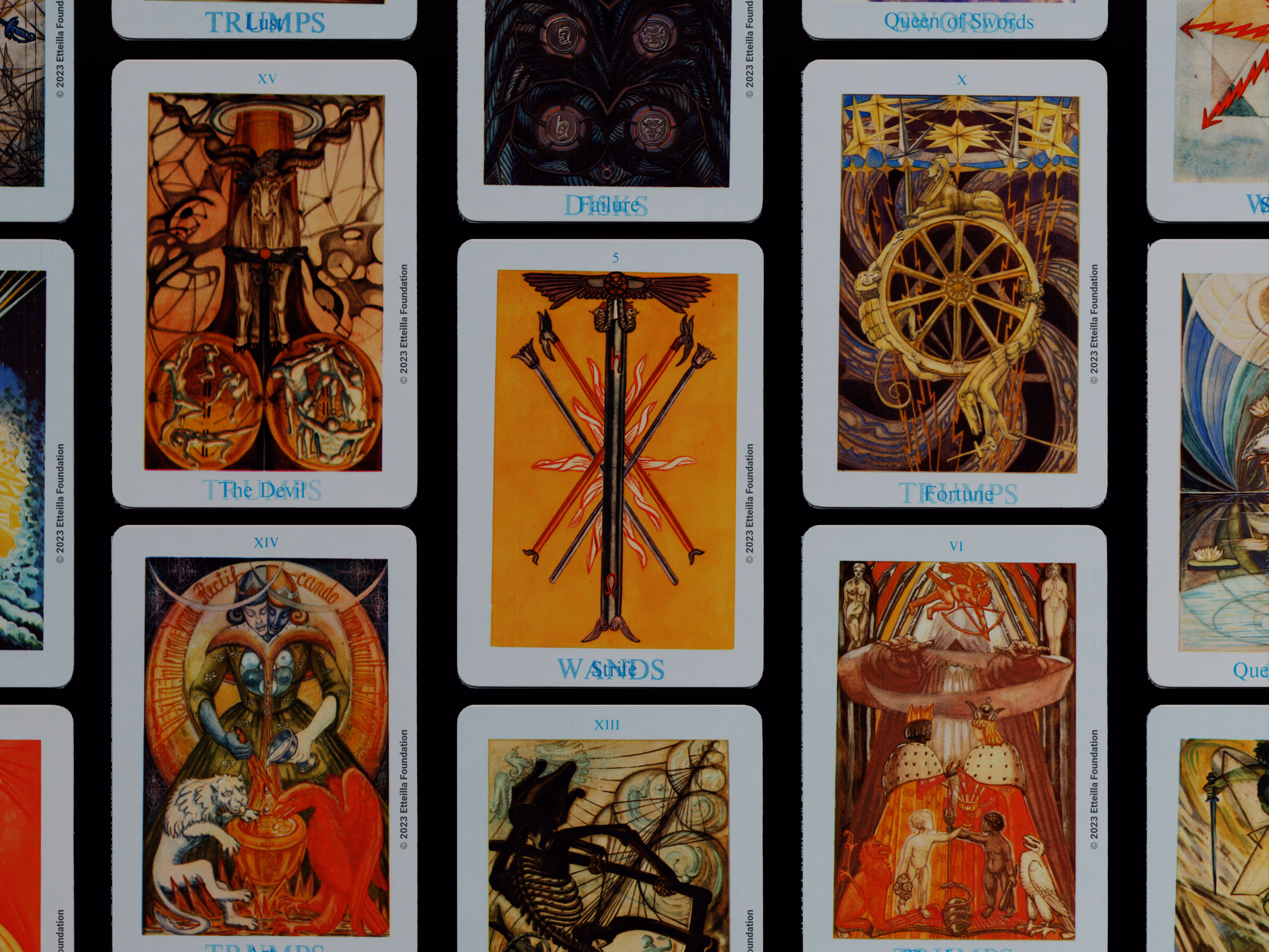 The Thoth Tarot which features very unique card designs and artistic direction is a collaboration between the famous occultist Aleister Crowley who designed the deck, and Lady Frieda Harris who painted the illustrations. This very popular divination tarot created between 1938 and 1943 is notable for having major arcana re-ordered and renamed to allow what Crowley calls the “double zodiac loop” for tarot reading. We note that the suit of disks replace the suit of pentacles found in the Waite-Smith decks and many cards have different names. In particular the Knights replace the Kings, The Knights become the Princes and the Pages are replaced by the Princesses. This version, commonly referred as version B, was published by Weisner instead of Llewellyn and is the first one to introduce the extra Ordo Templi Orientis white playing card.