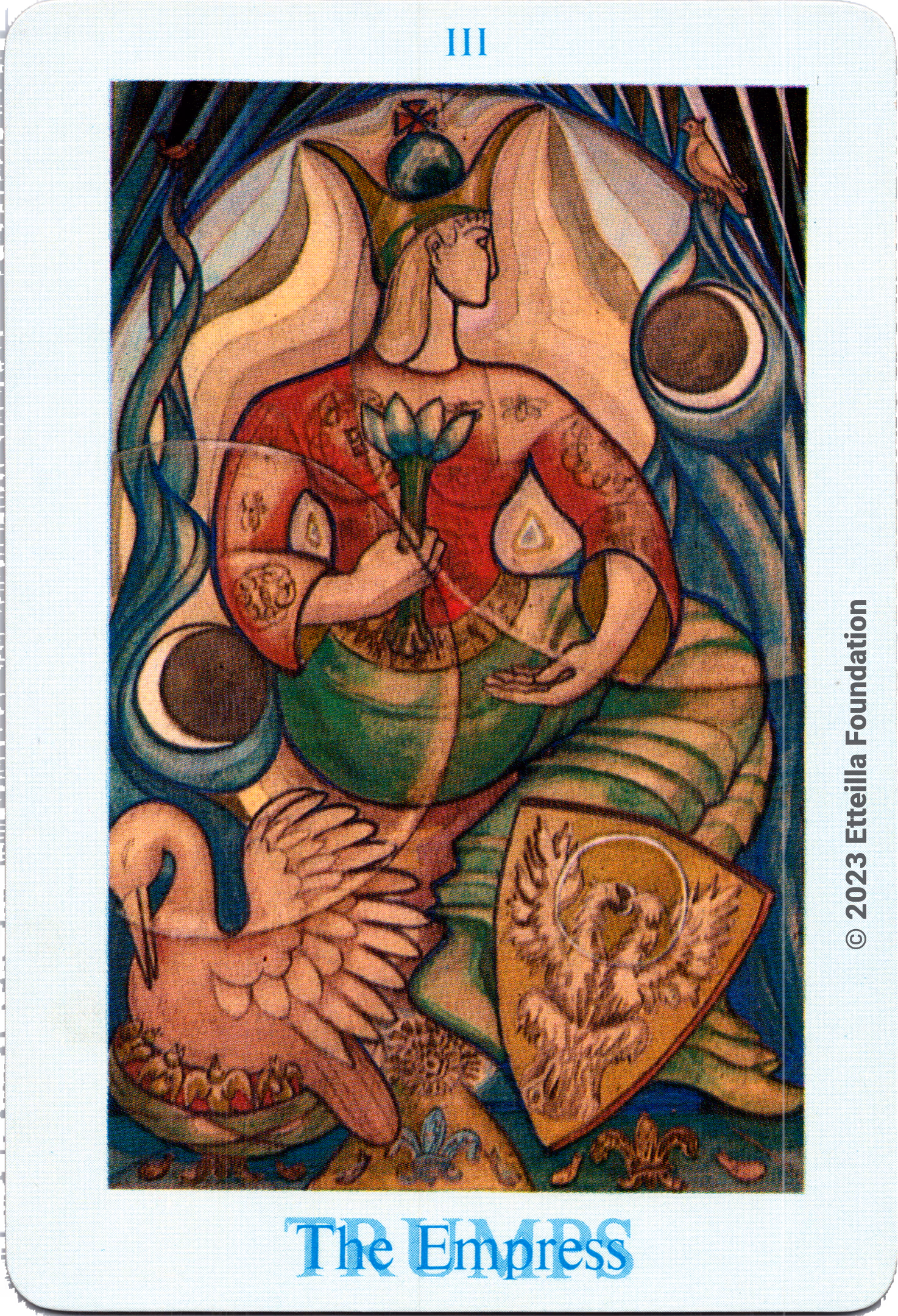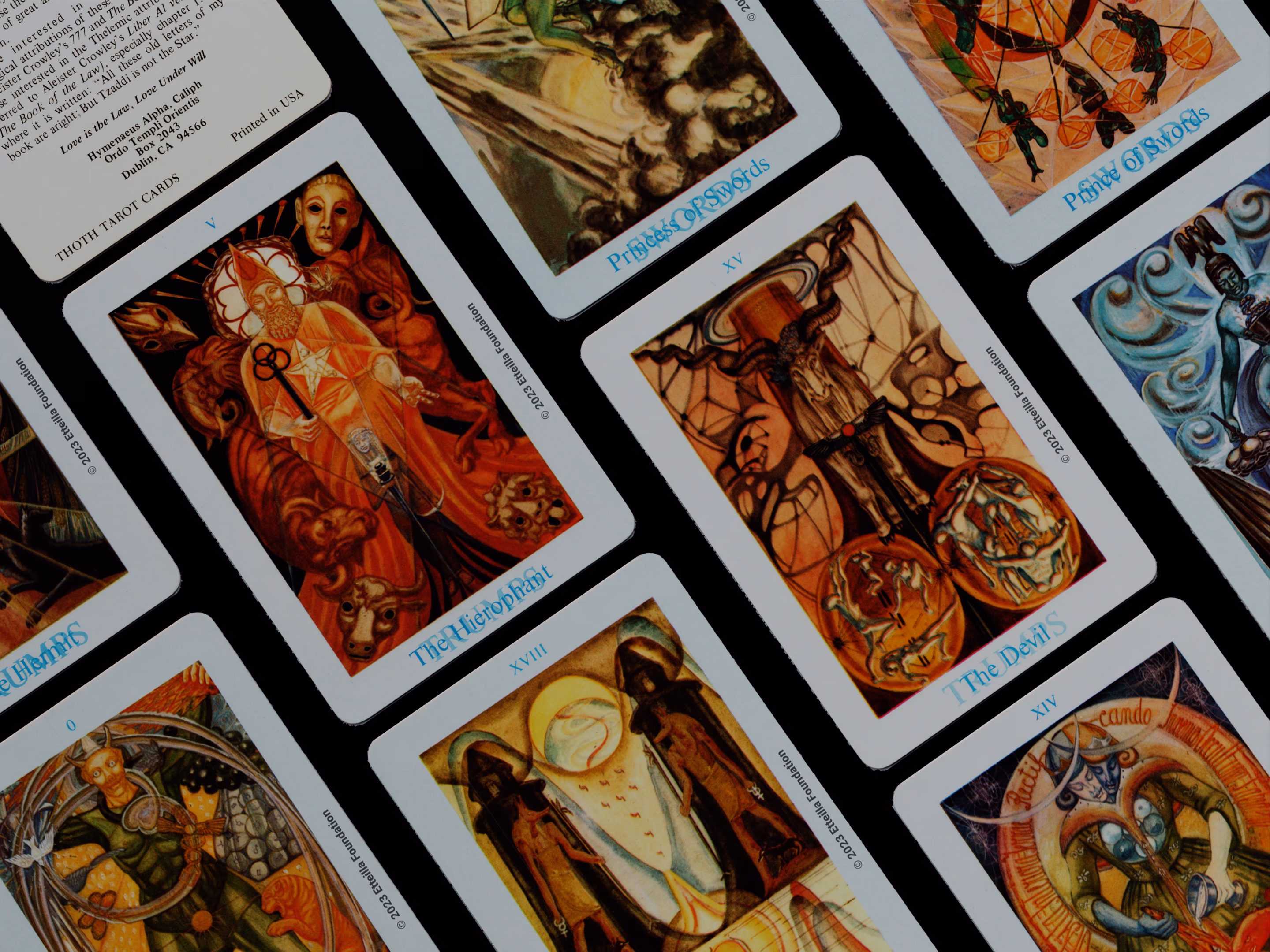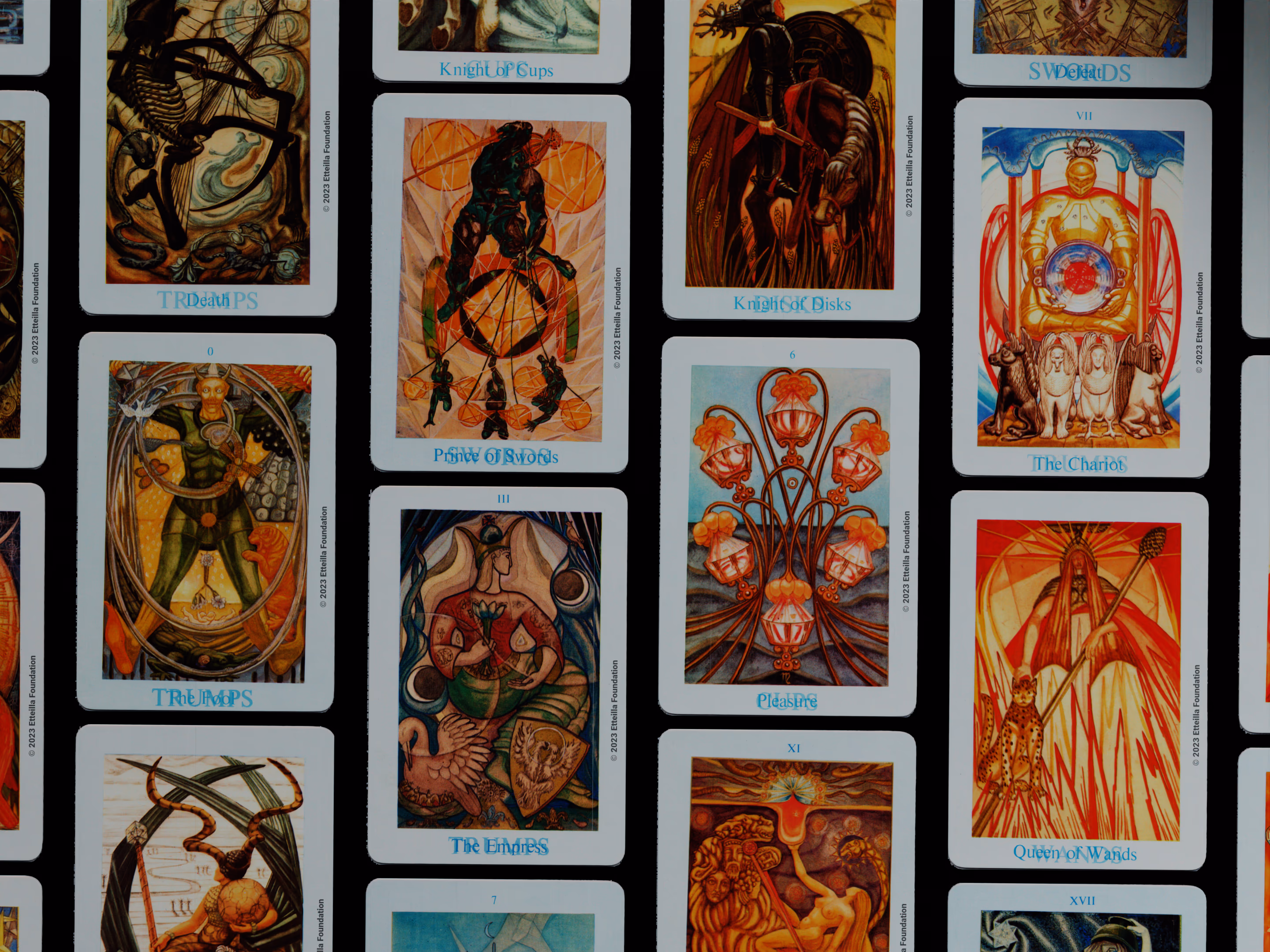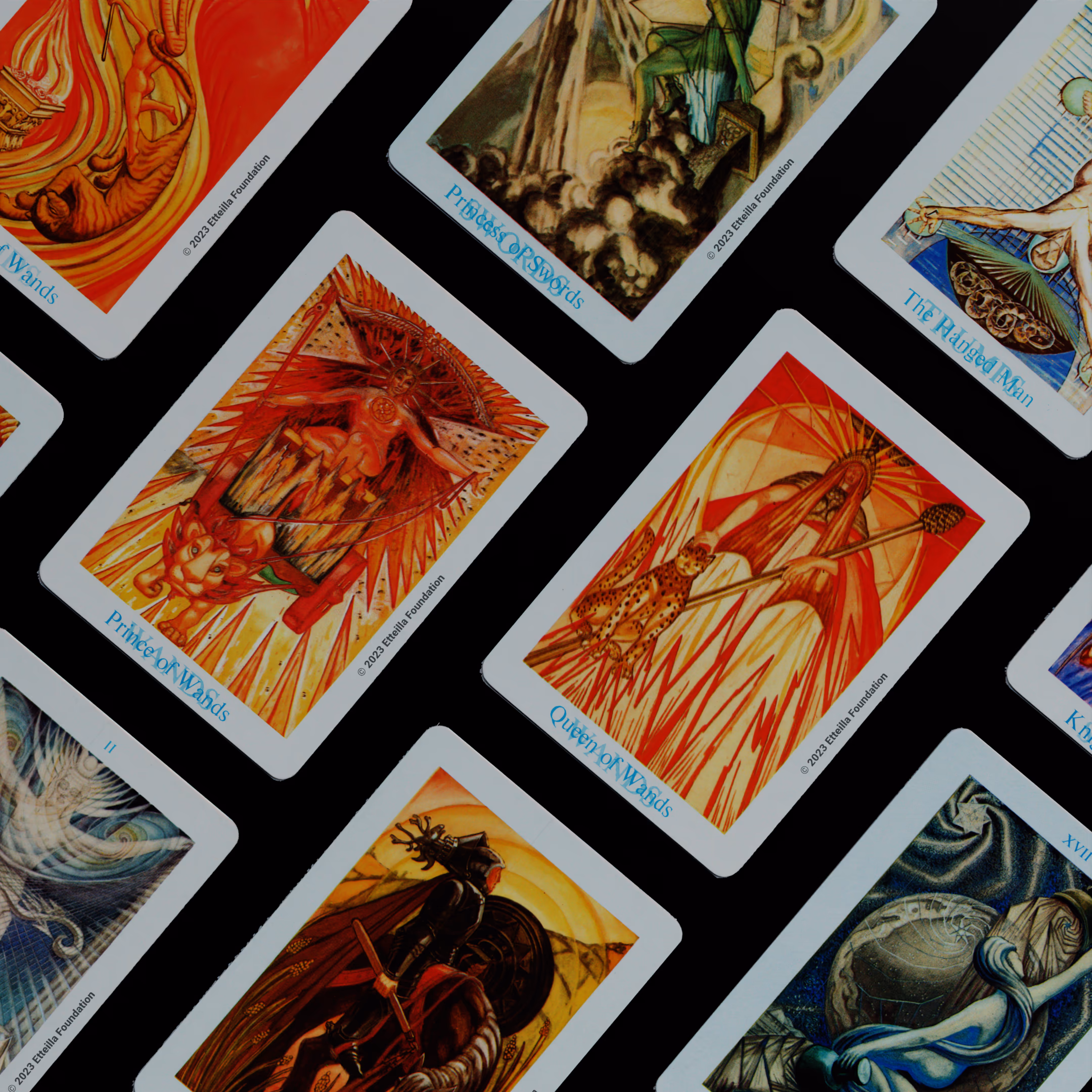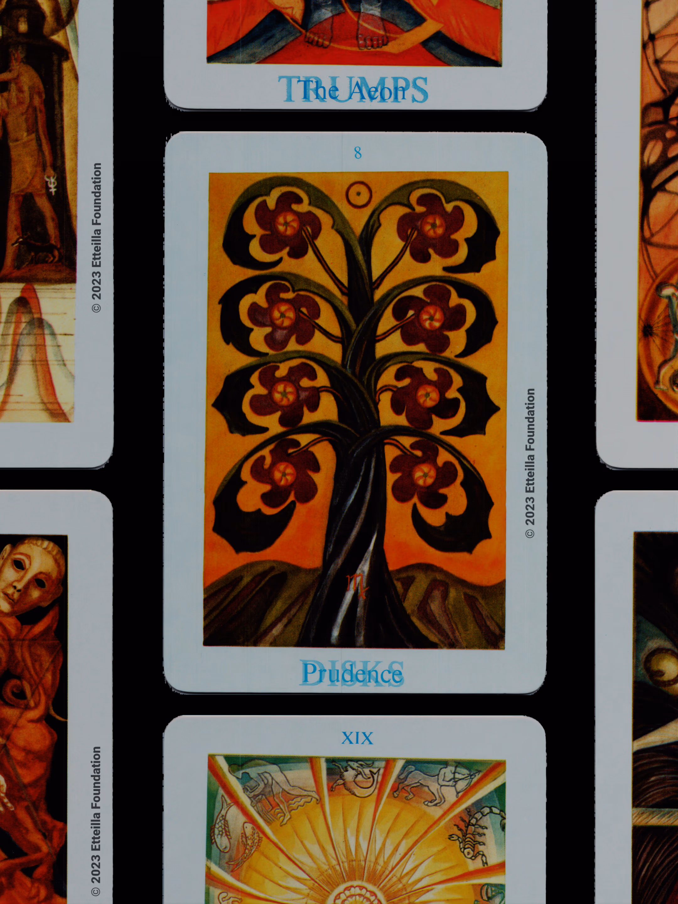 The Thoth Tarot which features very unique card designs and artistic direction is a collaboration between the famous occultist Aleister Crowley who designed the deck, and Lady Frieda Harris who painted the illustrations. This very popular divination tarot created between 1938 and 1943 is notable for having major arcana re-ordered and renamed to allow what Crowley calls the “double zodiac loop” for tarot reading. We note that the suit of disks replace the suit of pentacles found in the Waite-Smith decks and many cards have different names. In particular the Knights replace the Kings, The Knights become the Princes and the Pages are replaced by the Princesses. This version, commonly referred as version B, was published by Weisner instead of Llewellyn and is the first one to introduce the extra Ordo Templi Orientis white playing card.