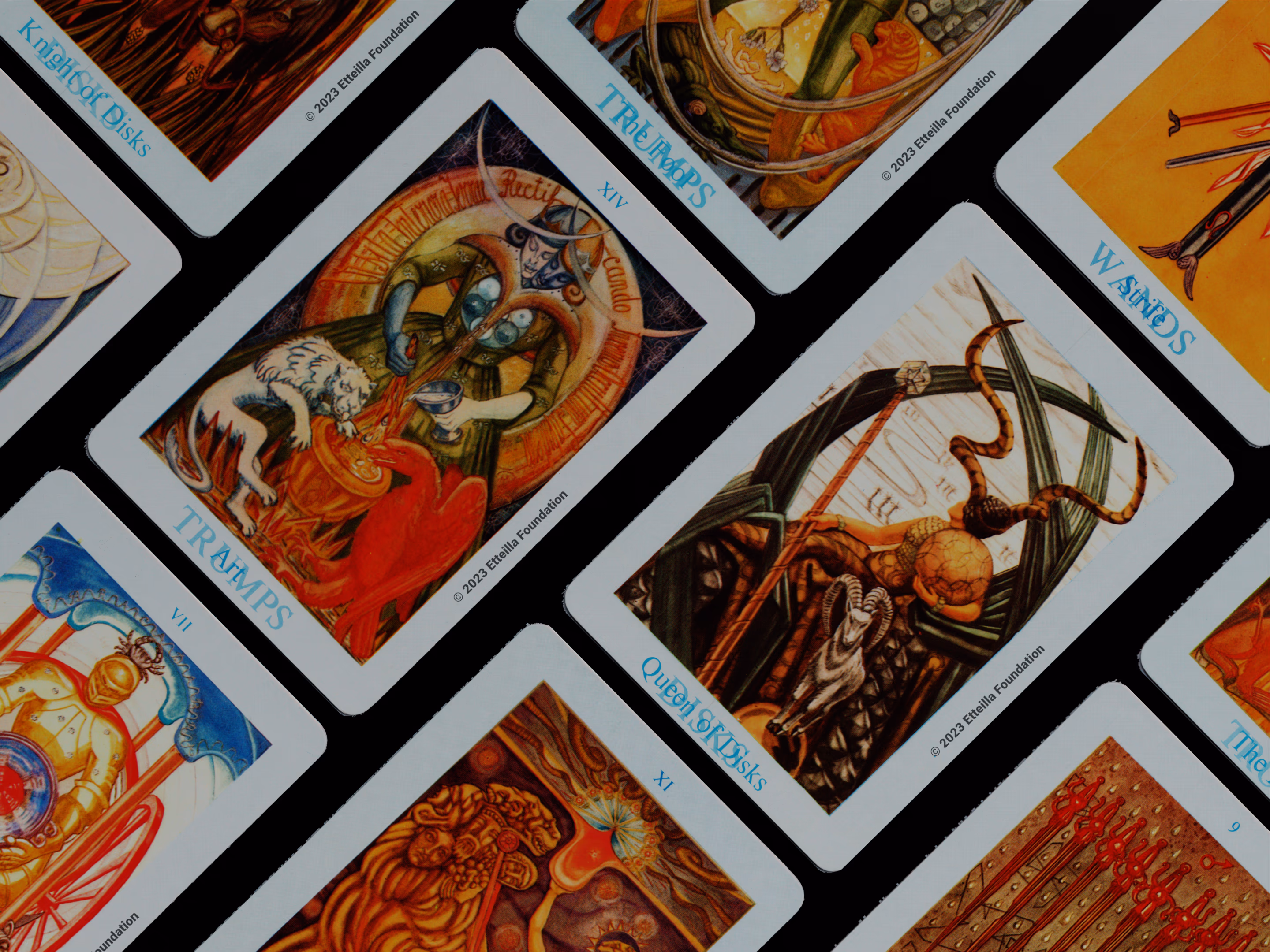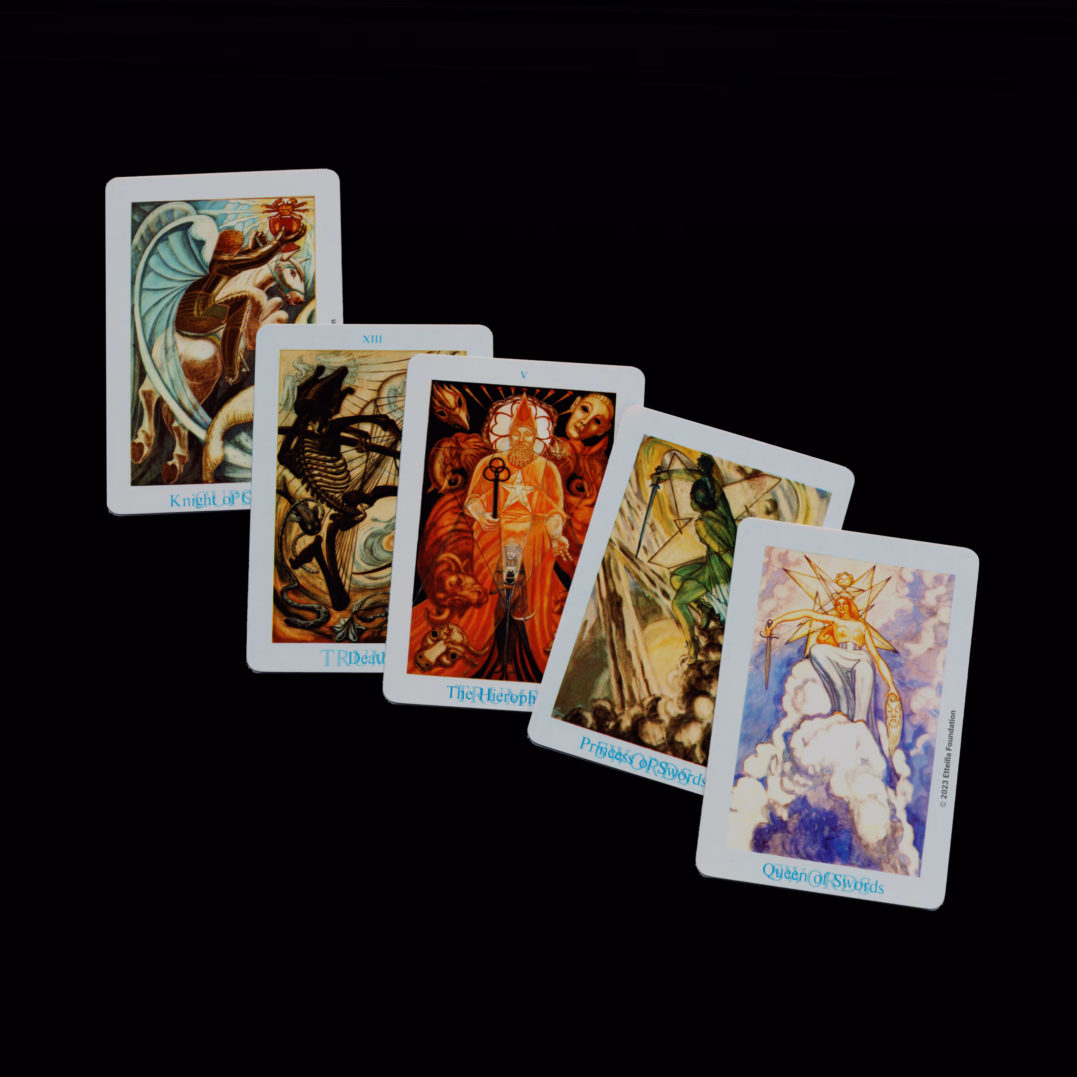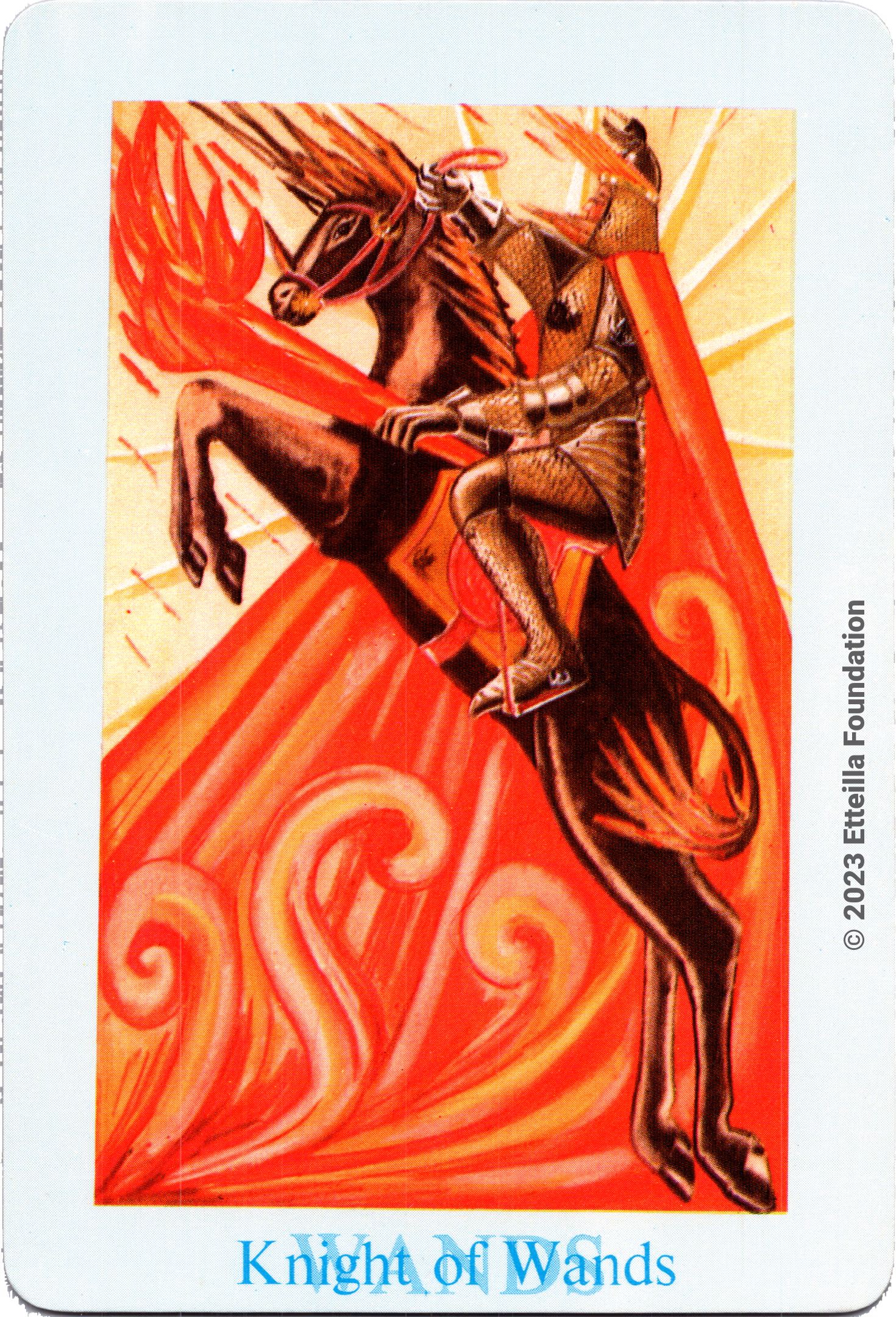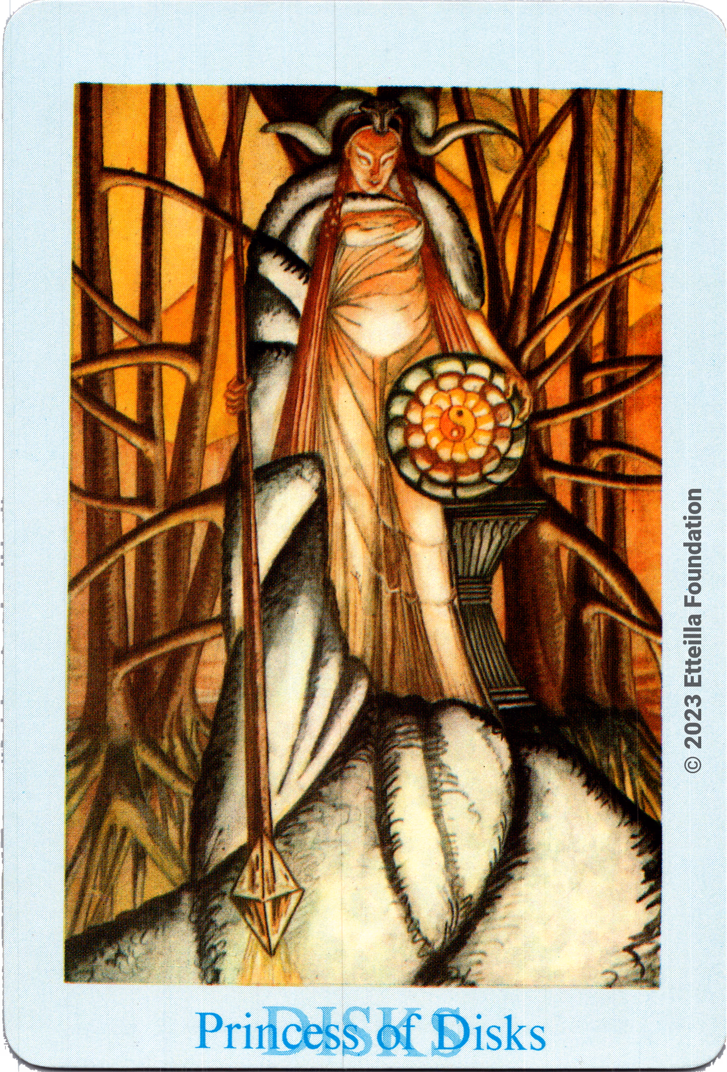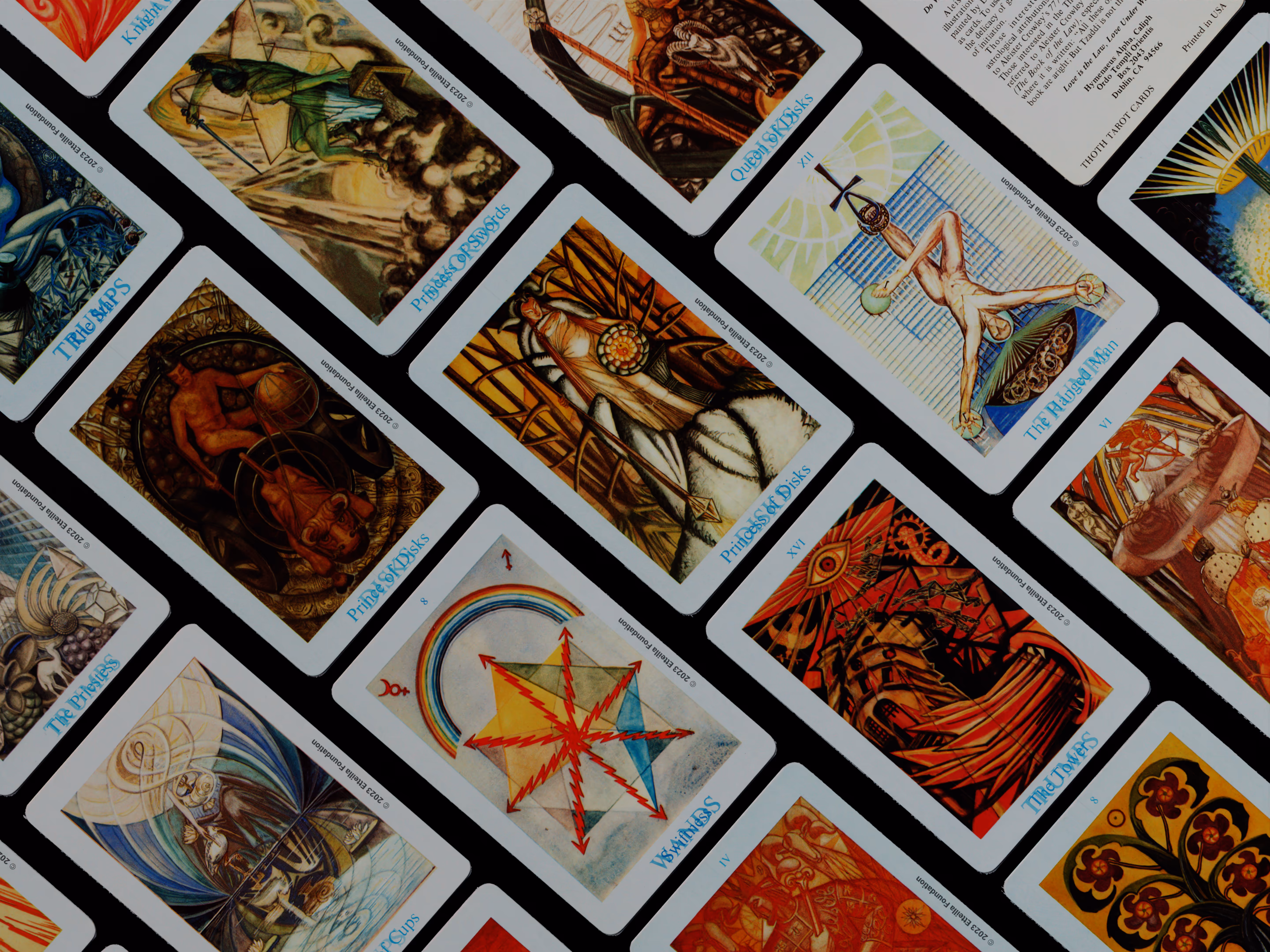 The Thoth Tarot which features very unique card designs and artistic direction is a collaboration between the famous occultist Aleister Crowley who designed the deck, and Lady Frieda Harris who painted the illustrations. This very popular divination tarot created between 1938 and 1943 is notable for having major arcana re-ordered and renamed to allow what Crowley calls the “double zodiac loop” for tarot reading. We note that the suit of disks replace the suit of pentacles found in the Waite-Smith decks and many cards have different names. In particular the Knights replace the Kings, The Knights become the Princes and the Pages are replaced by the Princesses. This version, commonly referred as version B, was published by Weisner instead of Llewellyn and is the first one to introduce the extra Ordo Templi Orientis white playing card.