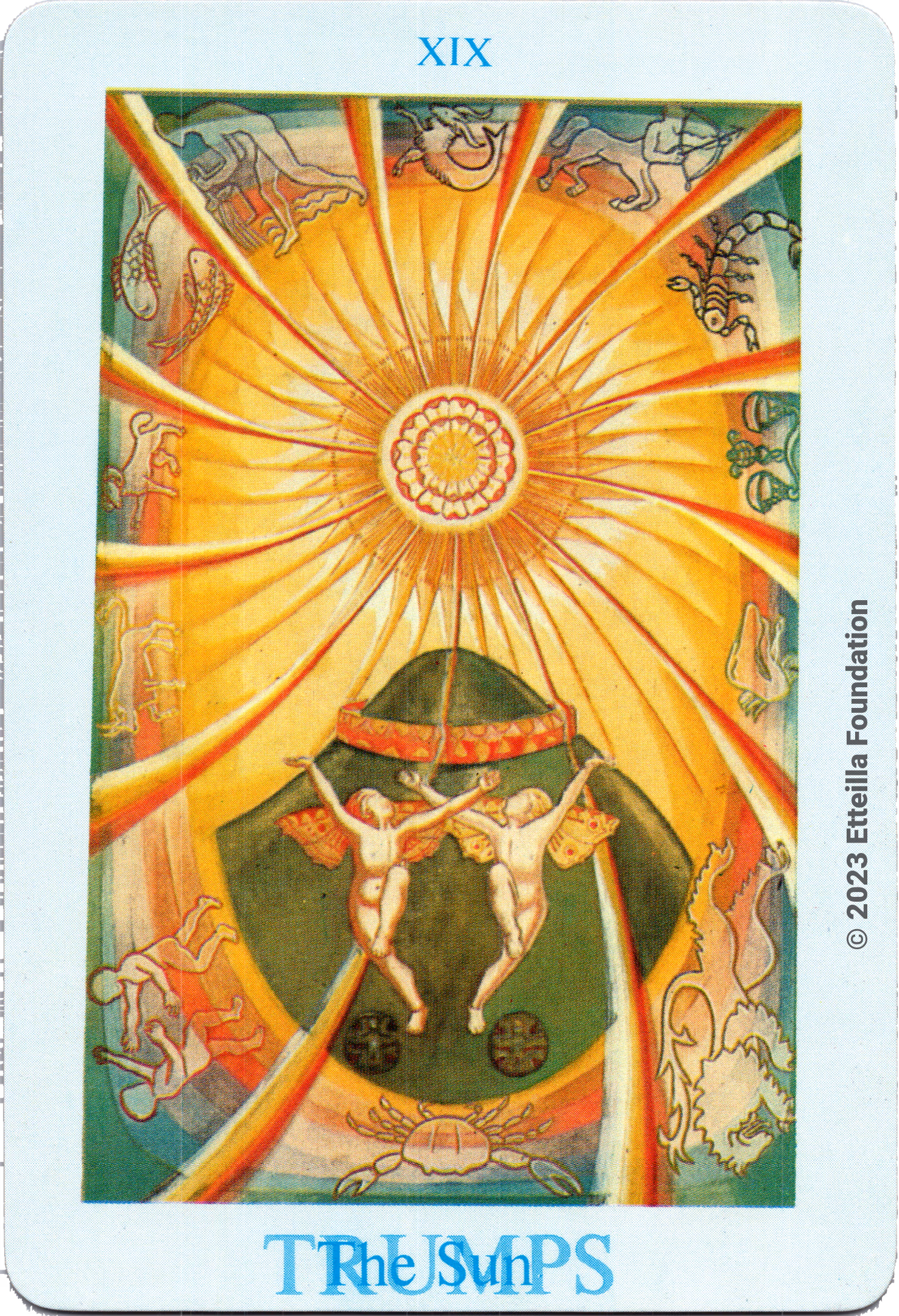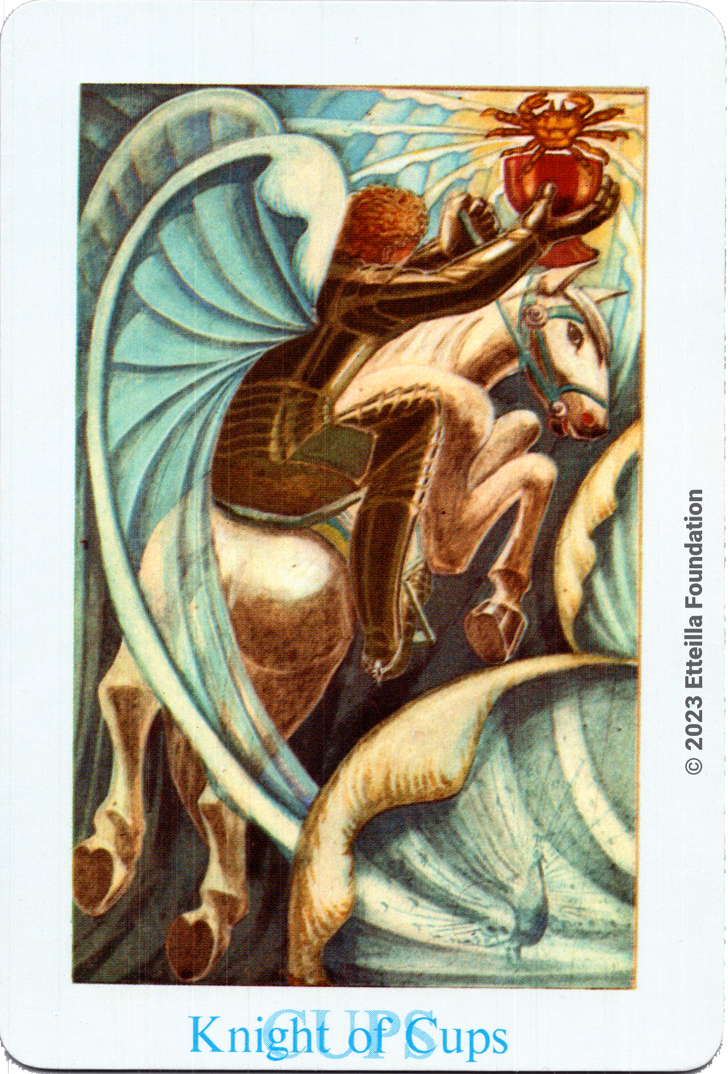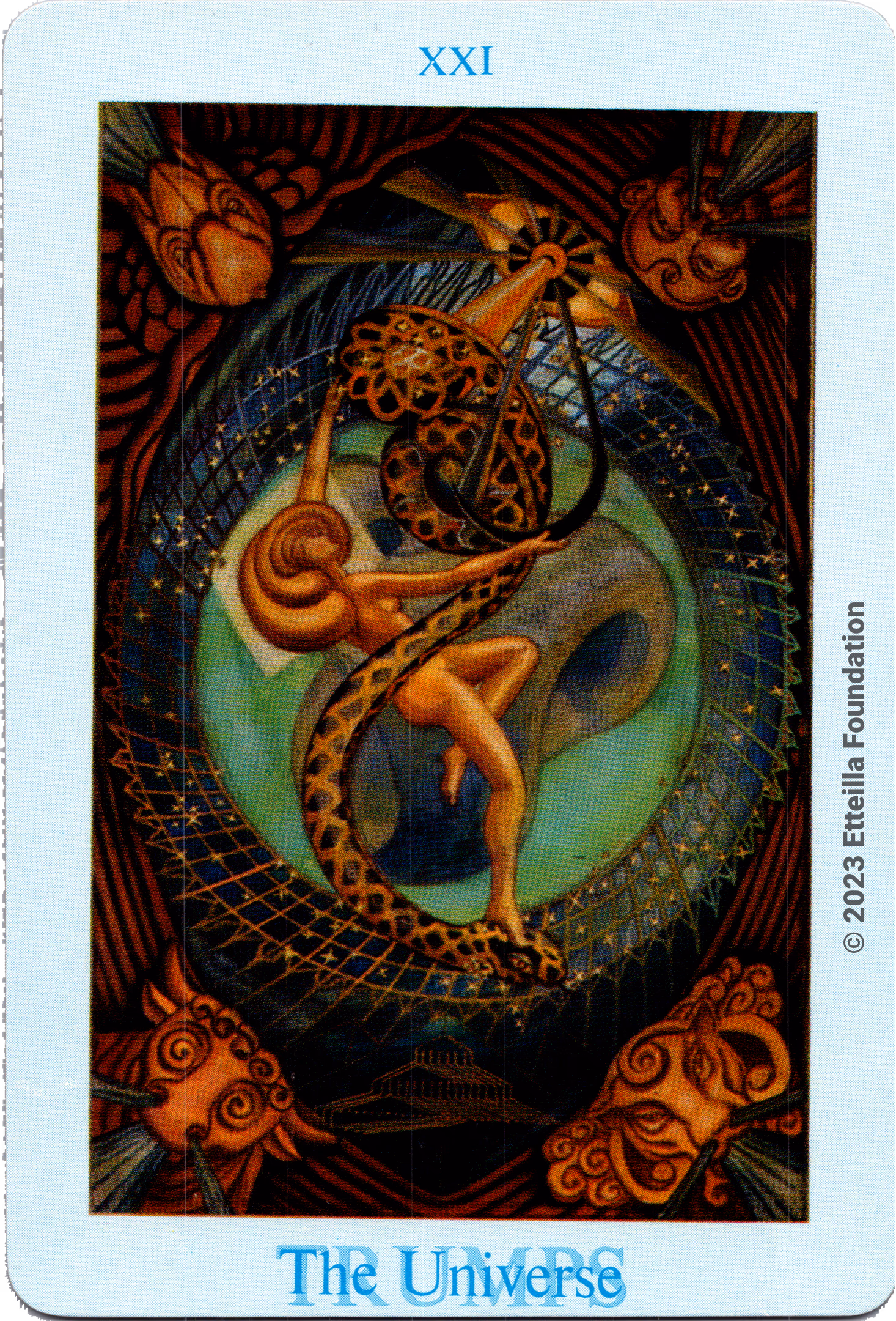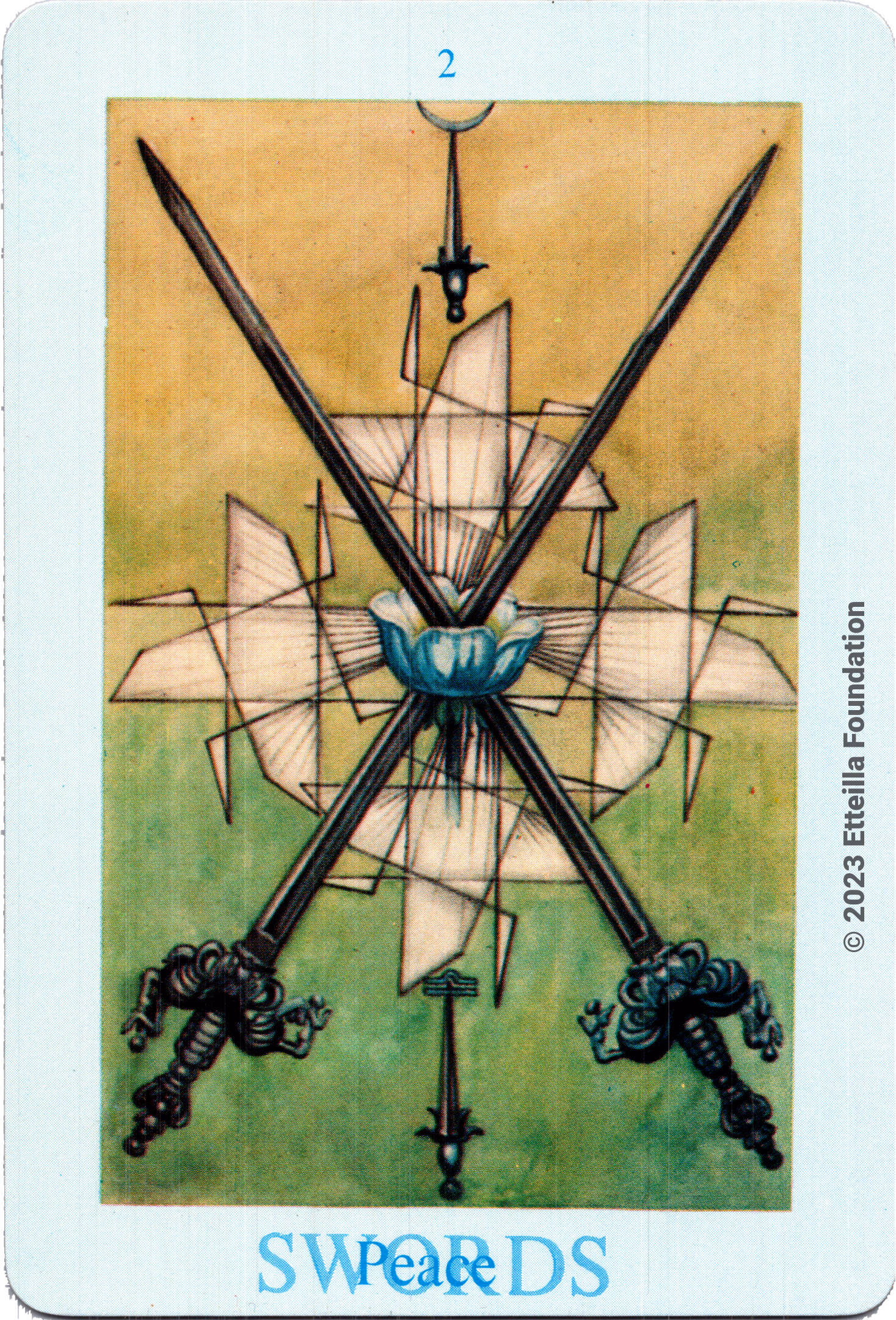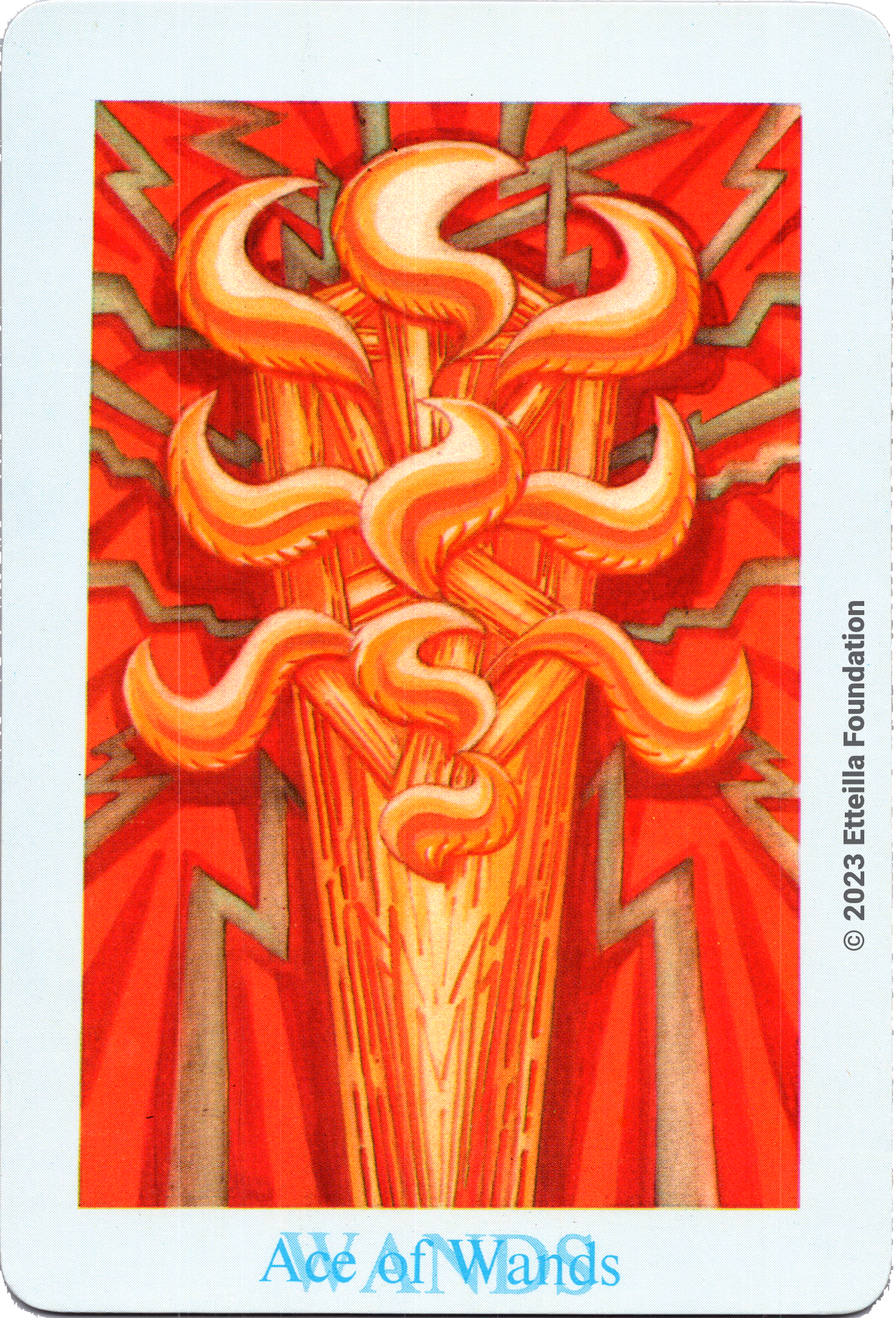 The Thoth Tarot which features very unique card designs and artistic direction is a collaboration between the famous occultist Aleister Crowley who designed the deck, and Lady Frieda Harris who painted the illustrations. This very popular divination tarot created between 1938 and 1943 is notable for having major arcana re-ordered and renamed to allow what Crowley calls the “double zodiac loop” for tarot reading. We note that the suit of disks replace the suit of pentacles found in the Waite-Smith decks and many cards have different names. In particular the Knights replace the Kings, The Knights become the Princes and the Pages are replaced by the Princesses. This version, commonly referred as version B, was published by Weisner instead of Llewellyn and is the first one to introduce the extra Ordo Templi Orientis white playing card.