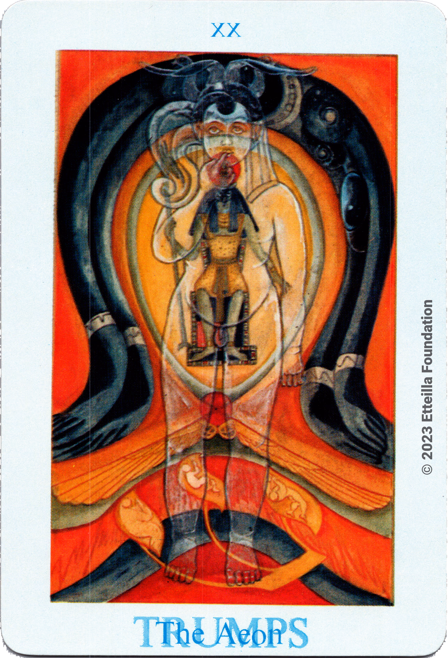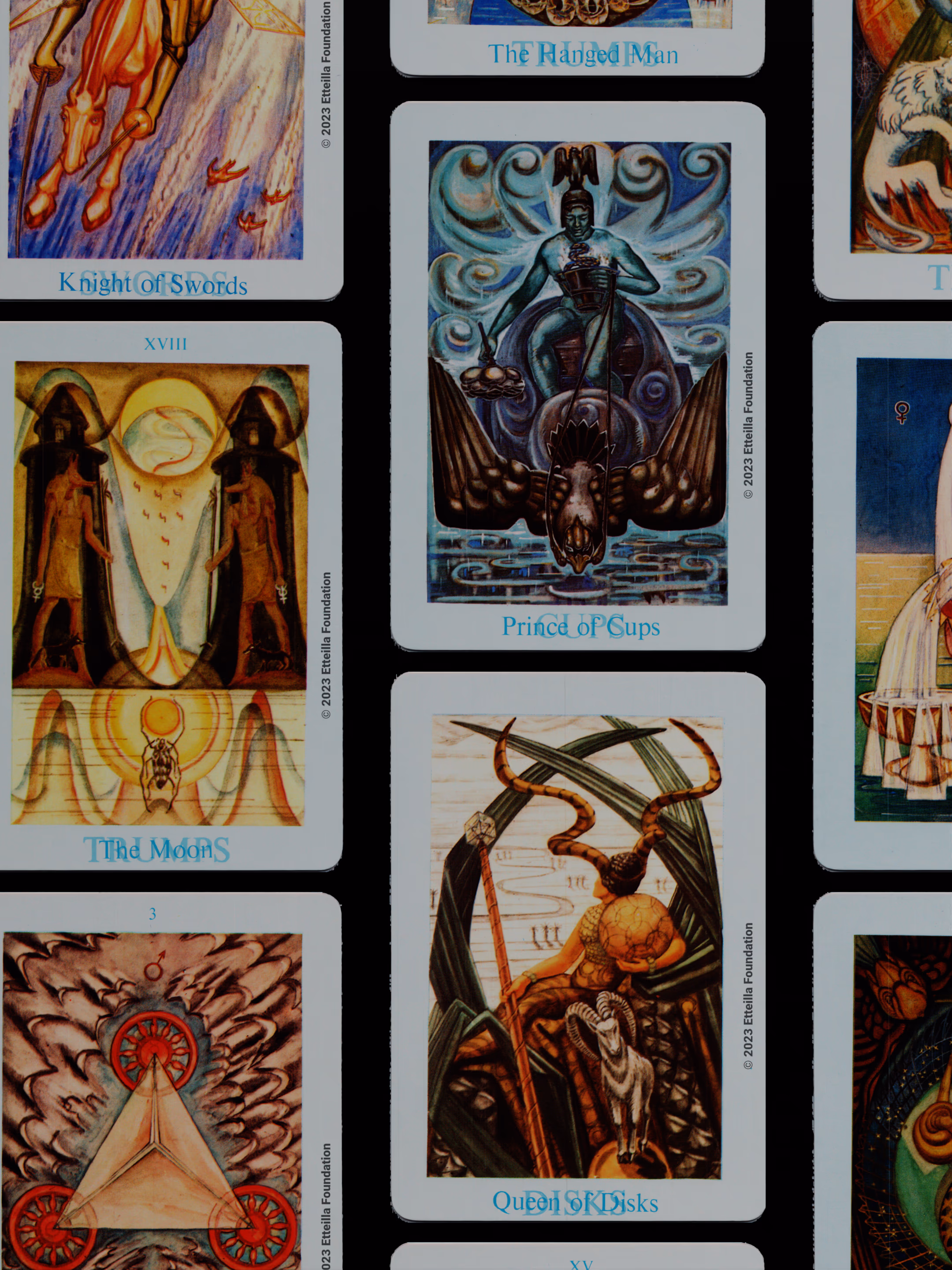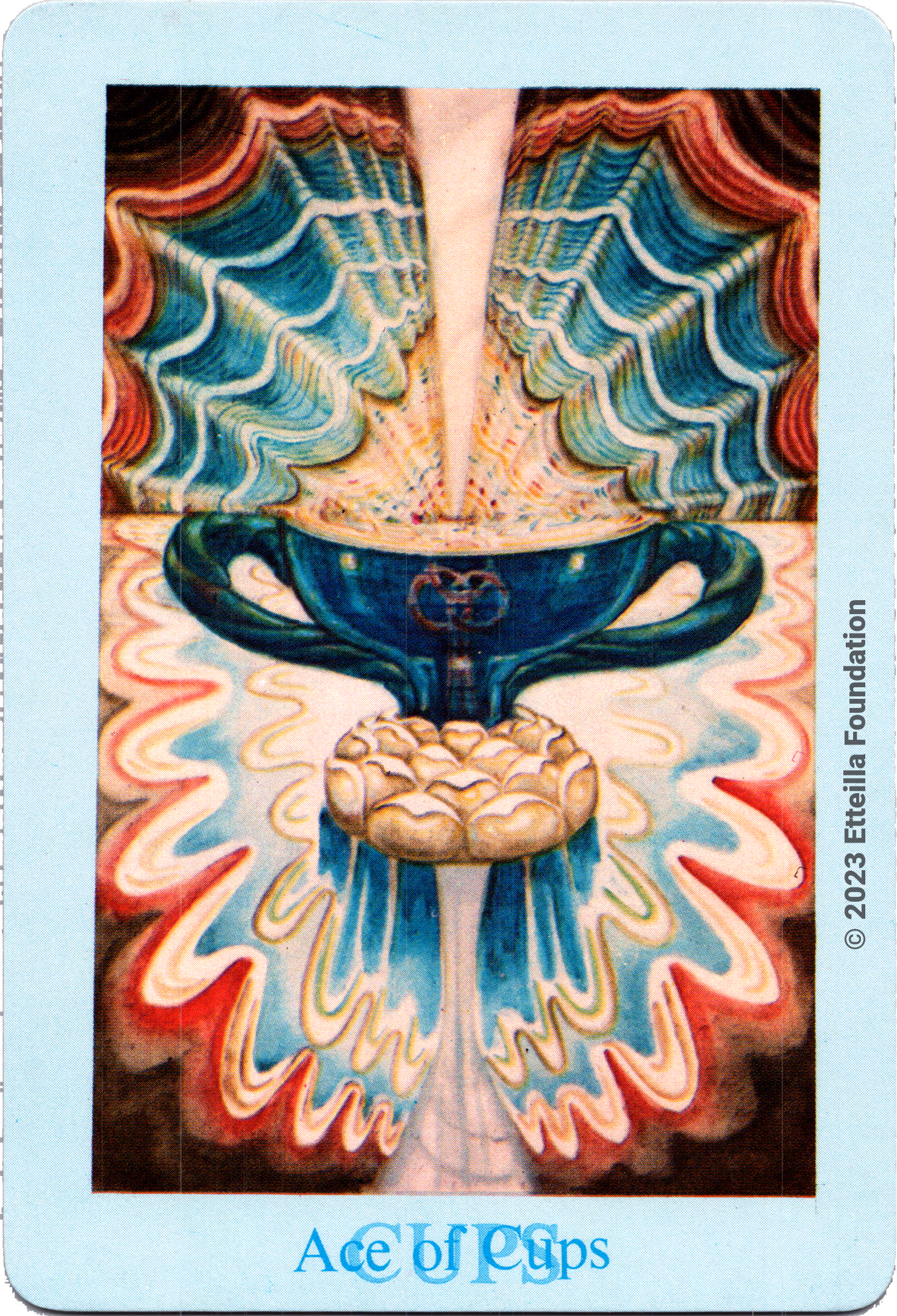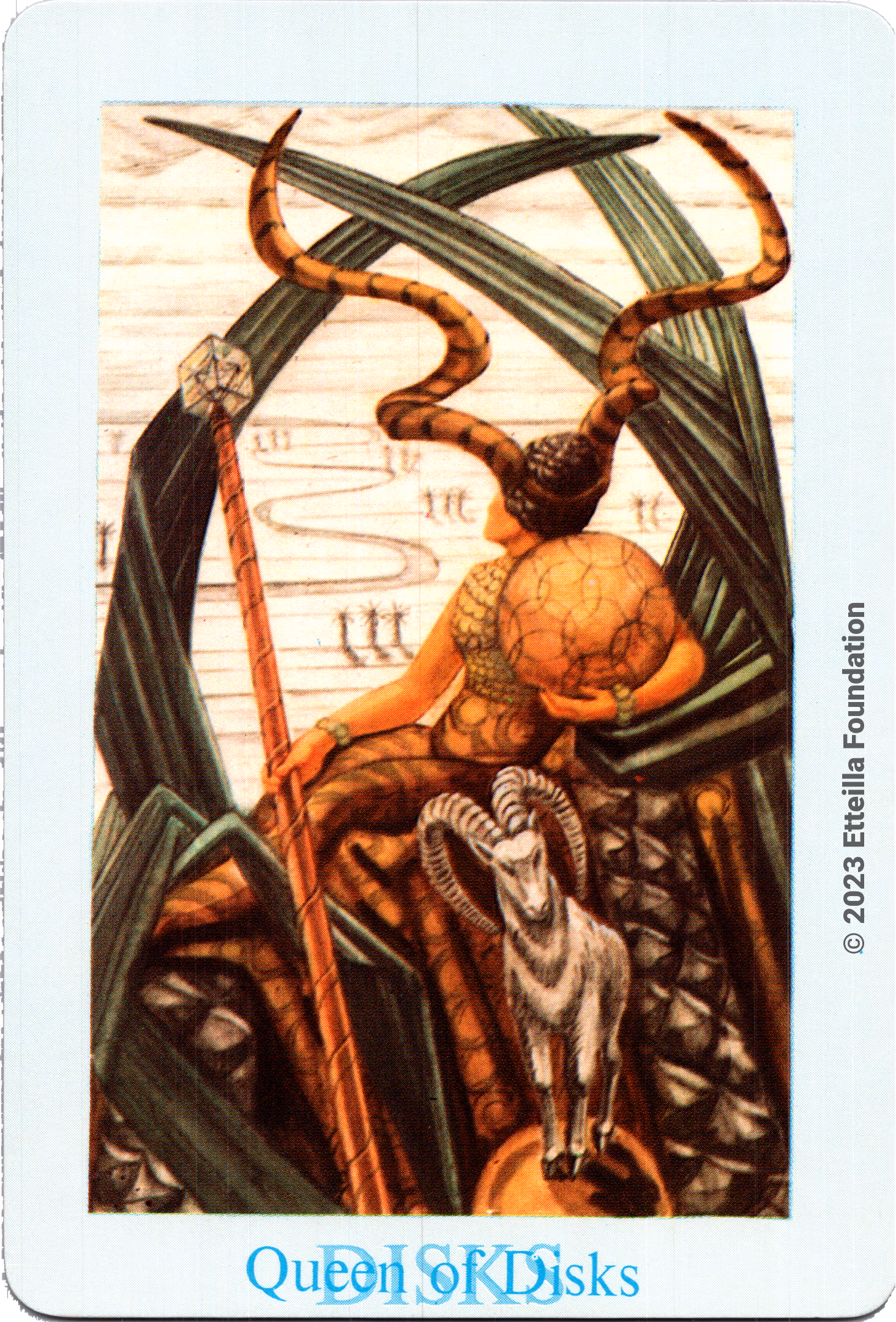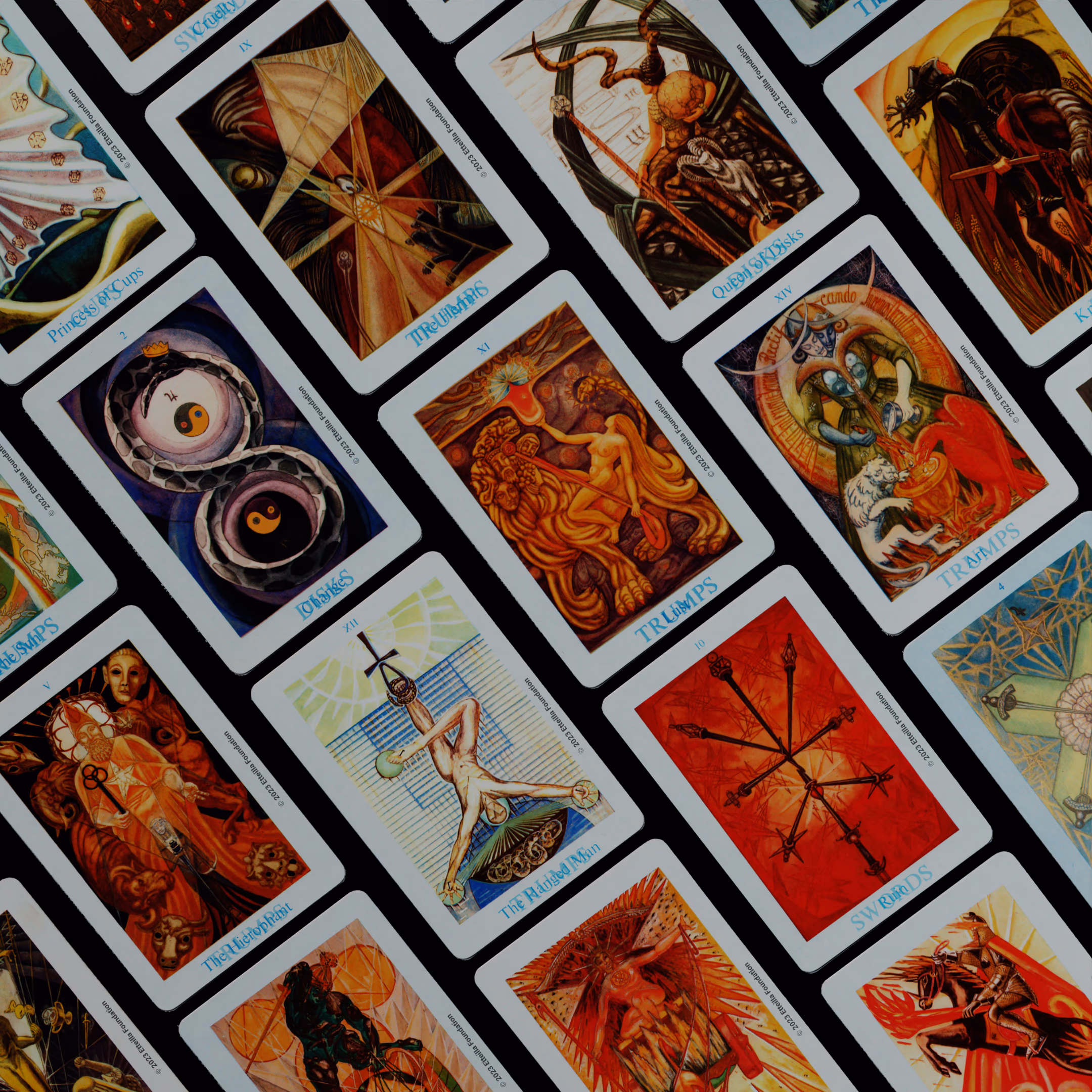The Thoth Tarot which features very unique card designs and artistic direction is a collaboration between the famous occultist Aleister Crowley who designed the deck, and Lady Frieda Harris who painted the illustrations. This very popular divination tarot created between 1938 and 1943 is notable for having major arcana re-ordered and renamed to allow what Crowley calls the “double zodiac loop” for tarot reading. We note that the suit of disks replace the suit of pentacles found in the Waite-Smith decks and many cards have different names. In particular the Knights replace the Kings, The Knights become the Princes and the Pages are replaced by the Princesses. This version, commonly referred as version B, was published by Weisner instead of Llewellyn and is the first one to introduce the extra Ordo Templi Orientis white playing card.