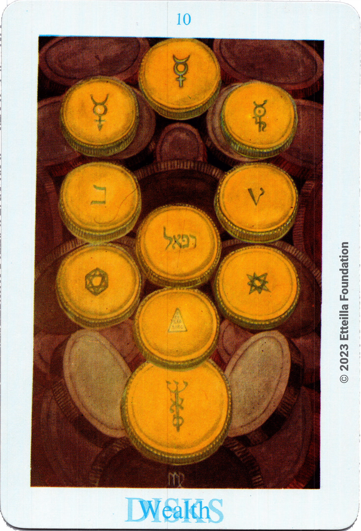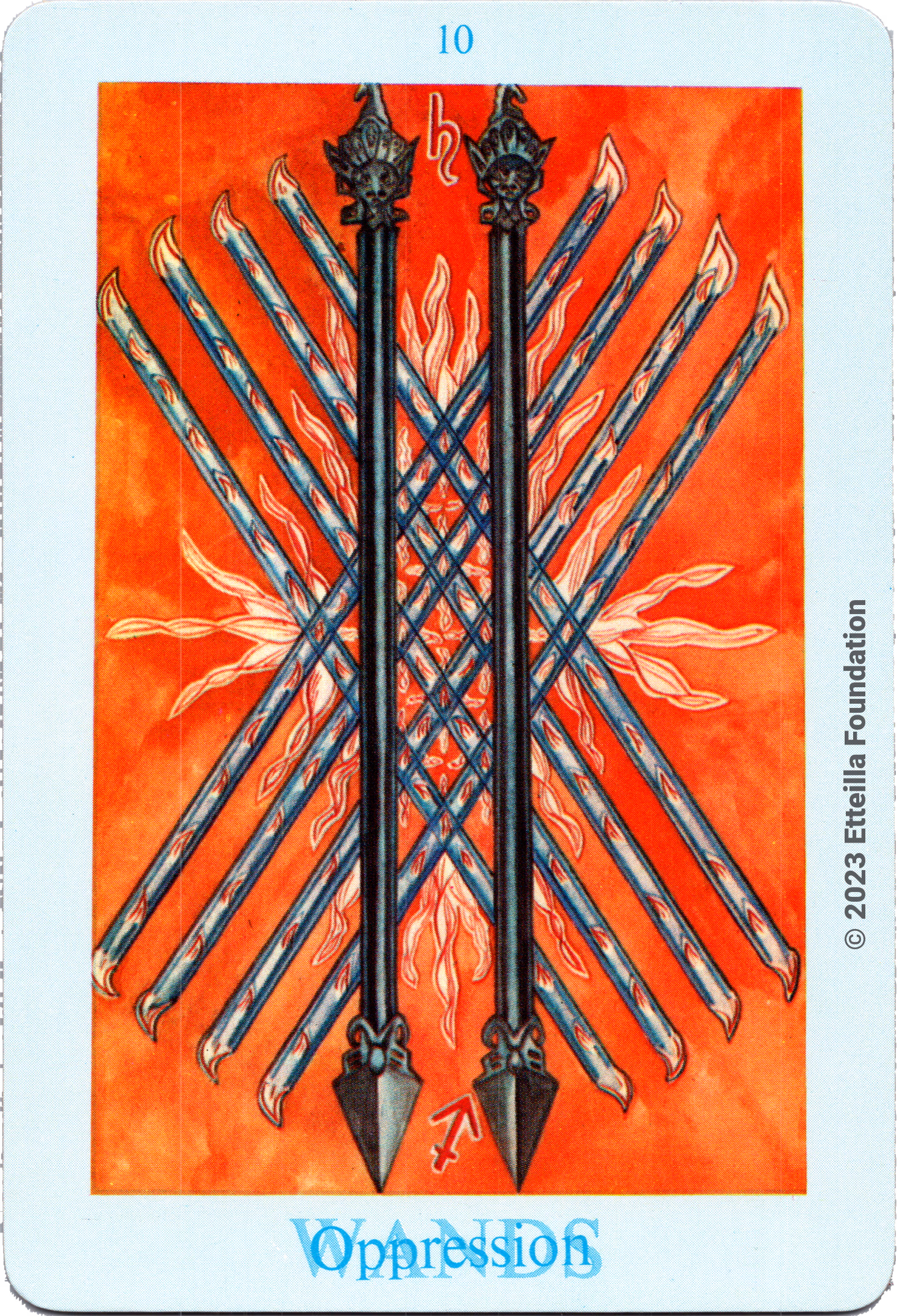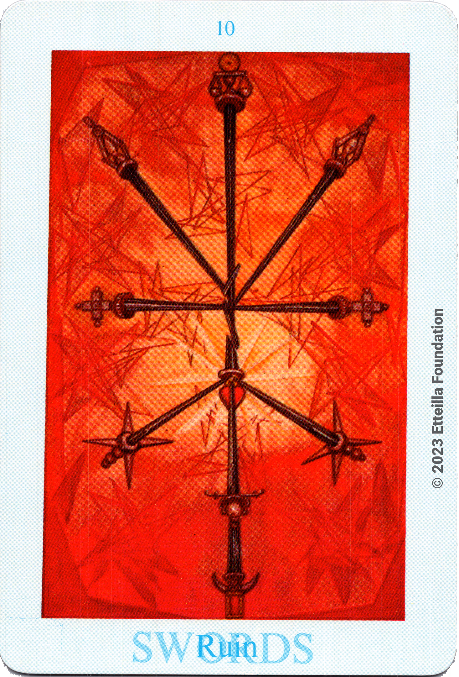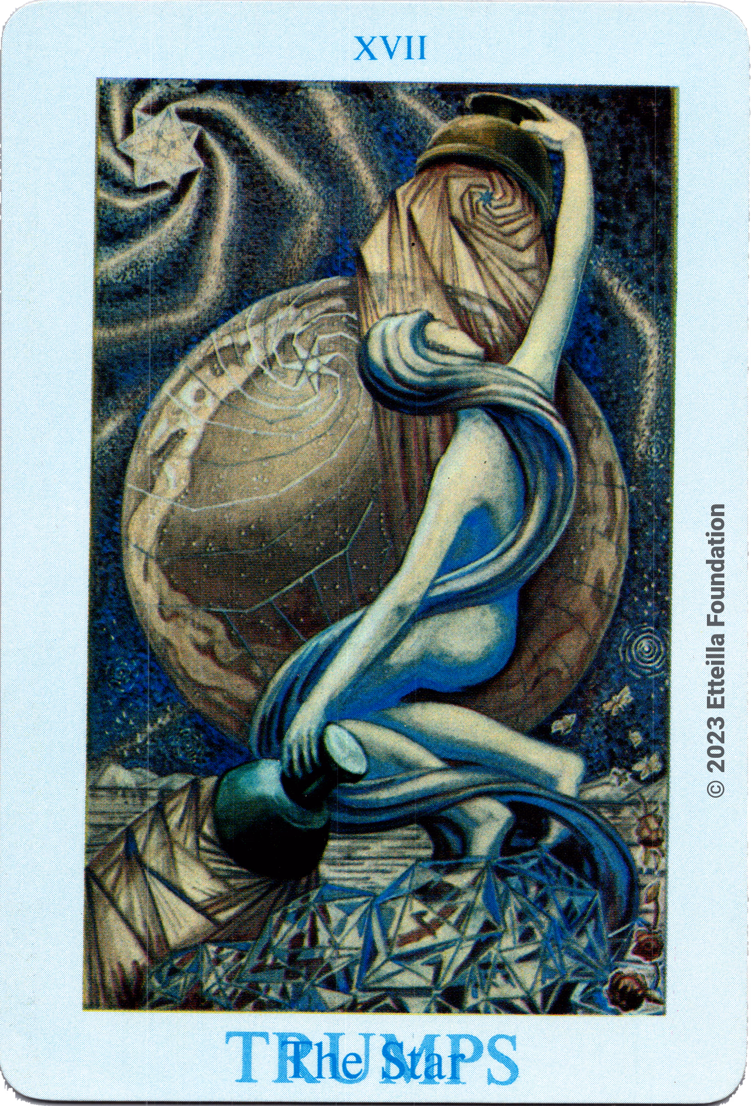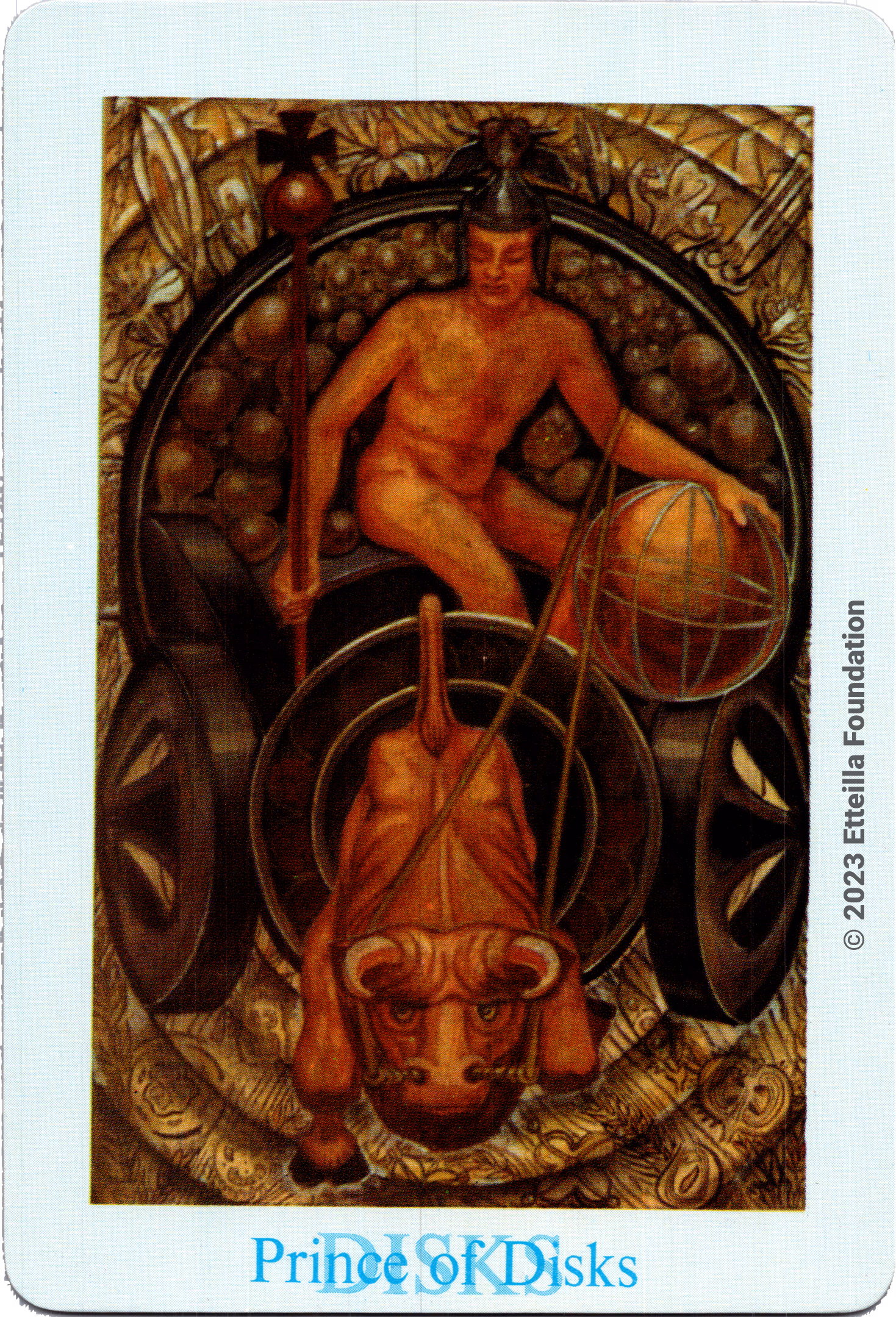 The Thoth Tarot which features very unique card designs and artistic direction is a collaboration between the famous occultist Aleister Crowley who designed the deck, and Lady Frieda Harris who painted the illustrations. This very popular divination tarot created between 1938 and 1943 is notable for having major arcana re-ordered and renamed to allow what Crowley calls the “double zodiac loop” for tarot reading. We note that the suit of disks replace the suit of pentacles found in the Waite-Smith decks and many cards have different names. In particular the Knights replace the Kings, The Knights become the Princes and the Pages are replaced by the Princesses. This version, commonly referred as version B, was published by Weisner instead of Llewellyn and is the first one to introduce the extra Ordo Templi Orientis white playing card.