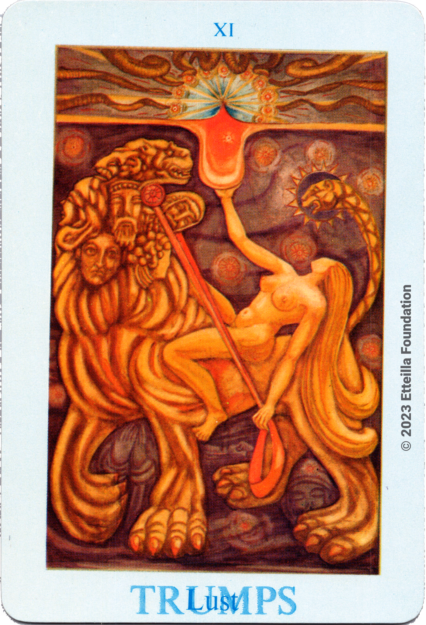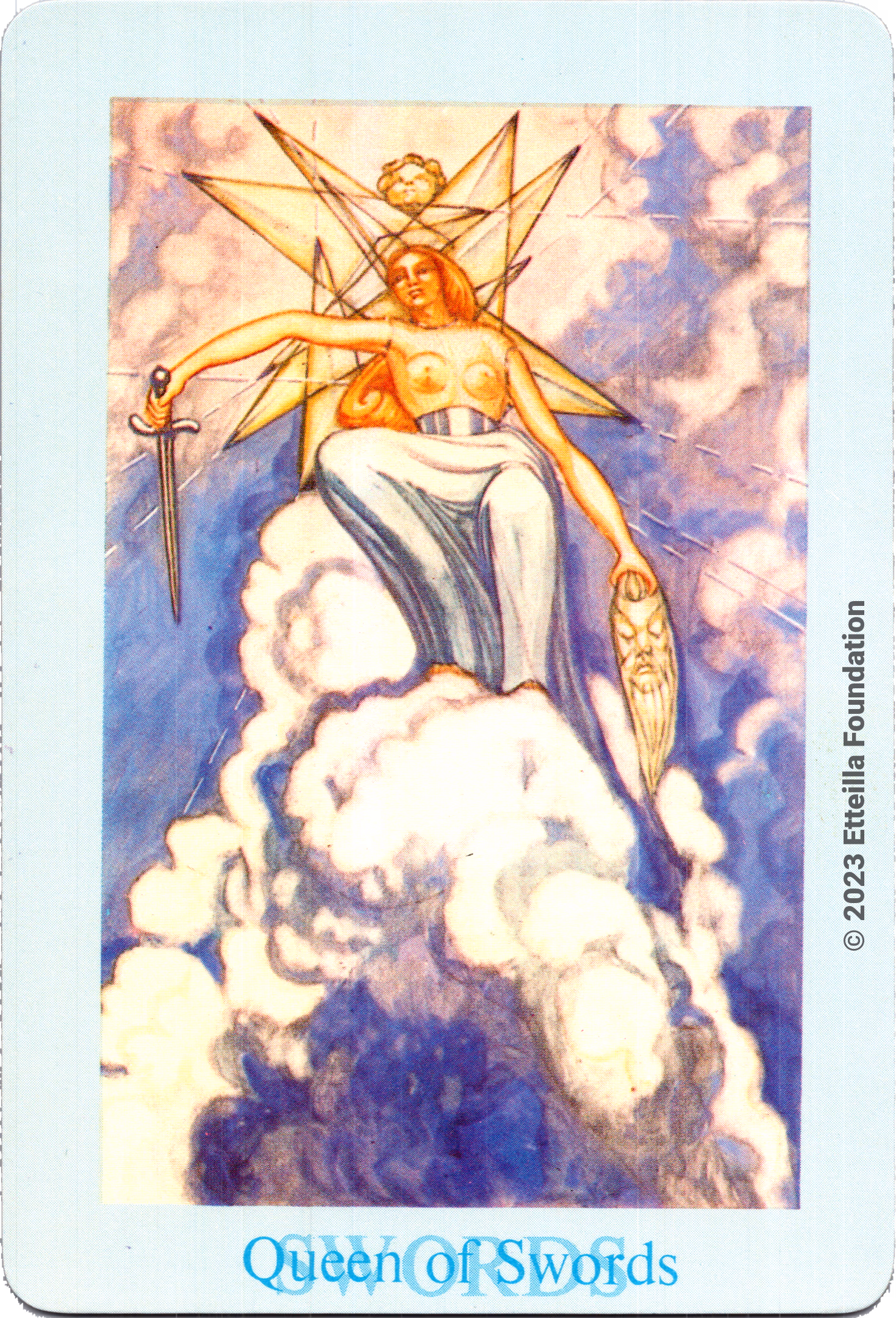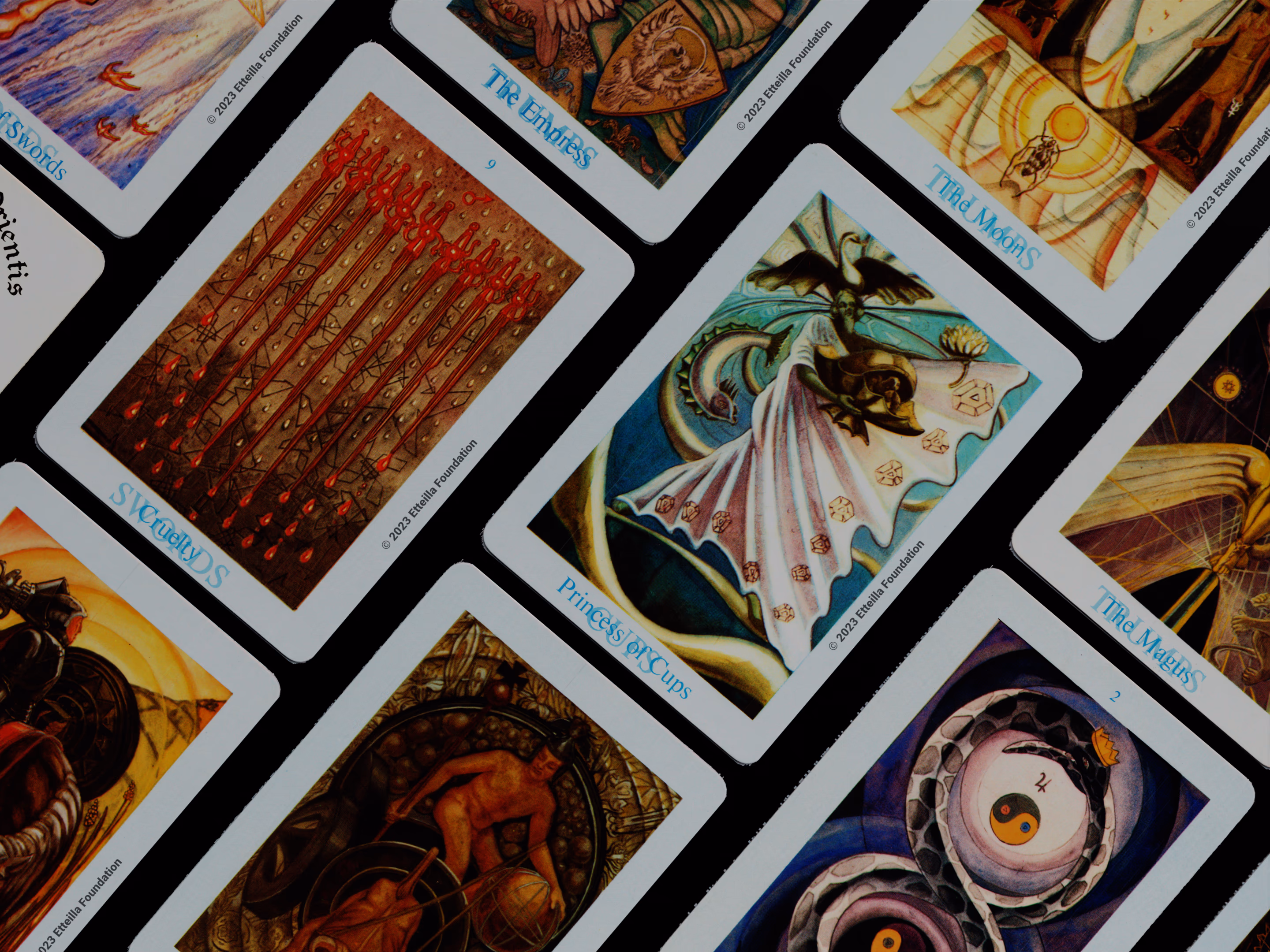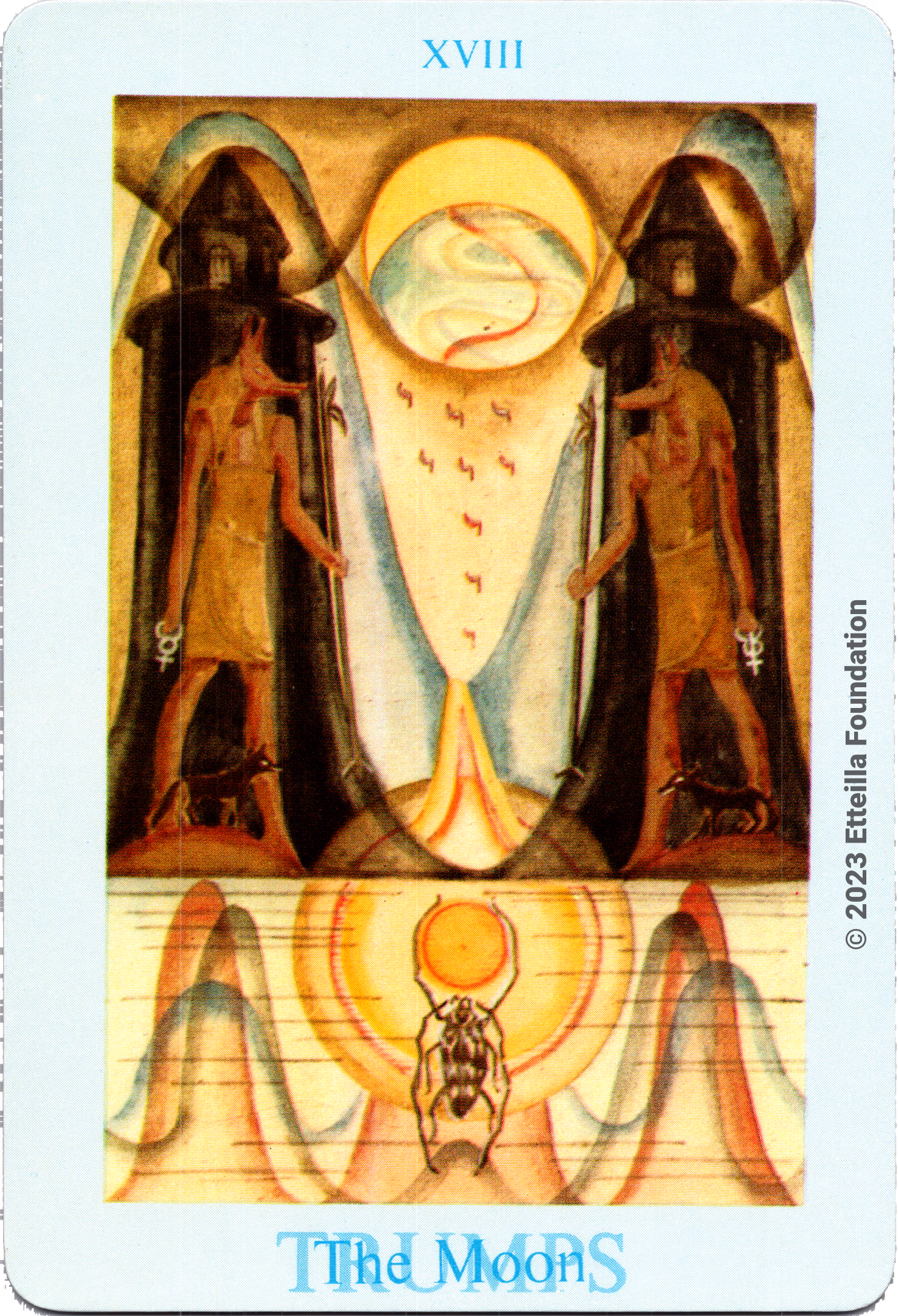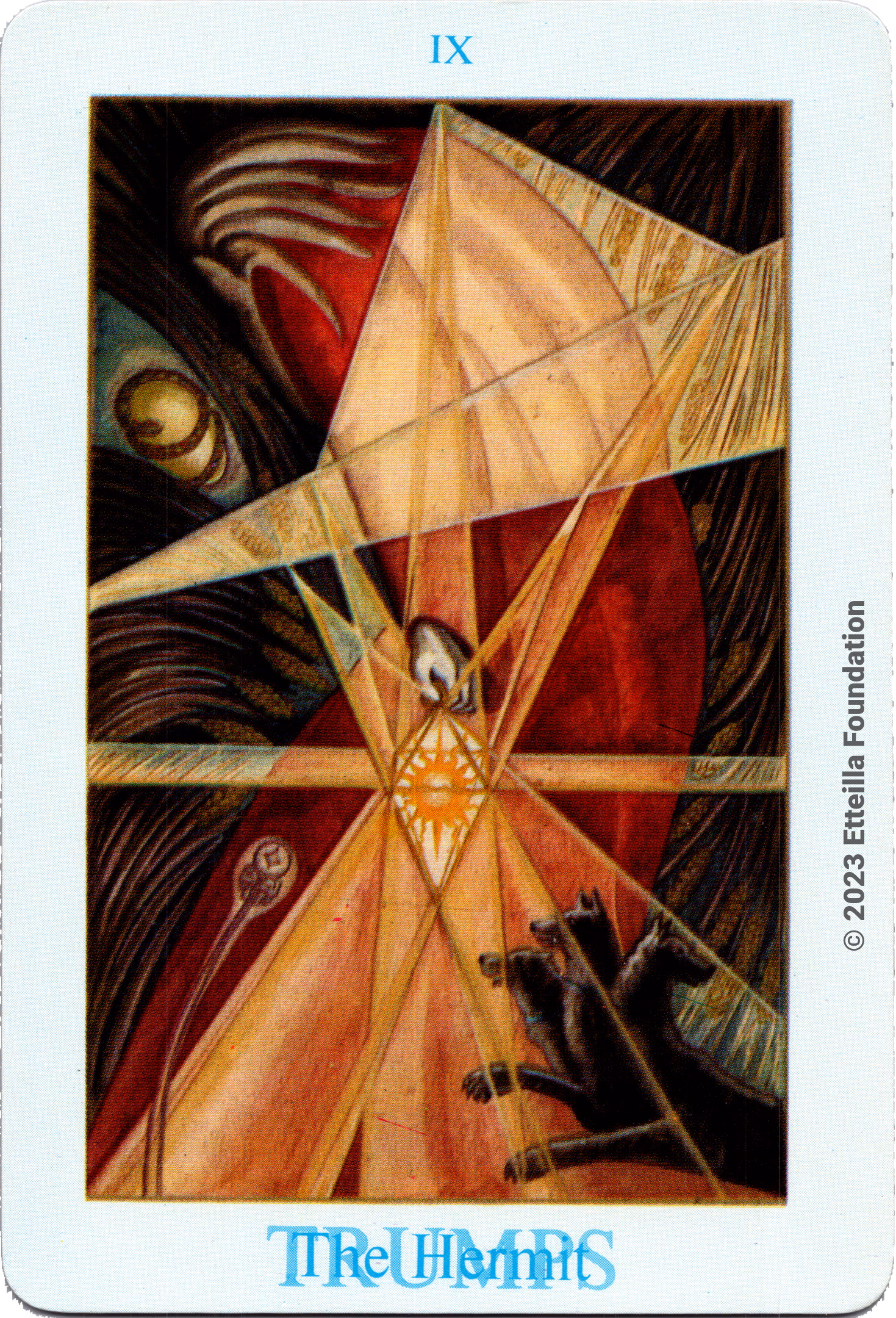 The Thoth Tarot which features very unique card designs and artistic direction is a collaboration between the famous occultist Aleister Crowley who designed the deck, and Lady Frieda Harris who painted the illustrations. This very popular divination tarot created between 1938 and 1943 is notable for having major arcana re-ordered and renamed to allow what Crowley calls the “double zodiac loop” for tarot reading. We note that the suit of disks replace the suit of pentacles found in the Waite-Smith decks and many cards have different names. In particular the Knights replace the Kings, The Knights become the Princes and the Pages are replaced by the Princesses. This version, commonly referred as version B, was published by Weisner instead of Llewellyn and is the first one to introduce the extra Ordo Templi Orientis white playing card.