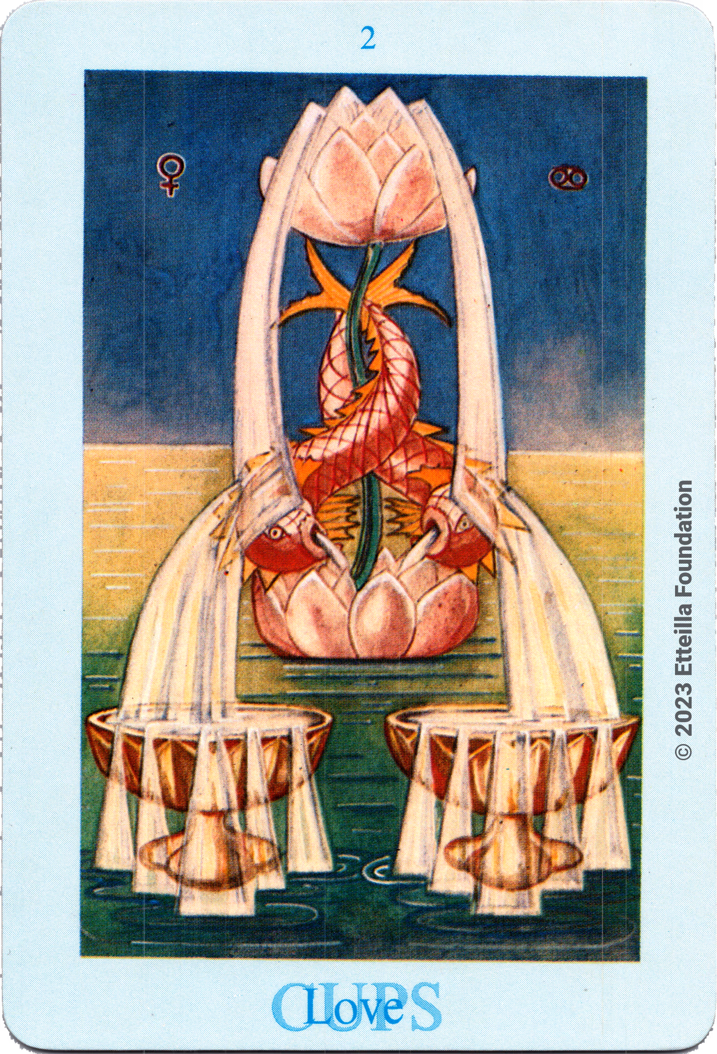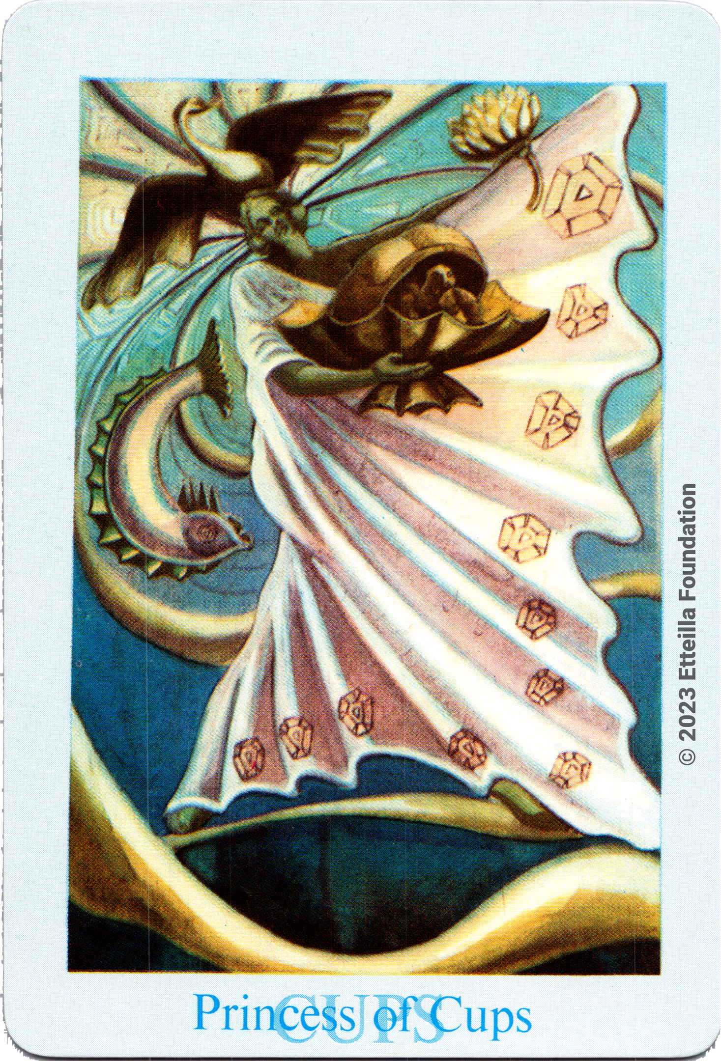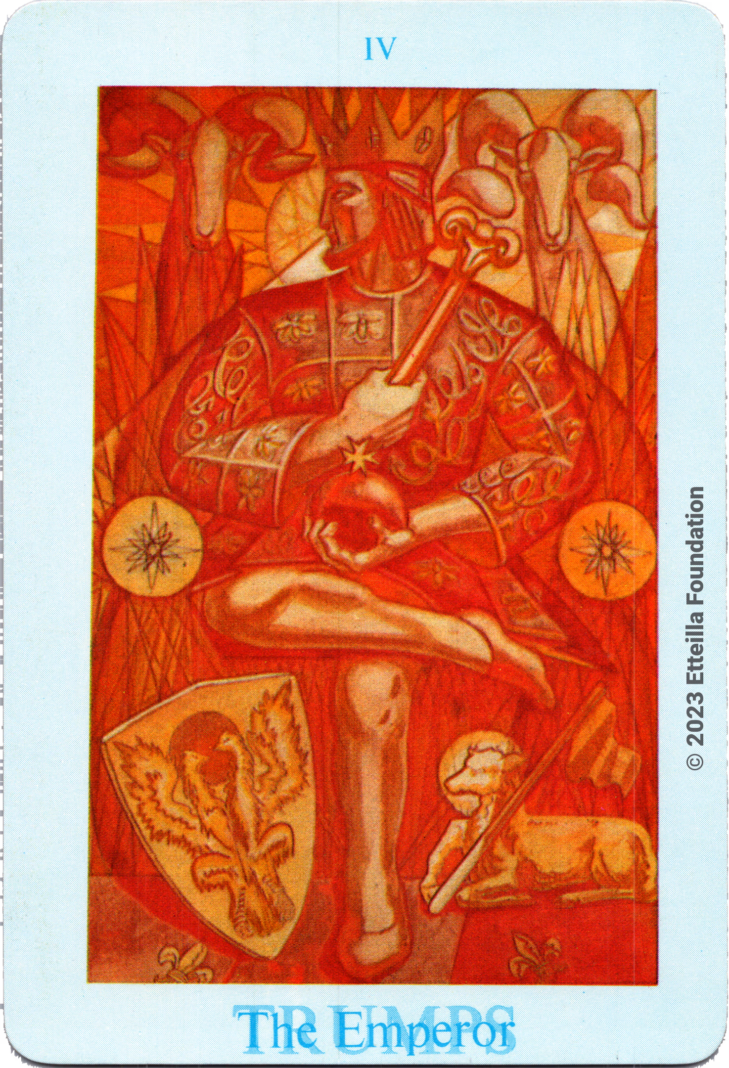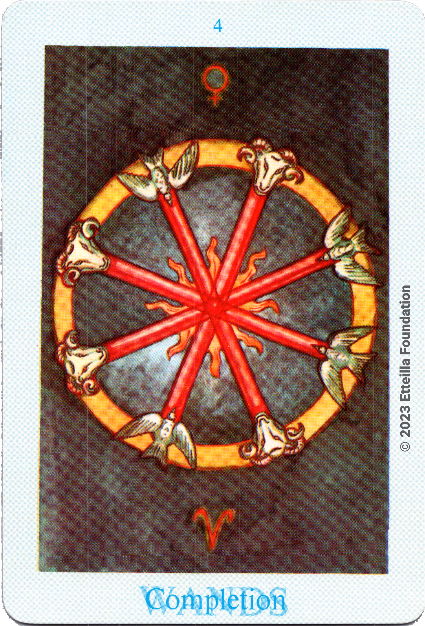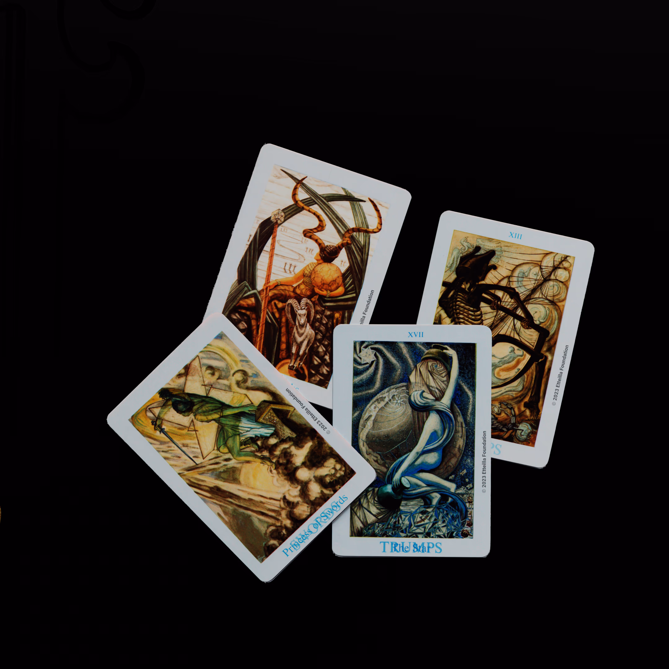 The Thoth Tarot which features very unique card designs and artistic direction is a collaboration between the famous occultist Aleister Crowley who designed the deck, and Lady Frieda Harris who painted the illustrations. This very popular divination tarot created between 1938 and 1943 is notable for having major arcana re-ordered and renamed to allow what Crowley calls the “double zodiac loop” for tarot reading. We note that the suit of disks replace the suit of pentacles found in the Waite-Smith decks and many cards have different names. In particular the Knights replace the Kings, The Knights become the Princes and the Pages are replaced by the Princesses. This version, commonly referred as version B, was published by Weisner instead of Llewellyn and is the first one to introduce the extra Ordo Templi Orientis white playing card.