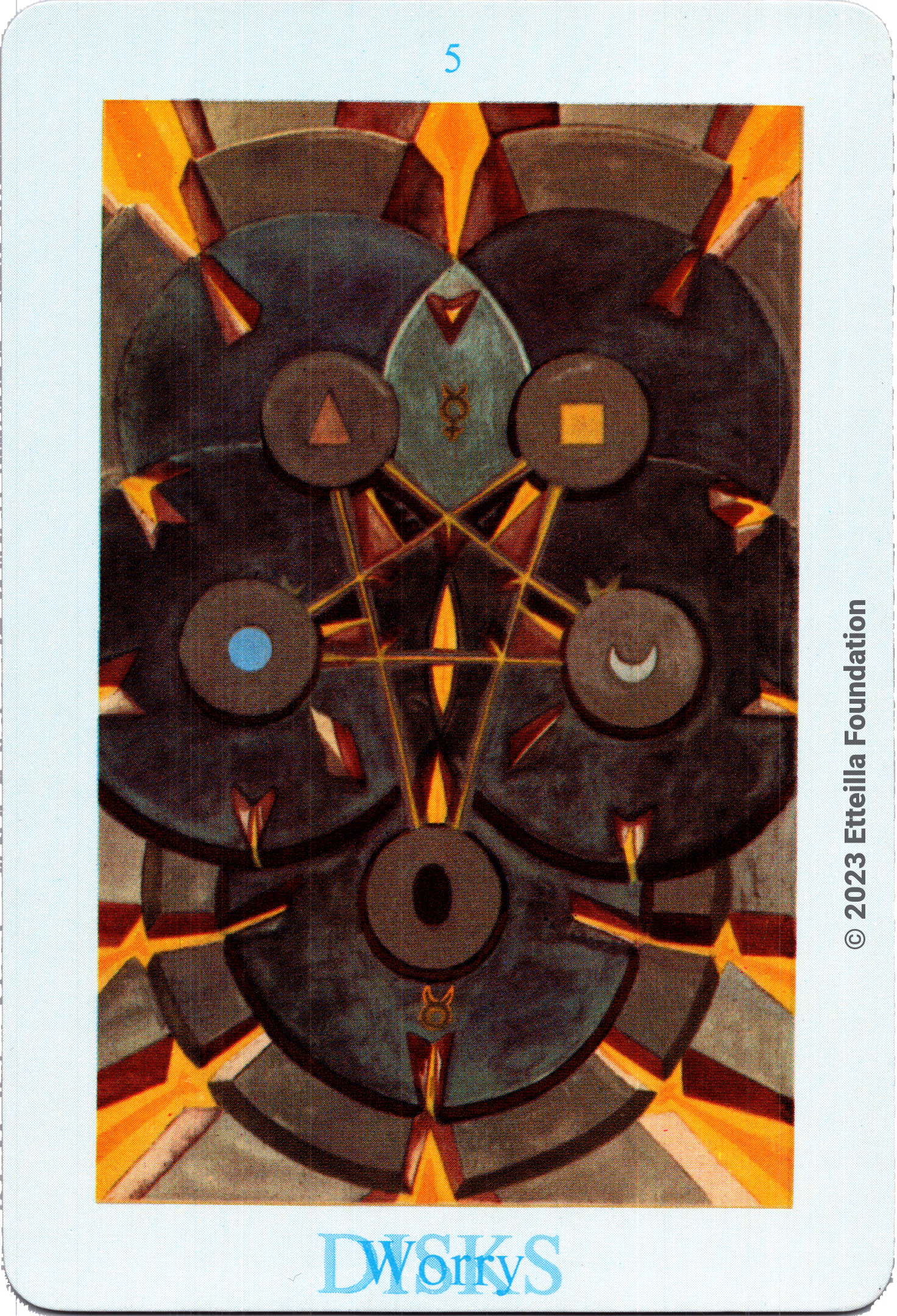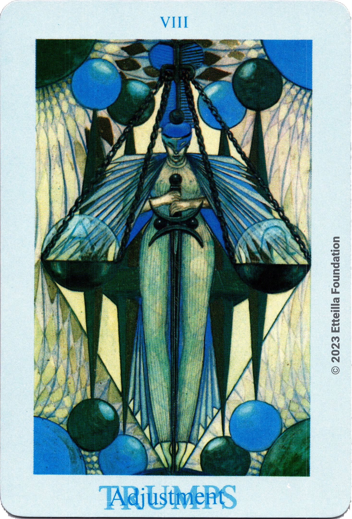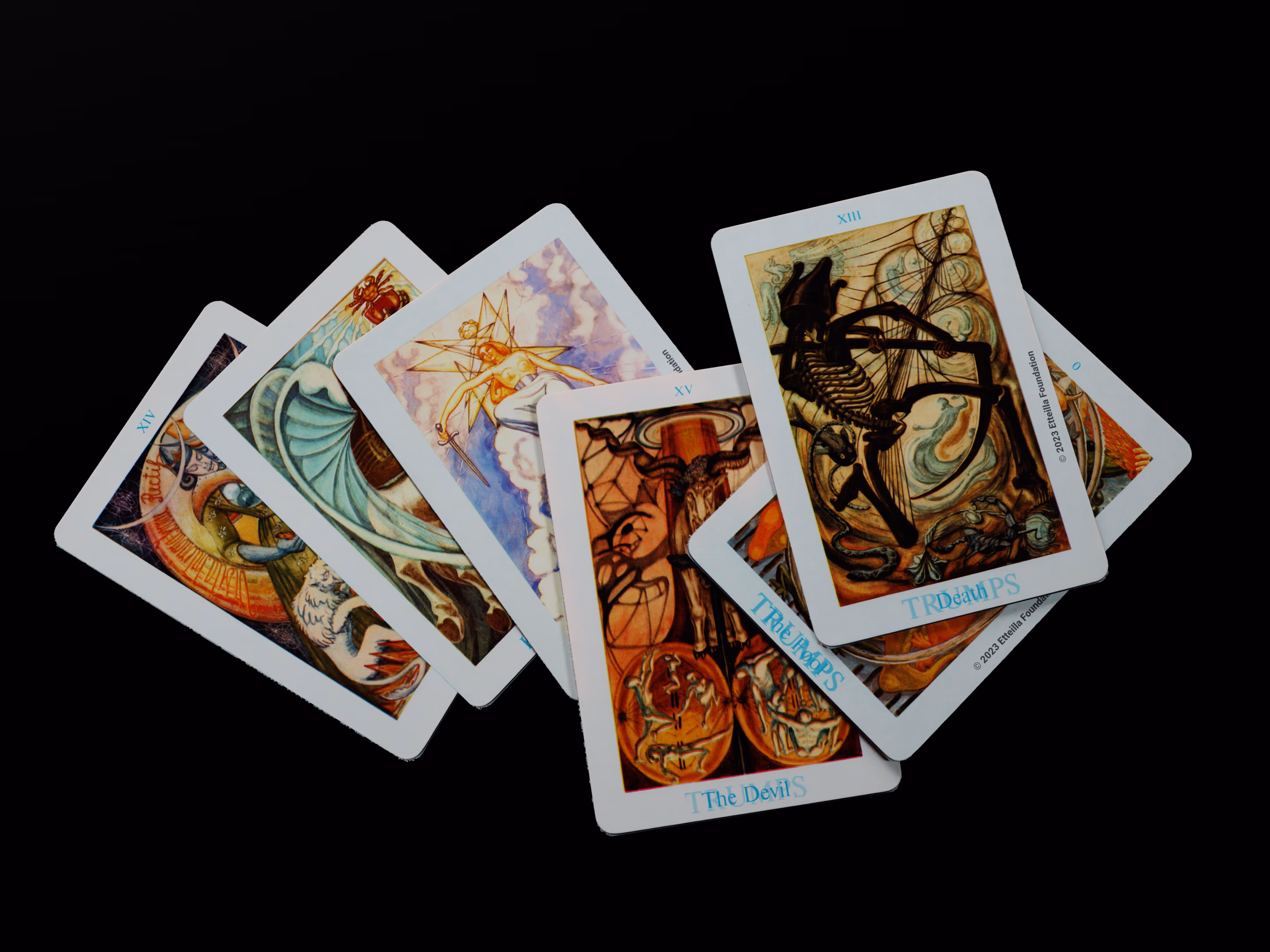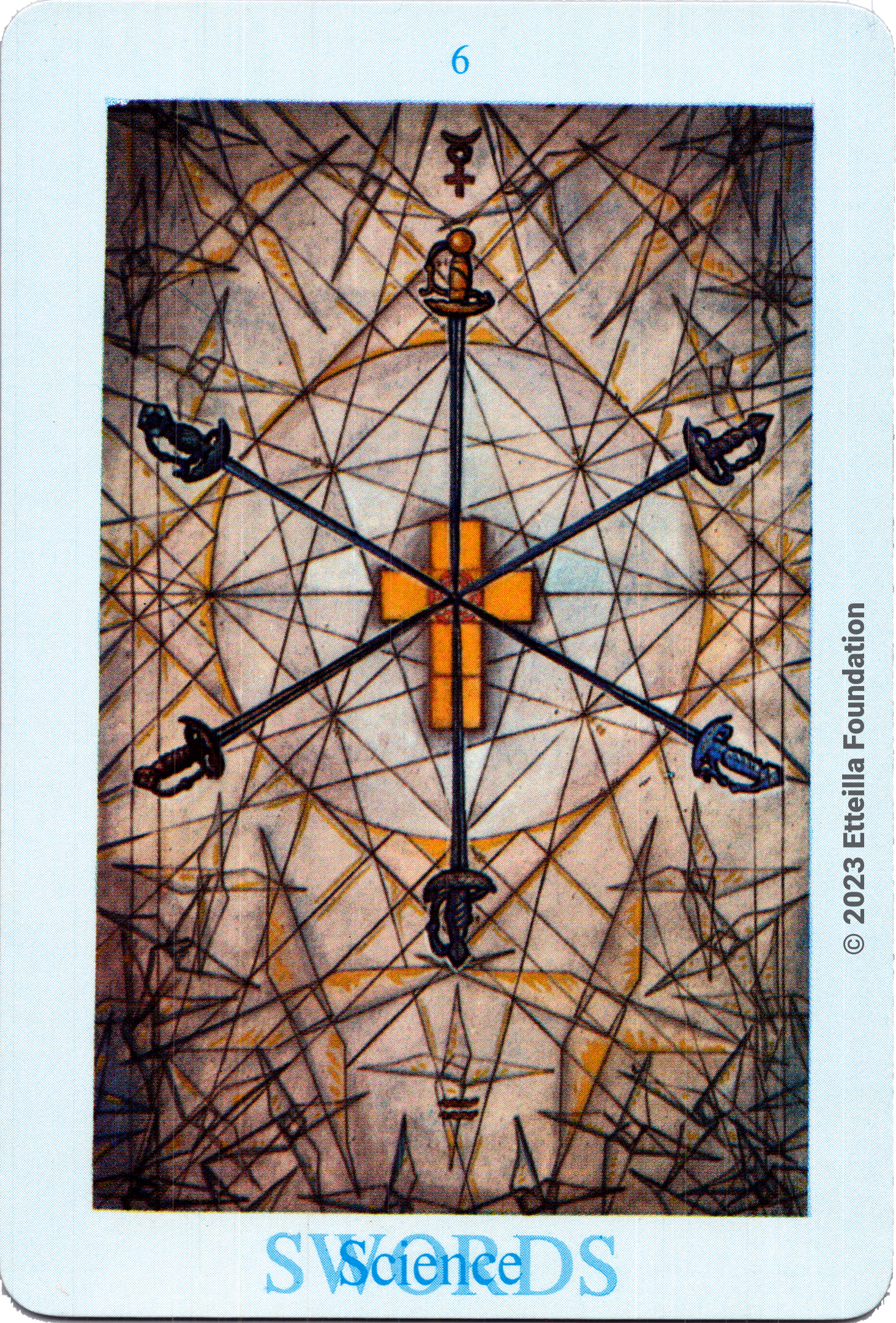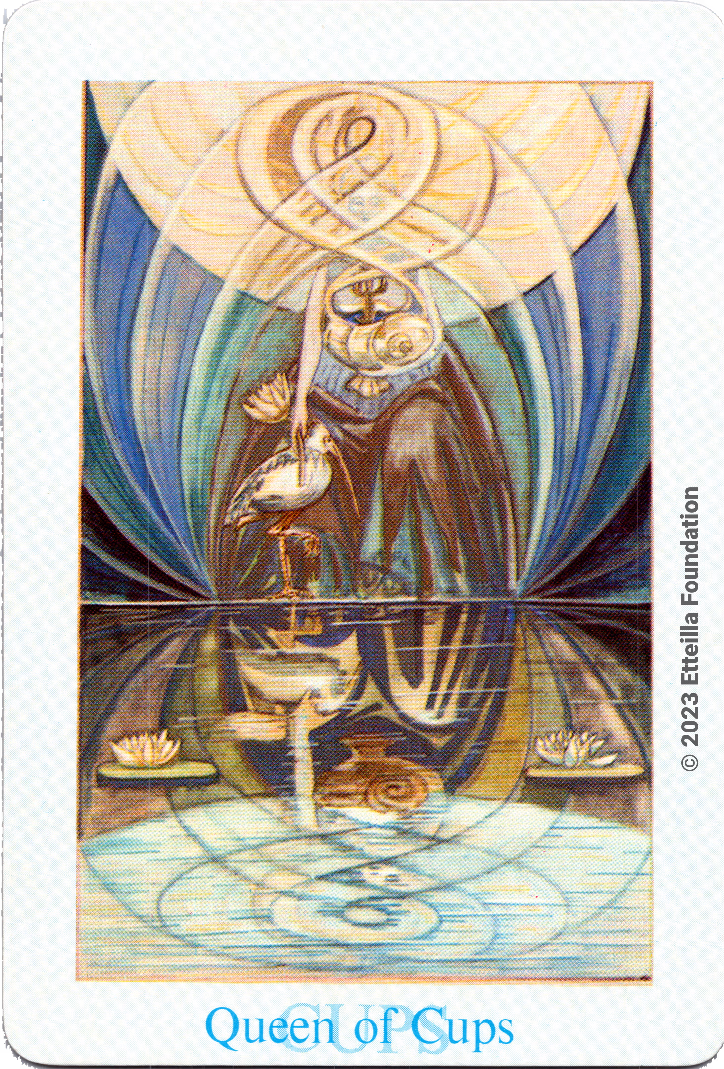 The Thoth Tarot which features very unique card designs and artistic direction is a collaboration between the famous occultist Aleister Crowley who designed the deck, and Lady Frieda Harris who painted the illustrations. This very popular divination tarot created between 1938 and 1943 is notable for having major arcana re-ordered and renamed to allow what Crowley calls the “double zodiac loop” for tarot reading. We note that the suit of disks replace the suit of pentacles found in the Waite-Smith decks and many cards have different names. In particular the Knights replace the Kings, The Knights become the Princes and the Pages are replaced by the Princesses. This version, commonly referred as version B, was published by Weisner instead of Llewellyn and is the first one to introduce the extra Ordo Templi Orientis white playing card.
