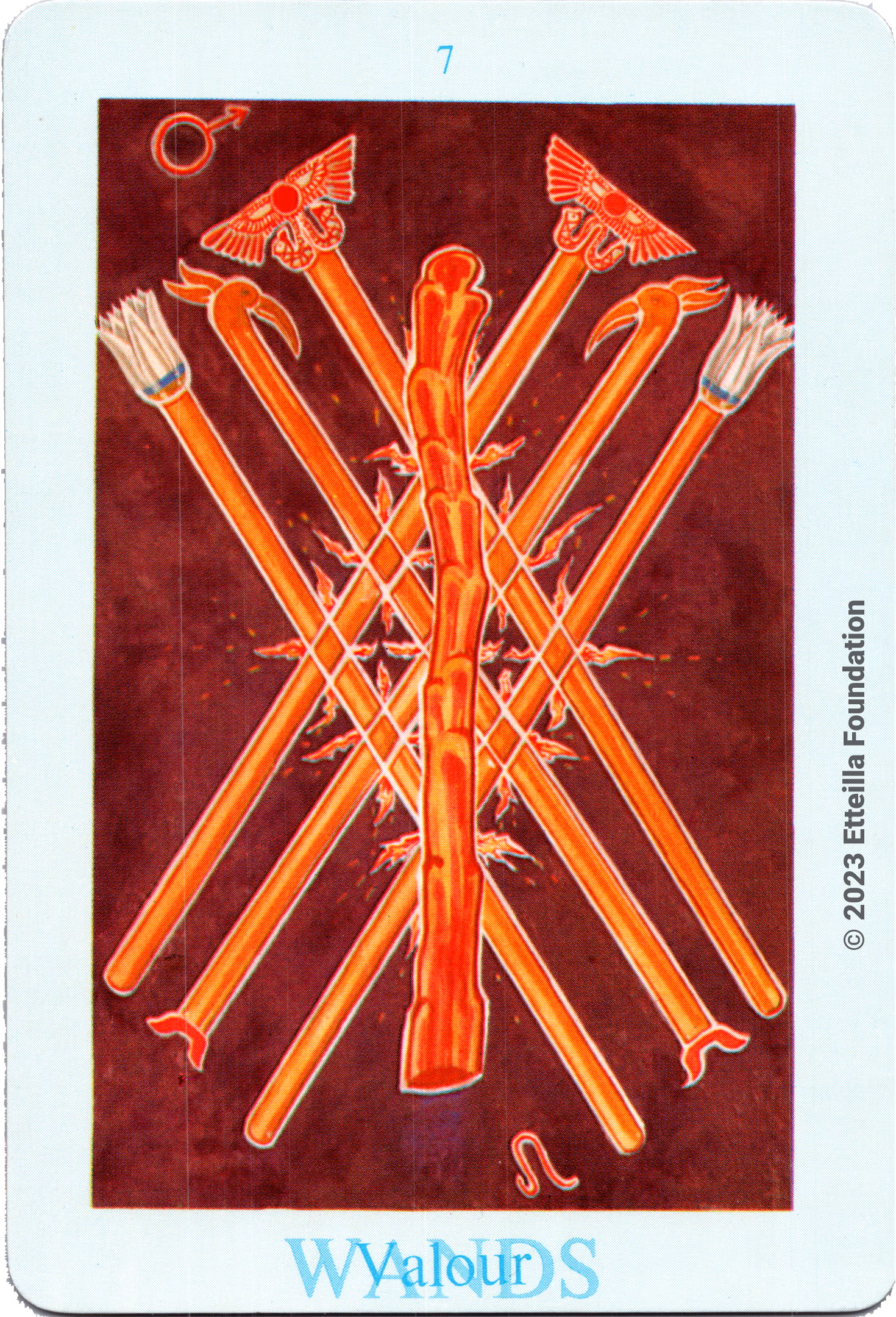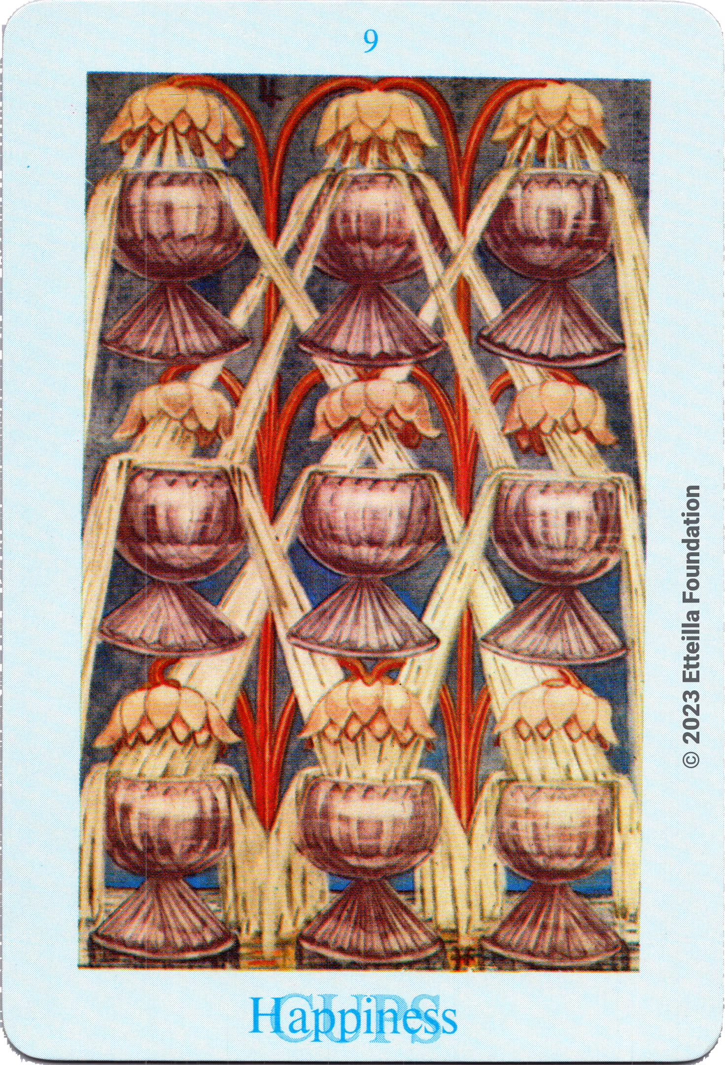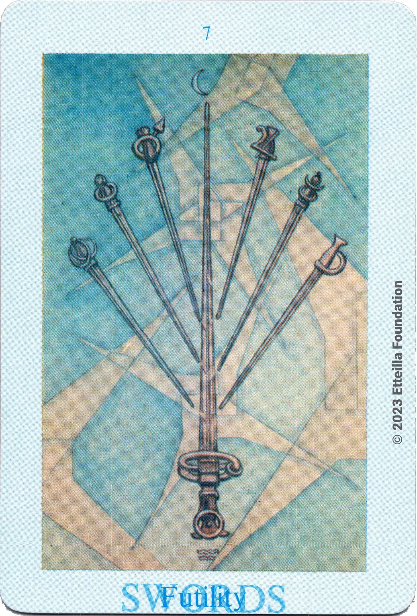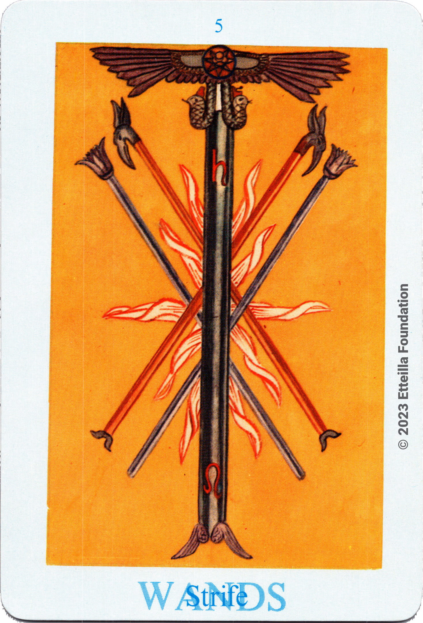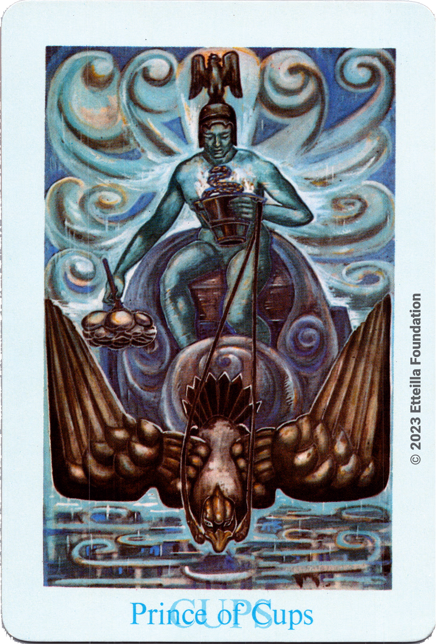 The Thoth Tarot which features very unique card designs and artistic direction is a collaboration between the famous occultist Aleister Crowley who designed the deck, and Lady Frieda Harris who painted the illustrations. This very popular divination tarot created between 1938 and 1943 is notable for having major arcana re-ordered and renamed to allow what Crowley calls the “double zodiac loop” for tarot reading. We note that the suit of disks replace the suit of pentacles found in the Waite-Smith decks and many cards have different names. In particular the Knights replace the Kings, The Knights become the Princes and the Pages are replaced by the Princesses. This version, commonly referred as version B, was published by Weisner instead of Llewellyn and is the first one to introduce the extra Ordo Templi Orientis white playing card.