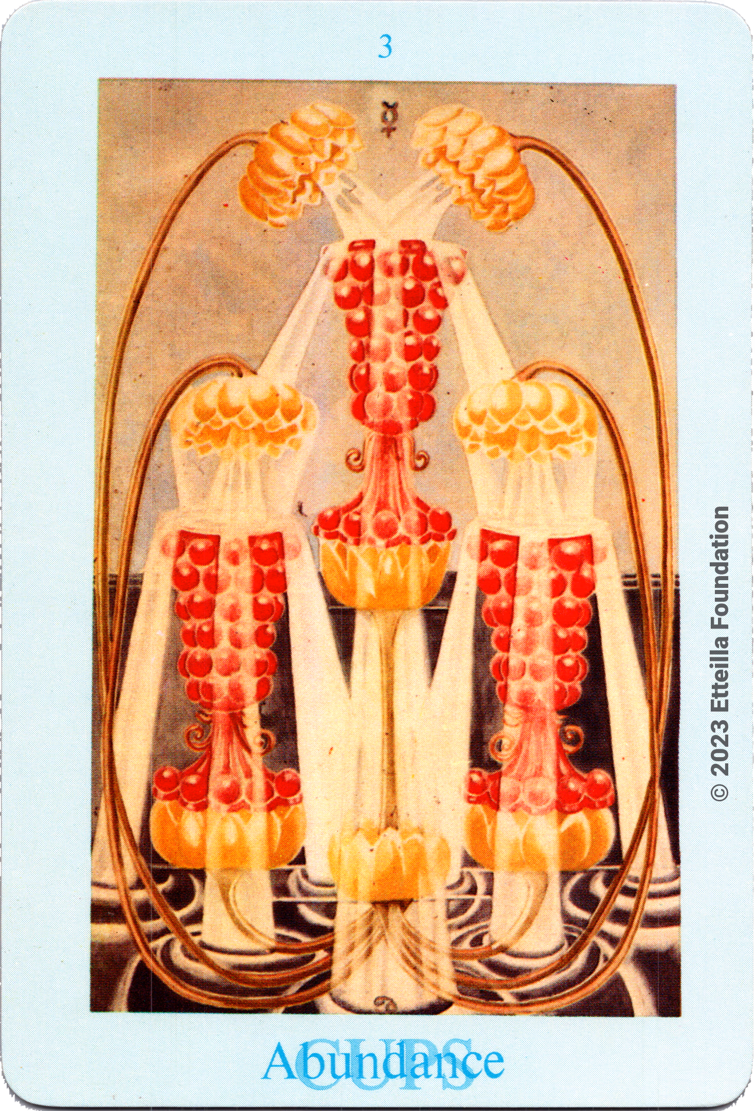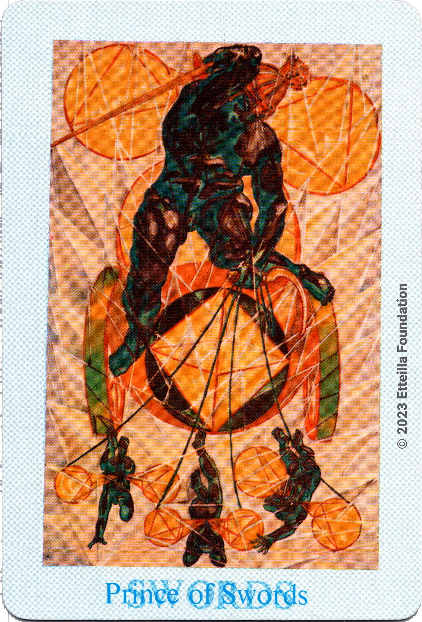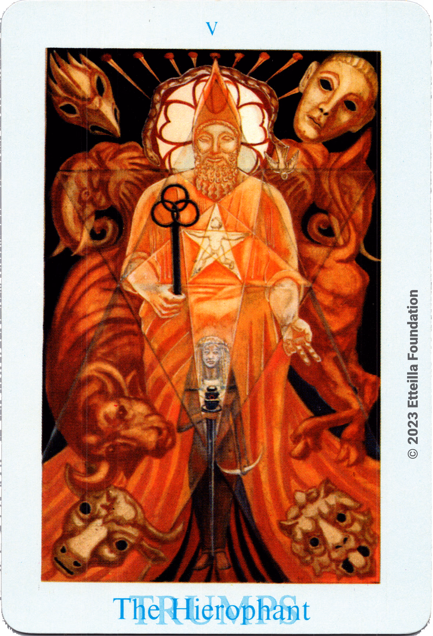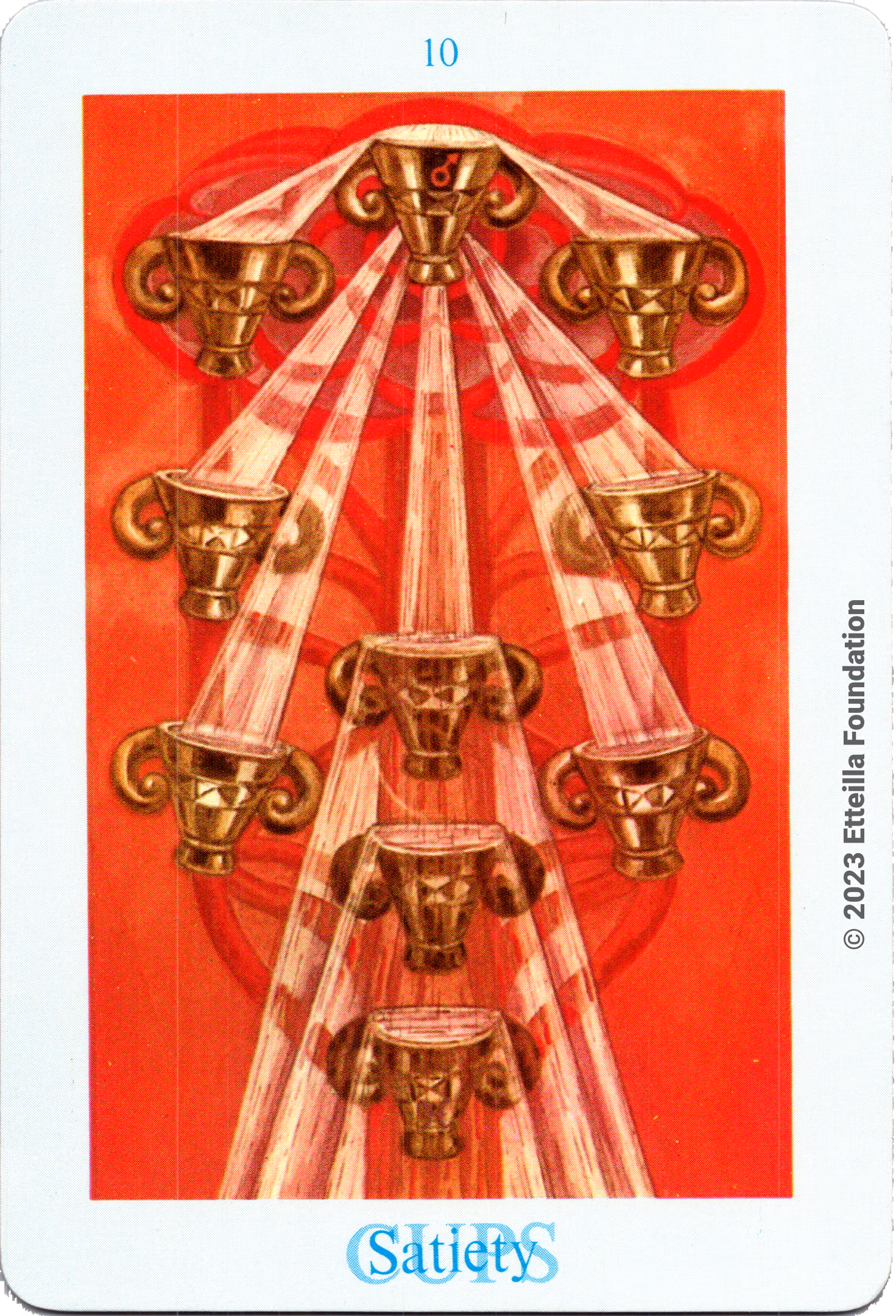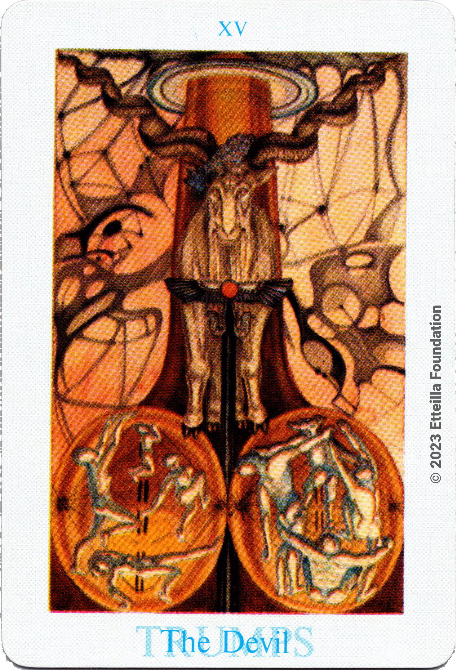 The Thoth Tarot which features very unique card designs and artistic direction is a collaboration between the famous occultist Aleister Crowley who designed the deck, and Lady Frieda Harris who painted the illustrations. This very popular divination tarot created between 1938 and 1943 is notable for having major arcana re-ordered and renamed to allow what Crowley calls the “double zodiac loop” for tarot reading. We note that the suit of disks replace the suit of pentacles found in the Waite-Smith decks and many cards have different names. In particular the Knights replace the Kings, The Knights become the Princes and the Pages are replaced by the Princesses. This version, commonly referred as version B, was published by Weisner instead of Llewellyn and is the first one to introduce the extra Ordo Templi Orientis white playing card.