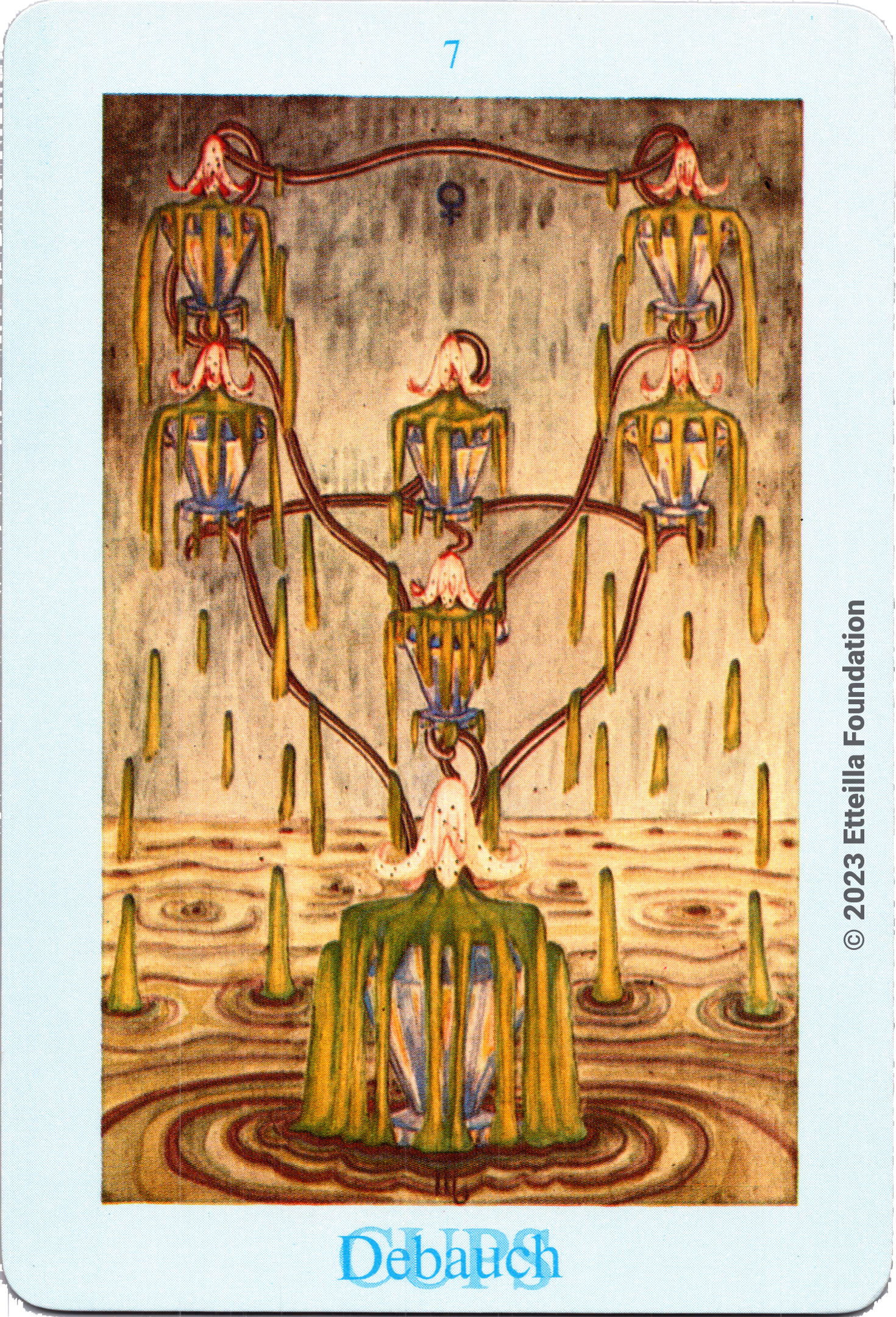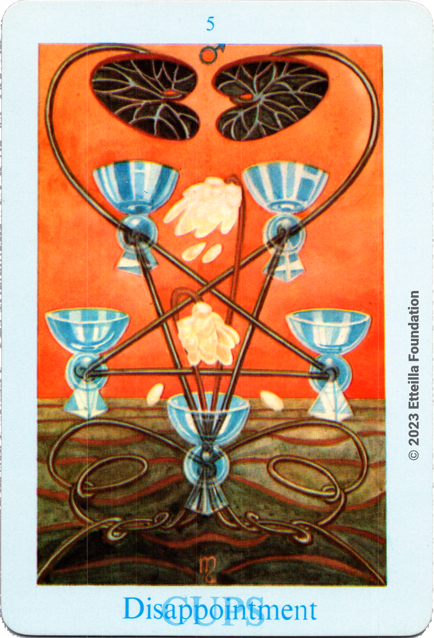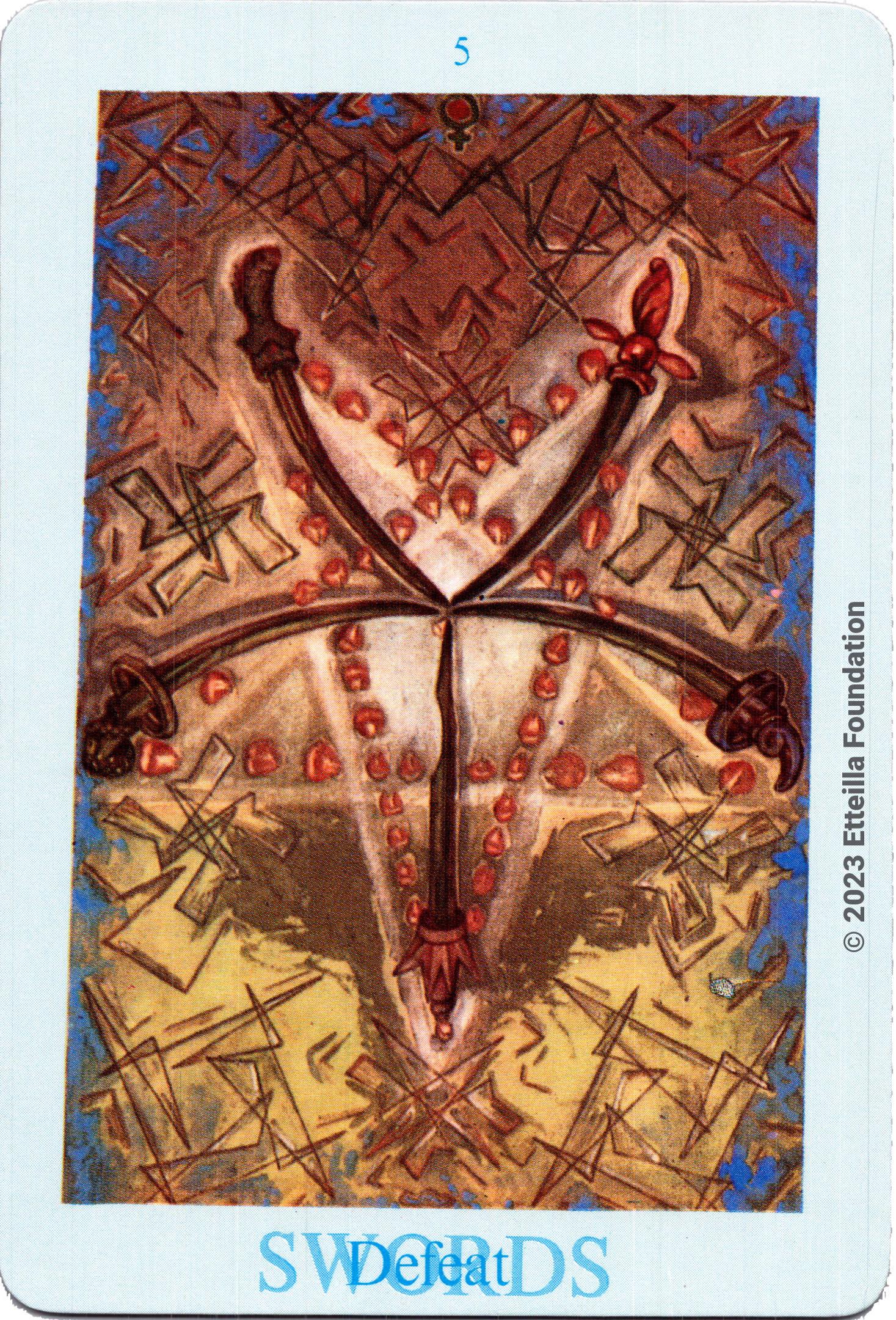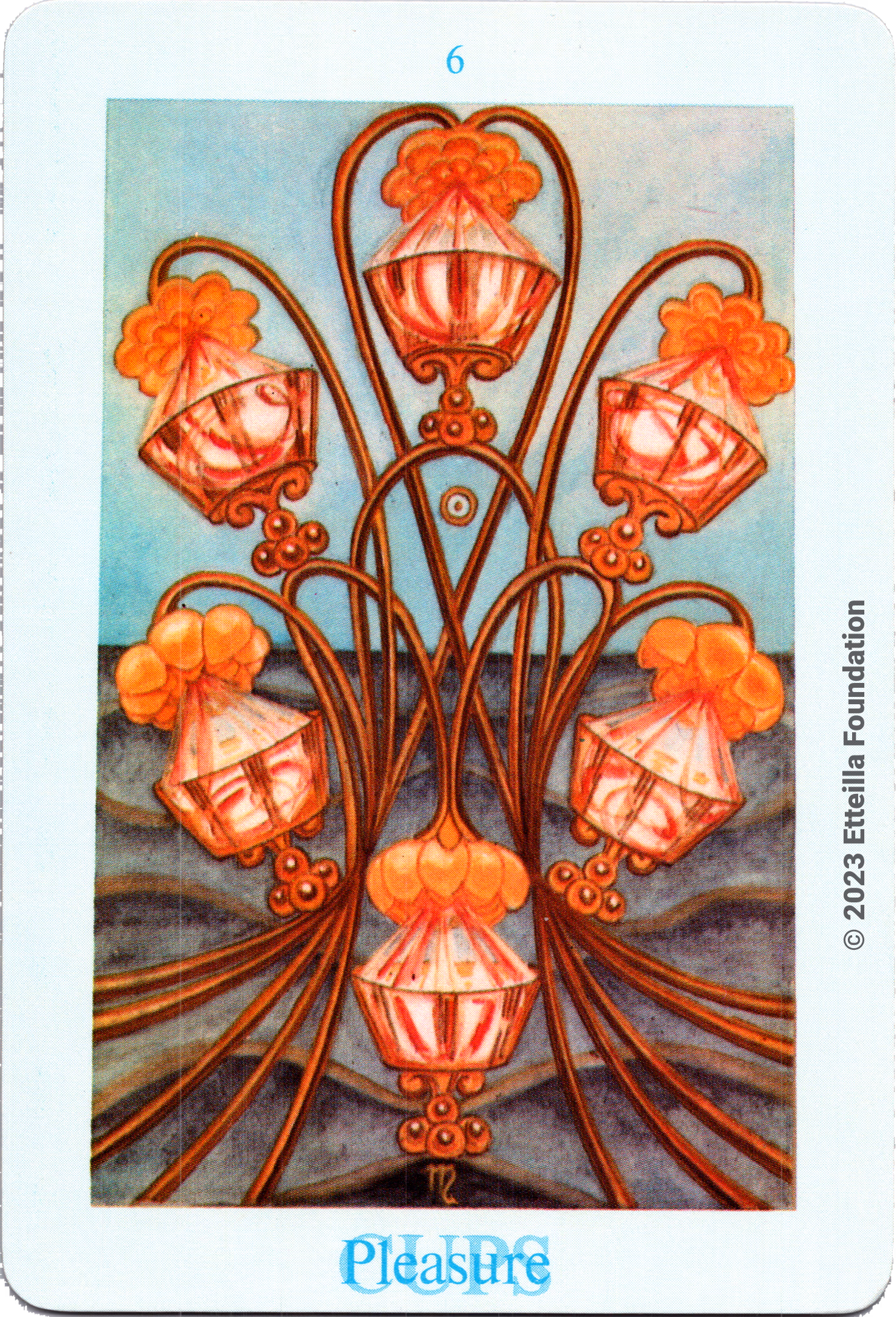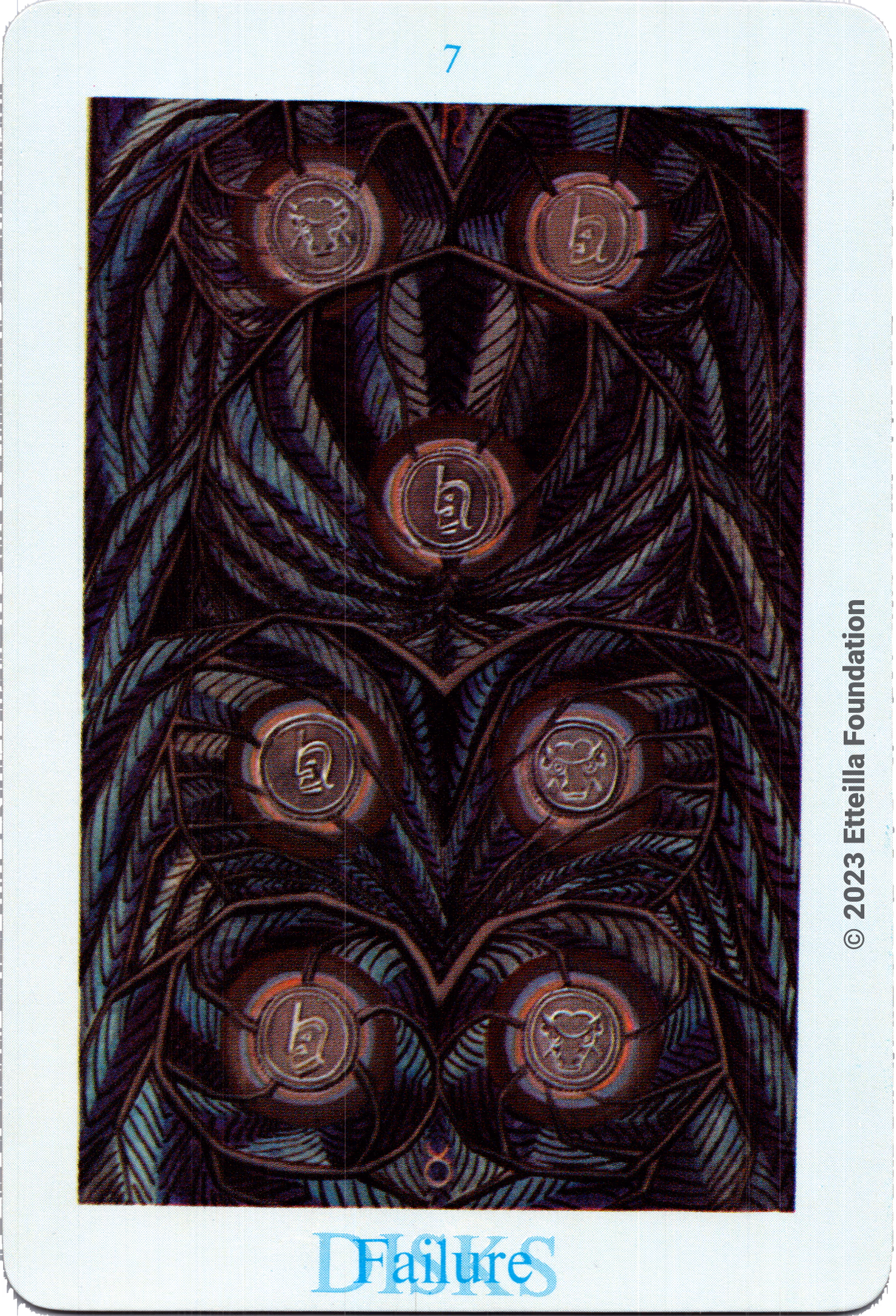 The Thoth Tarot which features very unique card designs and artistic direction is a collaboration between the famous occultist Aleister Crowley who designed the deck, and Lady Frieda Harris who painted the illustrations. This very popular divination tarot created between 1938 and 1943 is notable for having major arcana re-ordered and renamed to allow what Crowley calls the “double zodiac loop” for tarot reading. We note that the suit of disks replace the suit of pentacles found in the Waite-Smith decks and many cards have different names. In particular the Knights replace the Kings, The Knights become the Princes and the Pages are replaced by the Princesses. This version, commonly referred as version B, was published by Weisner instead of Llewellyn and is the first one to introduce the extra Ordo Templi Orientis white playing card.