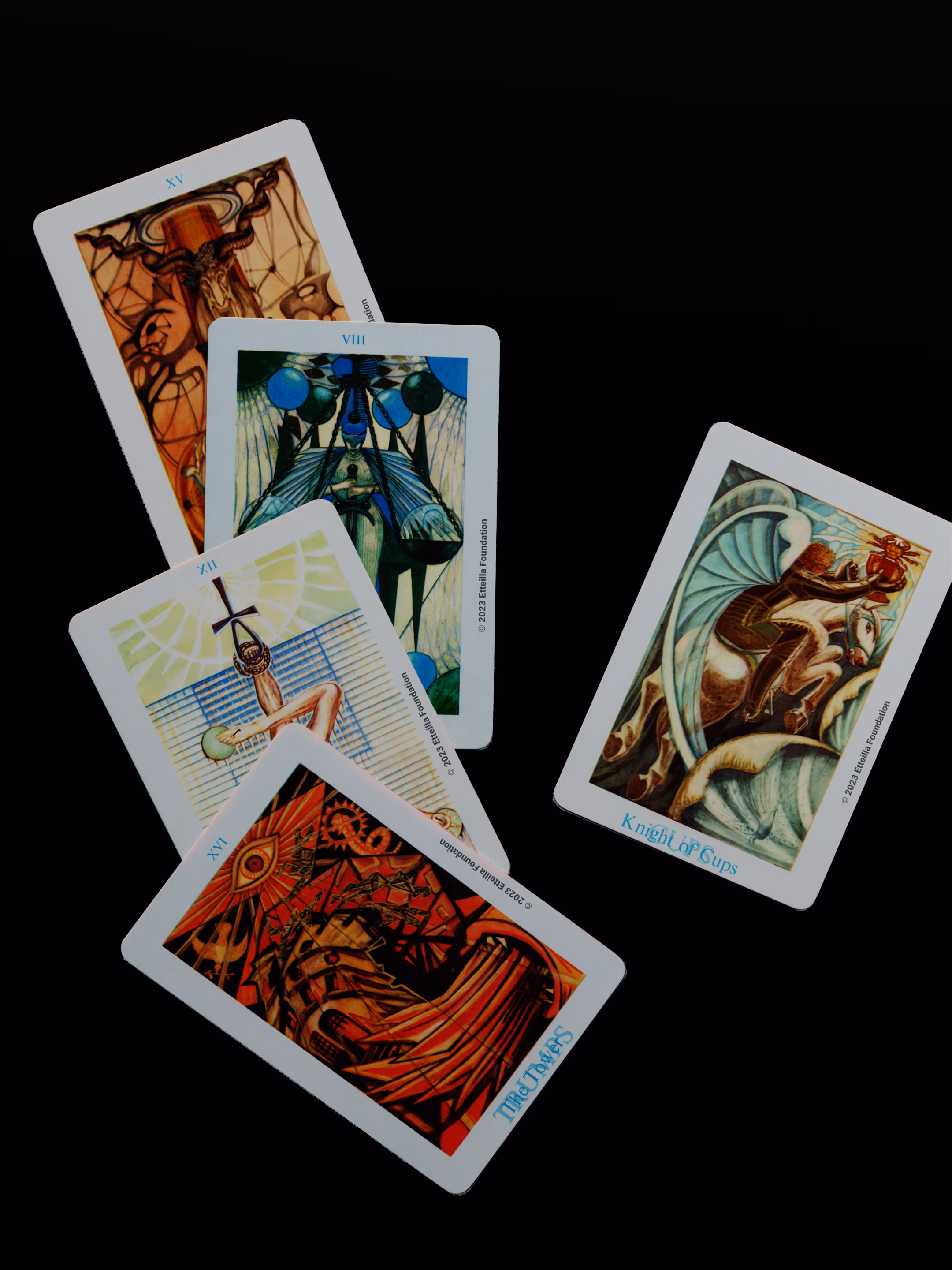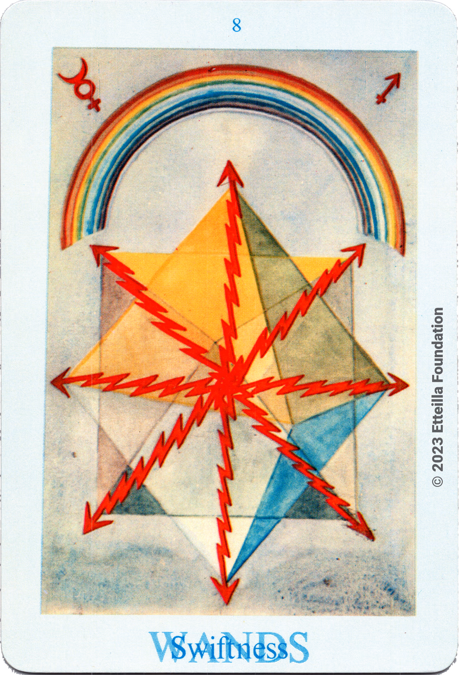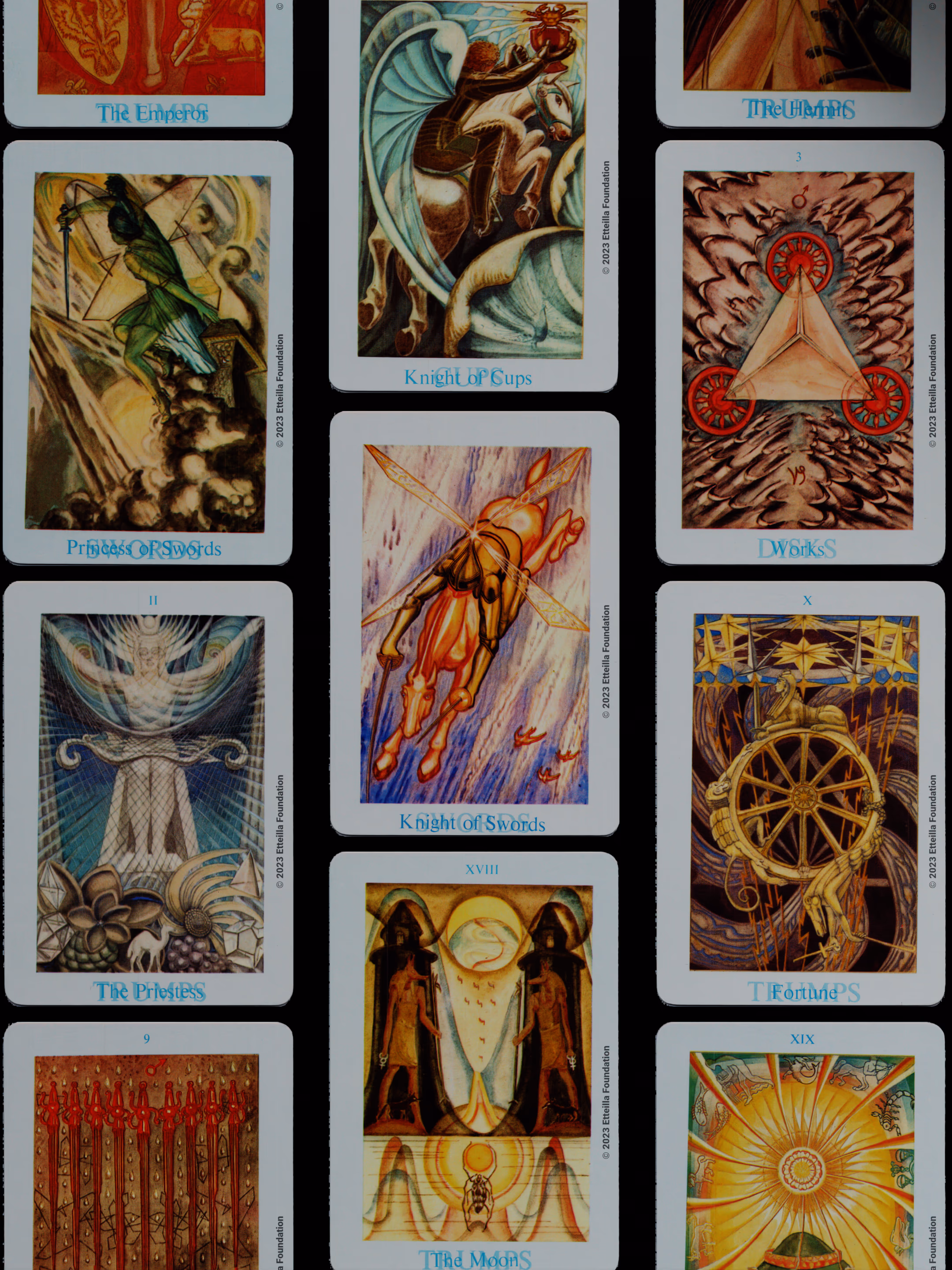 Our deck is in excellent condition, missing the 8 of cups, and with its box. All colored versions of the Toth decks are believed to be derived from the prints included in the original limited edition of the Toth book printed by Crowley circa 1944 not Frieda original paintings.