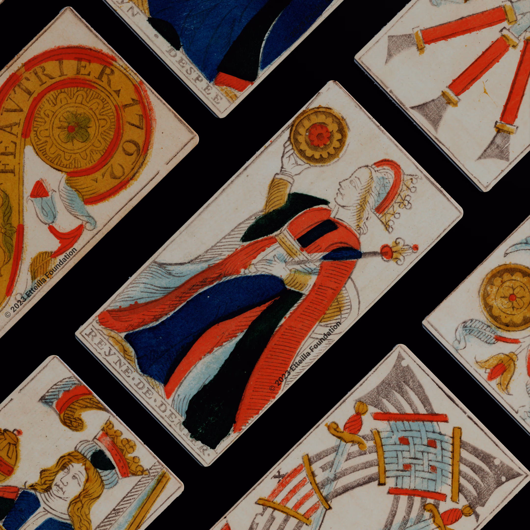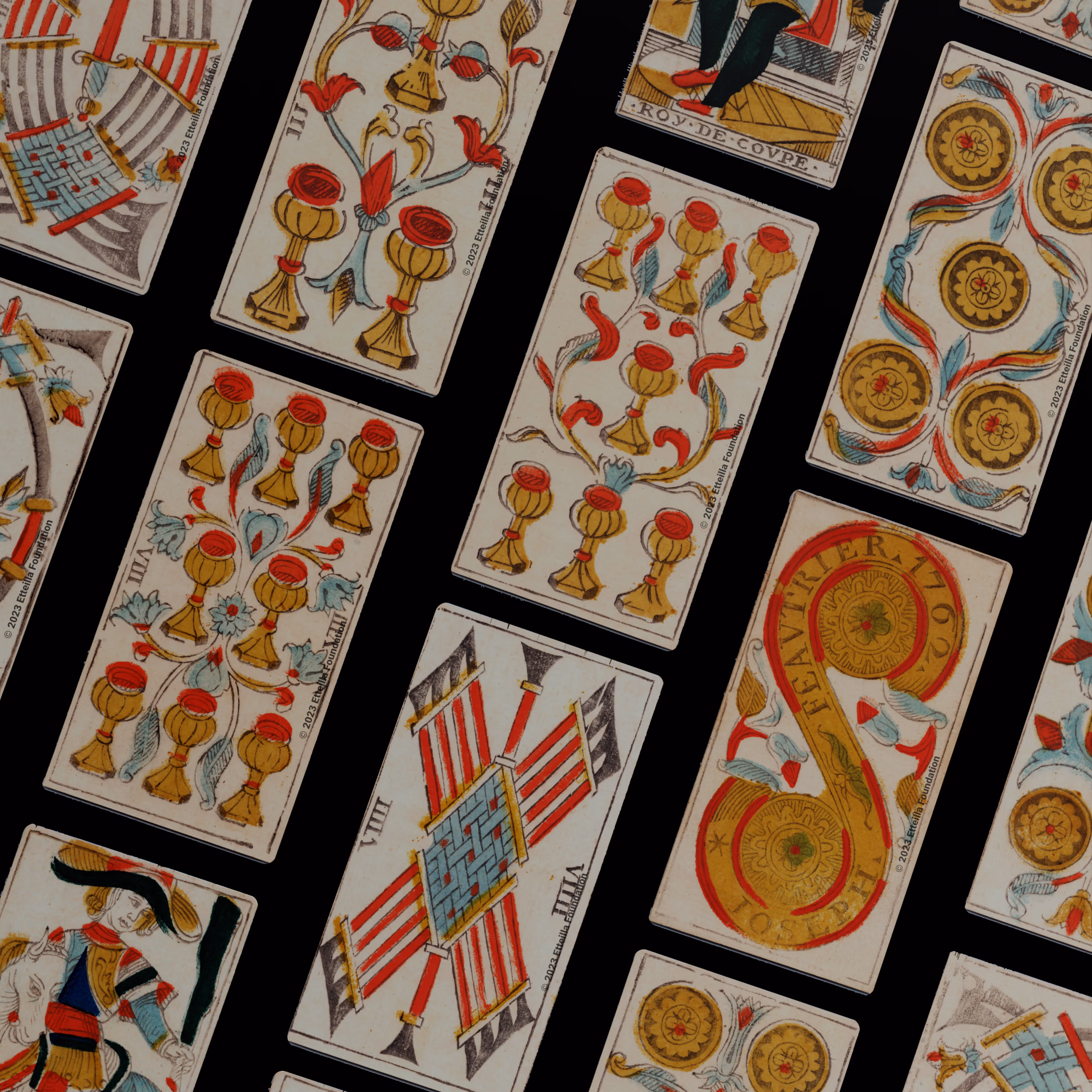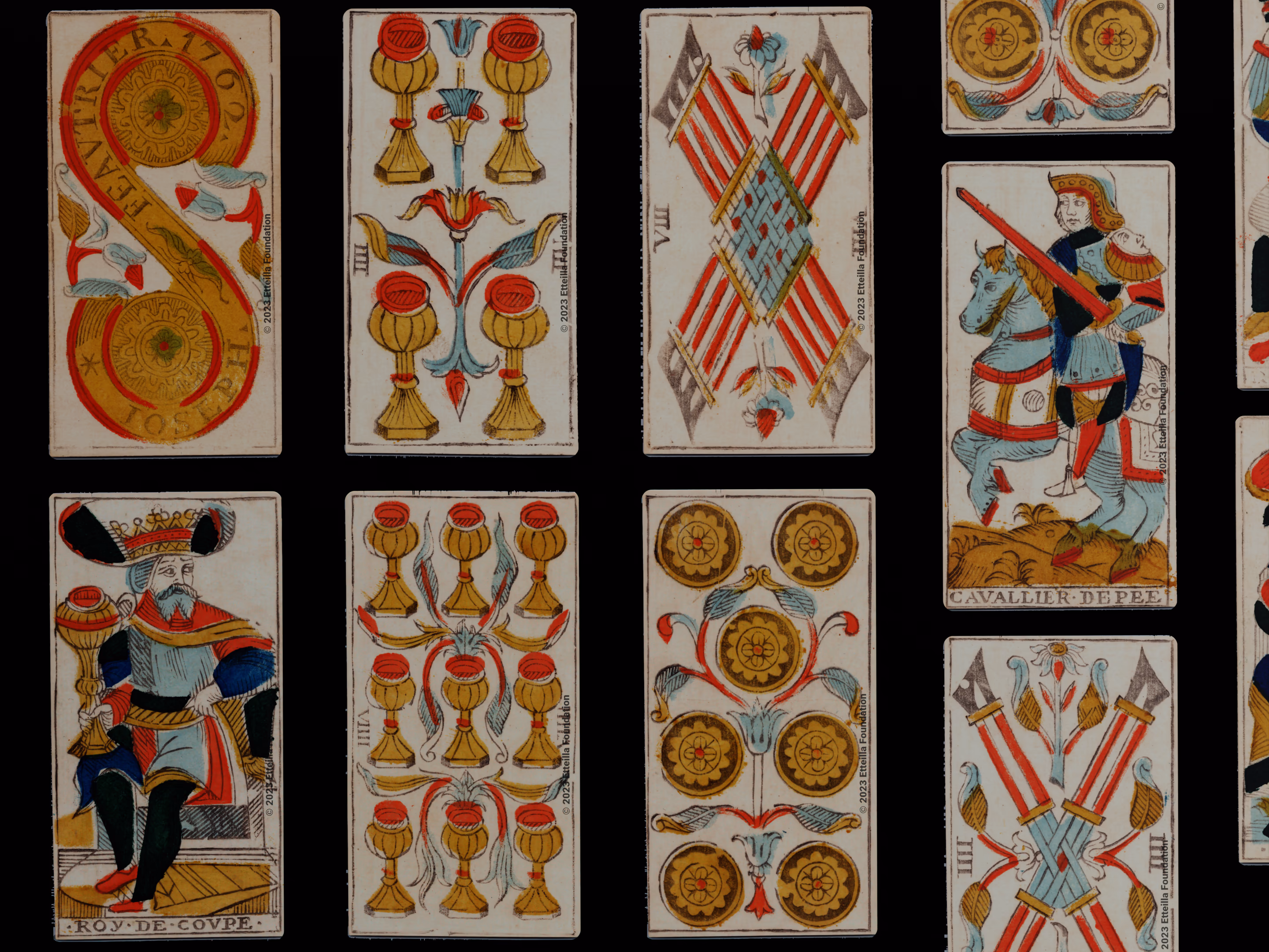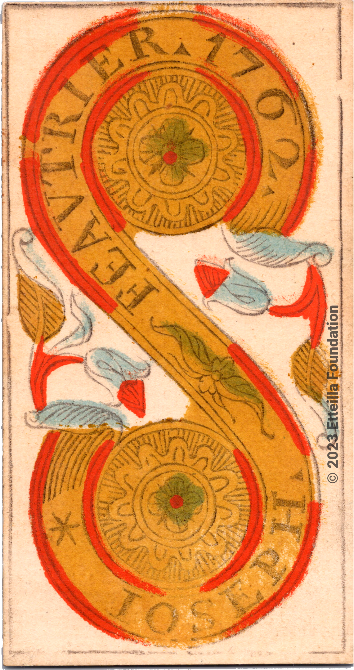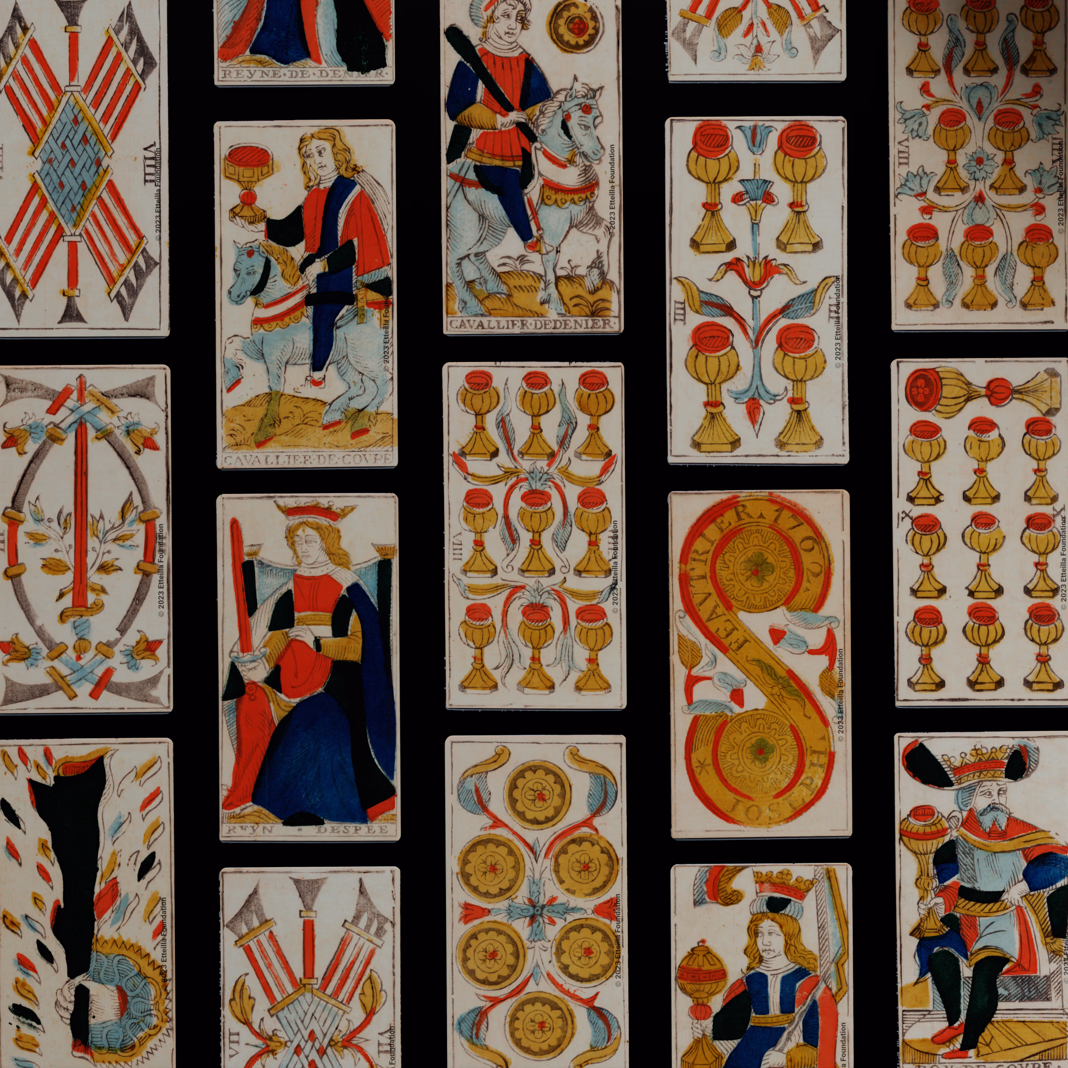This very rare deck produced in France by Joseph Feautrier in 1792 uniquely use Italian suits and card designs instead of the French ones making this deck one of a kind for his time. To this day it remains unknown why Joseph Feautrier decided to copy the Italian style.