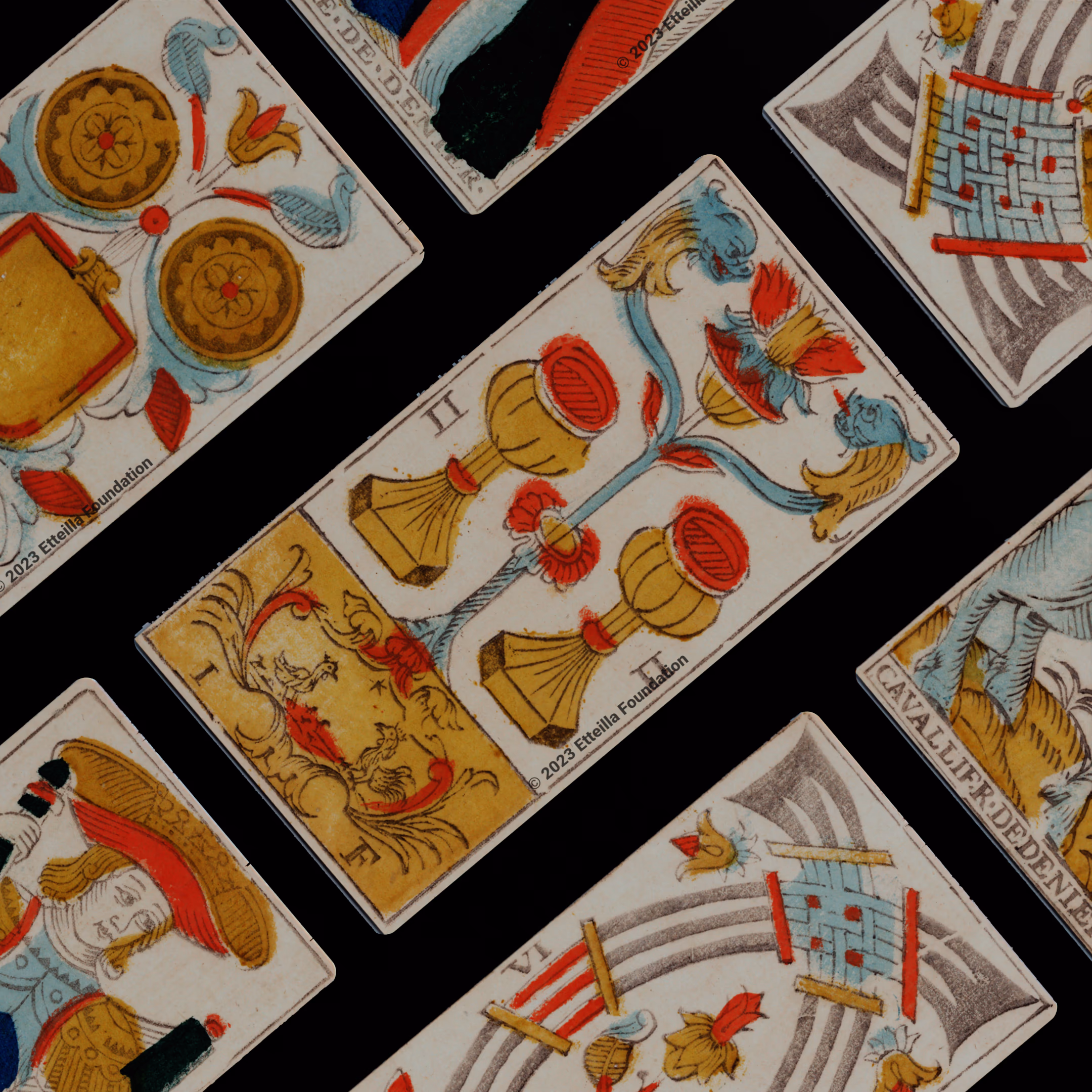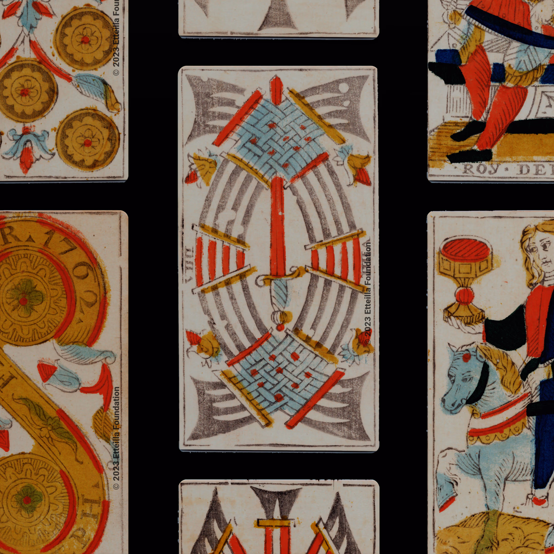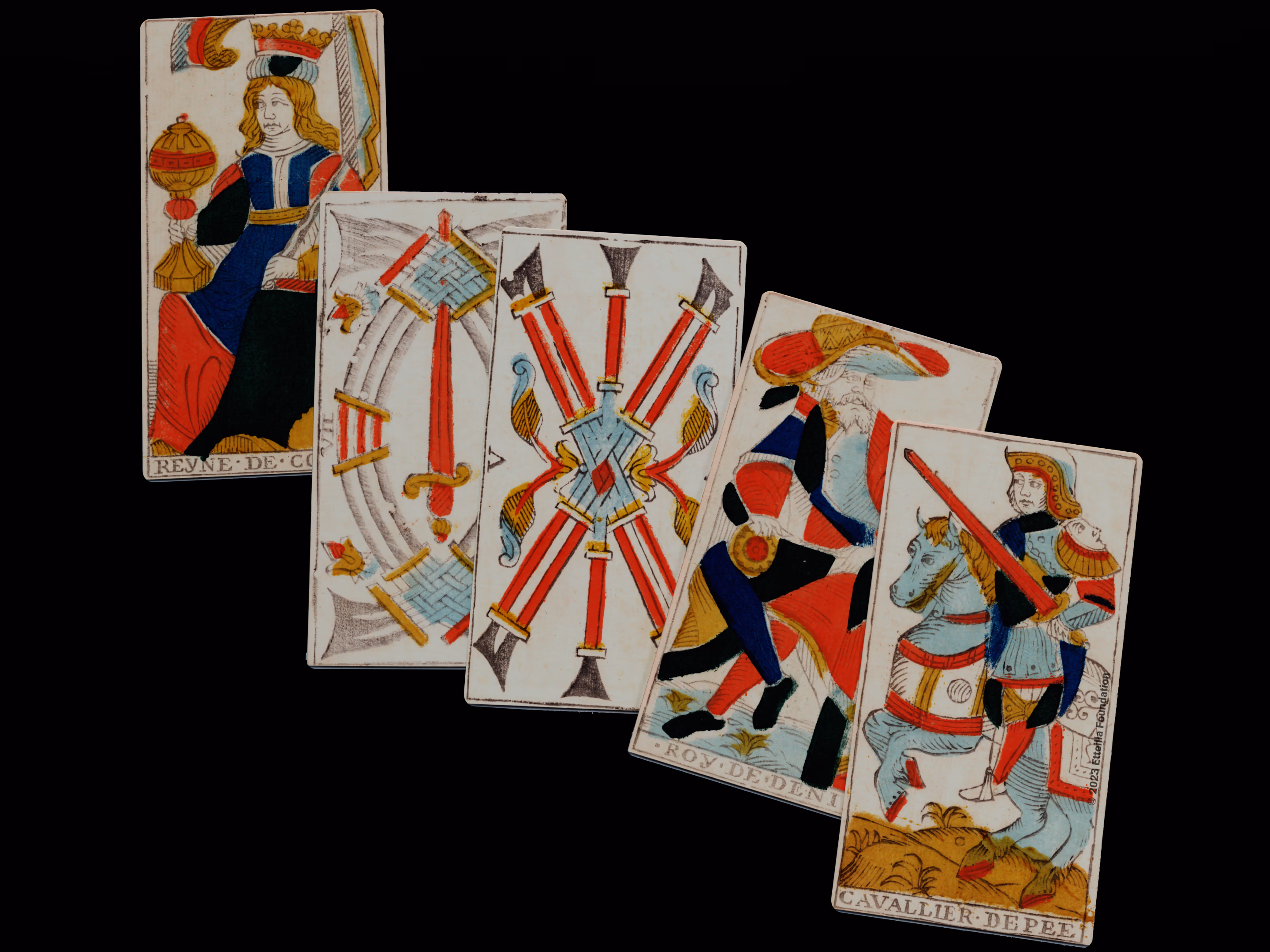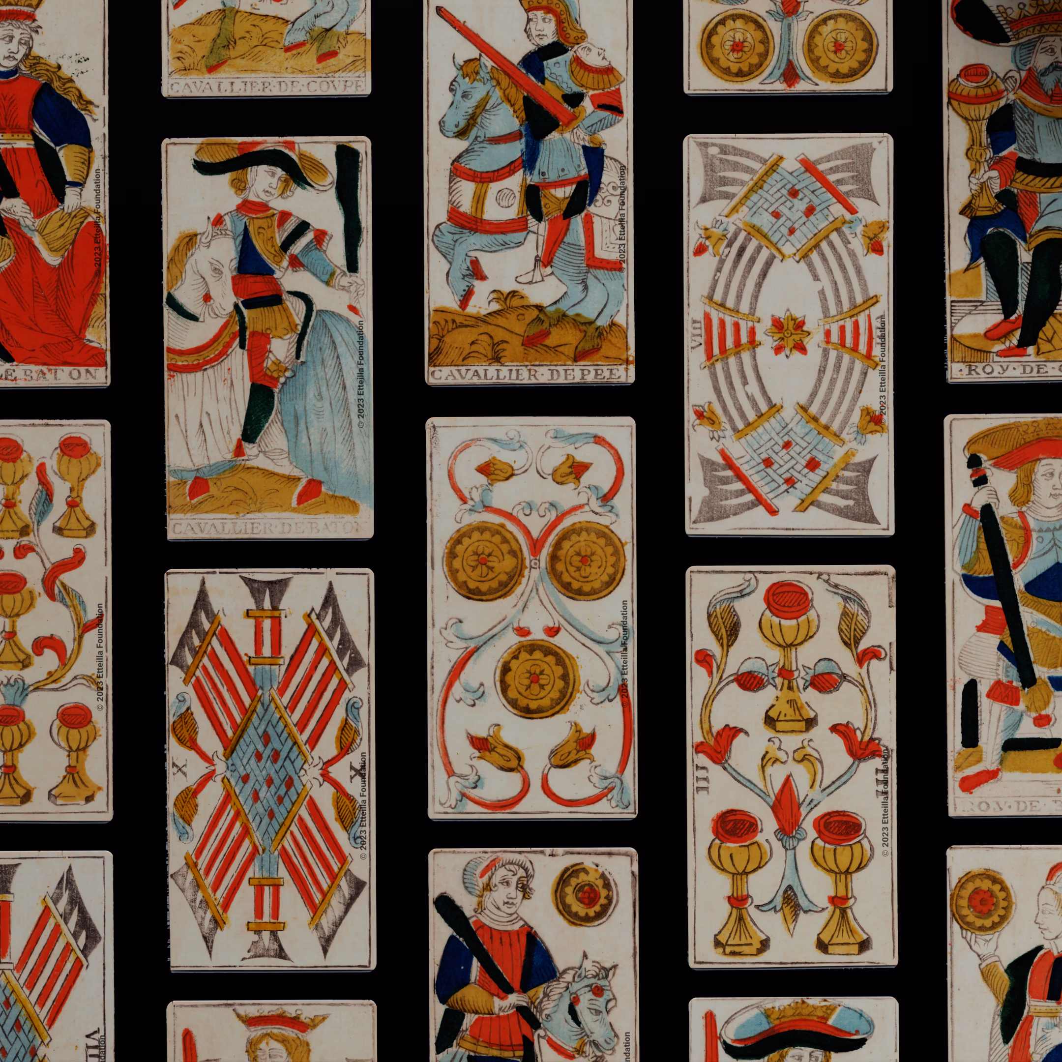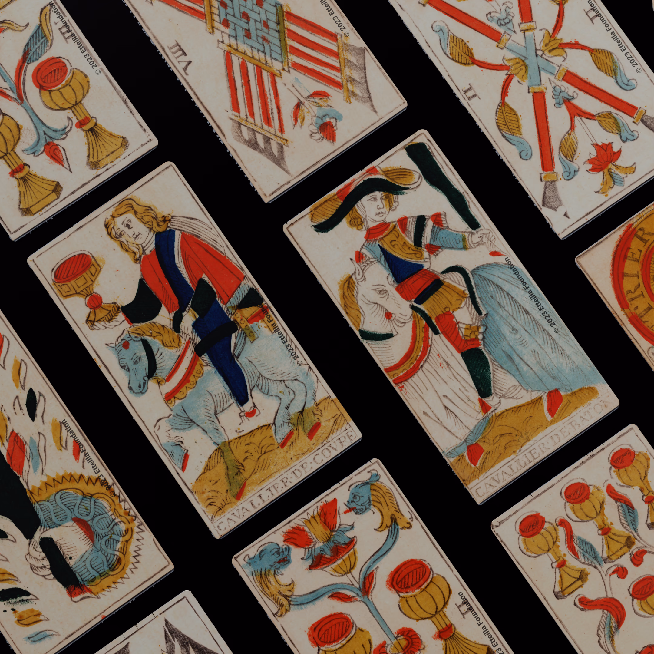 This very rare deck produced in France by Joseph Feautrier in 1792 uniquely use Italian suits and card designs instead of the French ones making this deck one of a kind for his time. To this day it remains unknown why Joseph Feautrier decided to copy the Italian style.