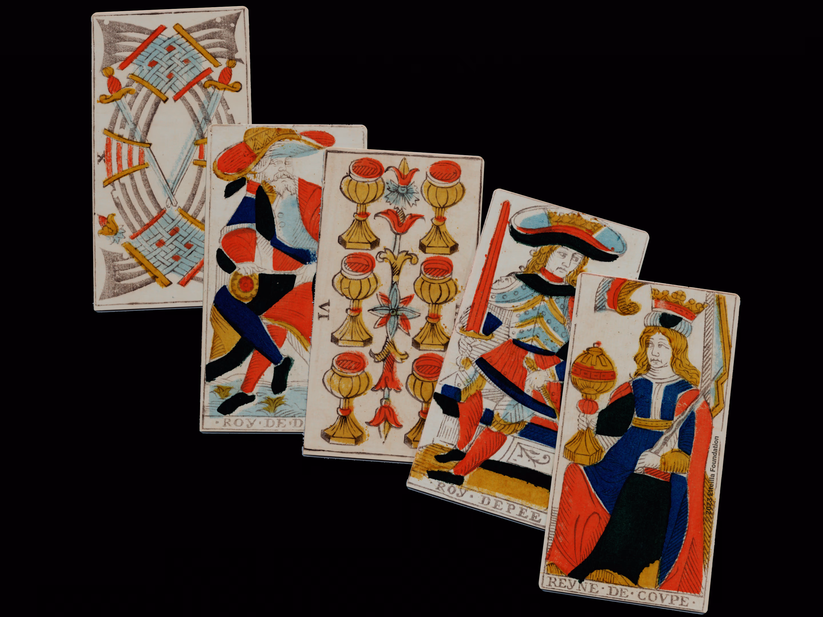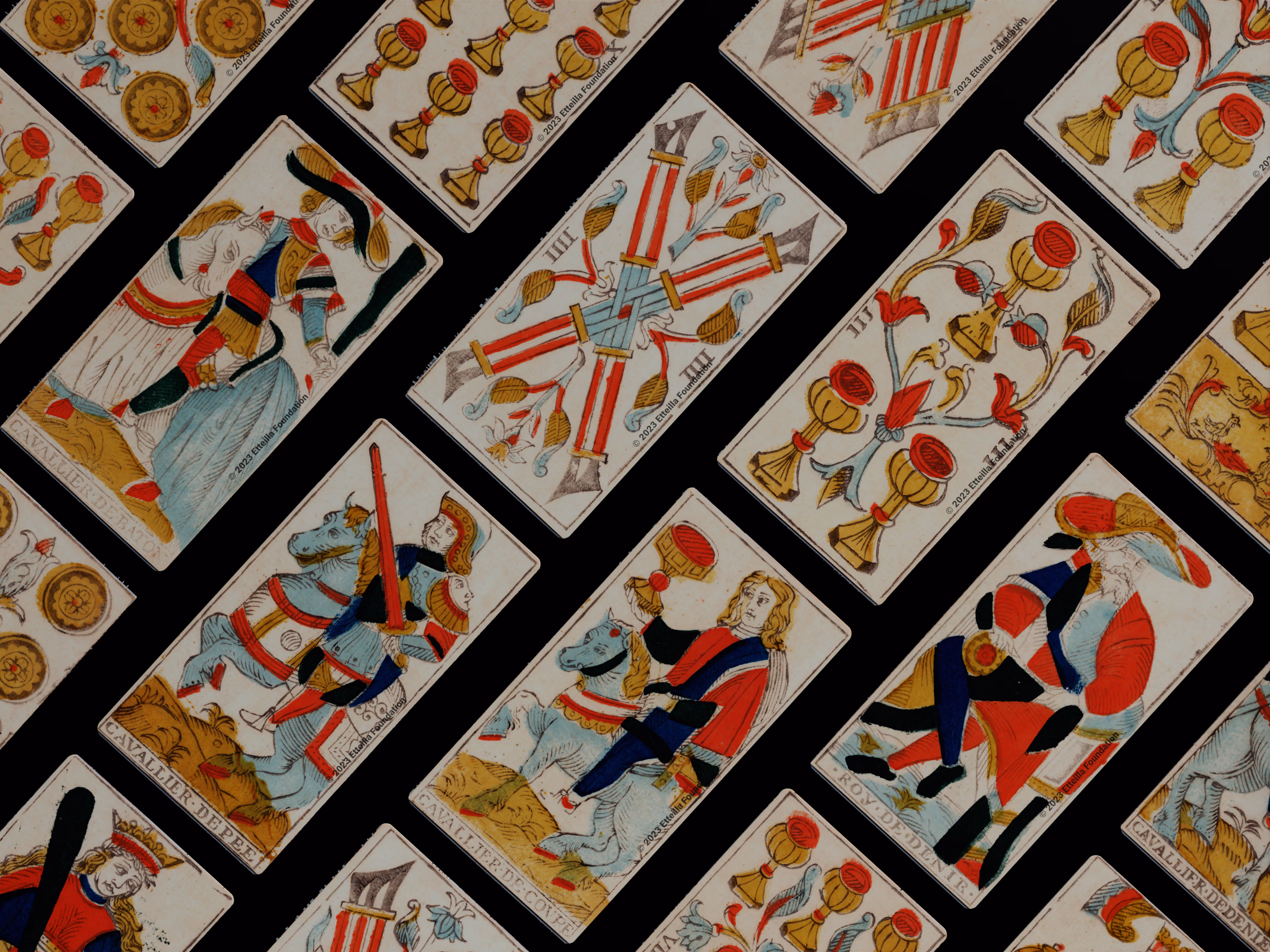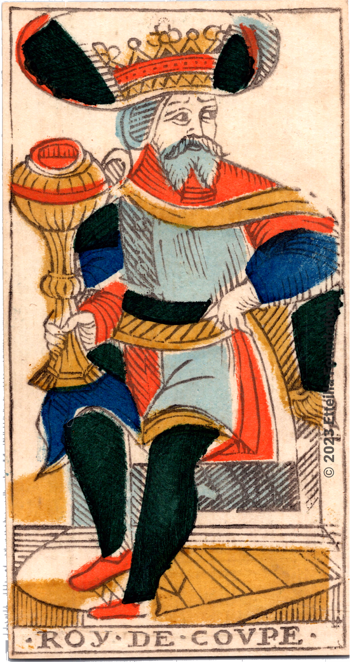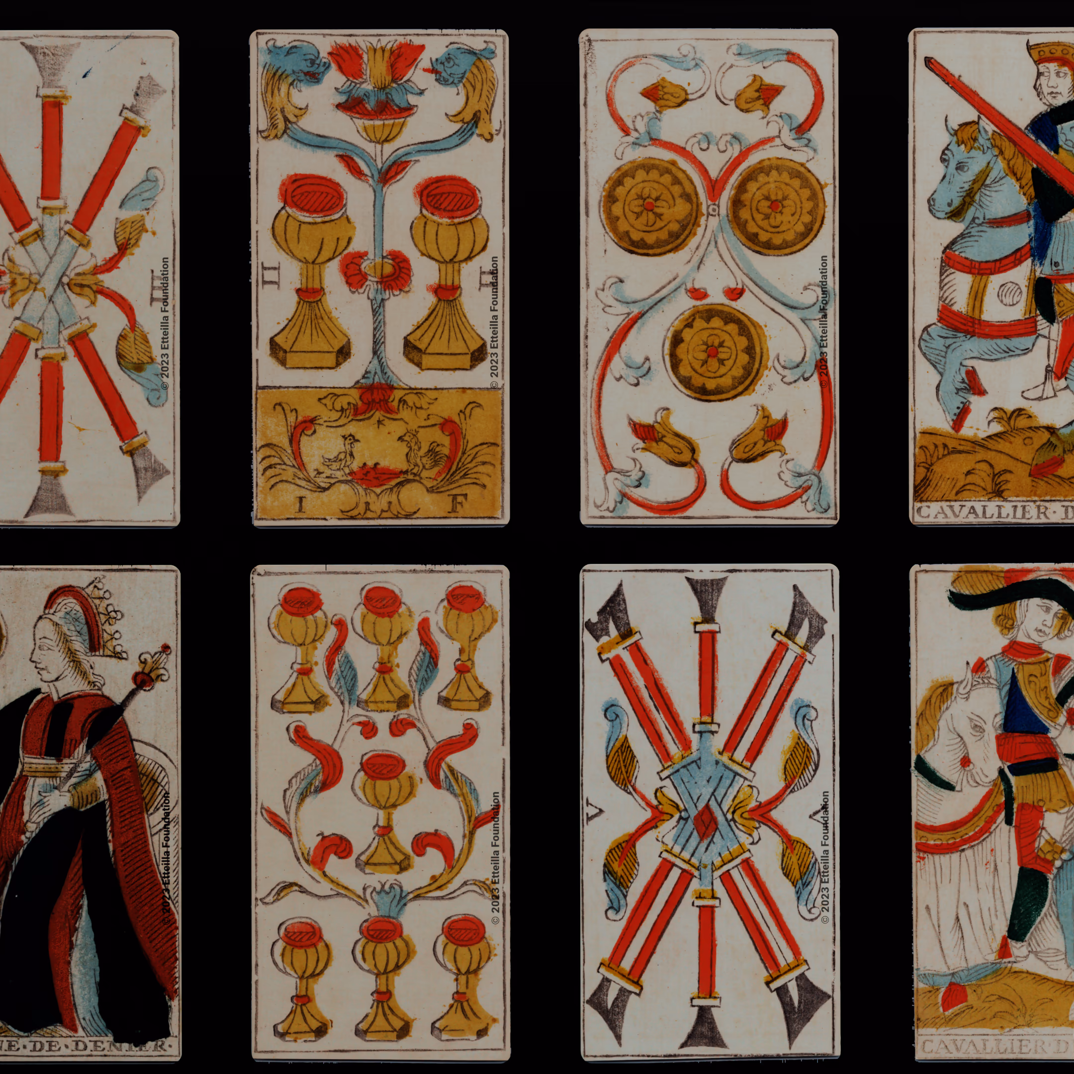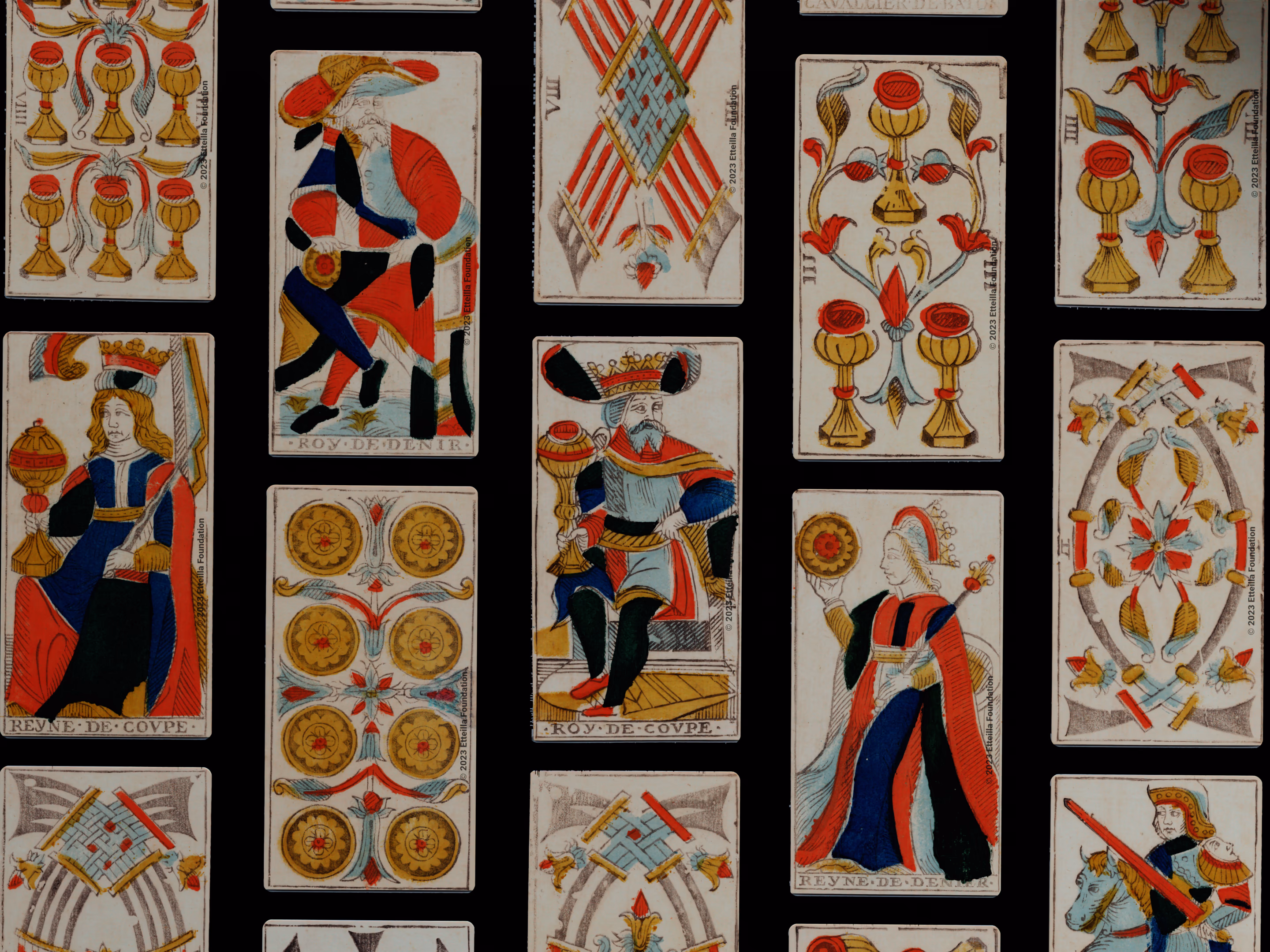 This very rare deck produced in France by Joseph Feautrier in 1792 uniquely use Italian suits and card designs instead of the French ones making this deck one of a kind for his time. To this day it remains unknown why Joseph Feautrier decided to copy the Italian style.