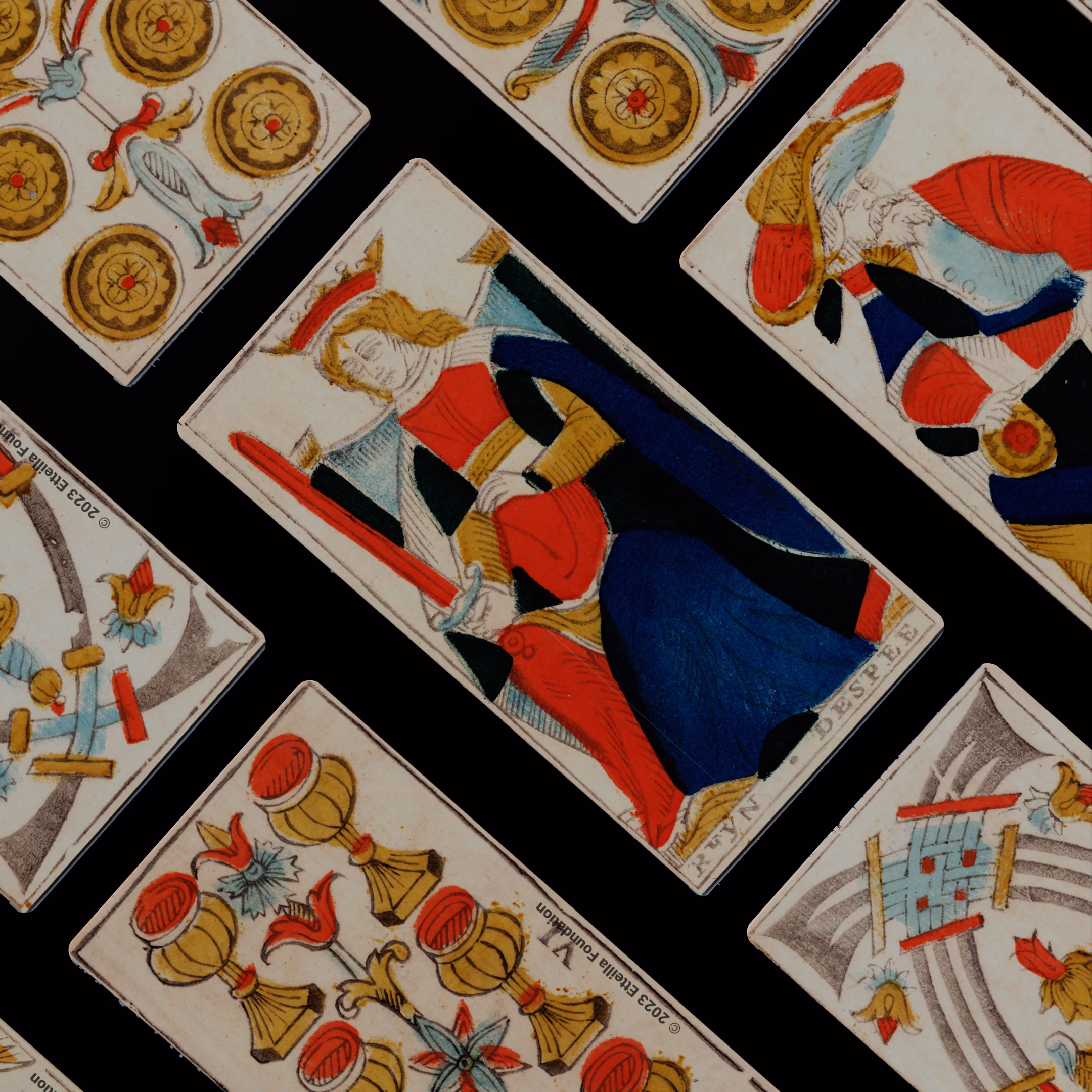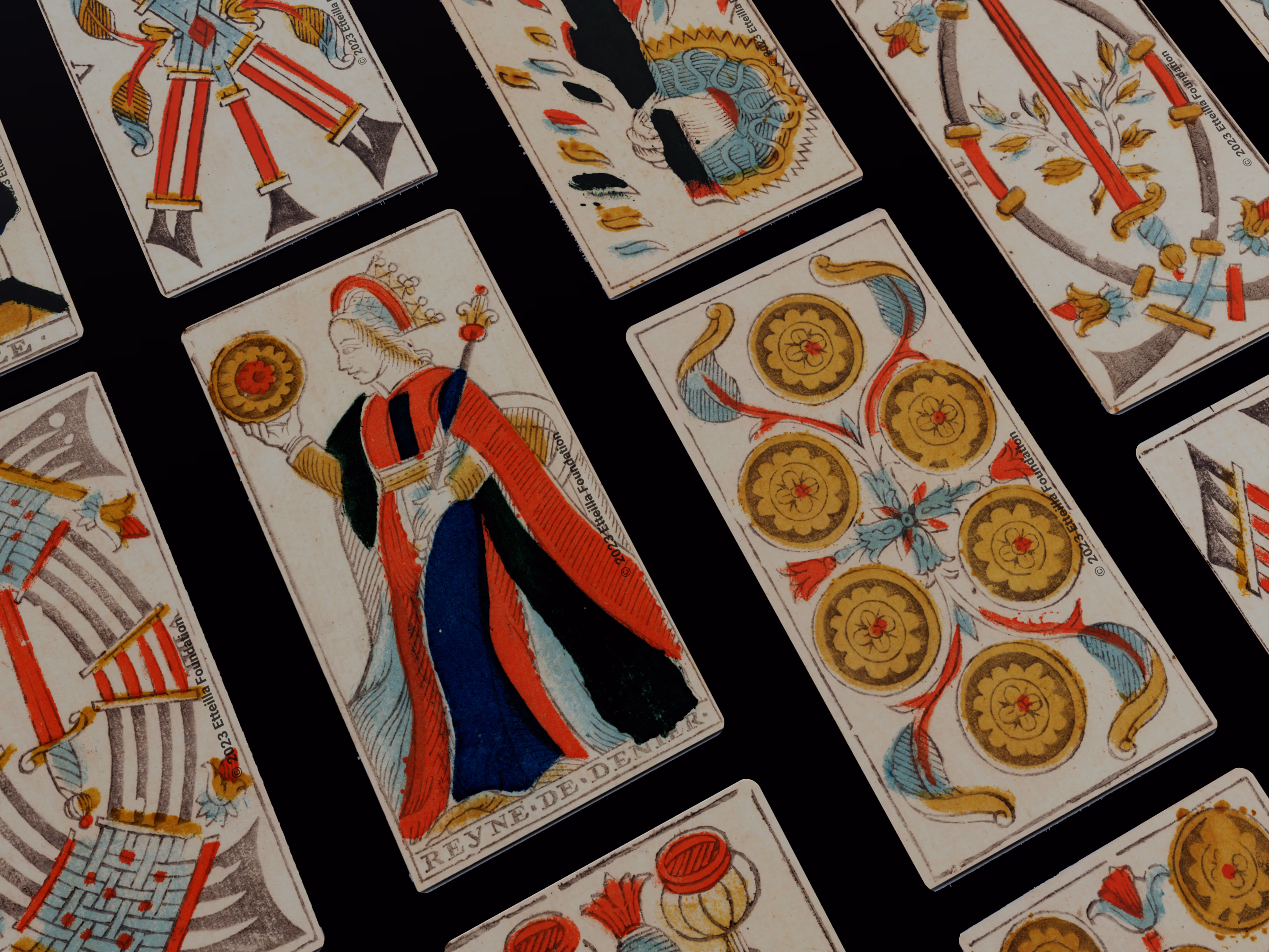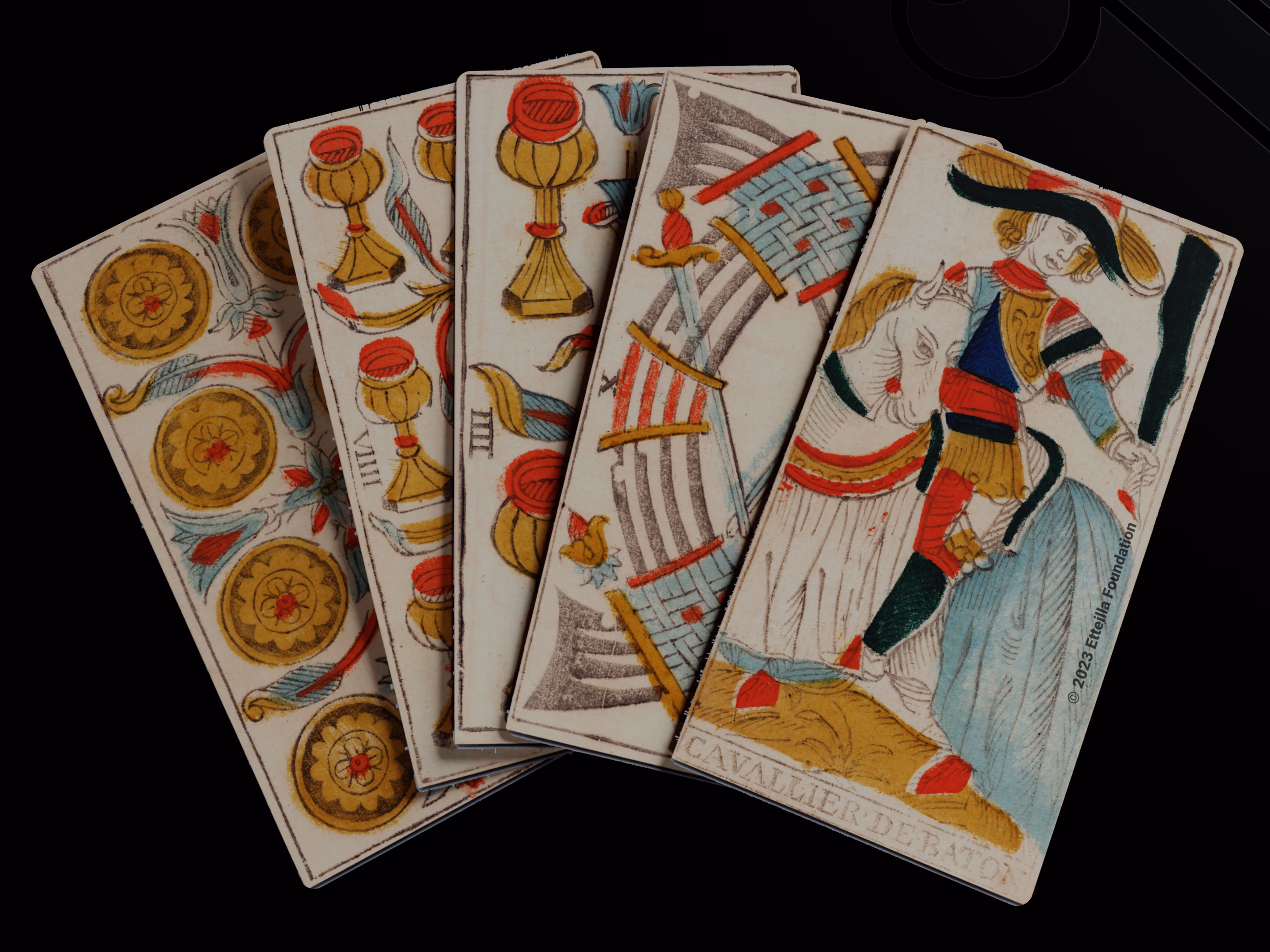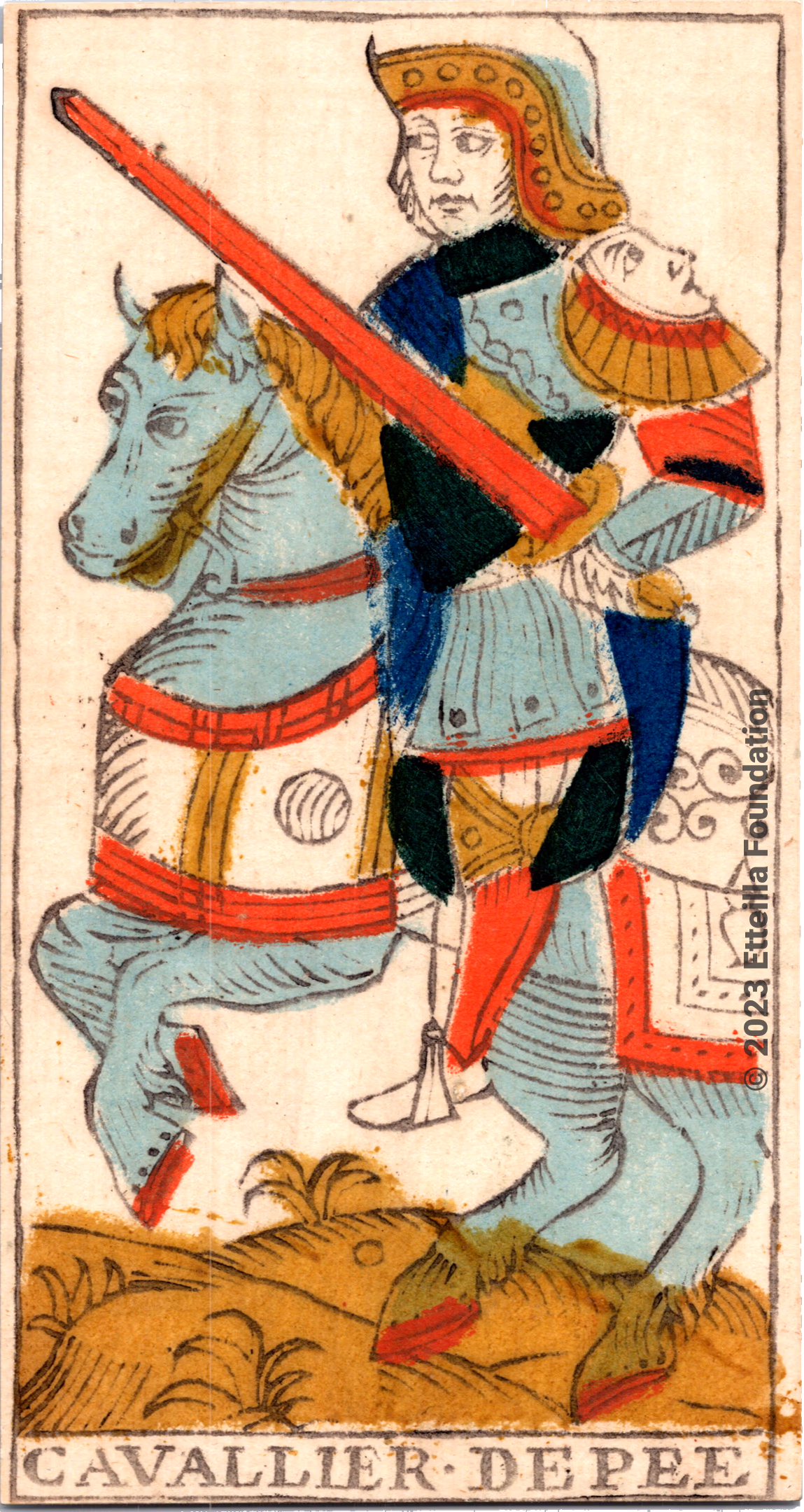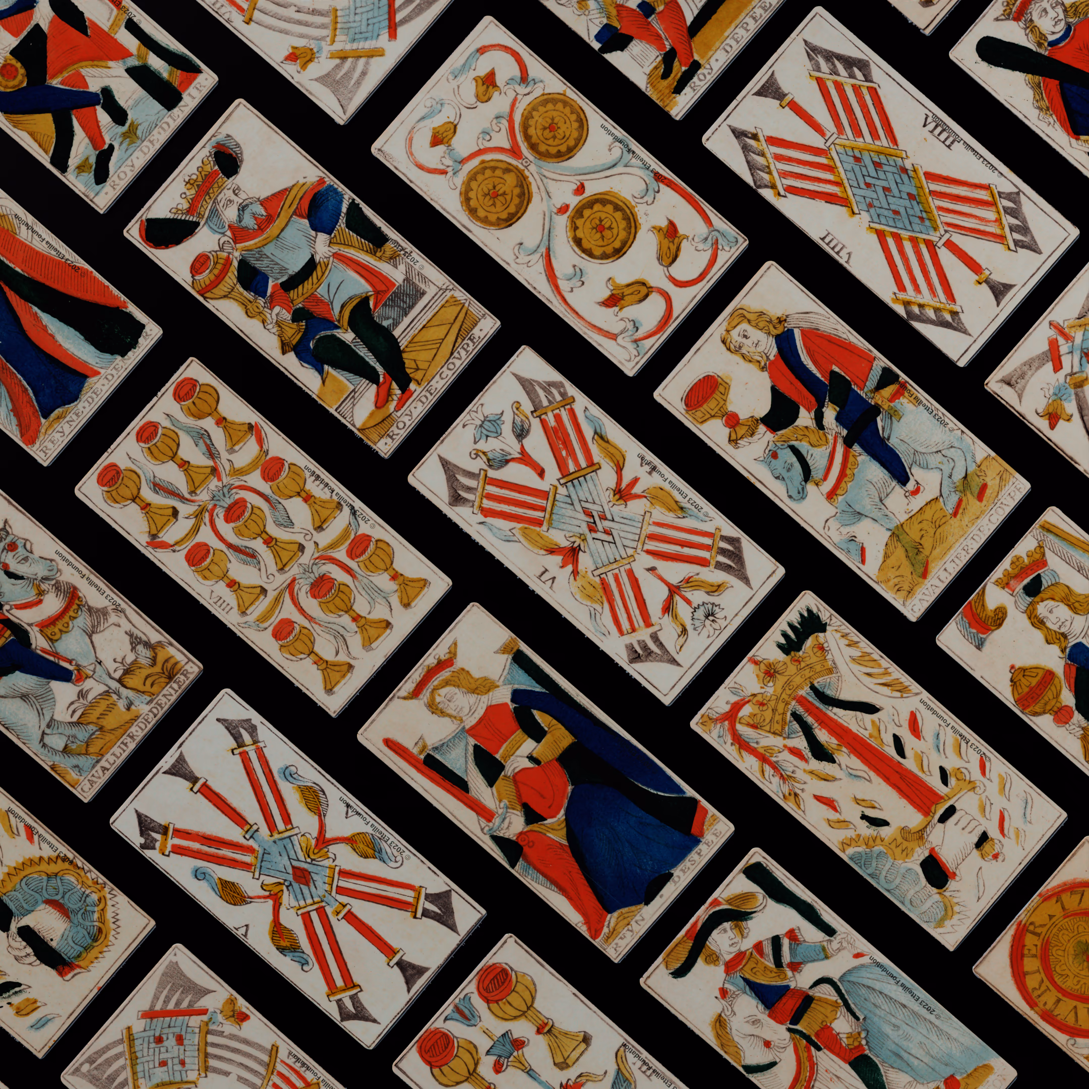 This very rare deck produced in France by Joseph Feautrier in 1792 uniquely use Italian suits and card designs instead of the French ones making this deck one of a kind for his time. To this day it remains unknown why Joseph Feautrier decided to copy the Italian style.