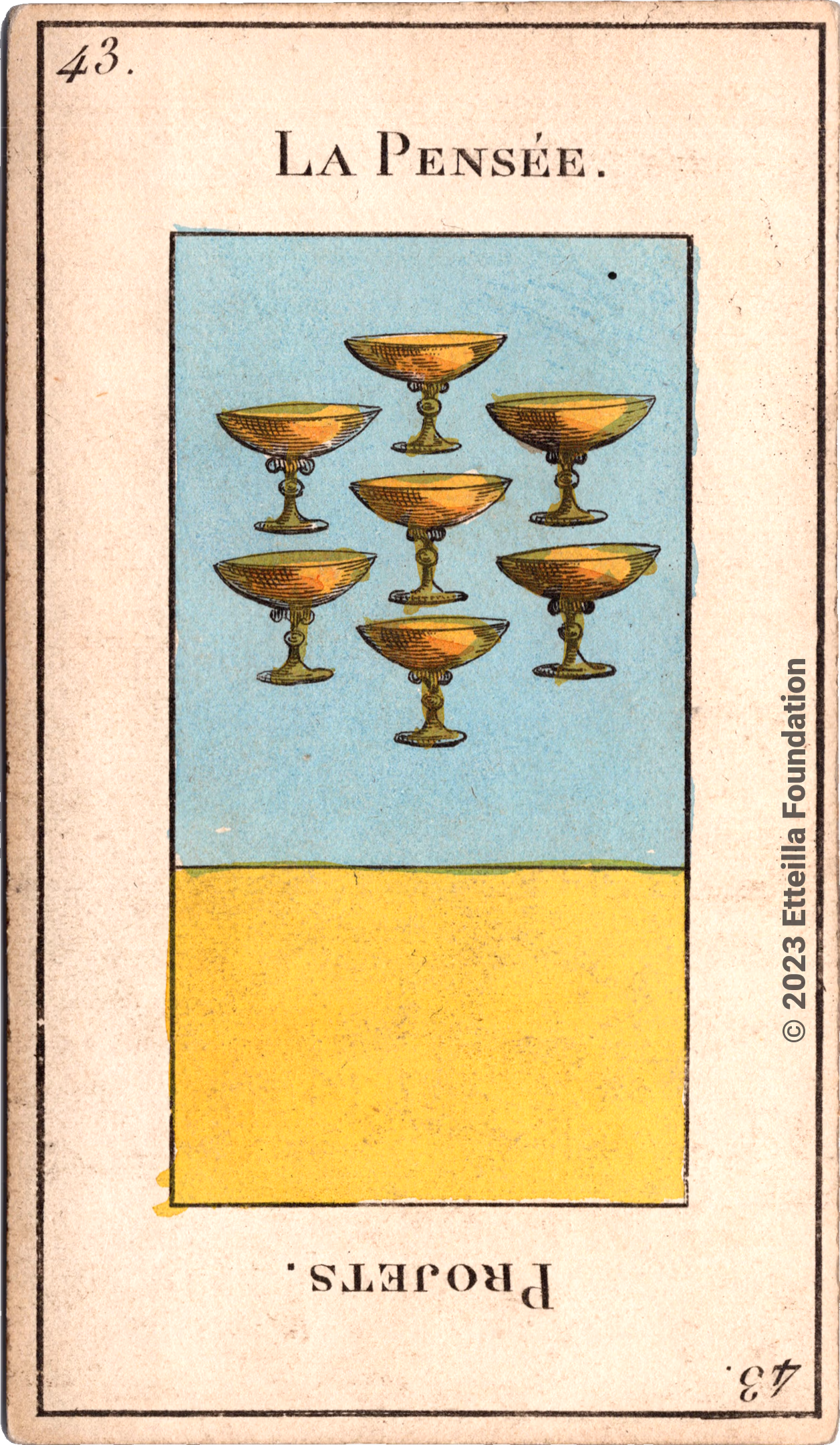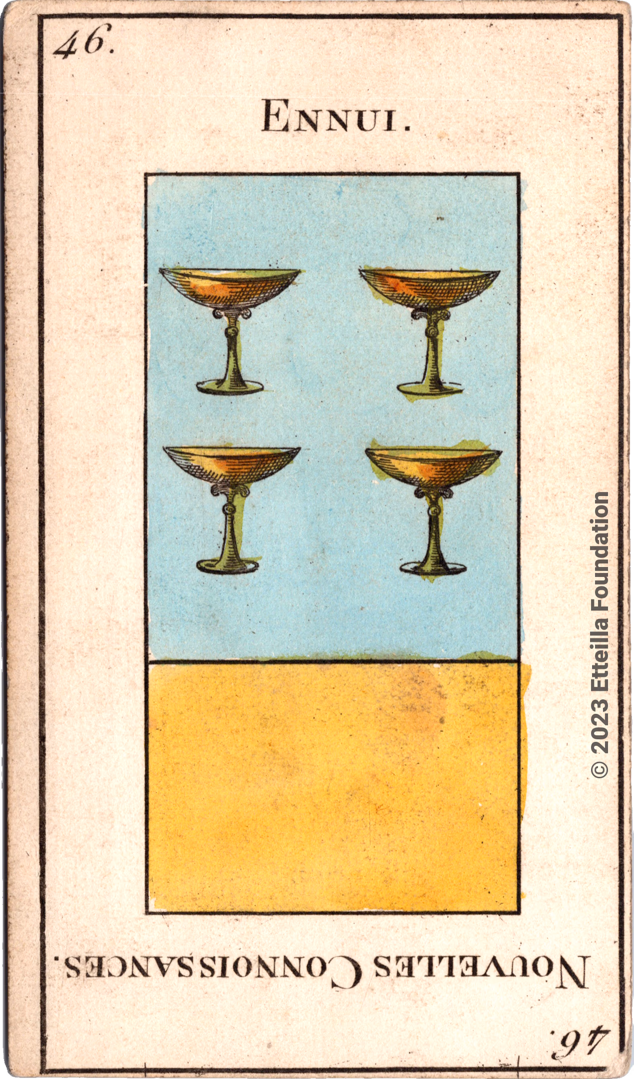 This version is believed to be the first edition as it has all the typographical errors of the first printing, including some words not properly oriented for reading upside-down and astrological signs on only one side. It is not a later re-print such as the Pussey edition as it doesn’t have a tax stamp, which were introduced in France around 1813. Additionally, it is not the deluxe version that is rumored to exist. Our deck is complete and in very good condition but doesn’t have its box or manual.