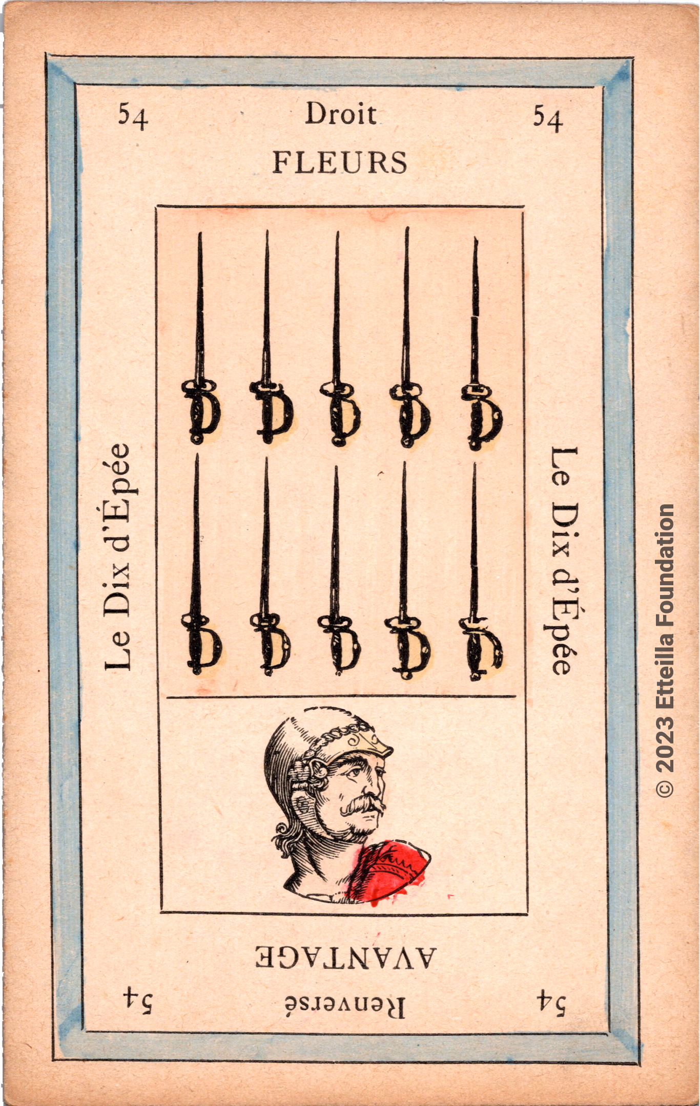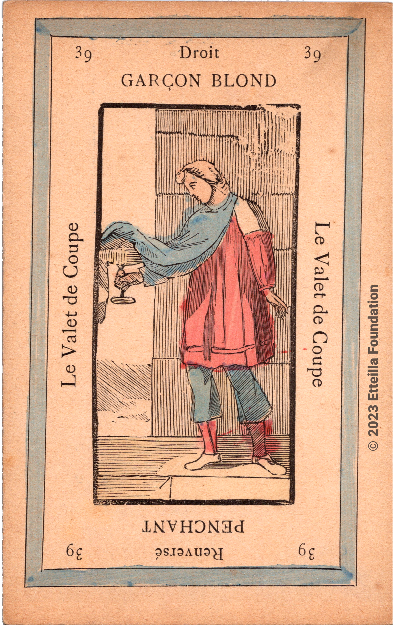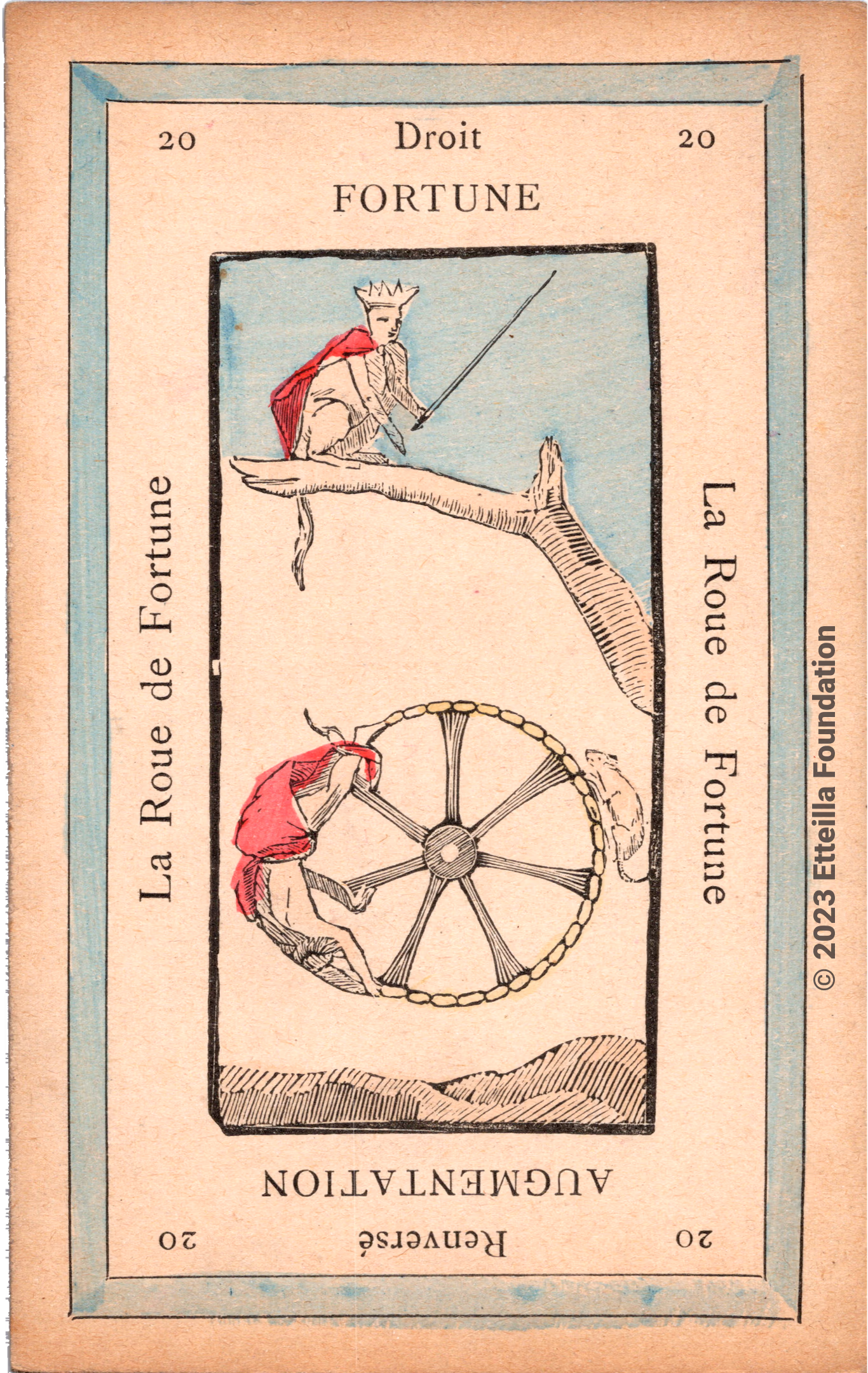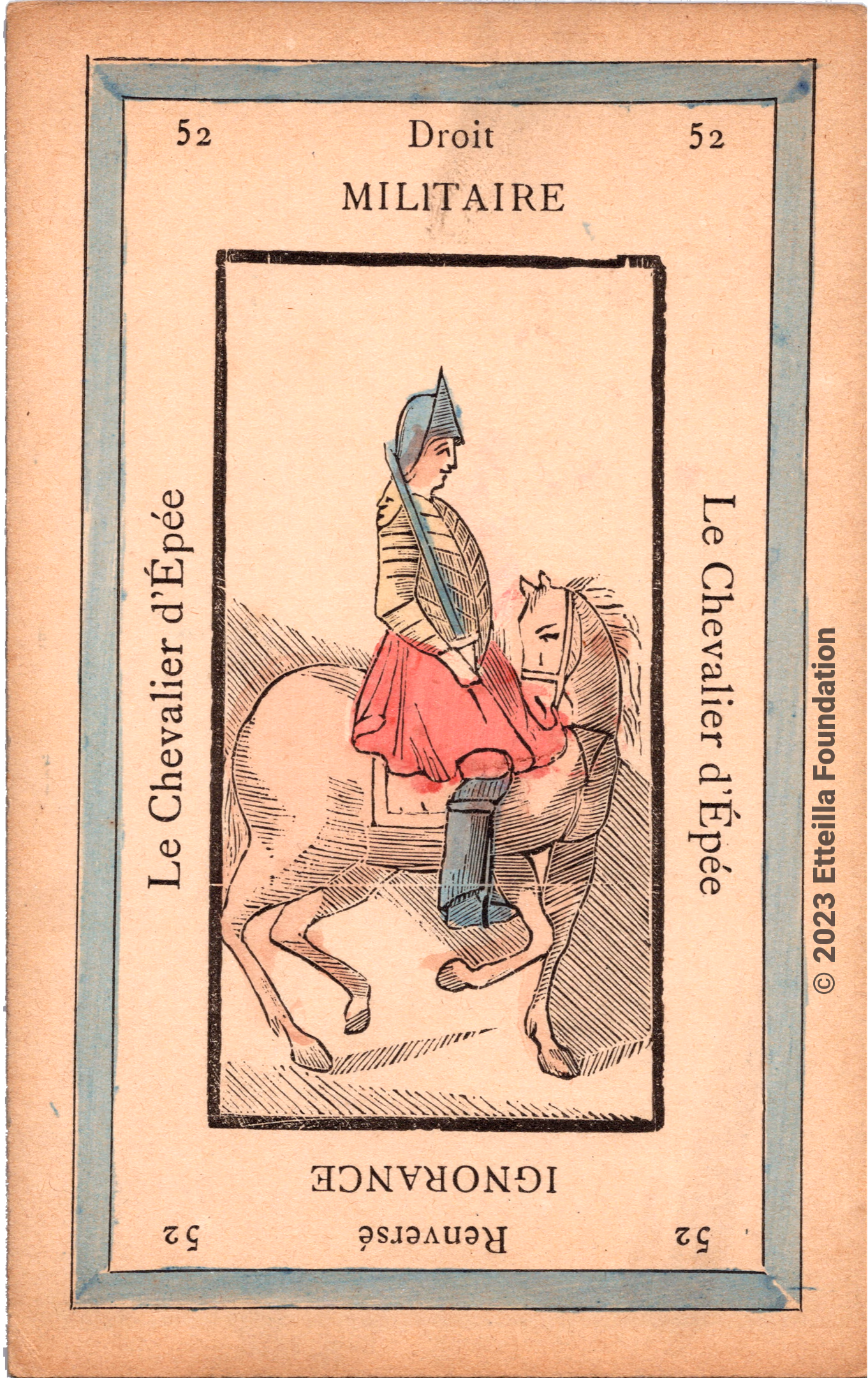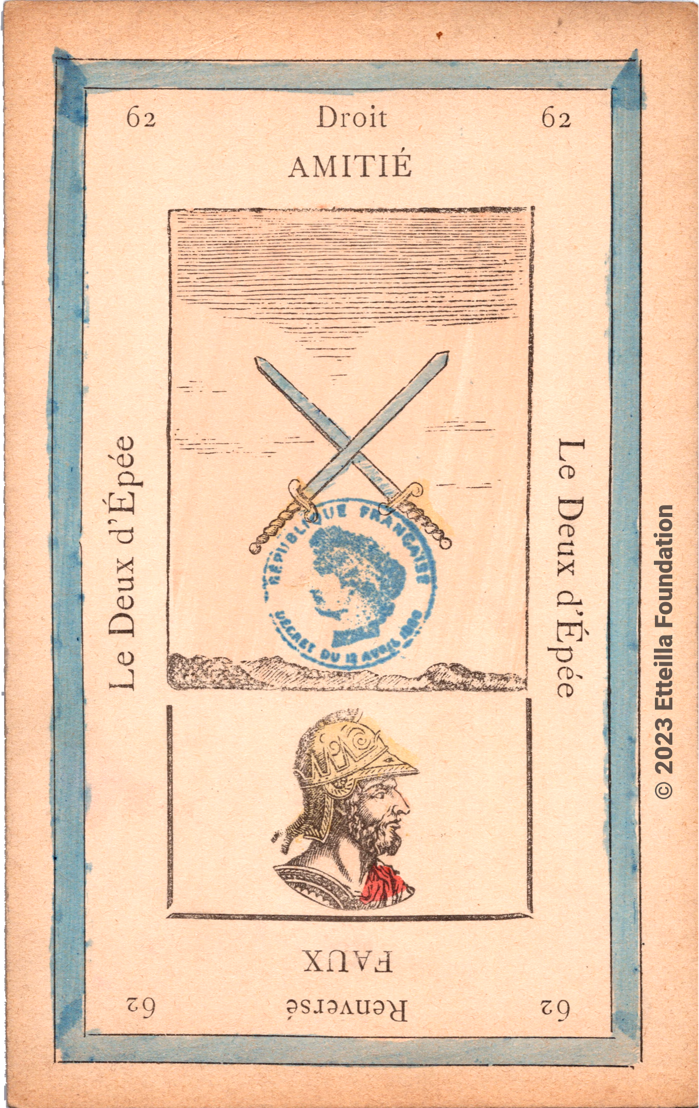 In 1838 Simon Blocquel, a student of Etteilla, published this updated version of the Etteilla tarot deck under the title “Grand livre de Thot.”. This version is commonly known as the Lismon Etteilla or Etteilla Type II.