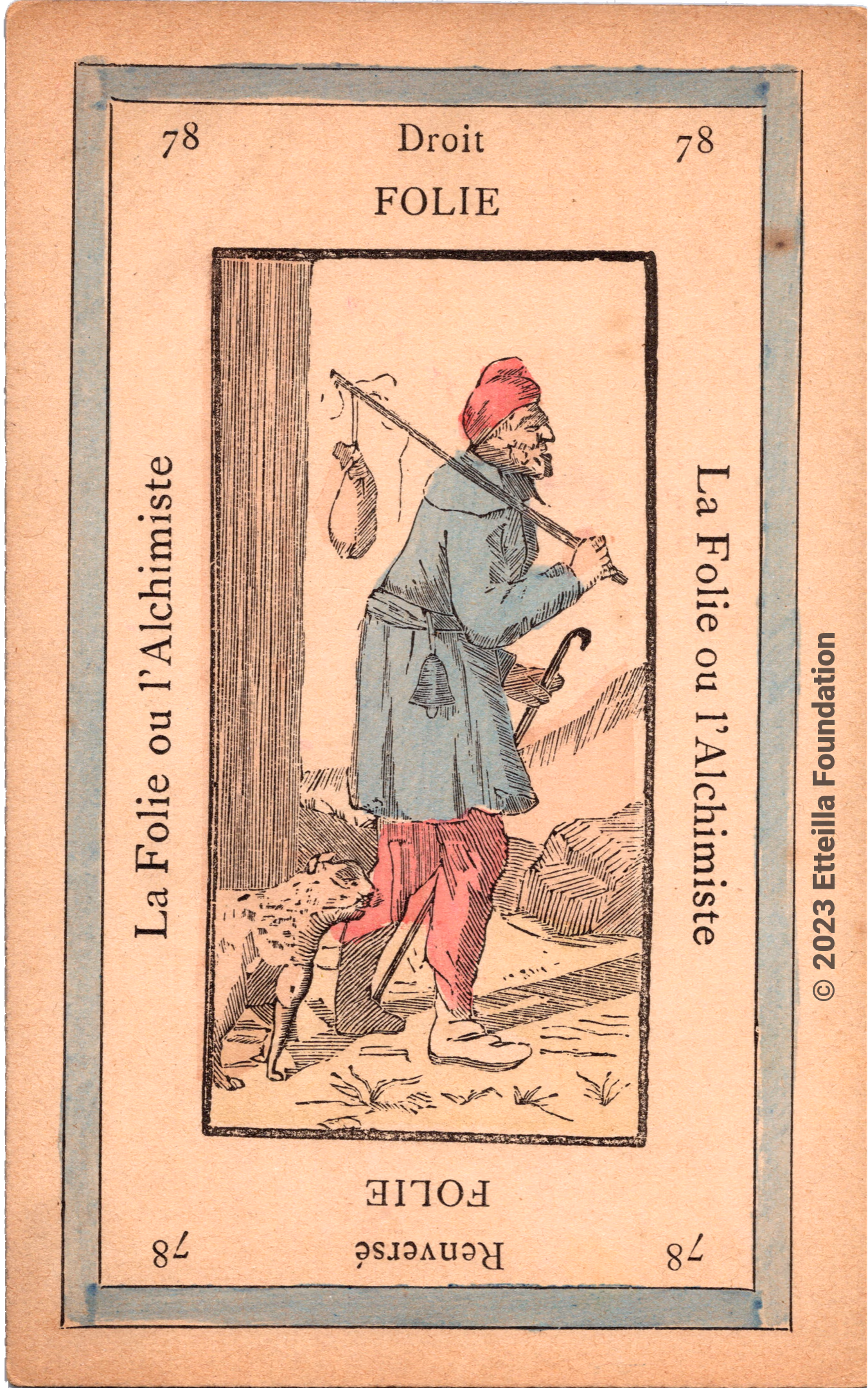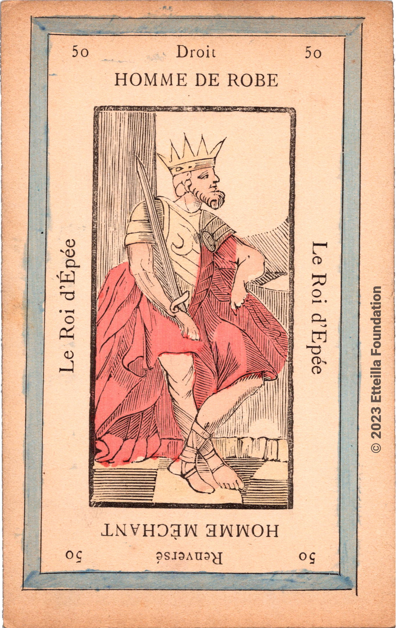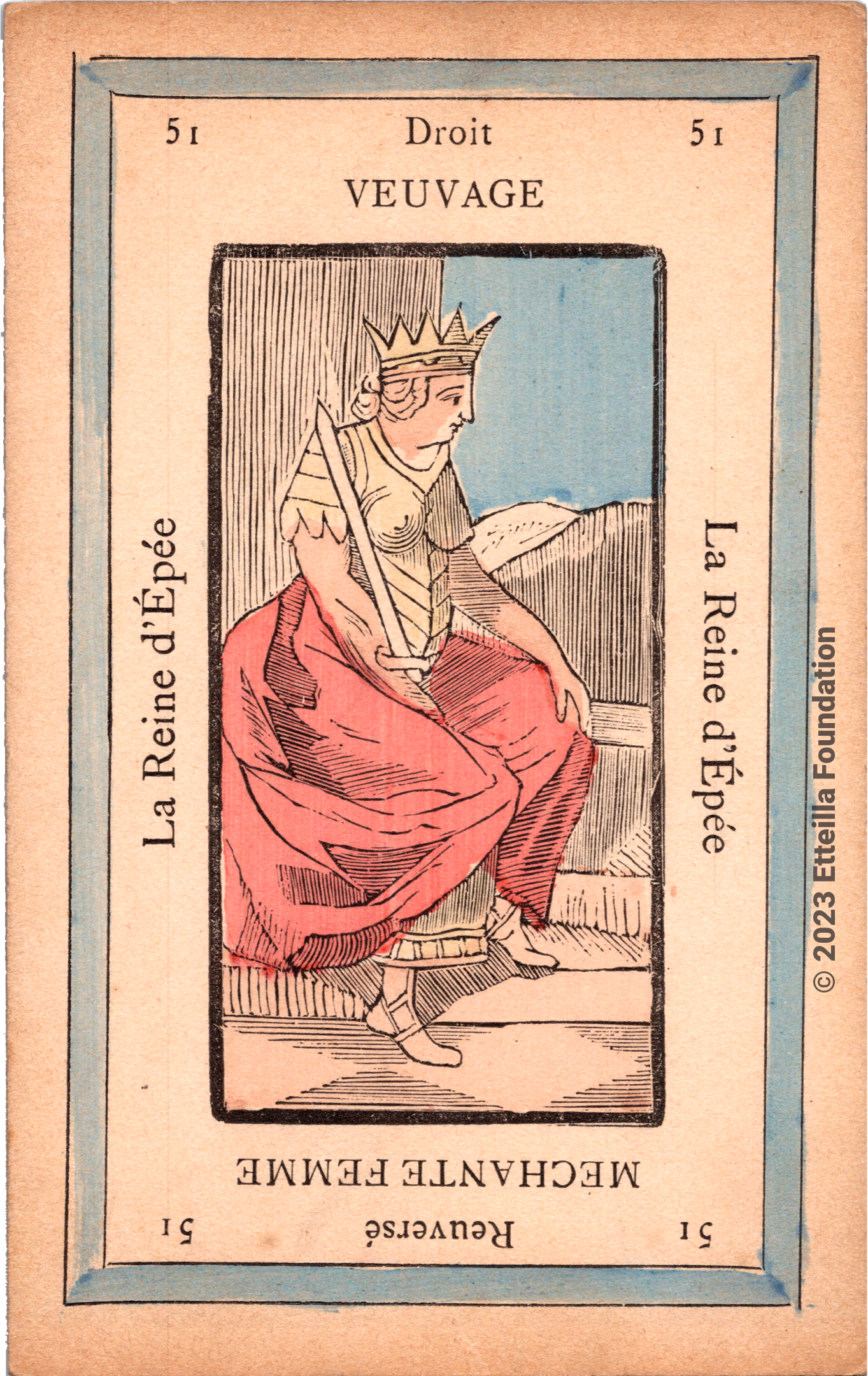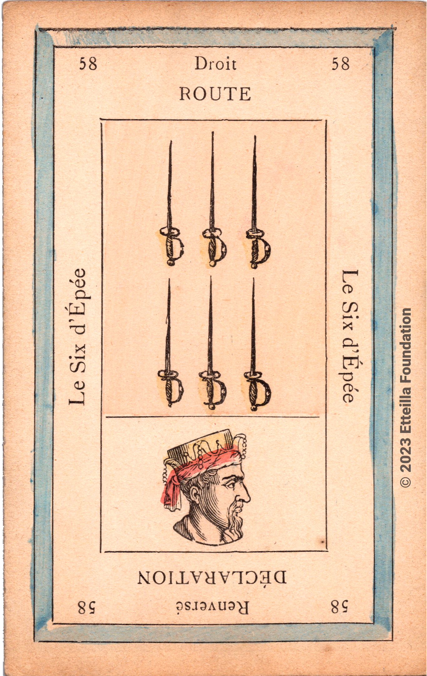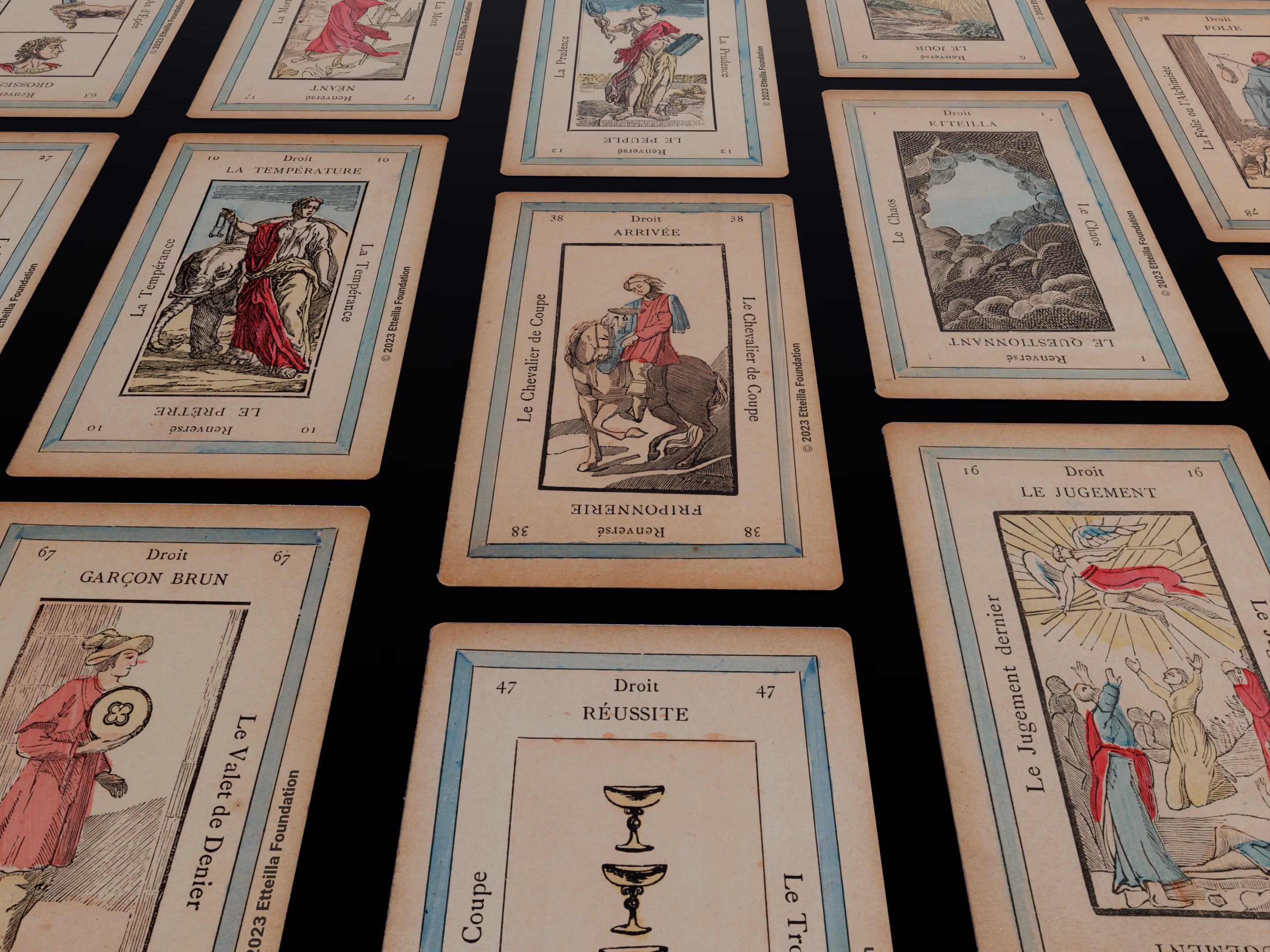 In 1838 Simon Blocquel, a student of Etteilla, published this updated version of the Etteilla tarot deck under the title “Grand livre de Thot.”. This version is commonly known as the Lismon Etteilla or Etteilla Type II.