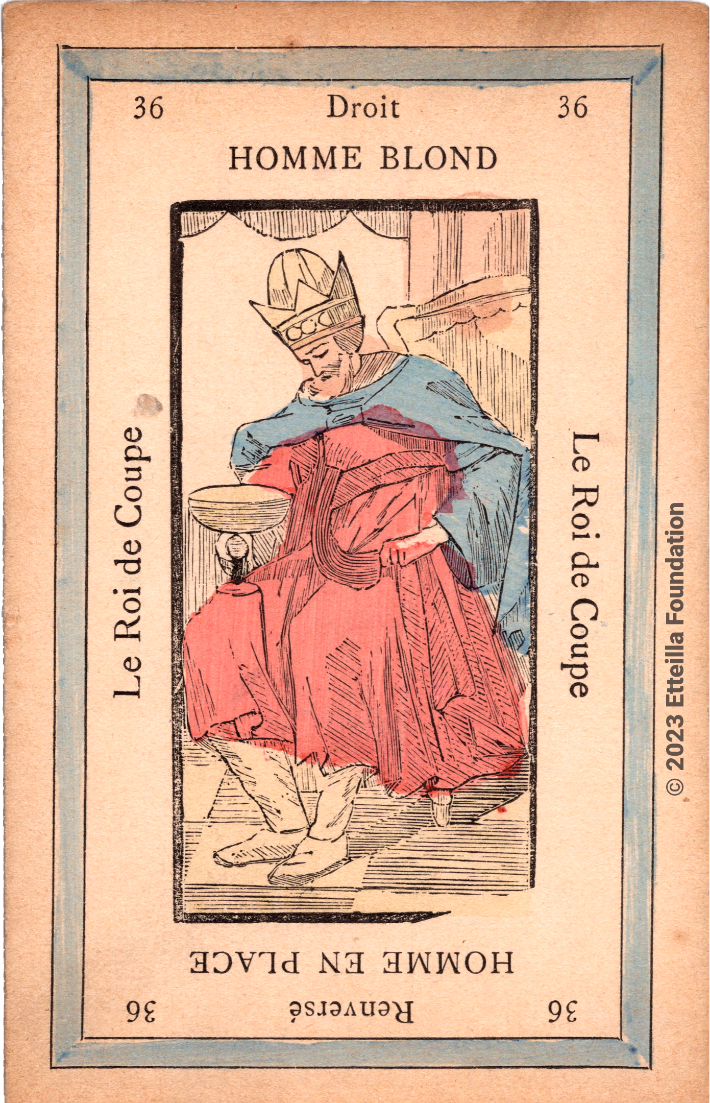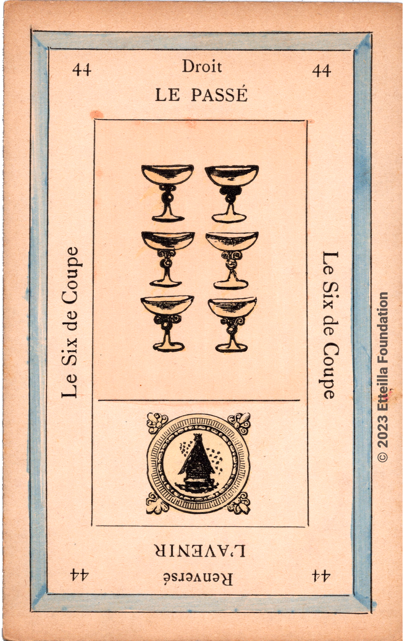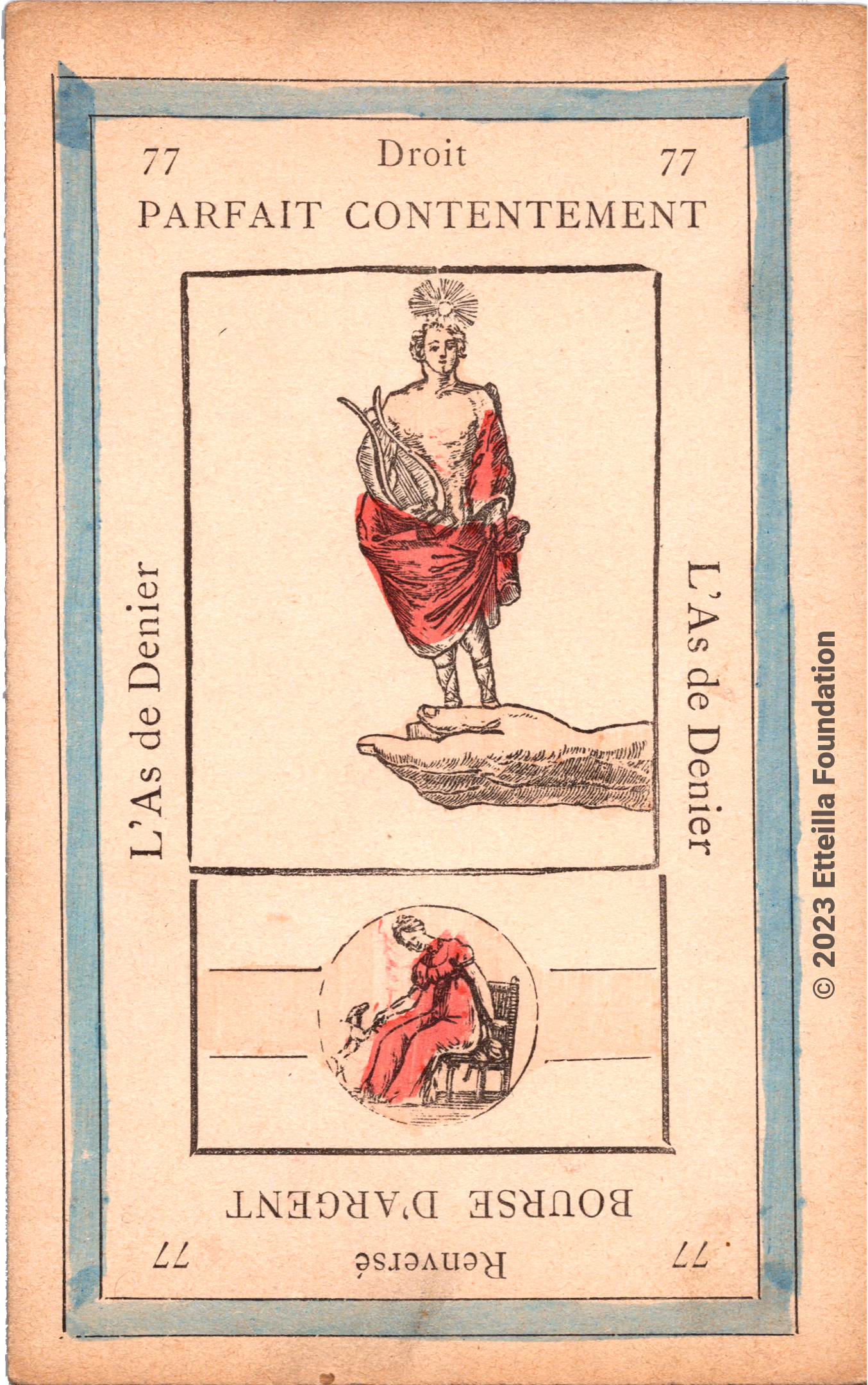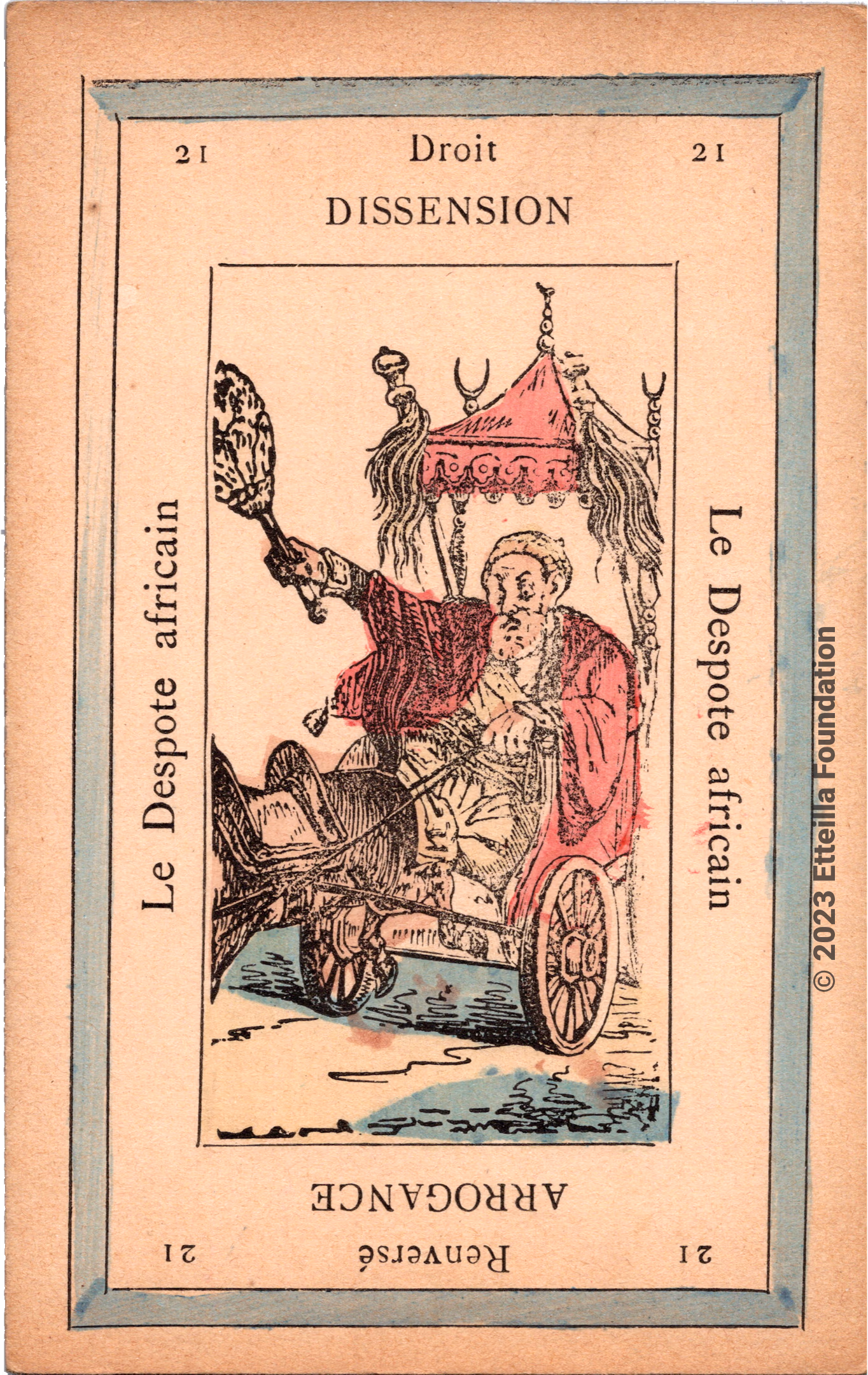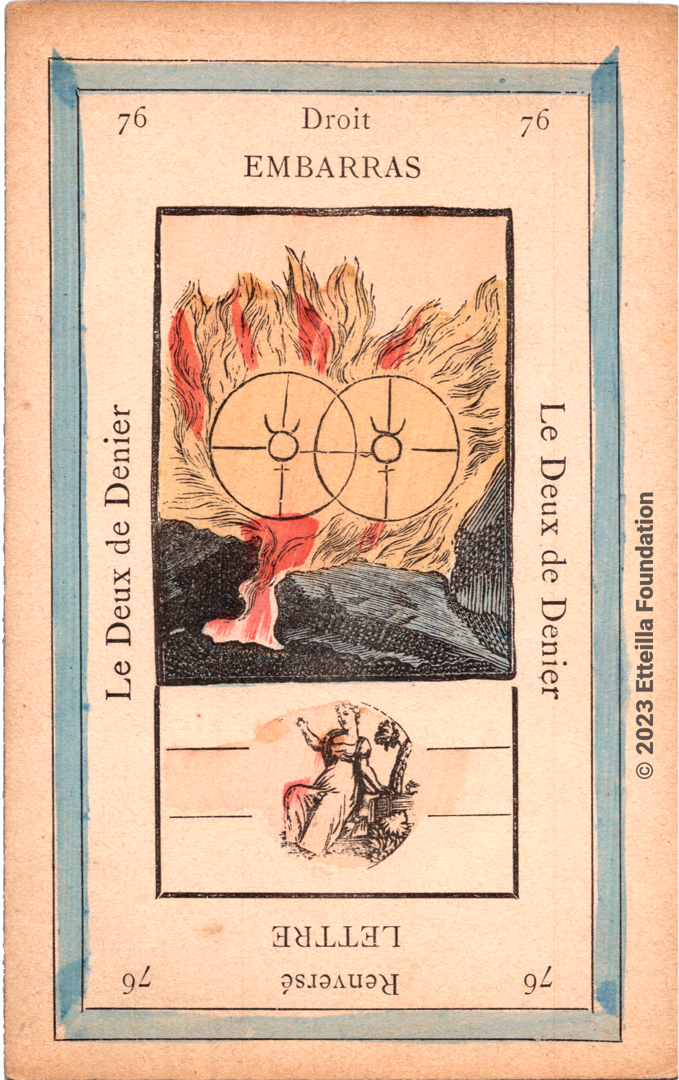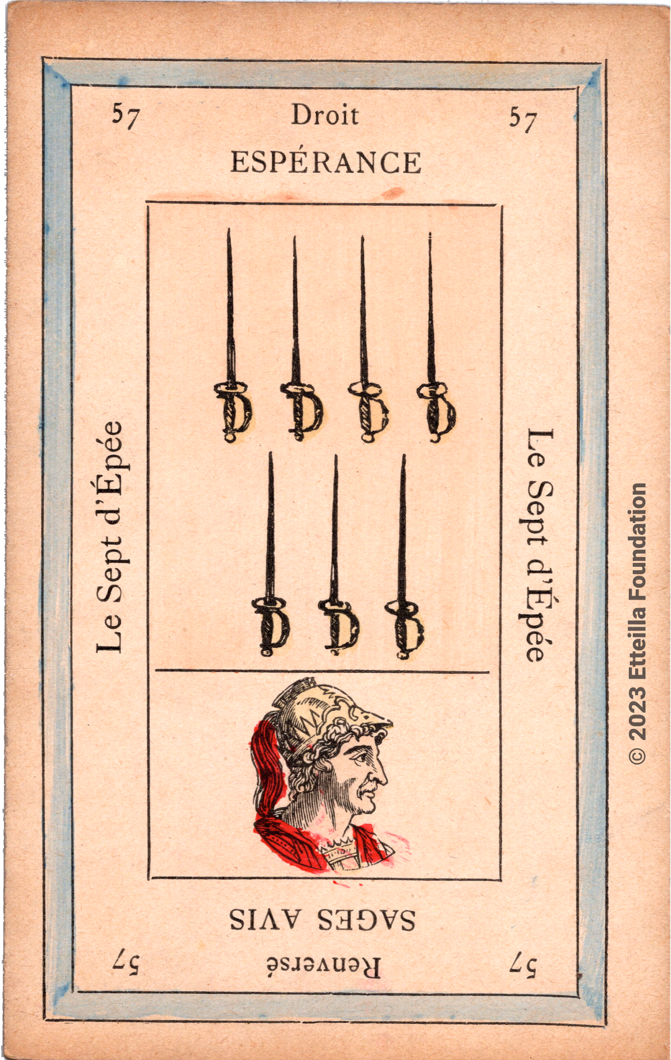 In 1838 Simon Blocquel, a student of Etteilla, published this updated version of the Etteilla tarot deck under the title “Grand livre de Thot.”. This version is commonly known as the Lismon Etteilla or Etteilla Type II.