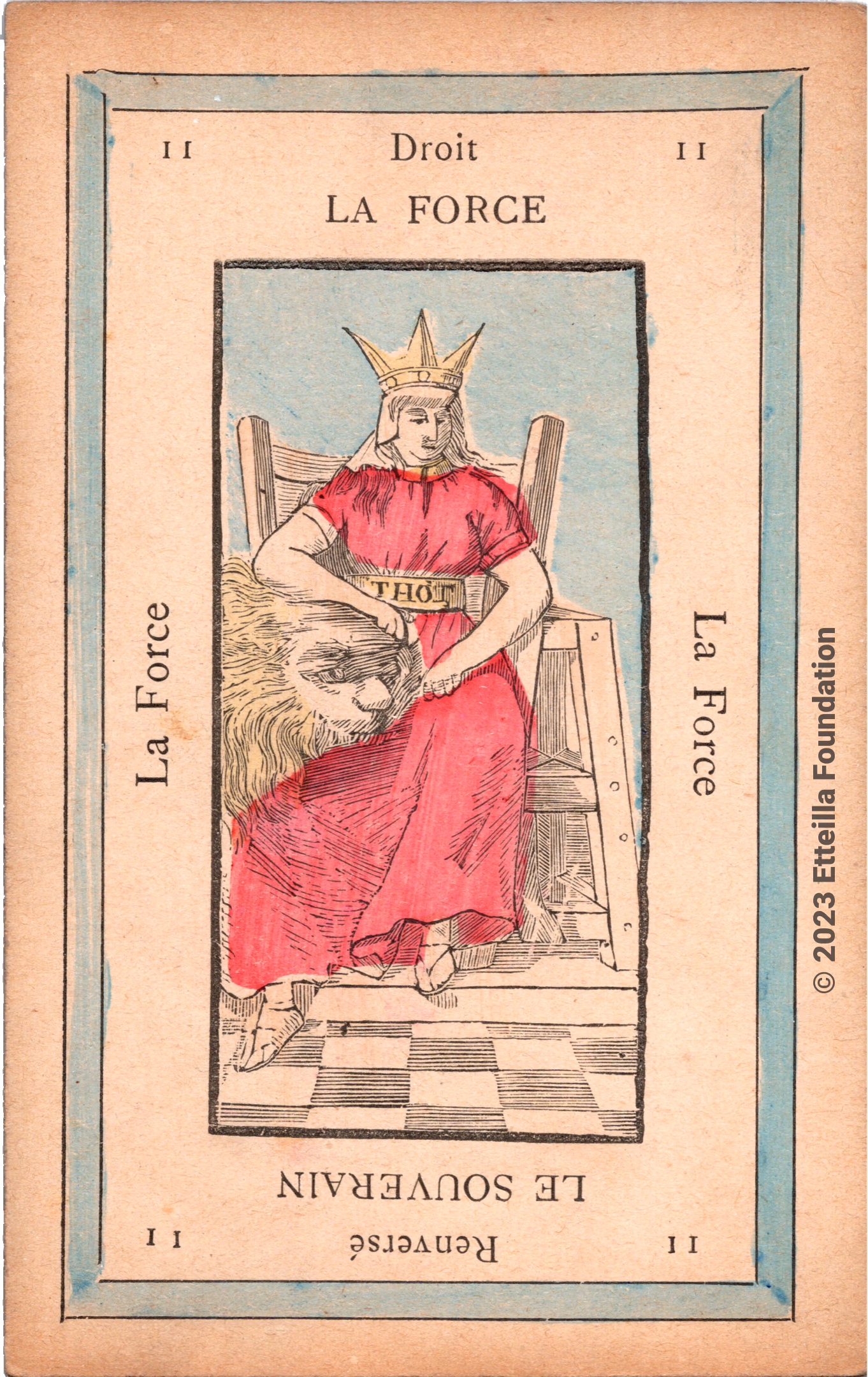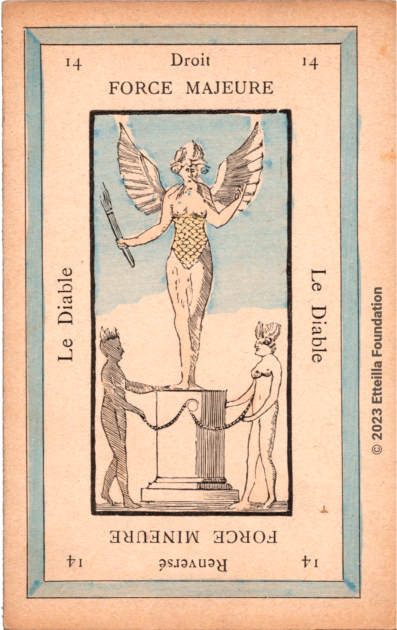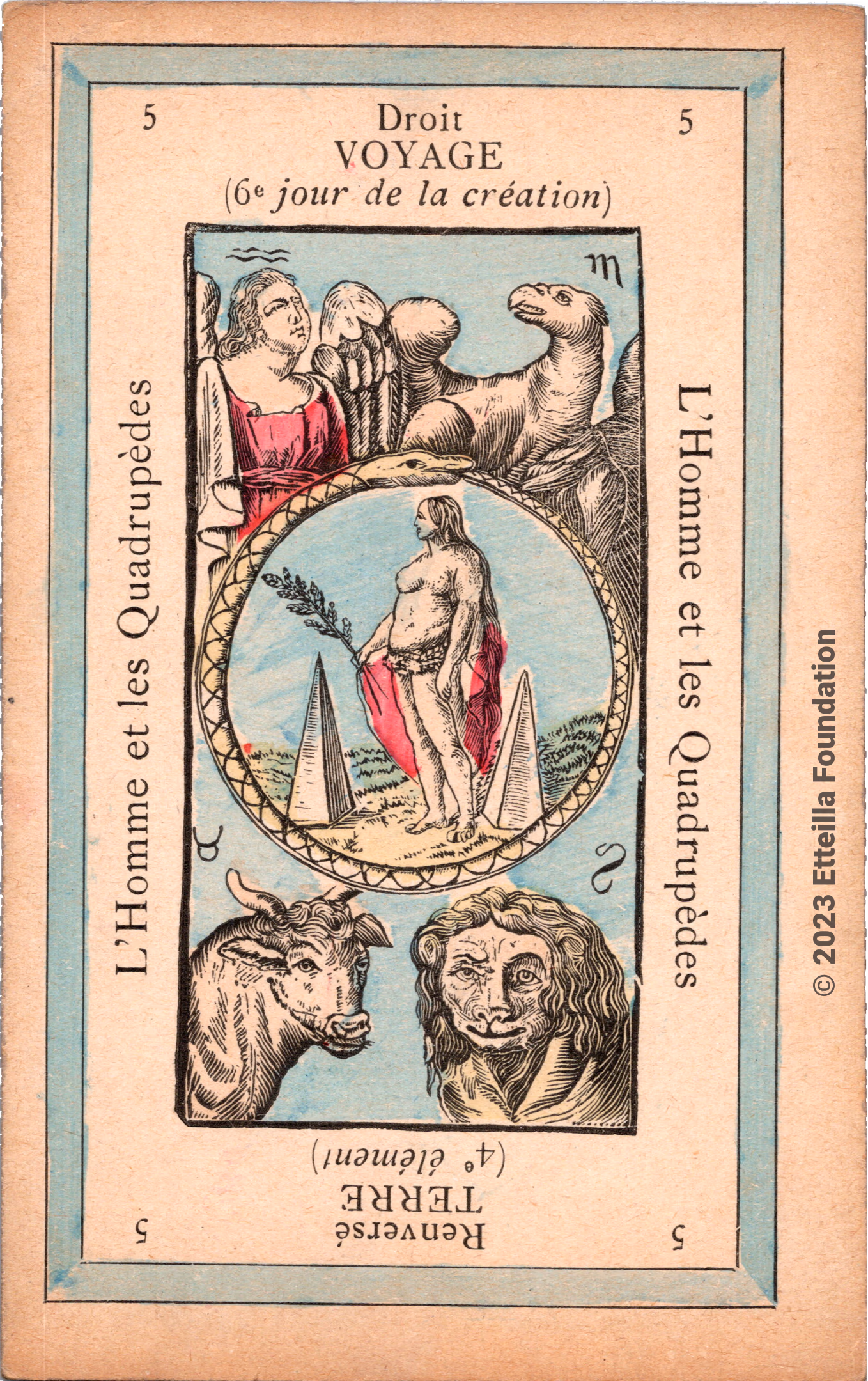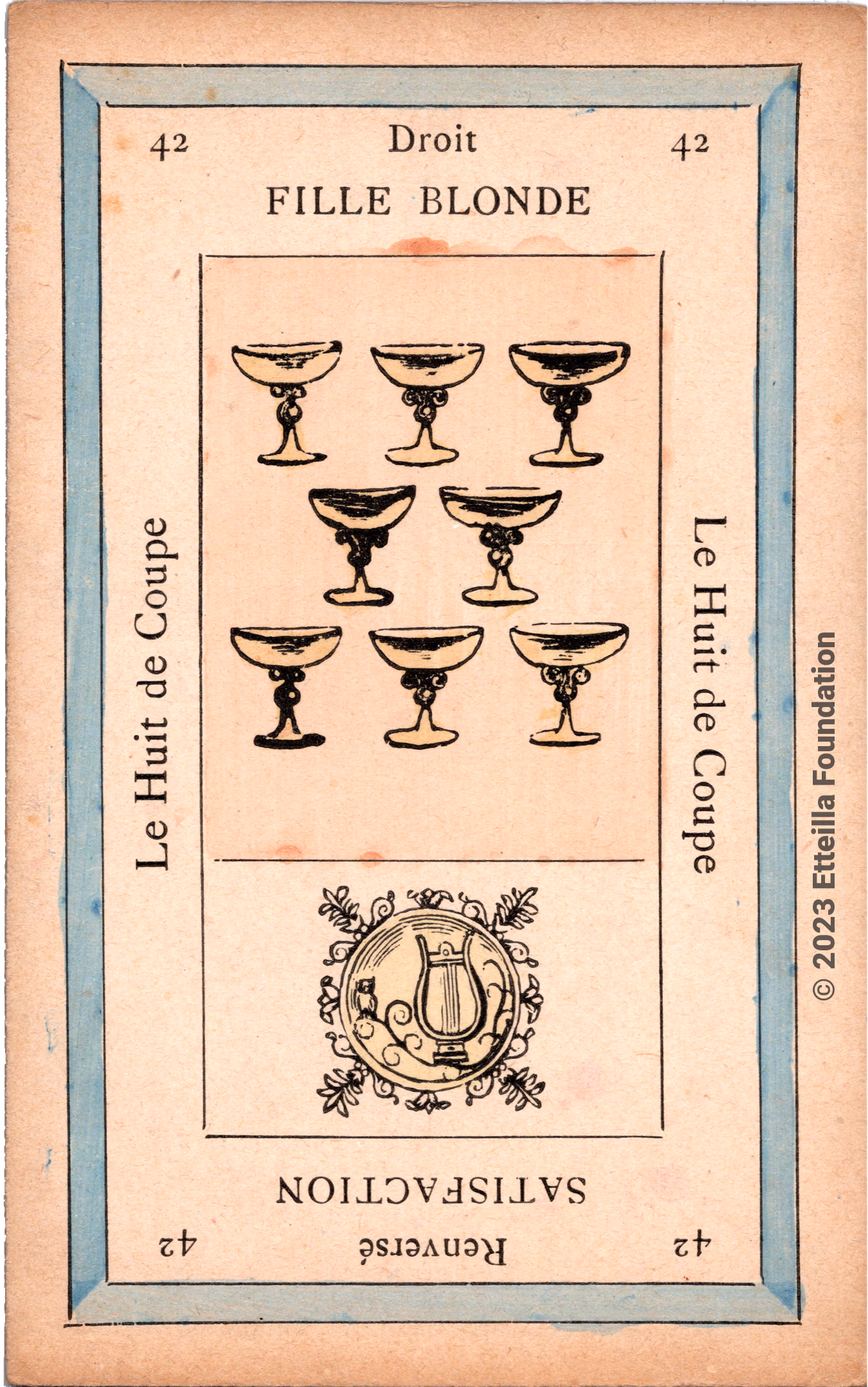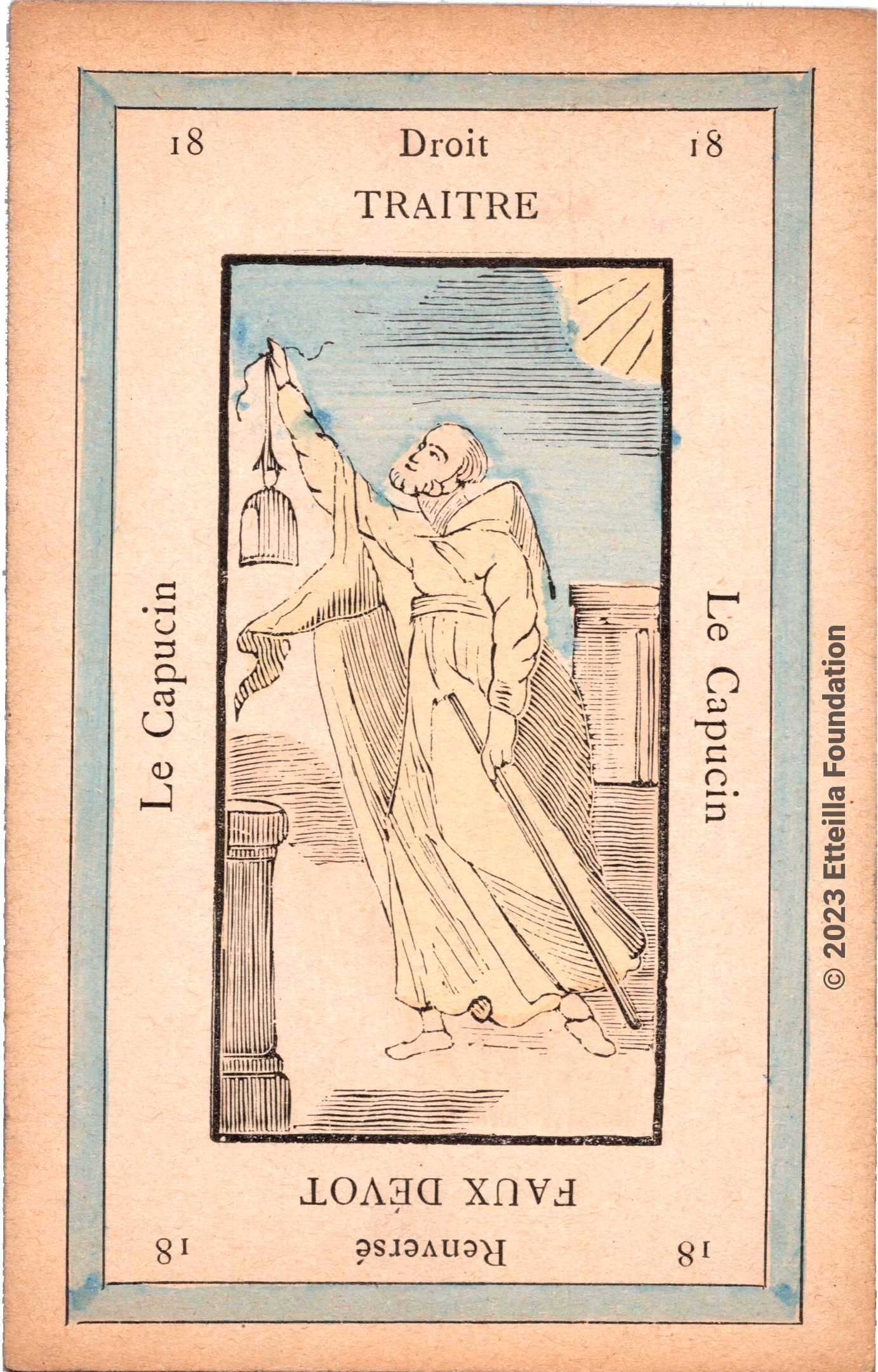 In 1838 Simon Blocquel, a student of Etteilla, published this updated version of the Etteilla tarot deck under the title “Grand livre de Thot.”. This version is commonly known as the Lismon Etteilla or Etteilla Type II.