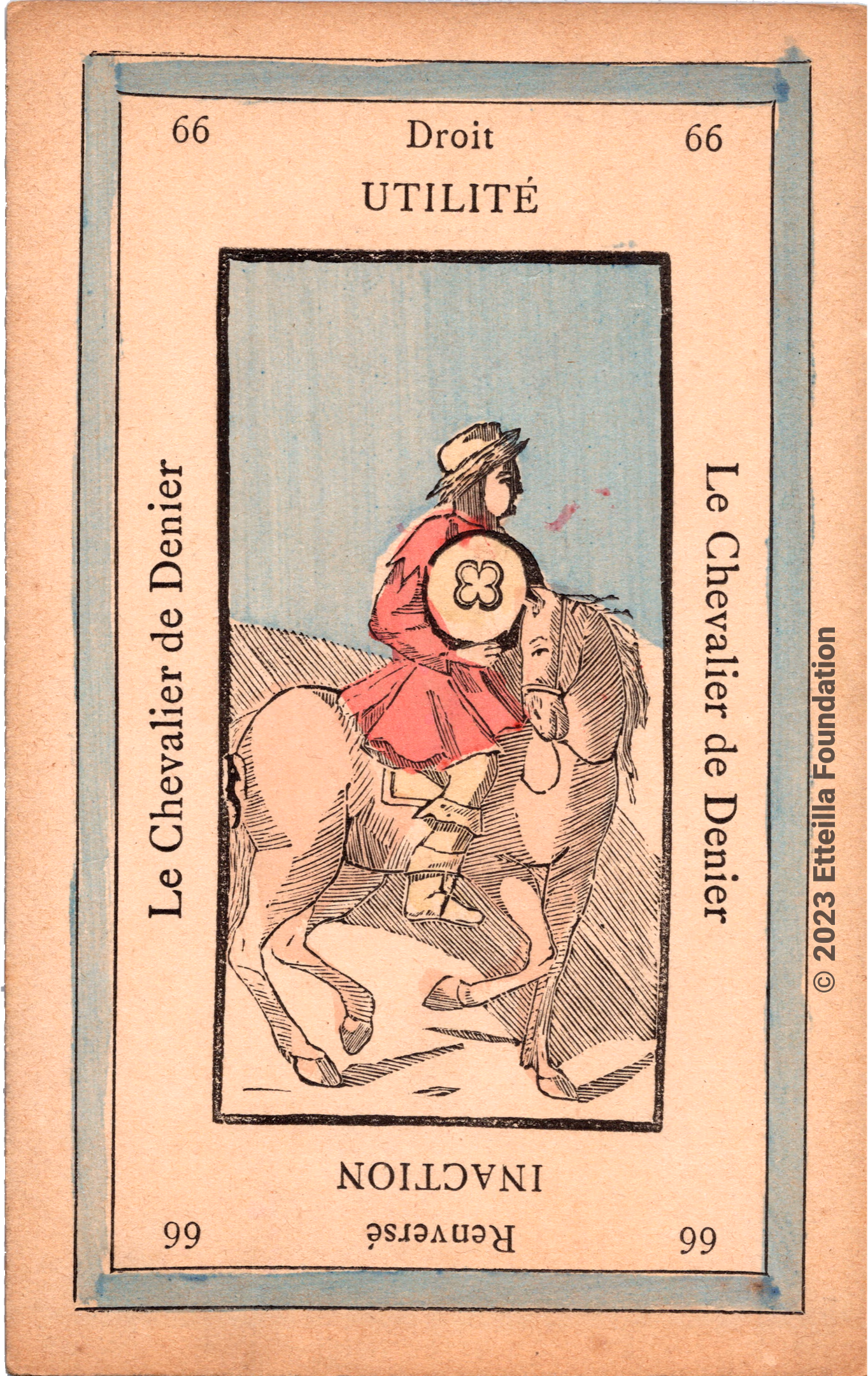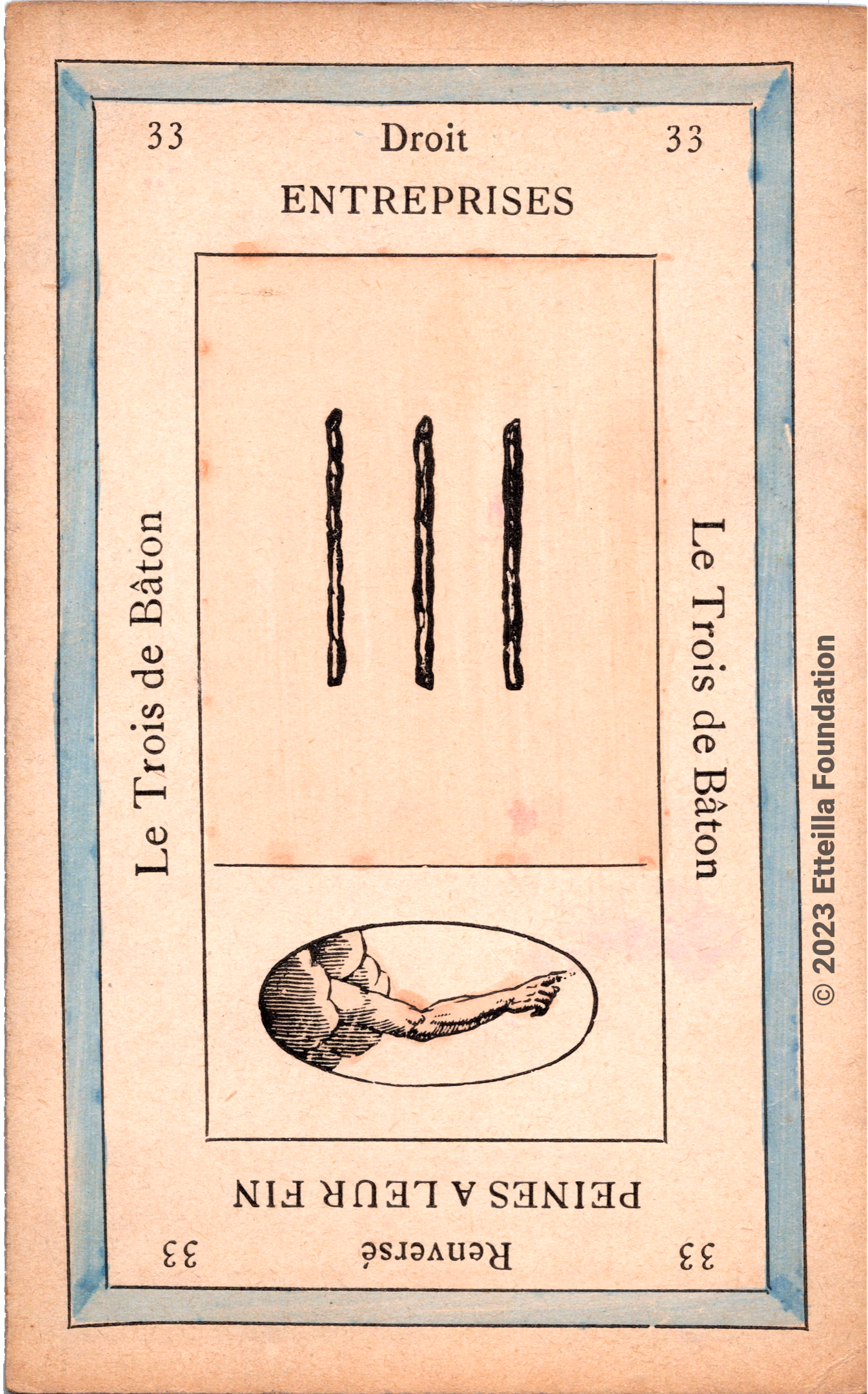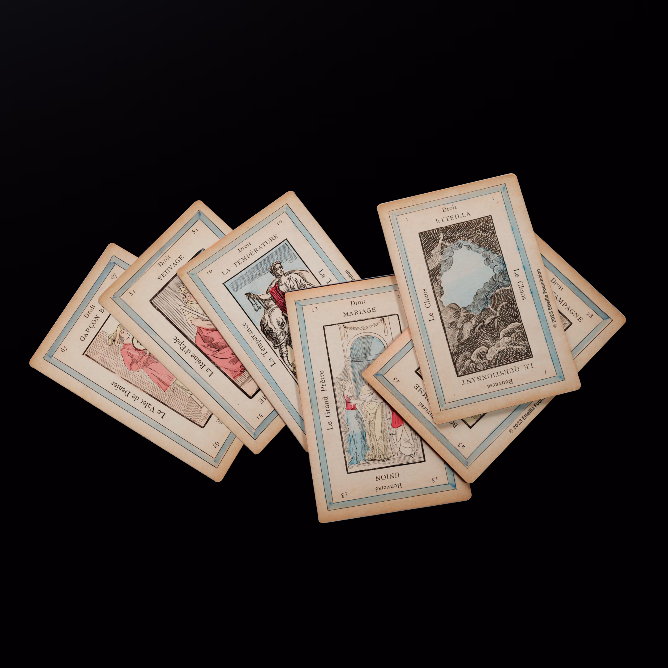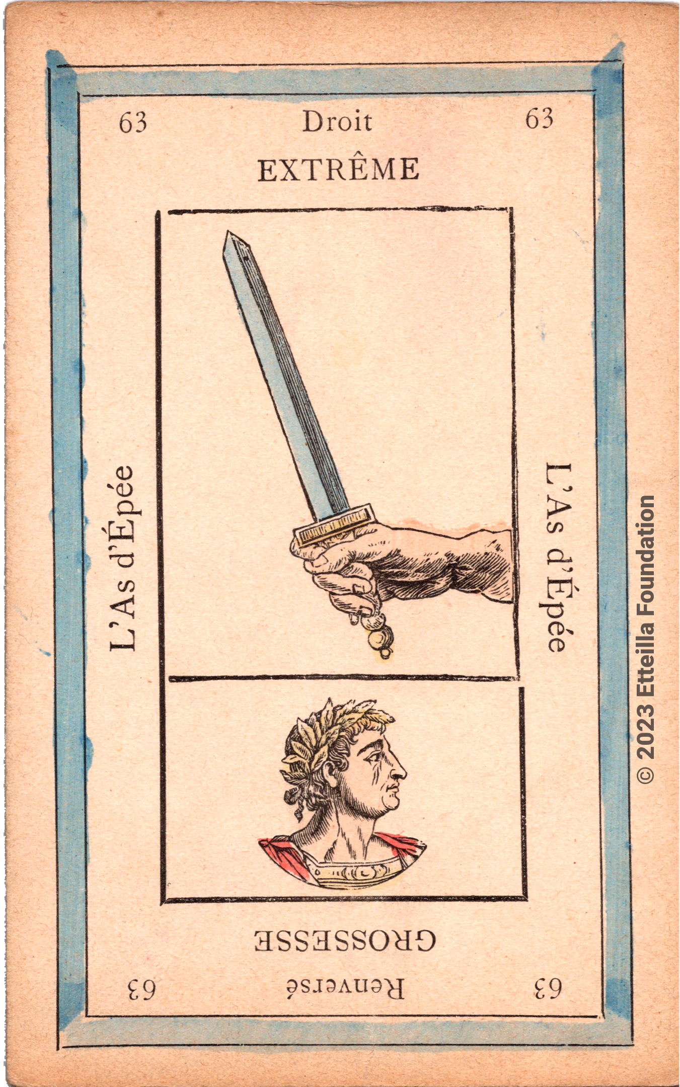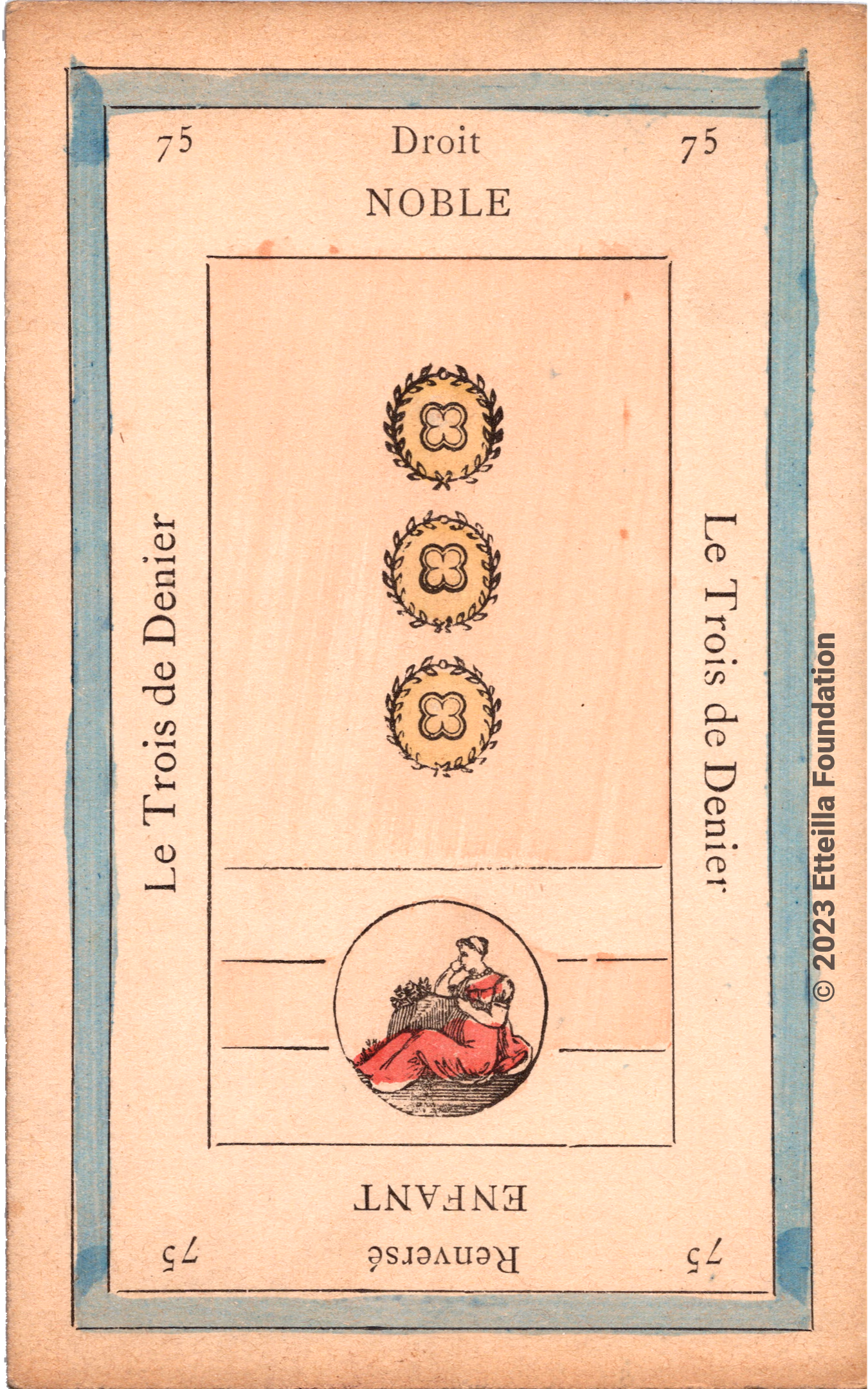 In 1838 Simon Blocquel, a student of Etteilla, published this updated version of the Etteilla tarot deck under the title “Grand livre de Thot.”. This version is commonly known as the Lismon Etteilla or Etteilla Type II.