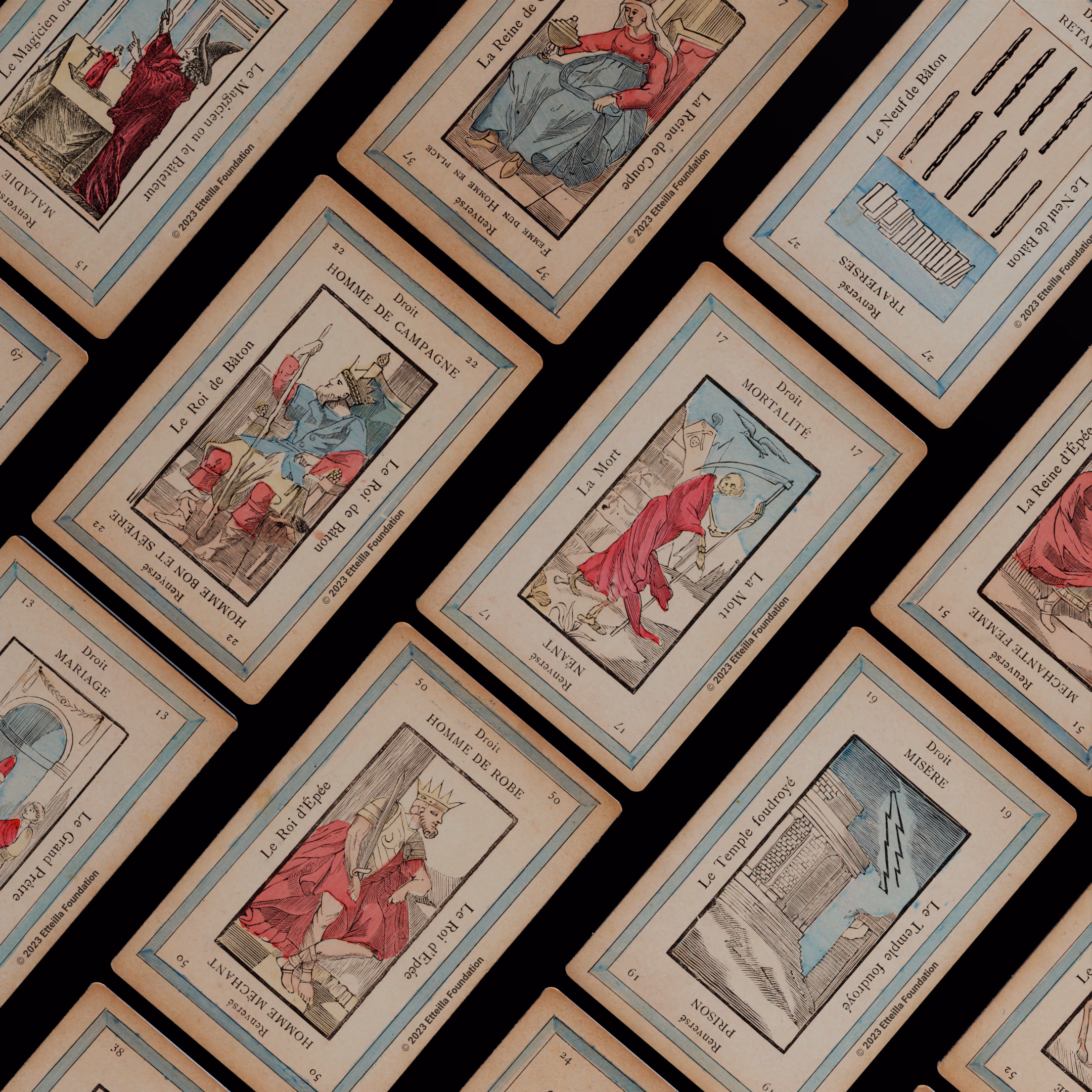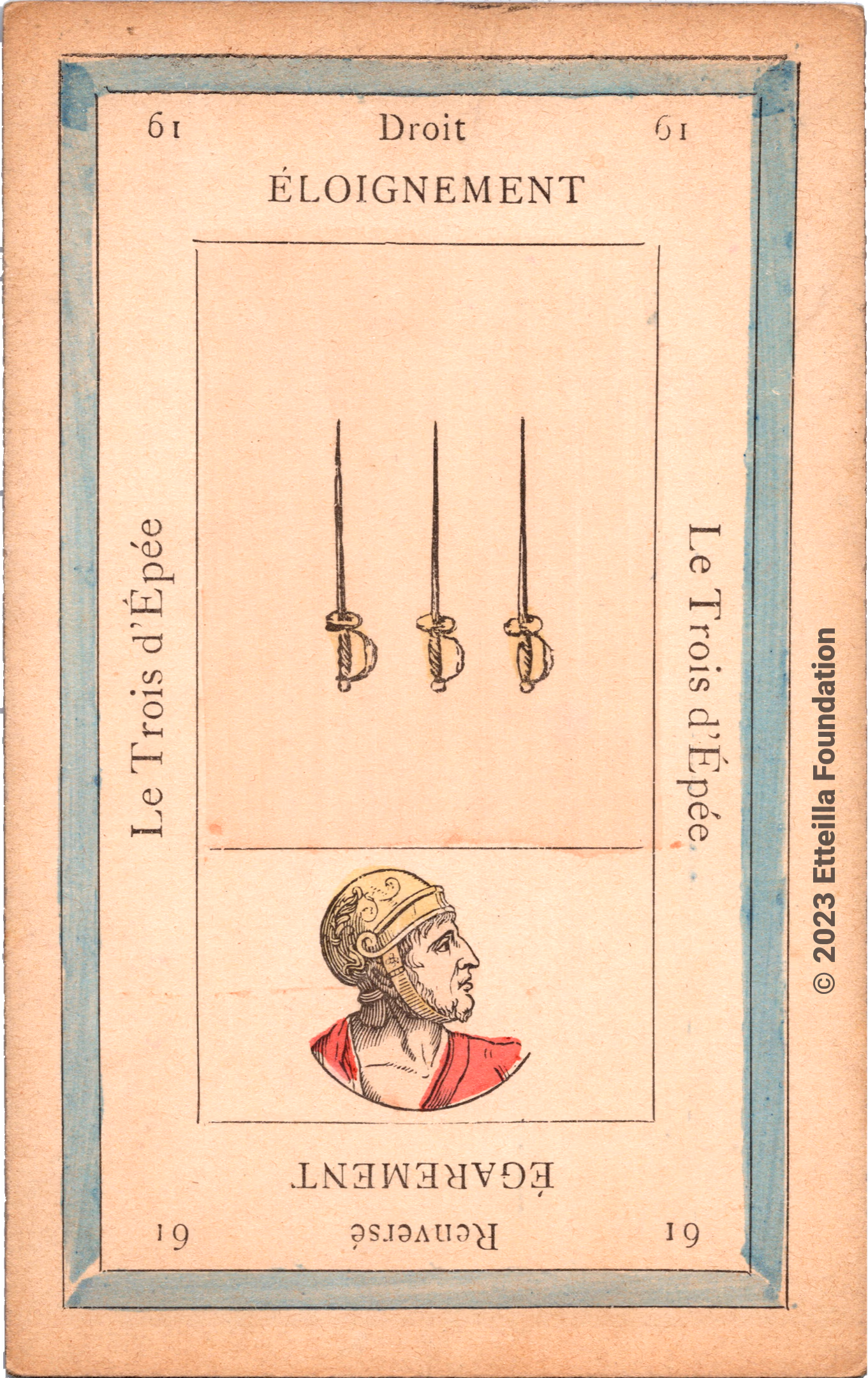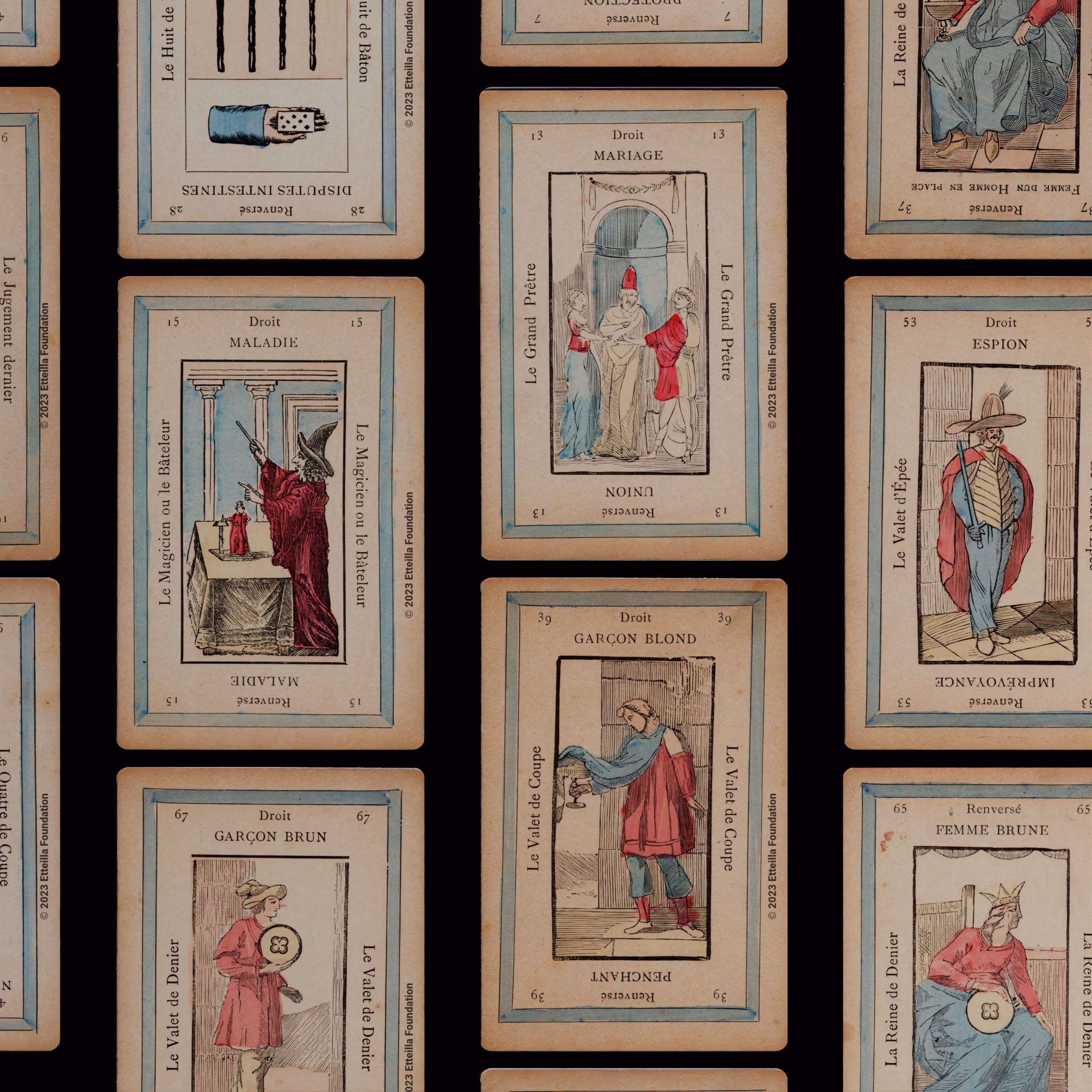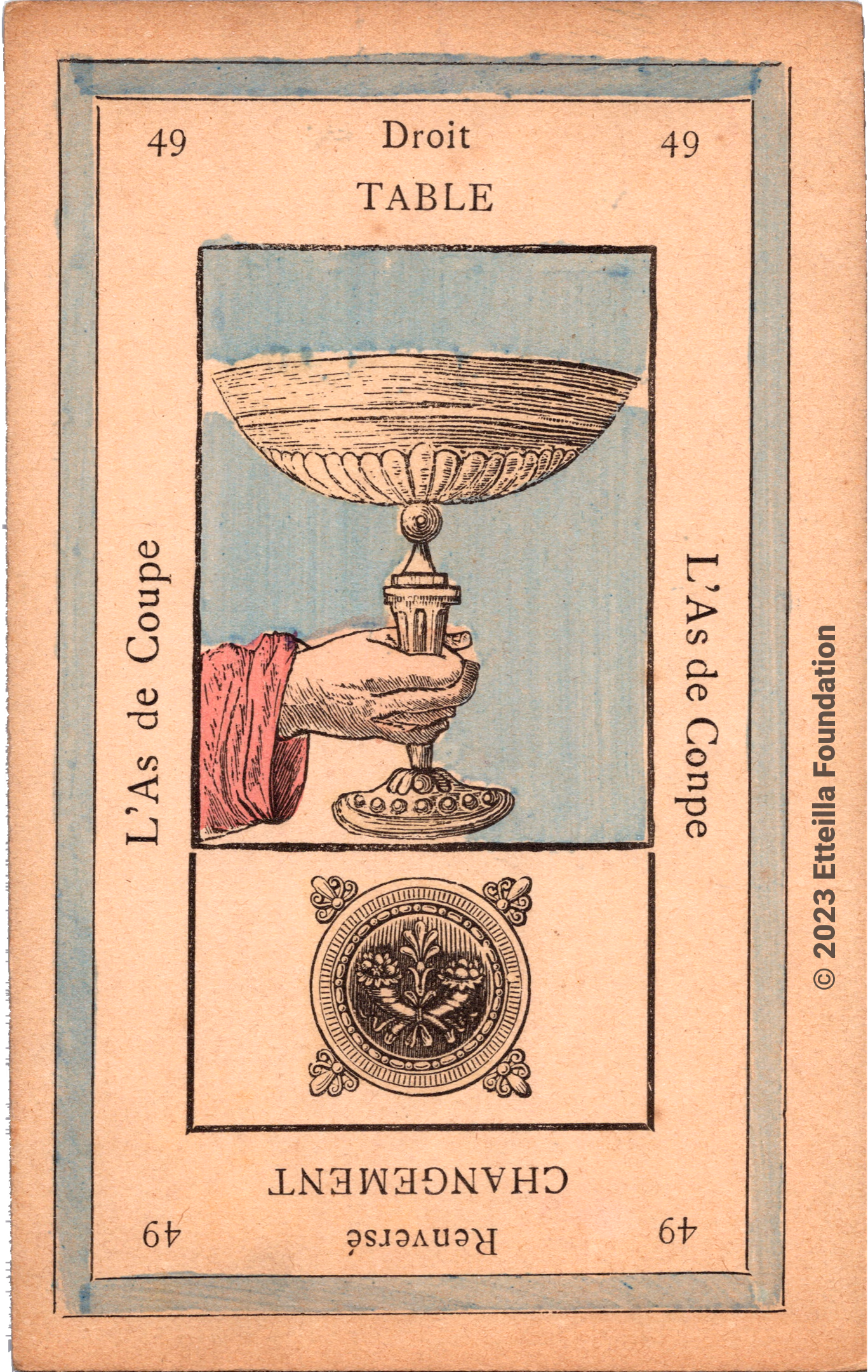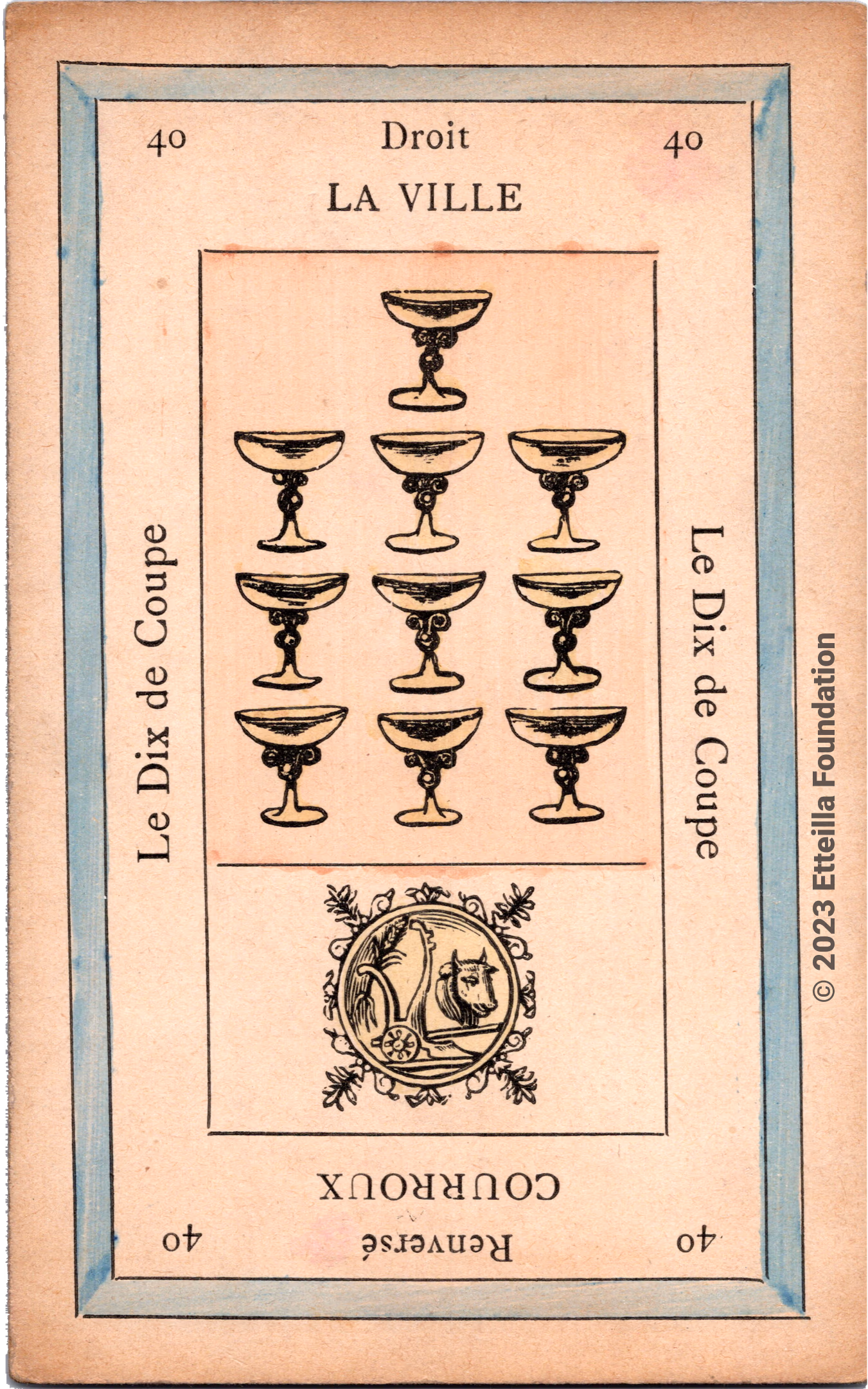 In 1838 Simon Blocquel, a student of Etteilla, published this updated version of the Etteilla tarot deck under the title “Grand livre de Thot.”. This version is commonly known as the Lismon Etteilla or Etteilla Type II.