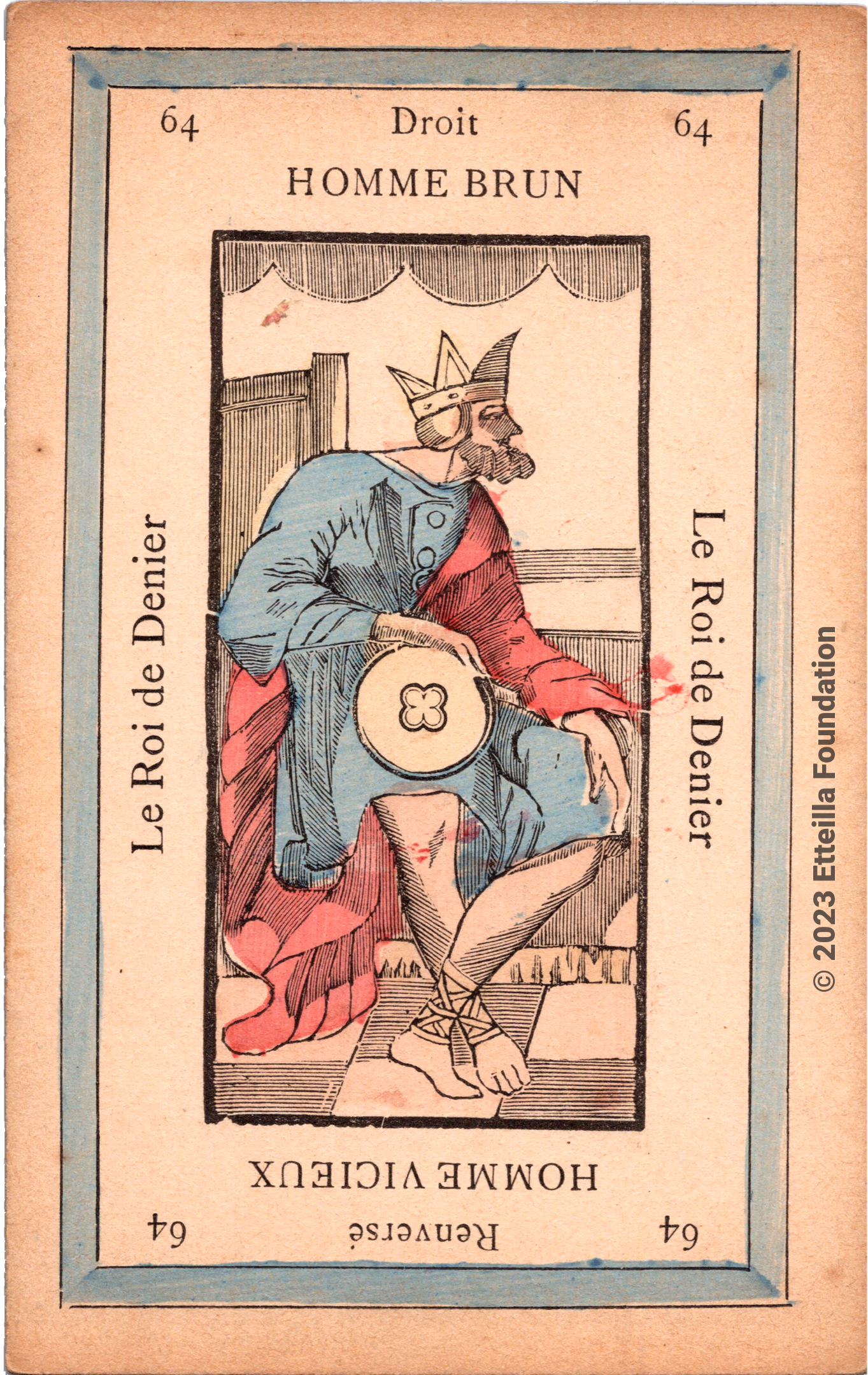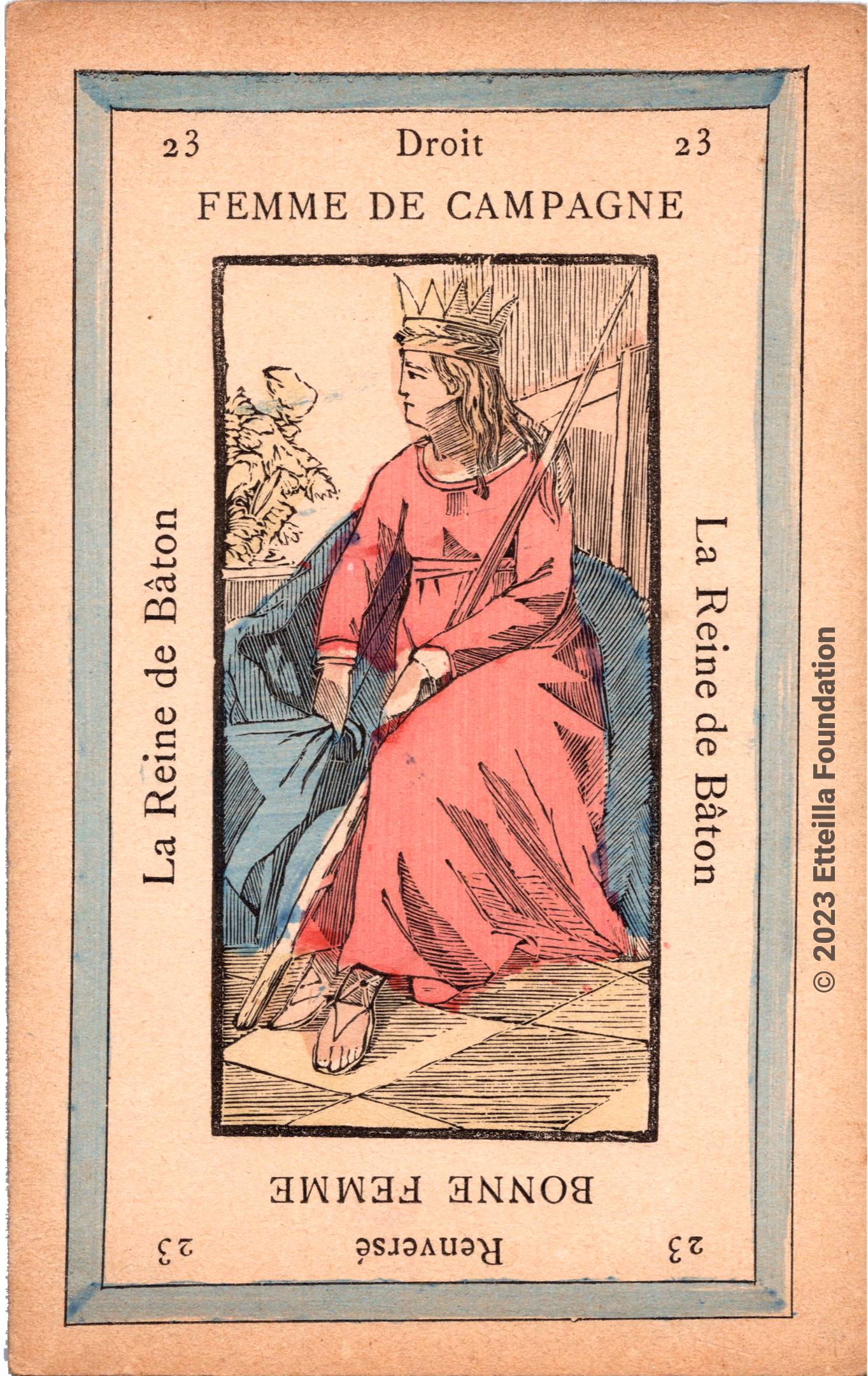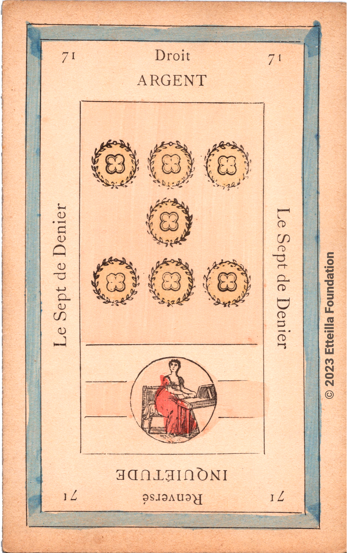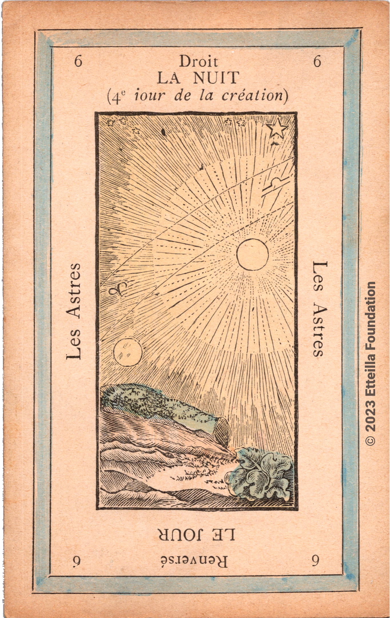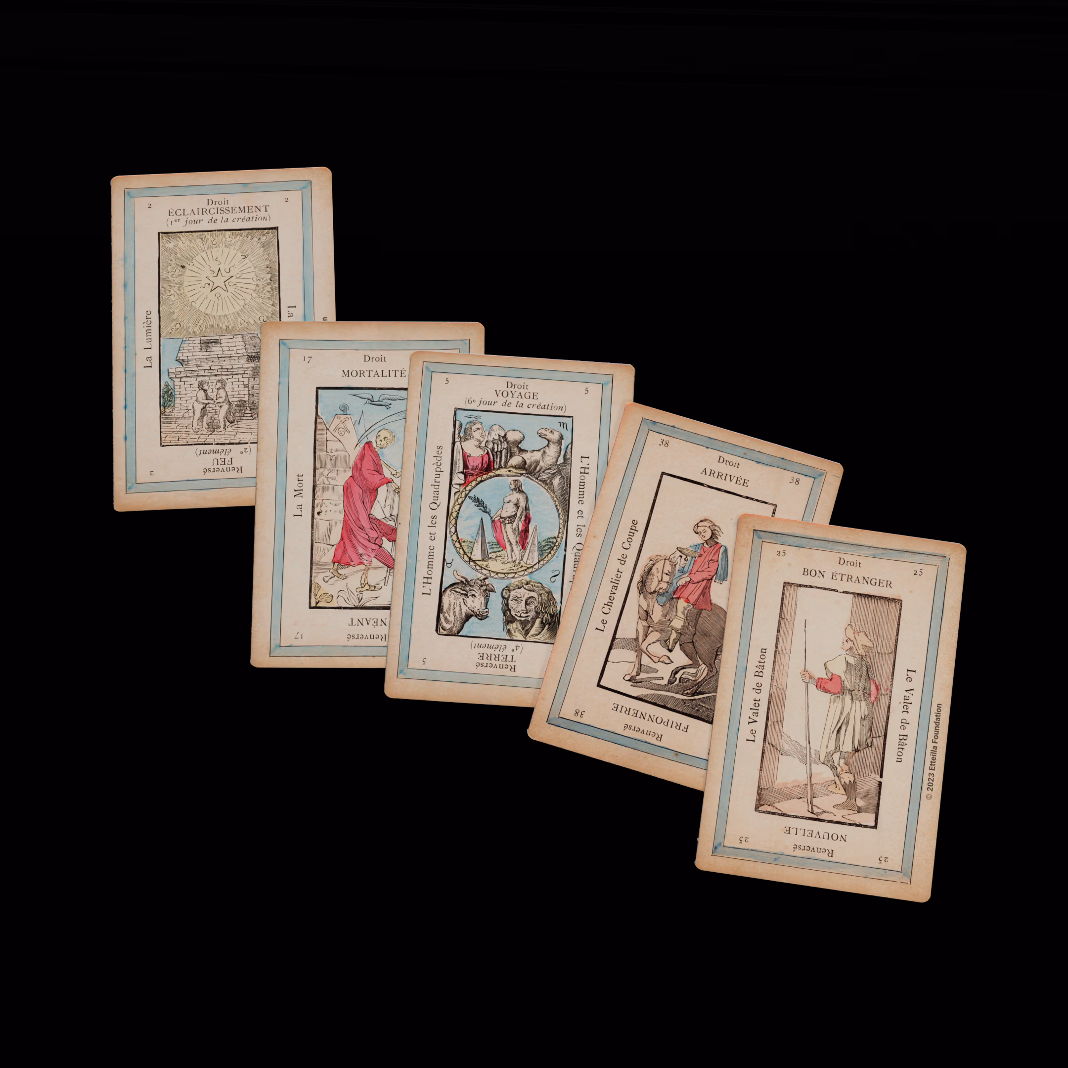 In 1838 Simon Blocquel, a student of Etteilla, published this updated version of the Etteilla tarot deck under the title “Grand livre de Thot.”. This version is commonly known as the Lismon Etteilla or Etteilla Type II.